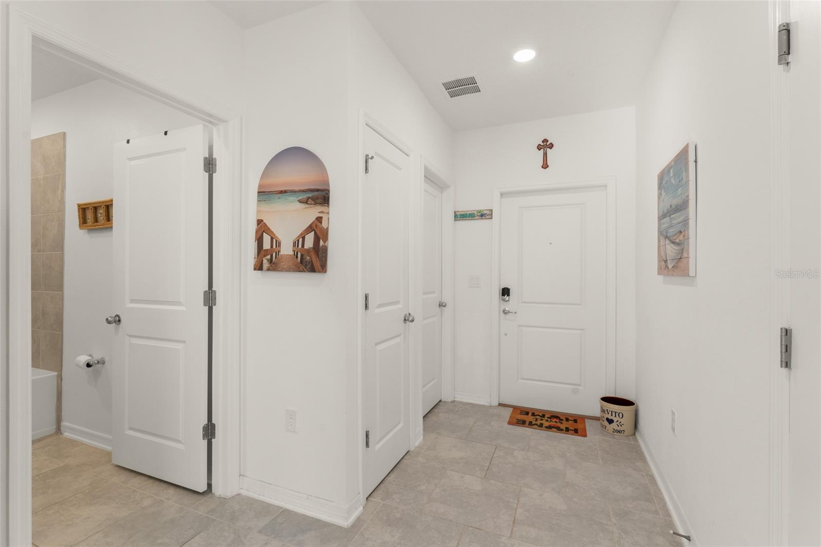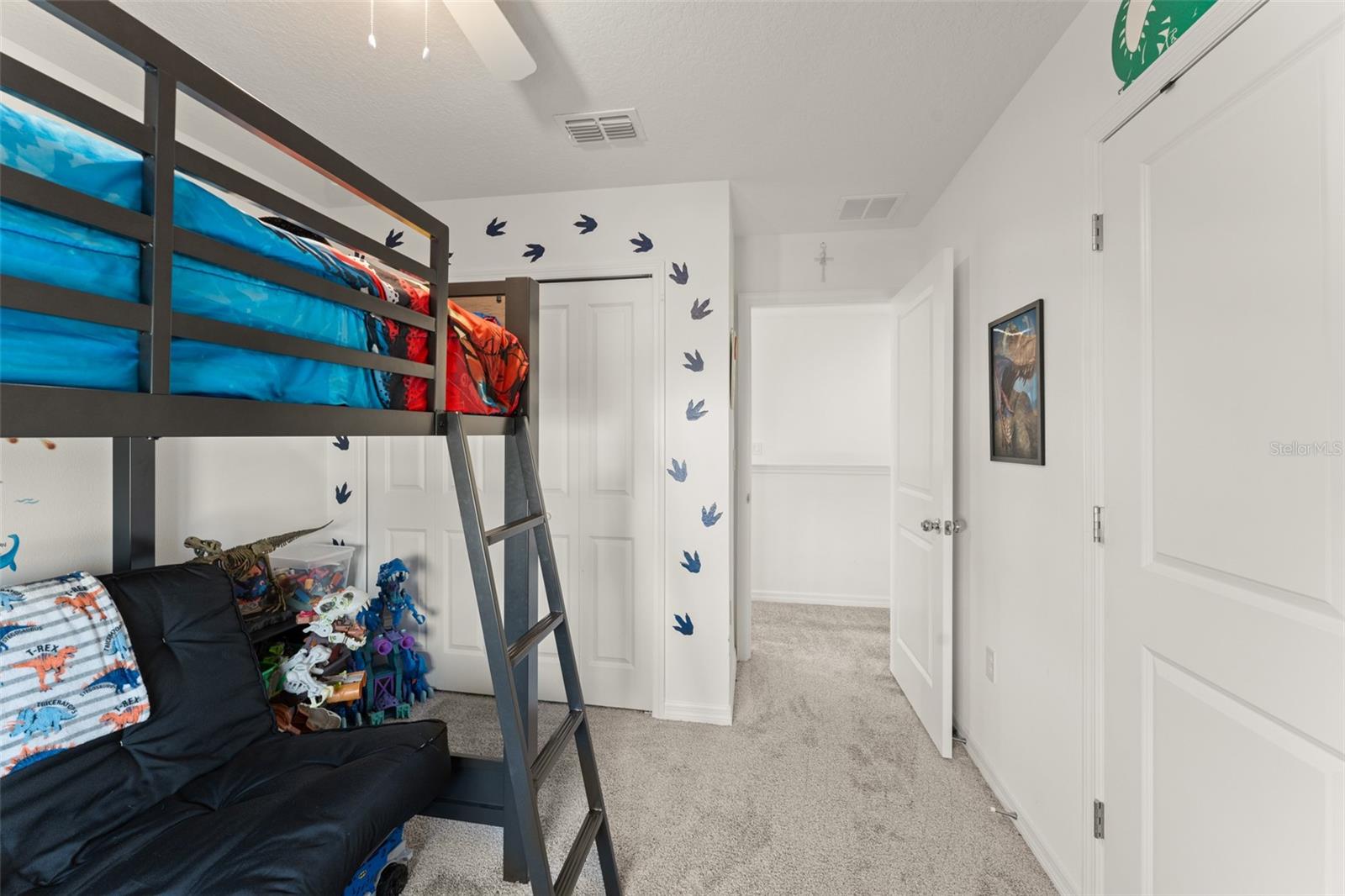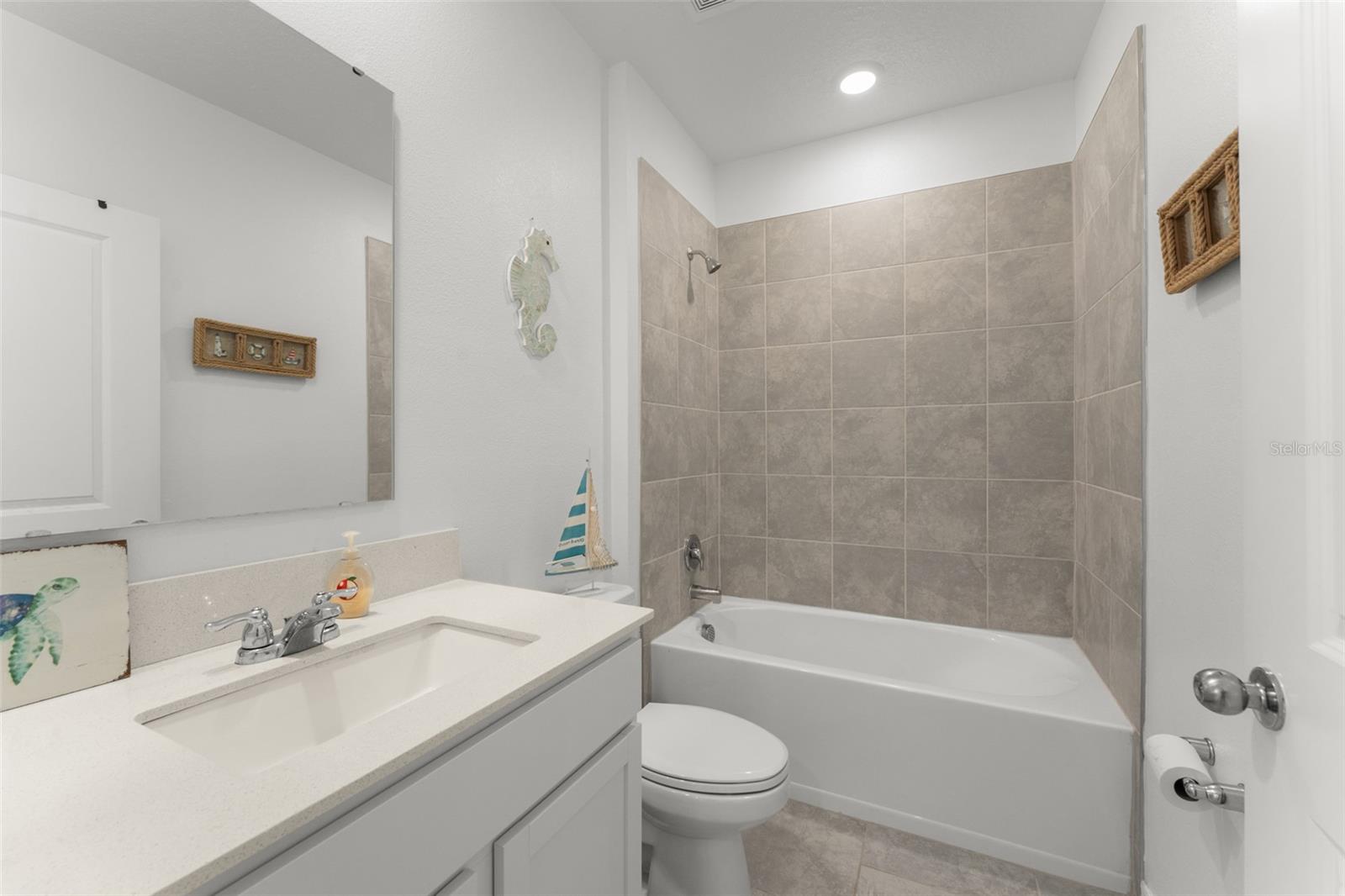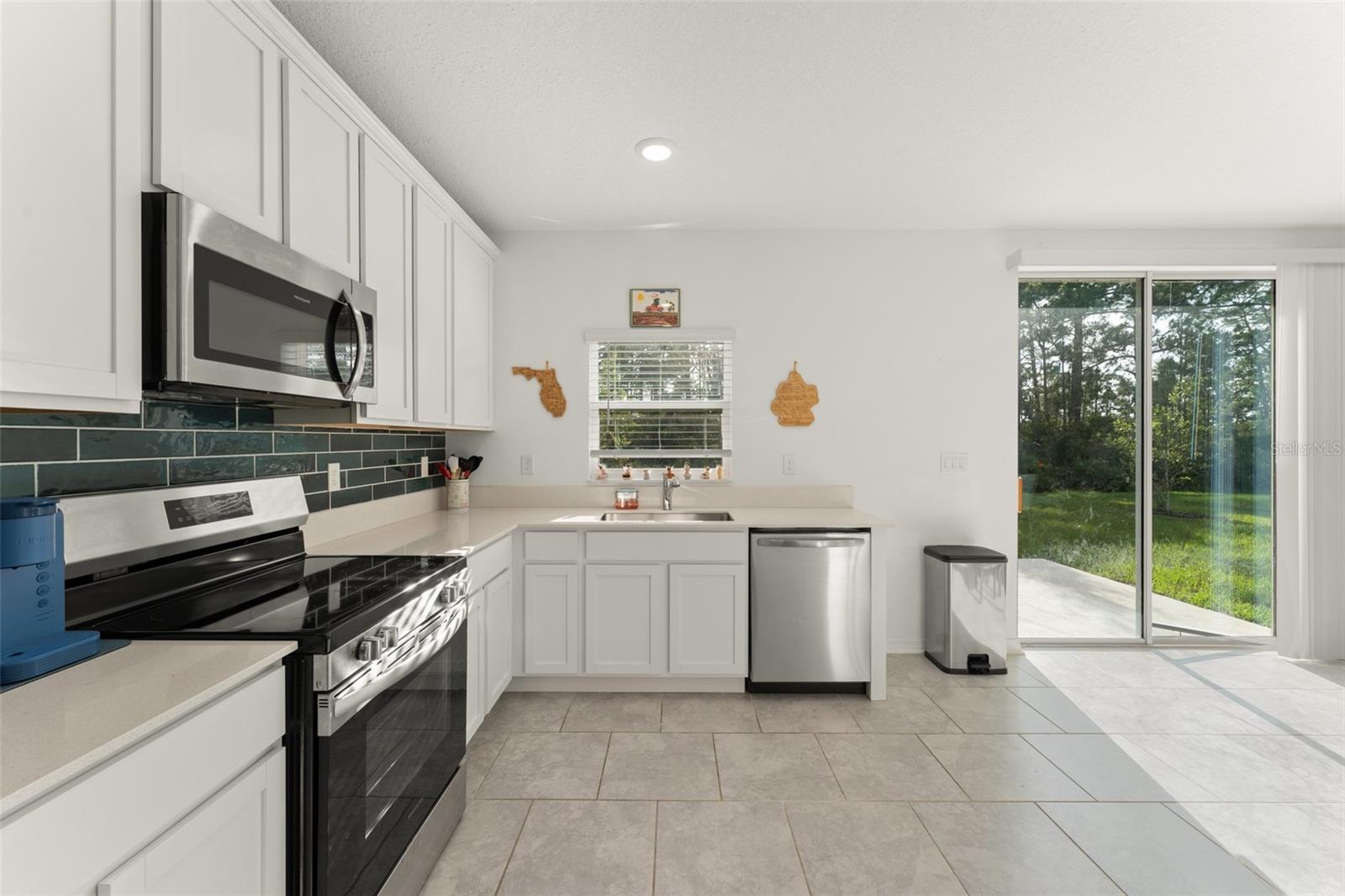 **This home qualifies for lending with NO DOWN PAYMENT required, 100% financing available. ** Welcome to an inviting 4-bedroom, 3-bathroom single-family home nestled in the peaceful community of Edgewater. From the moment you arrive, you’ll be greeted by a beautifully landscaped front yard and a welcoming two-car garage. The front porch, with space for two rocking chairs, is the perfect spot to relax and soak in the tranquil surroundings. Step inside and take in a sneak peek of the bright and airy living room just down the hall. To your right, you'll find a cozy first-floor bedroom with a built-in closet, ideal for guests or a home office, along with a nearby full bathroom featuring a bathtub. As you continue through the home, access to the garage is conveniently located on the left. The living room, with windows overlooking the lush backyard, flows effortlessly into the galley-style dining area and open-concept kitchen. The kitchen features crisp white cabinetry, stone countertops, a vibrant tile backsplash, and stainless steel appliances—perfect for both everyday living and entertaining. A sliding glass door off the dining area opens to a patio and offers beautiful views of the greenery beyond. Upstairs, a versatile loft area has been thoughtfully modified with a built-in counter—ideal as a desk or workspace. Two additional bedrooms feature built-in closets and share a Jack-and-Jill bathroom with stylish cabinetry and a tub. The laundry room is conveniently located between the third bedroom and the primary suite, complete with a modern bottom-loading washer and dryer and built-in shelving for easy organization. The primary bedroom is a sunlit retreat with multiple windows and a spacious en suite bathroom featuring dual sinks, matching white cabinetry, and a luxurious walk-in shower with floor-to-ceiling tile. The walk-in closet includes wrap-around built-in shelving to keep everything in its place. Step out back and enjoy a blank canvas backyard—a perfect setting for your dream outdoor living space, framed by mature vegetation for privacy and natural beauty. Don’t miss your chance to own this thoughtfully designed home that blends comfort, style, and functionality. Schedule your showing today!