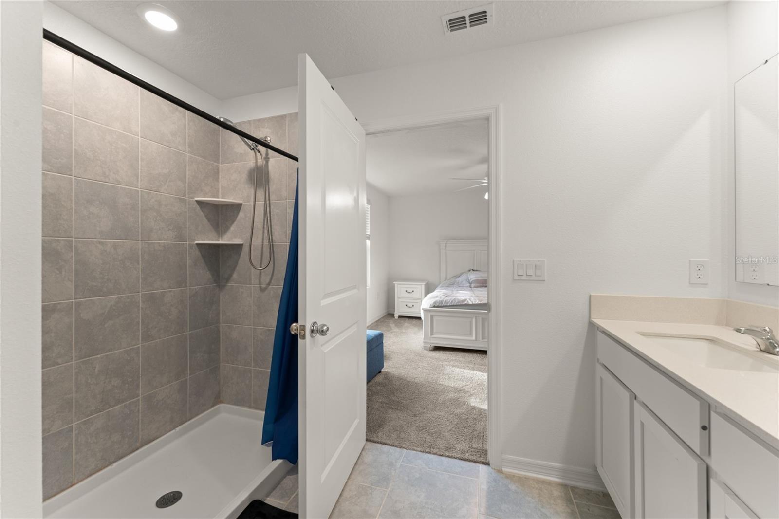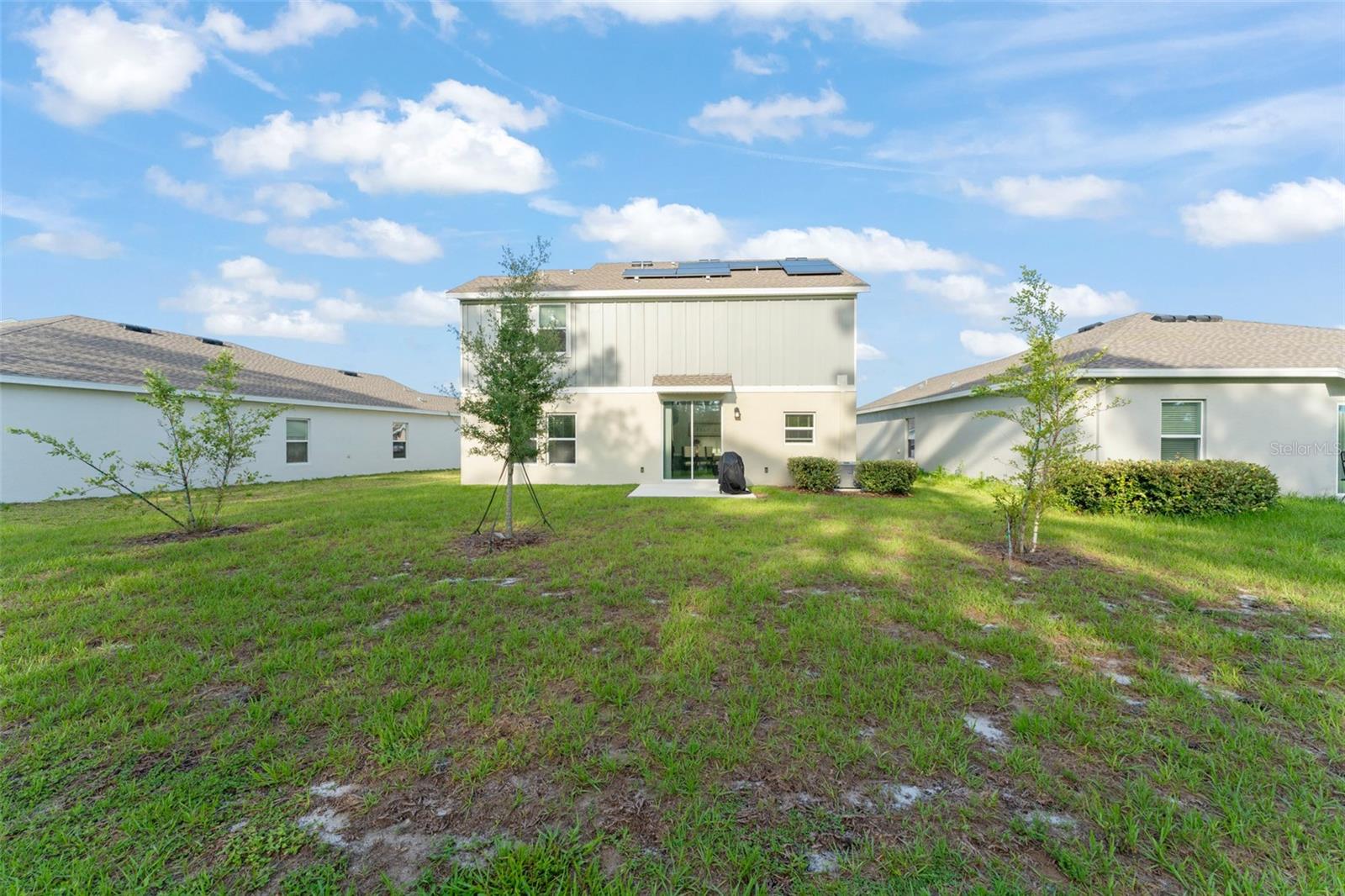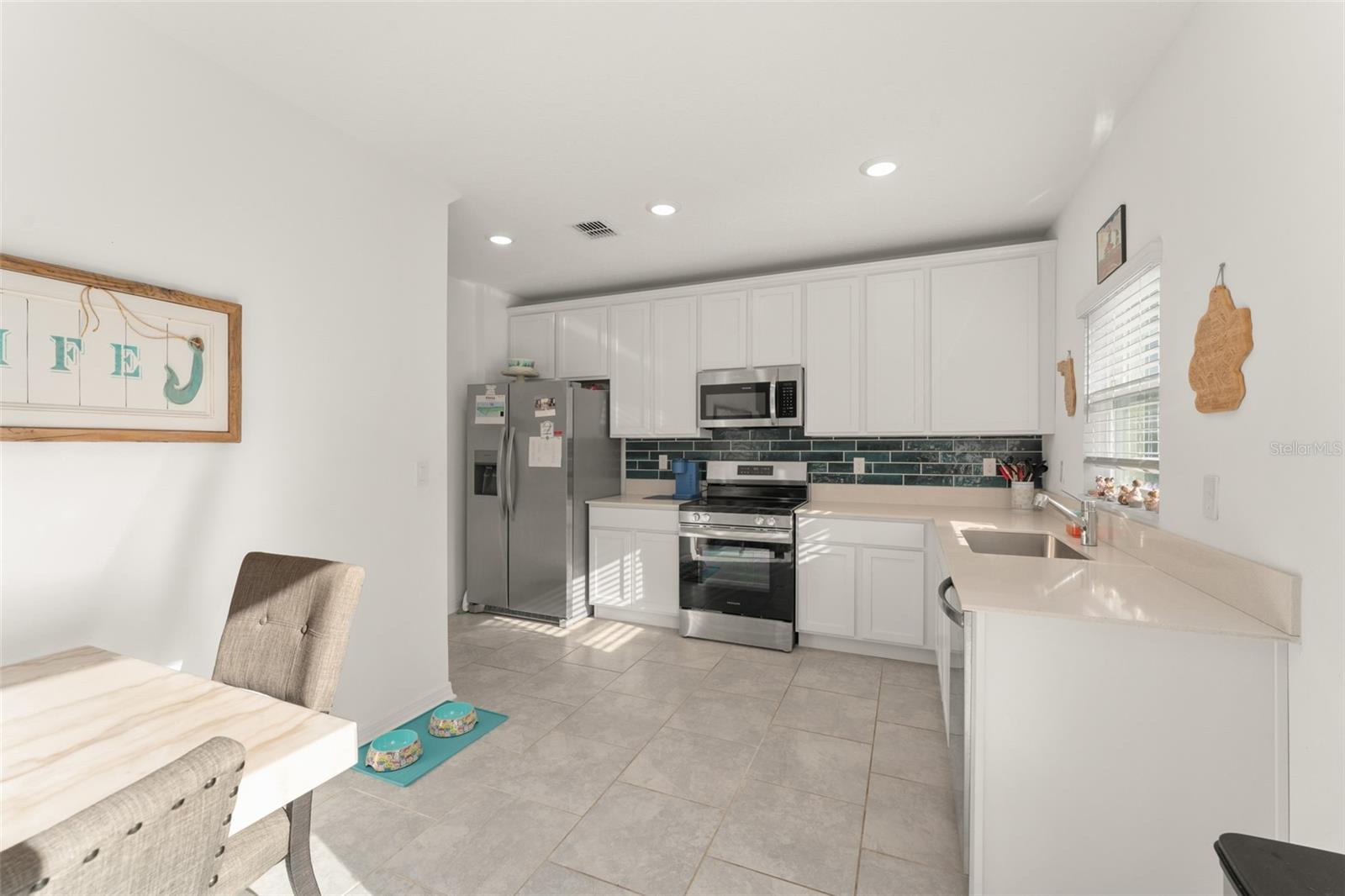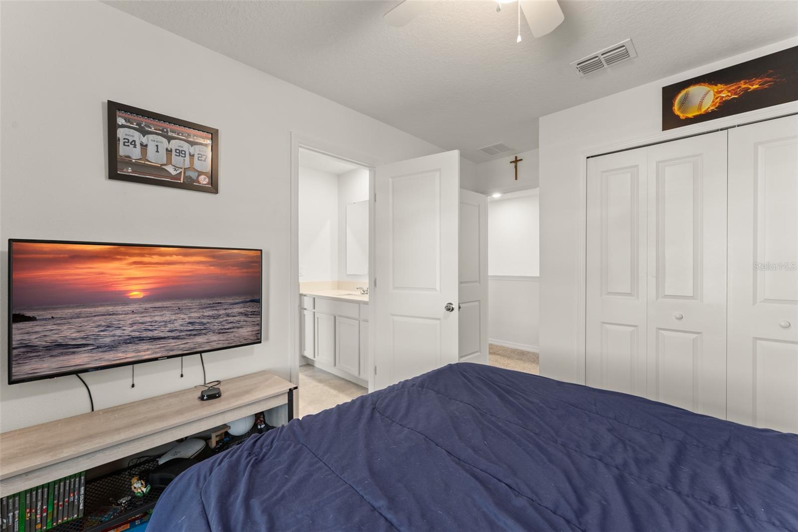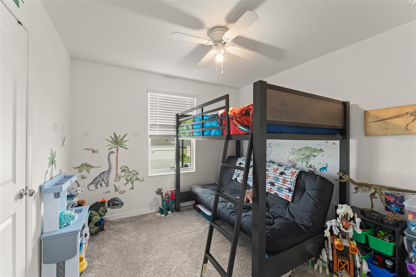 **This home qualifies for lending with NO DOWN PAYMENT required, 100% financing available. ** Welcome to an inviting 4-bedroom, 3-bathroom single-family home nestled in the peaceful community of Edgewater. From the moment you arrive, you’ll be greeted by a beautifully landscaped front yard and a welcoming two-car garage. The front porch, with space for two rocking chairs, is the perfect spot to relax and soak in the tranquil surroundings. Step inside and take in a sneak peek of the bright and airy living room just down the hall. To your right, you'll find a cozy first-floor bedroom with a built-in closet, ideal for guests or a home office, along with a nearby full bathroom featuring a bathtub. As you continue through the home, access to the garage is conveniently located on the left. The living room, with windows overlooking the lush backyard, flows effortlessly into the galley-style dining area and open-concept kitchen. The kitchen features crisp white cabinetry, stone countertops, a vibrant tile backsplash, and stainless steel appliances—perfect for both everyday living and entertaining. A sliding glass door off the dining area opens to a patio and offers beautiful views of the greenery beyond. Upstairs, a versatile loft area has been thoughtfully modified with a built-in counter—ideal as a desk or workspace. Two additional bedrooms feature built-in closets and share a Jack-and-Jill bathroom with stylish cabinetry and a tub. The laundry room is conveniently located between the third bedroom and the primary suite, complete with a modern bottom-loading washer and dryer and built-in shelving for easy organization. The primary bedroom is a sunlit retreat with multiple windows and a spacious en suite bathroom featuring dual sinks, matching white cabinetry, and a luxurious walk-in shower with floor-to-ceiling tile. The walk-in closet includes wrap-around built-in shelving to keep everything in its place. Step out back and enjoy a blank canvas backyard—a perfect setting for your dream outdoor living space, framed by mature vegetation for privacy and natural beauty. Don’t miss your chance to own this thoughtfully designed home that blends comfort, style, and functionality. Schedule your showing today!