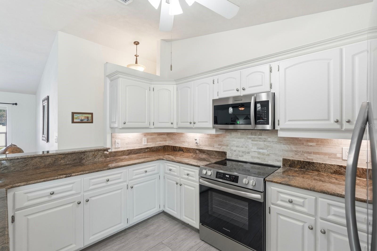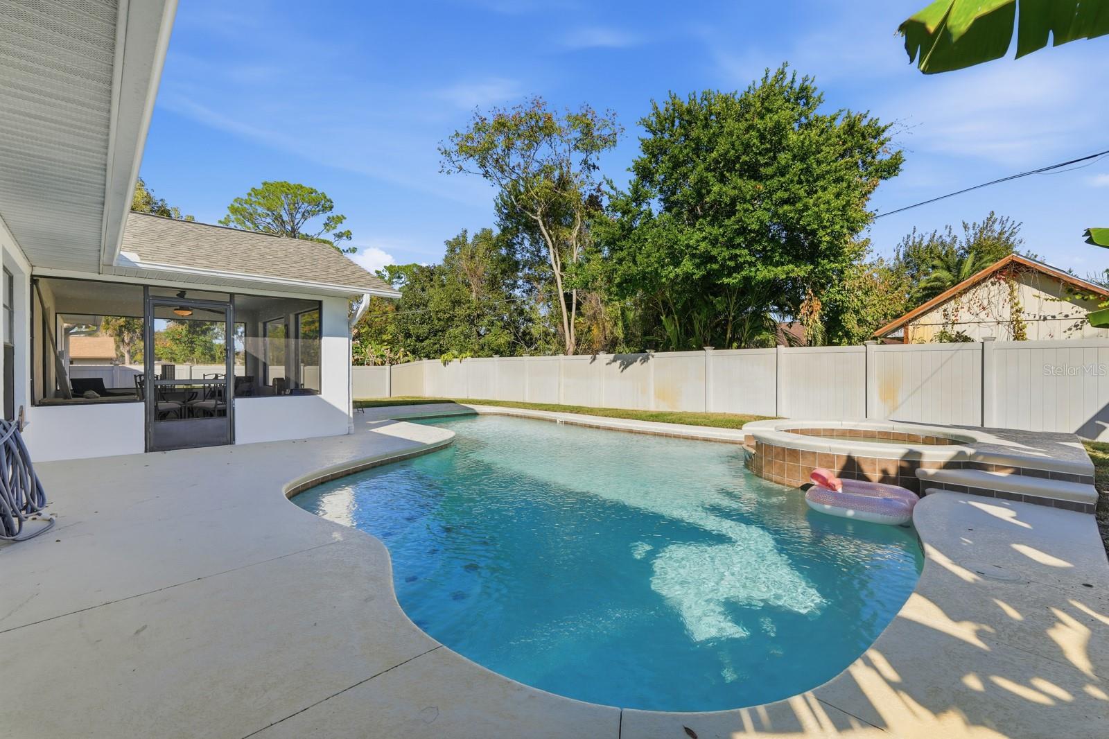 Designed for everyday comfort and effortless entertaining, this well-maintained 3-bedroom, 2-bath single-story home offers a split-bedroom layout and a seamless indoor-outdoor connection. The living and dining areas open through sliding doors to an exterior screened porch, creating a natural extension of the living space and leading directly to the pool deck—ideal for gatherings, outdoor dining, or relaxing by the water. The vinyl-fenced backyard is framed by mature landscaping and features a saltwater pool with spa, heated by a heat pump and enhanced with LED color-changing underwater lighting. The privately positioned primary suite includes a walk-in closet plus an additional reach-in closet, while the updated primary bath features a double vanity and walk-in shower. Recent improvements include a new roof (2025), new water heater (2025), and a 200-amp electrical panel. The kitchen features granite countertops, a new refrigerator and microwave, plus a newer dishwasher Irrigation is supplied by a private well. The two-car garage includes a 50-amp electric vehicle charger. Homes like this in Florida Shores are hard to find, schedule a tour today!