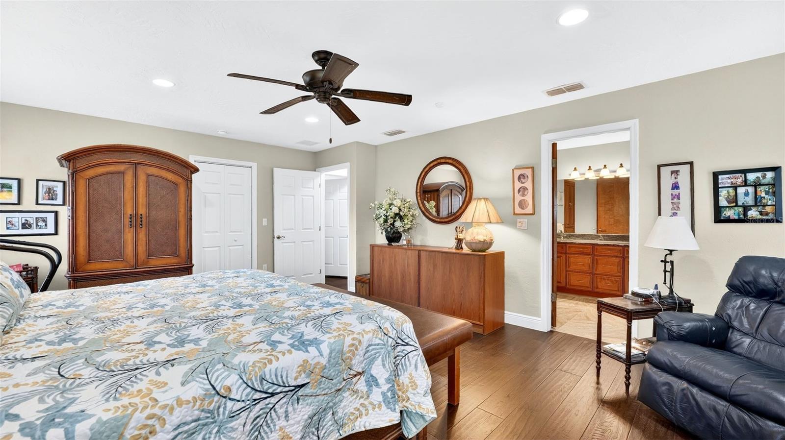 Beautifully remodeled four-bedroom, three-bath home situated on a desirable corner lot with stunning RIVER VIEWS and gorgeous landscaping. This thoughtfully designed home features two primary suites, each with its own full bath—perfect for guests or multigenerational living. The great room boasts vaulted ceilings, recessed lighting, and a striking electric fireplace with shiplap detail and custom shelving. The updated kitchen offers an island, breakfast nook, pendant lighting, and upgraded cabinetry with pull-out shelving for added convenience. Plantation shutters throughout enhance both style and privacy. The main primary bath features a walk-in shower, while the guest bath includes a walk-in bathtub. Enjoy peaceful mornings on the front porch overlooking the river or relax in the beautifully landscaped yard with a paver patio and fire pit. Additional features include an inside utility room with sink and a whole-house generator. This exceptional home offers comfort and functionalit