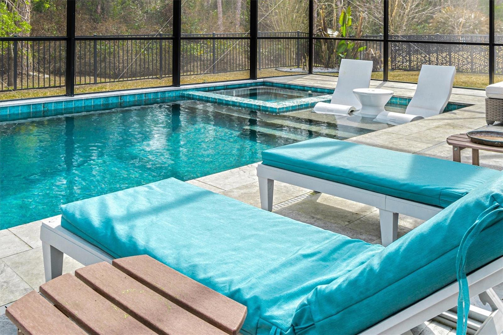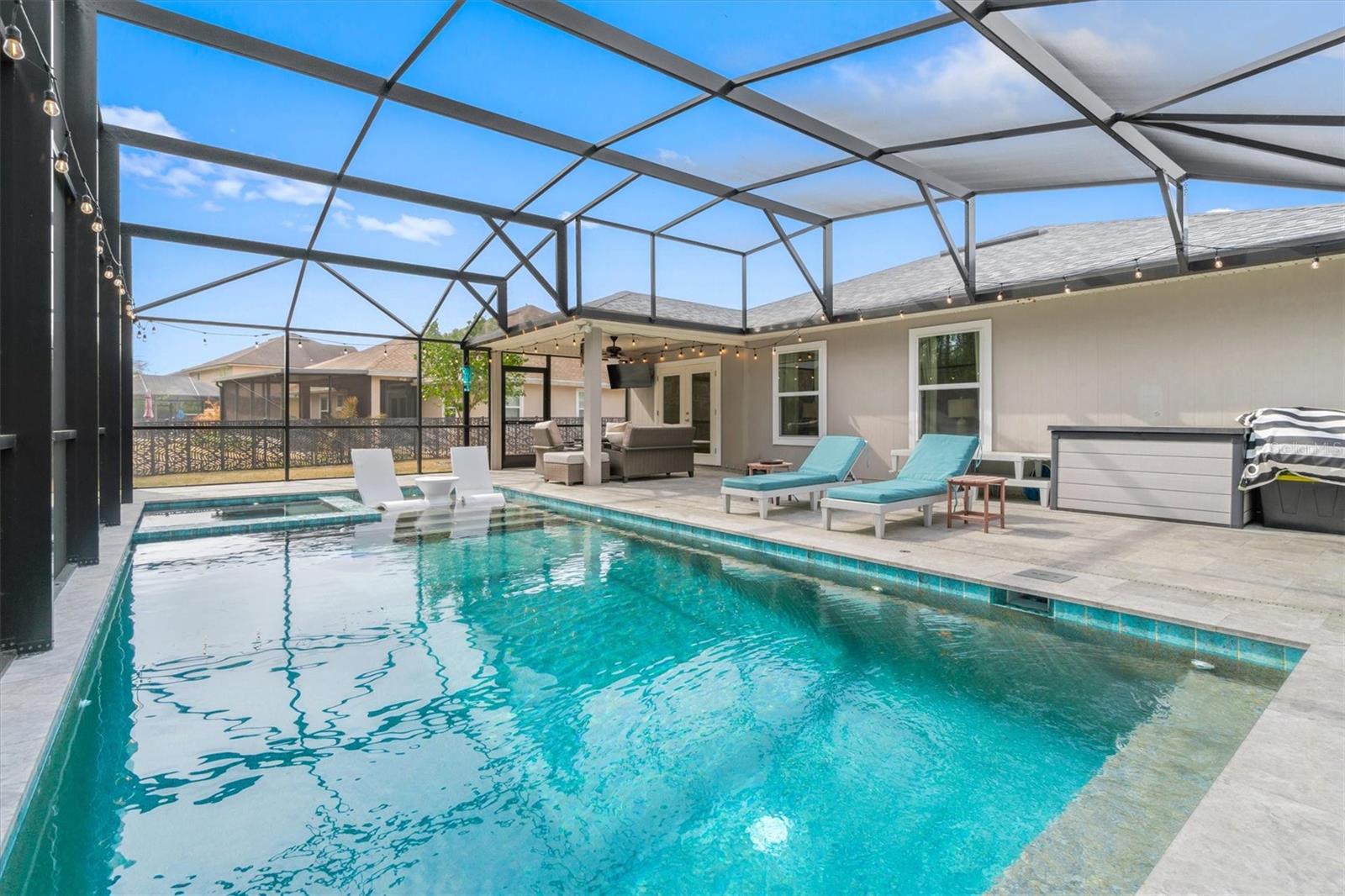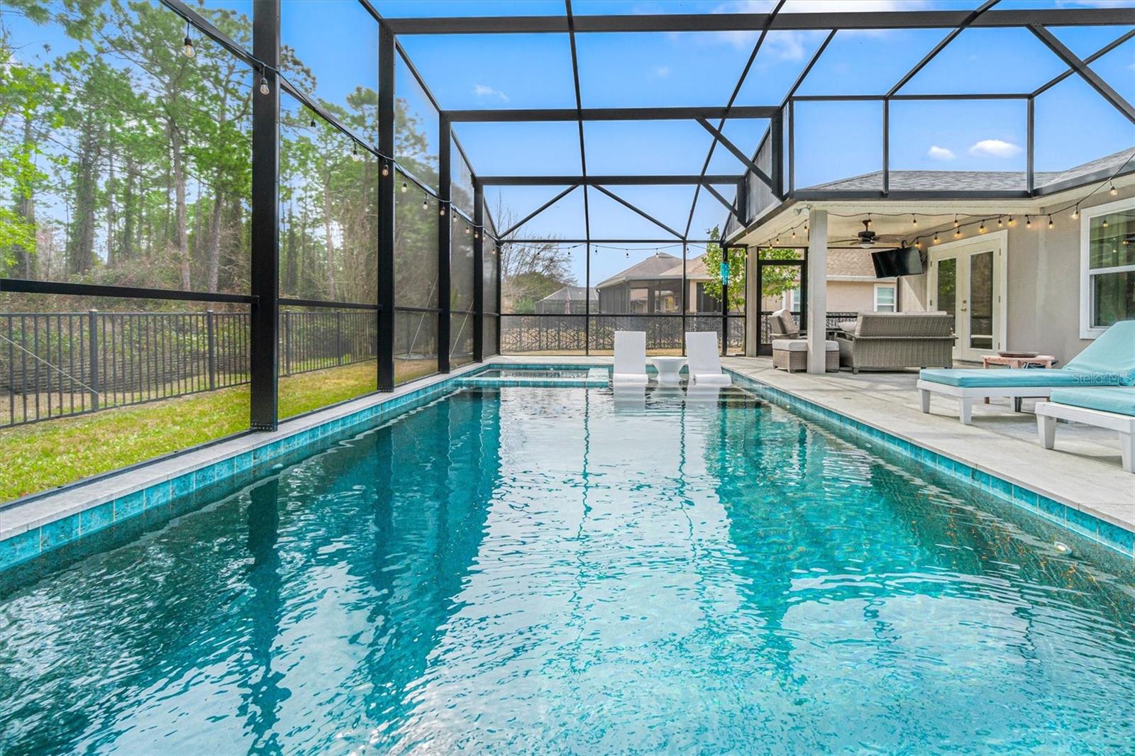Located in the desirable golf course community of Cypress Lakes, this beautifully maintained single-story home offers comfort, functionality, and exceptional outdoor living. Enjoy serene lake and golf course views from the front of the home and private preserve views from the fully fenced backyard. With 1,848 square feet of thoughtfully designed living space, the open split floor plan provides both privacy and effortless flow—ideal for everyday living and entertaining alike. The gourmet kitchen serves as the heart of the home, featuring granite countertops, a large 9' x 4' island, breakfast bar seating, stainless steel appliances, a walk-in pantry, and both under-cabinet and over-cabinet lighting. The spacious primary suite offers a relaxing retreat with a large soaking tub, separate walk-in shower, and ample space to unwind. Step outside to a beautifully designed outdoor oasis featuring a heated in-ground pool with spa, fountain sprays, a seating bench, elegant natural stone decking, and a screened enclosure. French doors open to a covered seating area, creating a seamless indoor-outdoor lifestyle perfect for relaxing or entertaining year-round. Additional features include a leaded glass front door, an extended driveway, curbed planting areas, a two-car garage with full screen door, newer HVAC (2024), and newer water heater (2024). Conveniently located near I-95, with a short drive to historic downtown St. Augustine and the beaches, this home offers both tranquility and accessibility.
