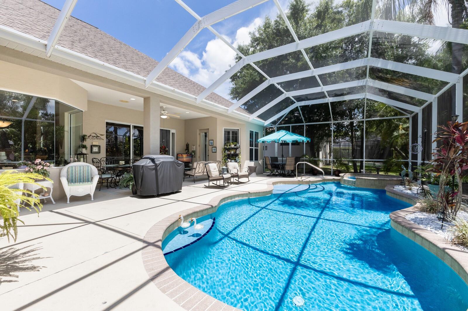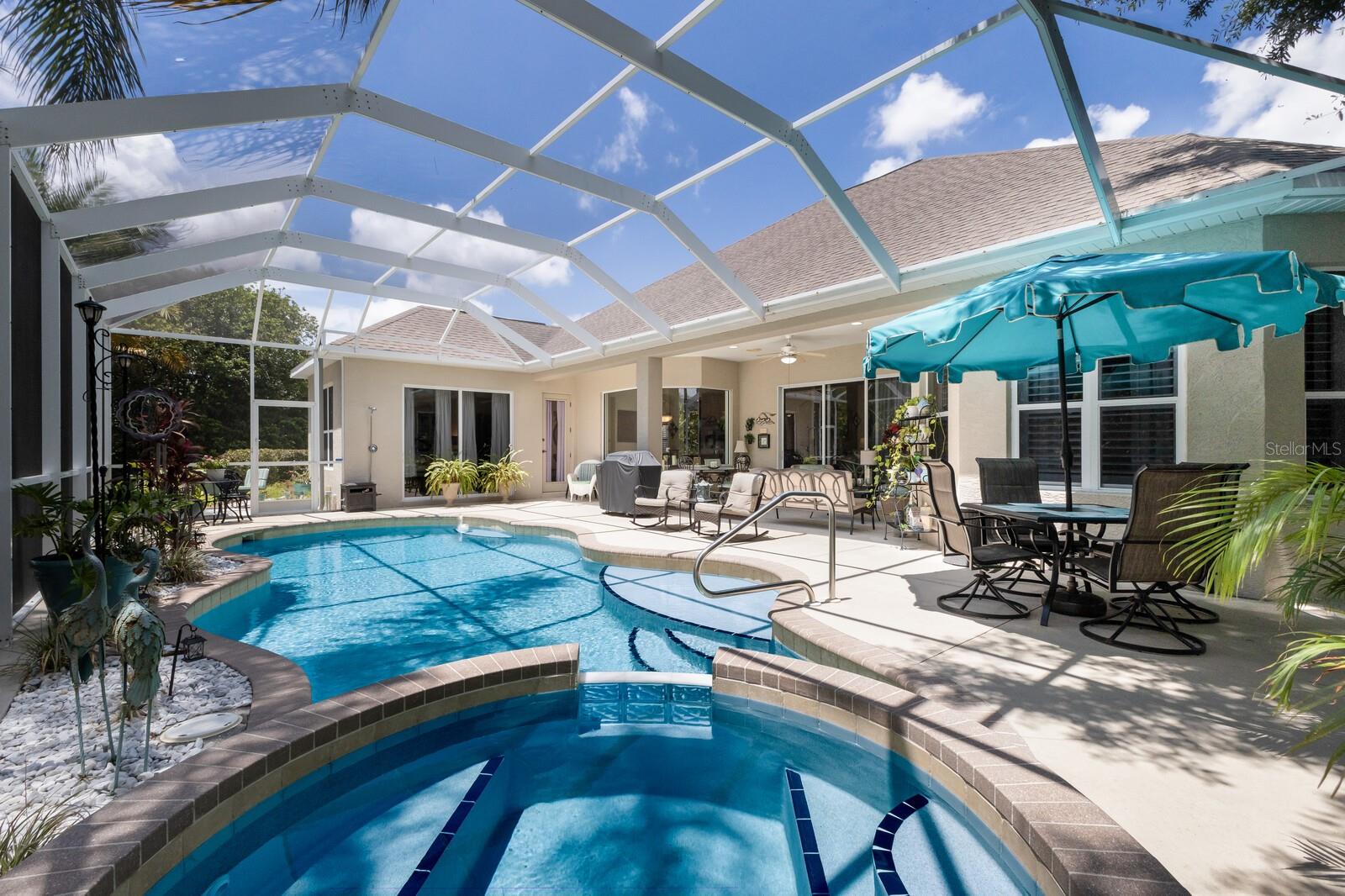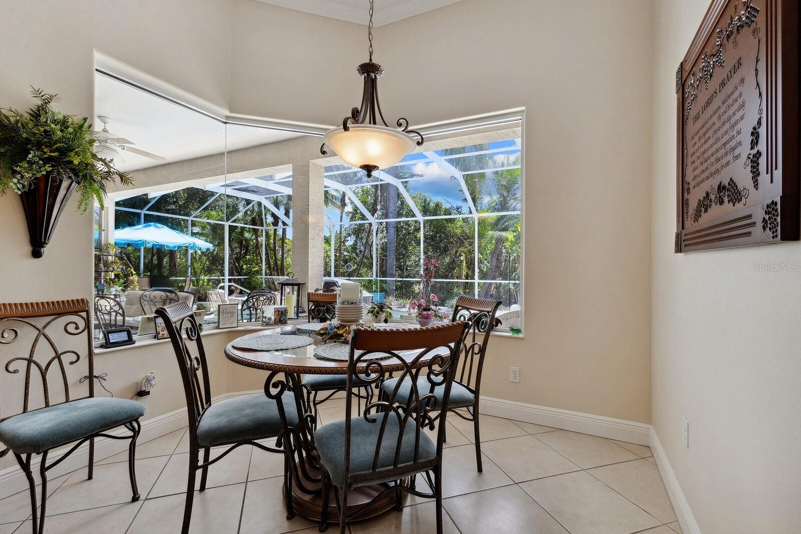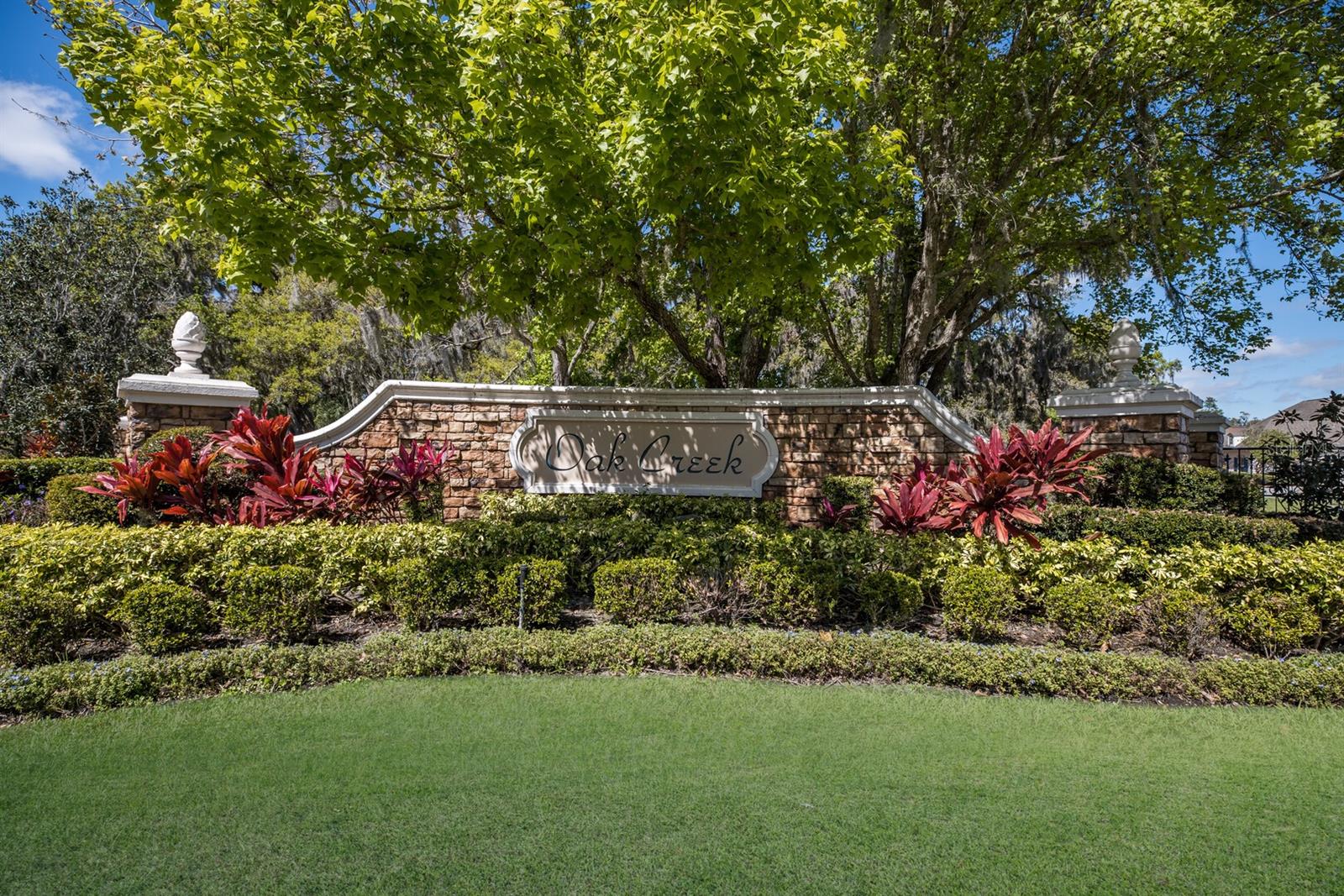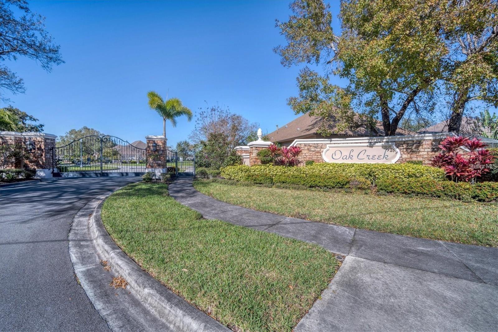 Welcome to Oak Creek, a serene and secure gated sanctuary nestled amongst tree-lined avenues, featuring just 34 homes spread across 22 acres. As you step inside, you'll be invited into a spacious living room and a formal dining area, both showcasing high ceilings, elegant finishes, and an abundance of natural light. The true split floor plan ensures complete privacy in the owner’s suite, which boasts dual vanities, a large soaker jacuzzi tub, a zero-entry shower, dual walk-in closets, and private access to the patio. At the heart of the home, the kitchen features solid wood cabinetry, a walk-in pantry, and an eat-in area with immaculate views of the backyard retreat through an aquarium window. The two guest bedrooms are private and spacious, with the third bedroom offering sliding glass door access to the pool. Additional highlights include ample storage throughout the home, crown molding, plantation shutters, a newly updated pool heater, and newly installed wood floors in the living and formal dining rooms. Don't miss this incredible opportunity to make this home your own and reside in one of Ellenton's most desirable neighborhoods. This home truly has it all, featuring an outdoor tropical oasis with a heated pool and spa, the perfect location for your morning coffee or to entertain your friends and family. Enjoy the convenient location just minutes from I-75, St. Petersburg, Tampa, shopping, dining, and world-renowned beaches.