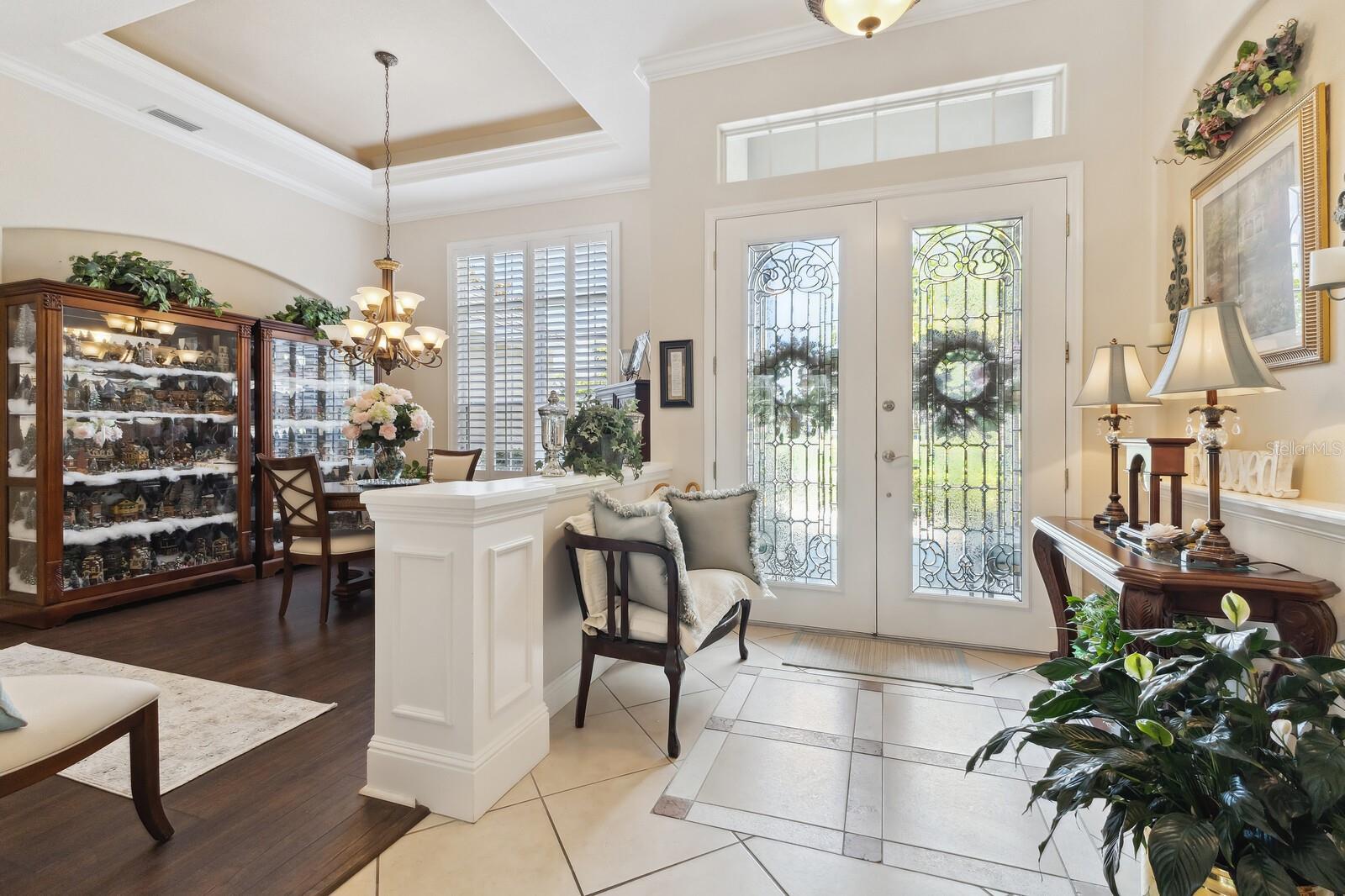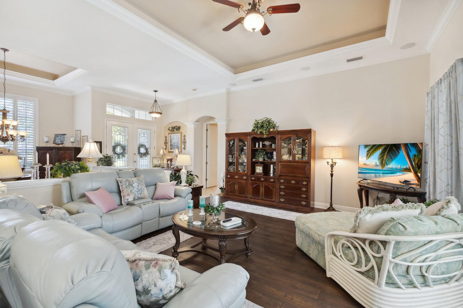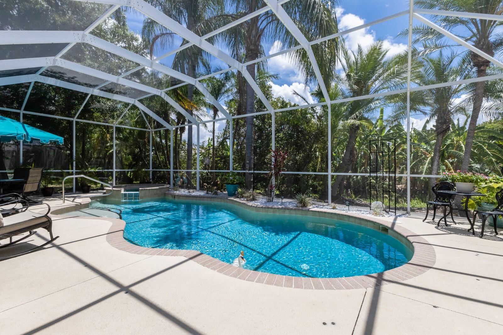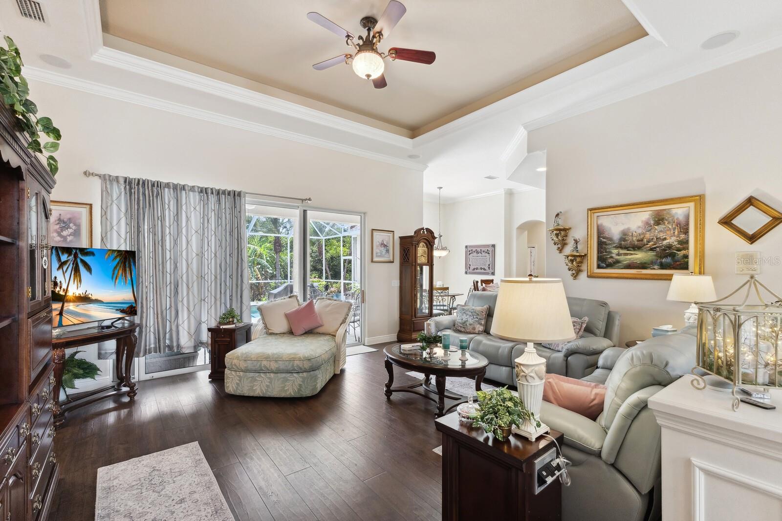 Welcome to Oak Creek, a serene and secure gated sanctuary nestled amongst tree-lined avenues, featuring just 34 homes spread across 22 acres. As you step inside, you'll be invited into a spacious living room and a formal dining area, both showcasing high ceilings, elegant finishes, and an abundance of natural light. The true split floor plan ensures complete privacy in the owner’s suite, which boasts dual vanities, a large soaker jacuzzi tub, a zero-entry shower, dual walk-in closets, and private access to the patio. At the heart of the home, the kitchen features solid wood cabinetry, a walk-in pantry, and an eat-in area with immaculate views of the backyard retreat through an aquarium window. The two guest bedrooms are private and spacious, with the third bedroom offering sliding glass door access to the pool. Additional highlights include ample storage throughout the home, crown molding, plantation shutters, a newly updated pool heater, and newly installed wood floors in the living and formal dining rooms. Don't miss this incredible opportunity to make this home your own and reside in one of Ellenton's most desirable neighborhoods. This home truly has it all, featuring an outdoor tropical oasis with a heated pool and spa, the perfect location for your morning coffee or to entertain your friends and family. Enjoy the convenient location just minutes from I-75, St. Petersburg, Tampa, shopping, dining, and world-renowned beaches.