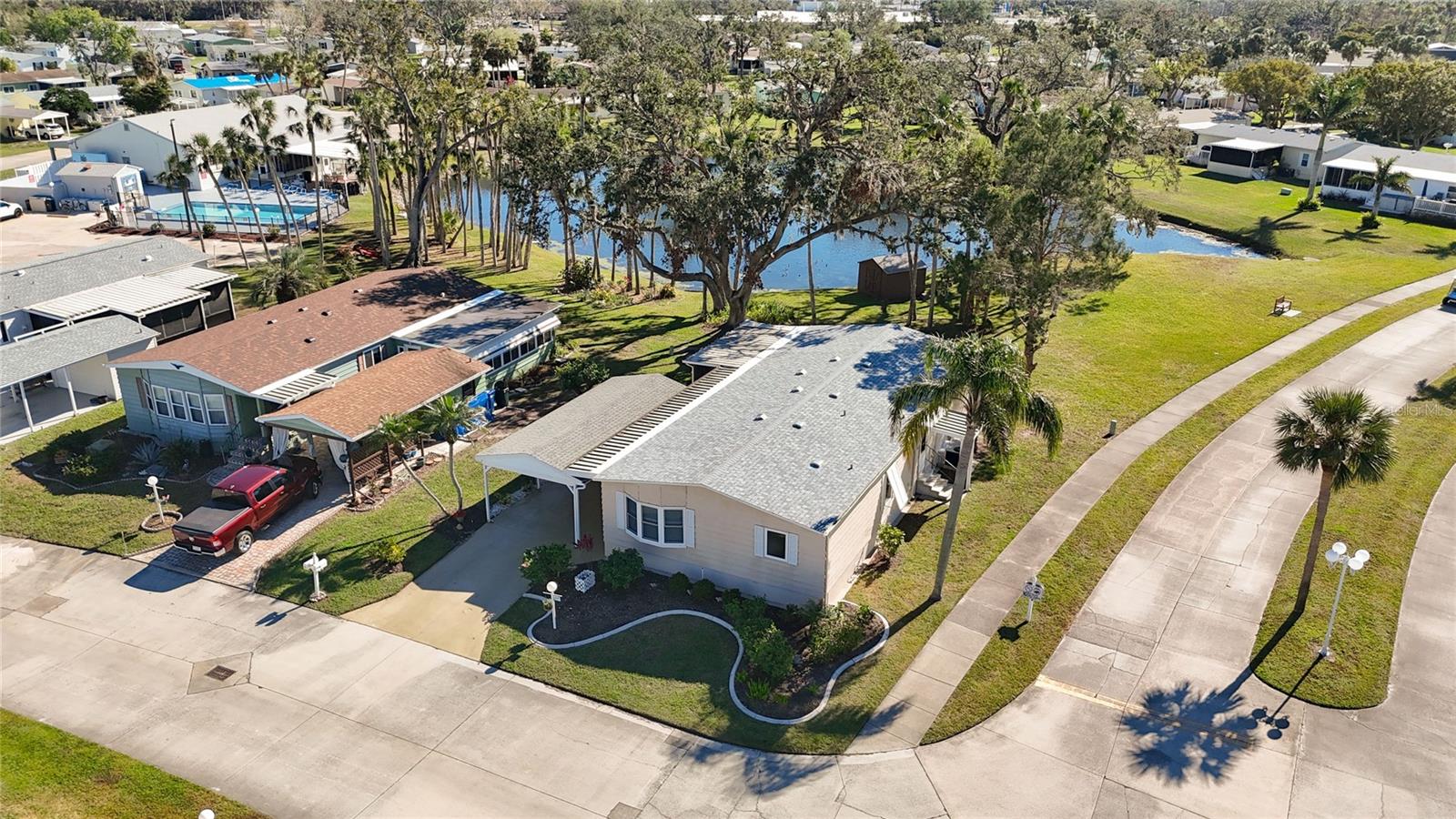 SPACIOUS HOME IN ACTIVE 55+ LAND OWNED COMMUNITY! This lovely property, overlooking a serene pond, is located on a corner lot. There is plenty of room to relax and entertain in this two bedroom, two bathroom home. The ample living room and enclosed side porch, both have pond views where bird watching is a daily event. The kitchen has a large cooking island with seating, pantry, and plenty of cabinets. Off the kitchen is extra space which could be used as additional seating, dining, an office or anything you choose. The huge primary bedroom suite has dual closets, & en suite bathroom with separate room for the commode and shower. The cheerful second bedroom also has an en suite bathroom with tub/shower. Other features include: wet bar, built-in cabinets and shelving, inside laundry, plantation shutters, curbed landscaping in the front, storage shed and carport. All appliances included. Shingle roof replaced 2024 with transferrable warranty. Central A/C (2016). Quarterly fees of $505/quarter includes 24-hour guarded gate, trash & grounds maintenance. RIDGEWOOD MEADOWS IS A PET FRIENDLY community that features a heated pool, tennis courts, and many activities and opportunities to make friends. Close to I-75, outlet mall, library, dining, retail, and worship. Don't let this gracious home get away!