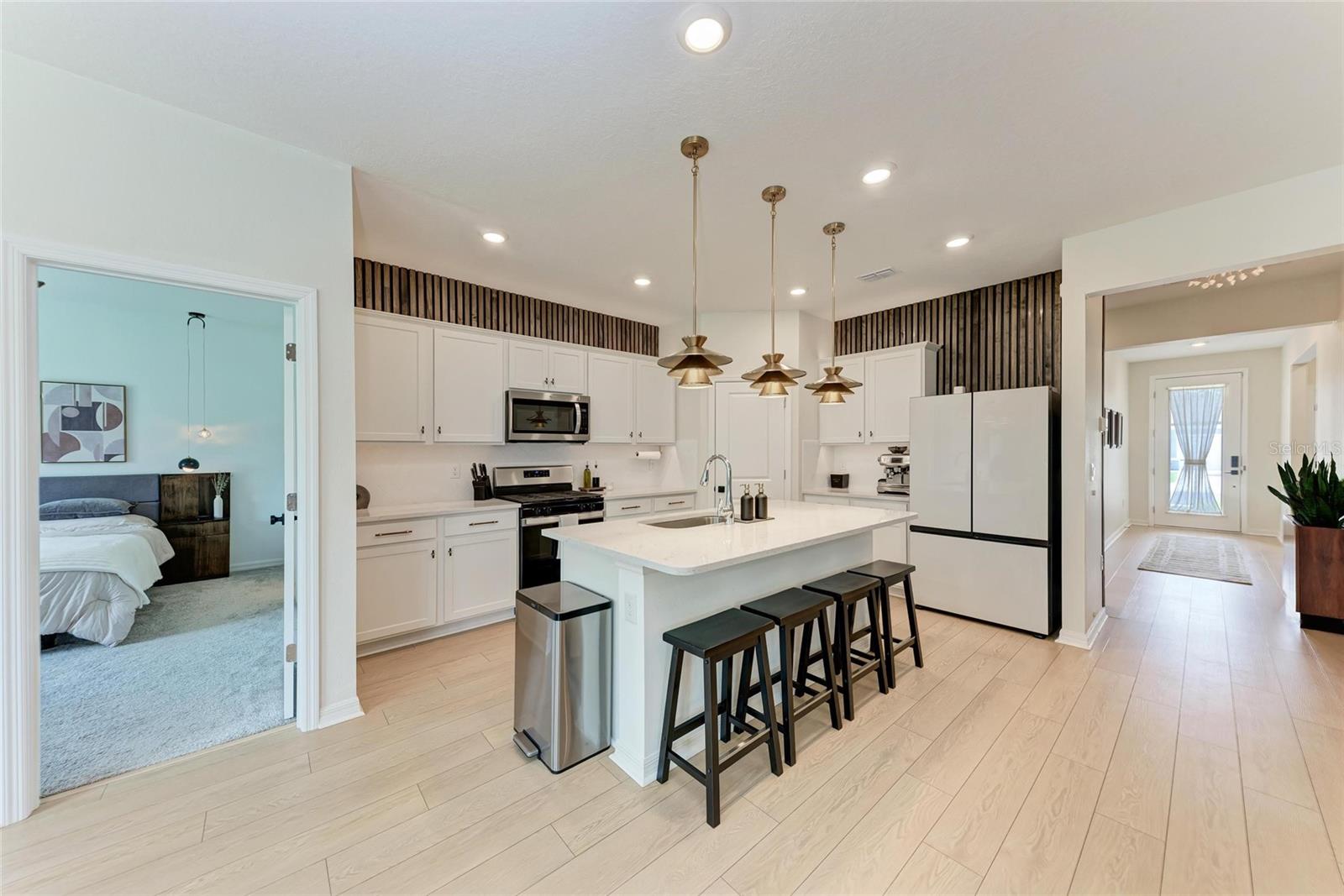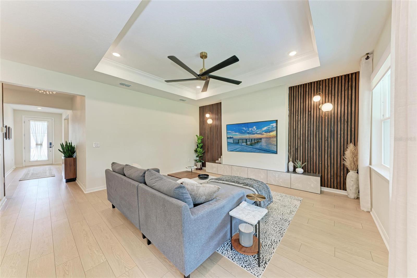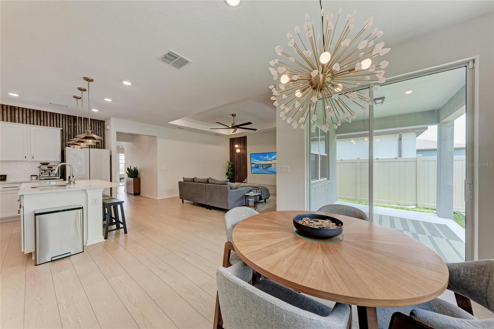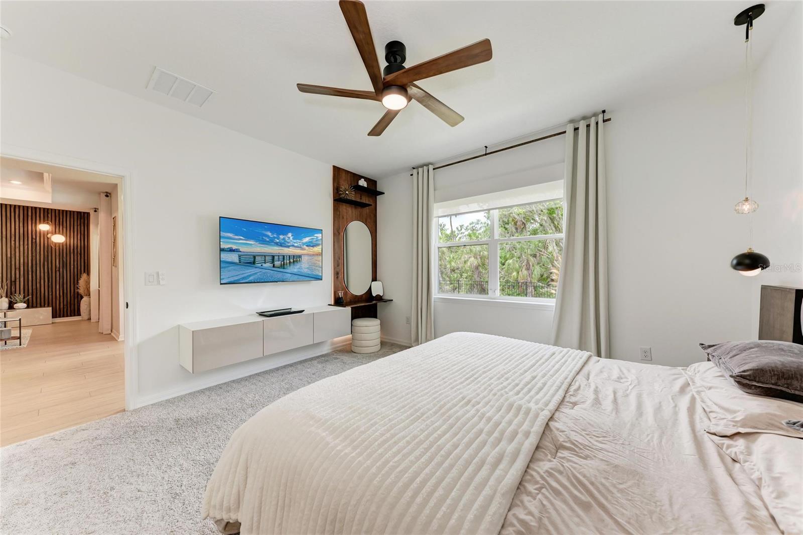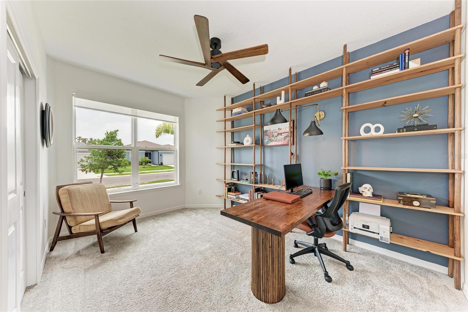 Seller offering up to 2.5% toward buyer’s closing costs, prepaids, or interest rate buy-down with acceptable offer and lender approval. This 2024-built, 3-bedroom, 2-bathroom home offers more than just upgraded finishes—it delivers architectural detail, curated design, and thoughtful luxury at every turn. A fully fenced yard provides privacy and security, while easy-install hurricane shutters offer peace of mind during storm season. Step inside to a striking, floor-to-ceiling custom drop zone with integrated lighting, setting the tone for a home where form meets function. Just off the entry, a dedicated home office features wall-to-wall shelving and a solid wood desk, offering versatile space for books, décor, and creativity—perfect for focused work or artistic inspiration. Nearby, the guest bathroom continues the custom design story with a floating vanity wrapped in waterfall quartz, accented by rich slatted wood paneling and gold fixtures that lend a hotel-style charm and elevate the space. The kitchen is a true showpiece, blending style and efficiency with quartz countertops, a herringbone tile backsplash, soft-close cabinetry, brass hardware, statement pendant lighting, and under/above-cabinet illumination. The adjoining dining area is framed by sliding glass doors for seamless indoor-outdoor flow and anchored by a sculptural mid-century chandelier that adds warmth and personality. The living room is elevated by a bespoke media wall with floating cabinetry, flanked by vertical, true wood slats that add natural texture and depth—creating a bold, architectural centerpiece. In the primary suite, enjoy boutique-inspired comfort with a floating makeup vanity, custom-built nightstands, a minimalist floating headboard, and ambient pendant lighting. A fully built-out walk-in closet offers tailored storage, while the ensuite bath includes dual quartz vanities, organic-shaped mirrors, and a recessed storage nook with dark-stained floating shelves. Located in a boutique community of just 70 homes with no CDD, this residence combines upscale design with everyday convenience. I-75 is just around the corner, and you're within walking distance to Ellenton Premium Outlets—putting shopping, dining, and easy commuting right at your doorstep.