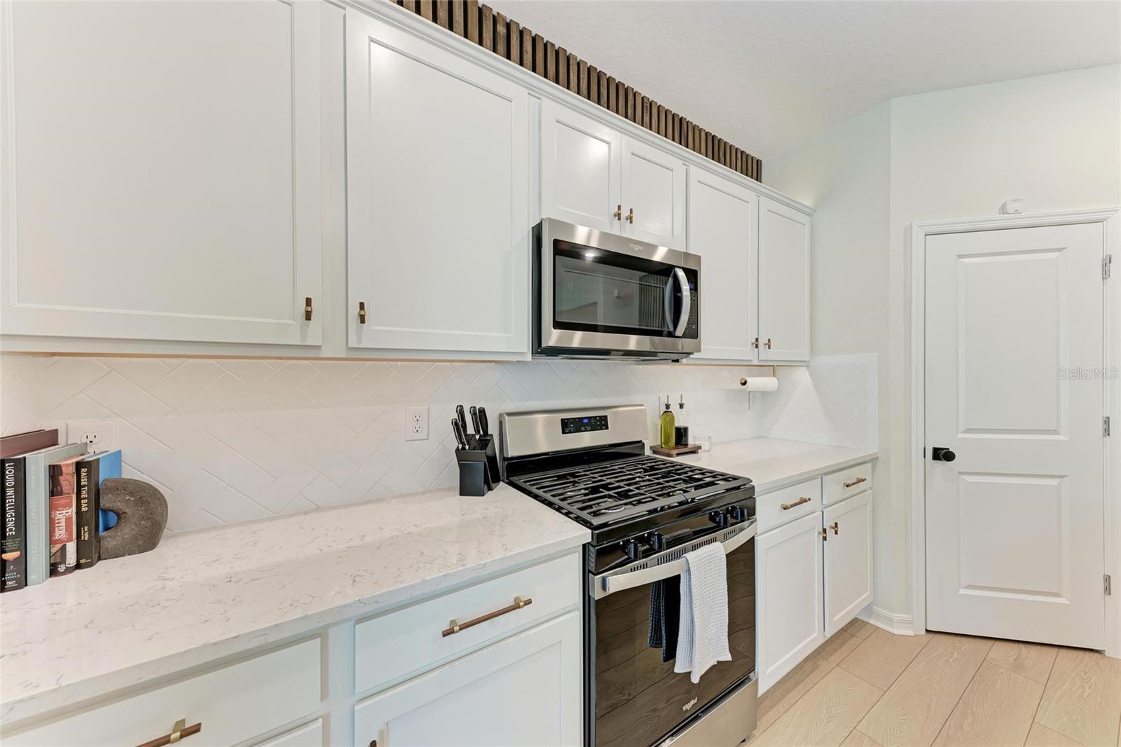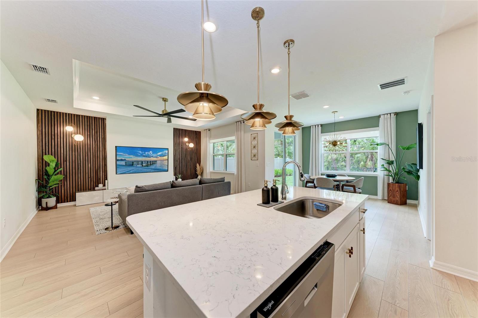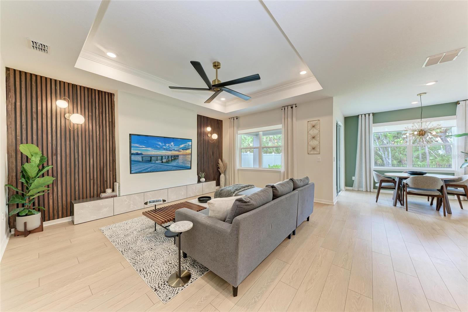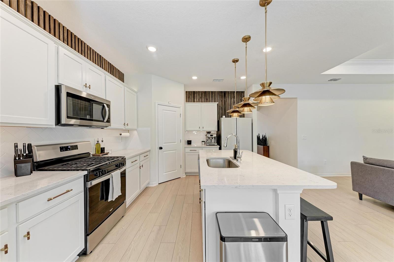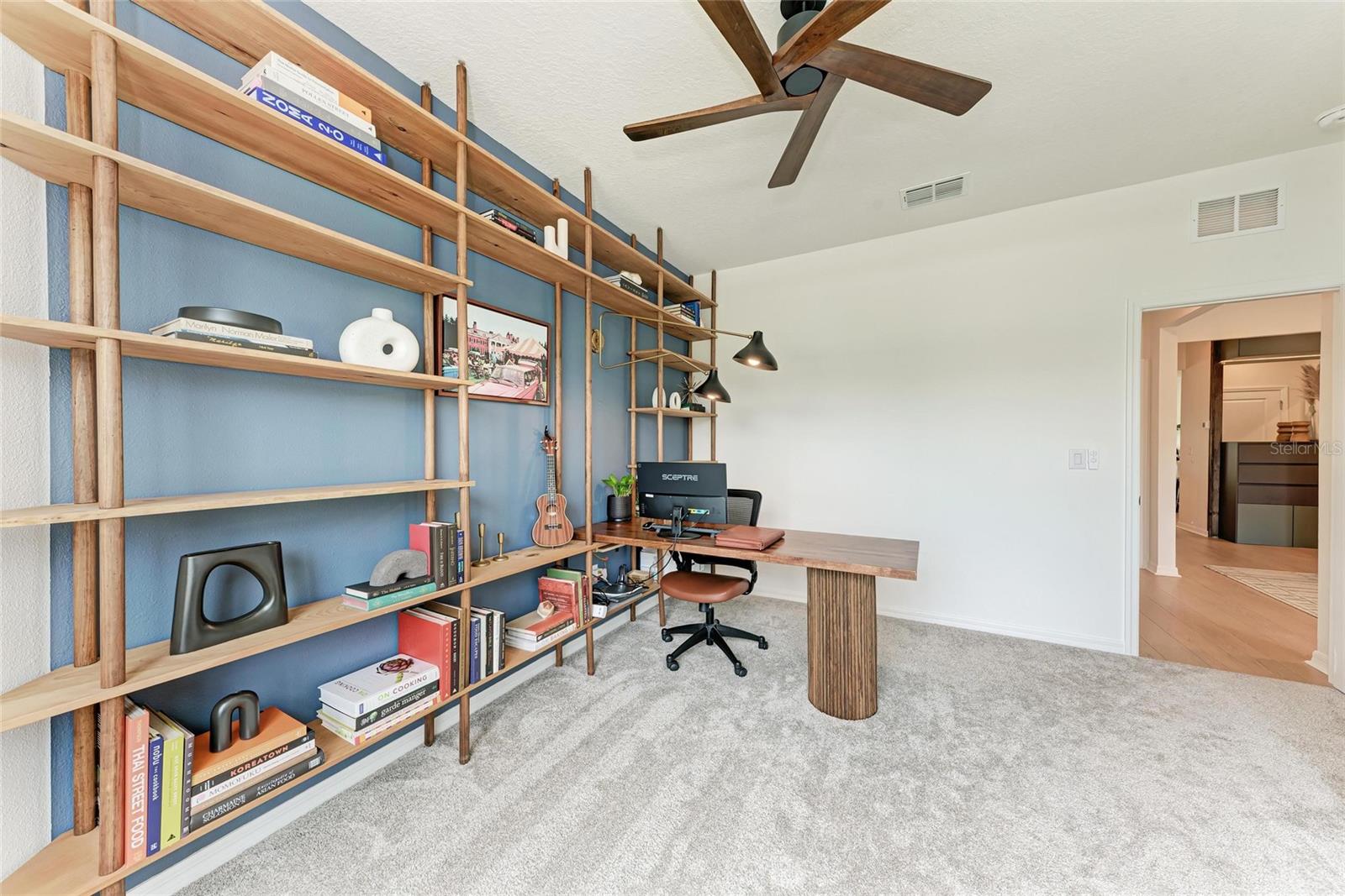 Seller offering up to 2.5% toward buyer’s closing costs, prepaids, or interest rate buy-down with acceptable offer and lender approval. This 2024-built, 3-bedroom, 2-bathroom home offers more than just upgraded finishes—it delivers architectural detail, curated design, and thoughtful luxury at every turn. A fully fenced yard provides privacy and security, while easy-install hurricane shutters offer peace of mind during storm season. Step inside to a striking, floor-to-ceiling custom drop zone with integrated lighting, setting the tone for a home where form meets function. Just off the entry, a dedicated home office features wall-to-wall shelving and a solid wood desk, offering versatile space for books, décor, and creativity—perfect for focused work or artistic inspiration. Nearby, the guest bathroom continues the custom design story with a floating vanity wrapped in waterfall quartz, accented by rich slatted wood paneling and gold fixtures that lend a hotel-style charm and elevate the space. The kitchen is a true showpiece, blending style and efficiency with quartz countertops, a herringbone tile backsplash, soft-close cabinetry, brass hardware, statement pendant lighting, and under/above-cabinet illumination. The adjoining dining area is framed by sliding glass doors for seamless indoor-outdoor flow and anchored by a sculptural mid-century chandelier that adds warmth and personality. The living room is elevated by a bespoke media wall with floating cabinetry, flanked by vertical, true wood slats that add natural texture and depth—creating a bold, architectural centerpiece. In the primary suite, enjoy boutique-inspired comfort with a floating makeup vanity, custom-built nightstands, a minimalist floating headboard, and ambient pendant lighting. A fully built-out walk-in closet offers tailored storage, while the ensuite bath includes dual quartz vanities, organic-shaped mirrors, and a recessed storage nook with dark-stained floating shelves. Located in a boutique community of just 70 homes with no CDD, this residence combines upscale design with everyday convenience. I-75 is just around the corner, and you're within walking distance to Ellenton Premium Outlets—putting shopping, dining, and easy commuting right at your doorstep.