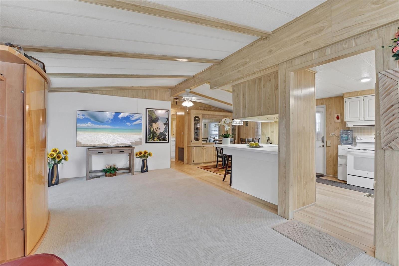Welcome to Tidevue Estates, a desirable land-owned 55+ community offering comfort, convenience, and an open floor plan. This home features a brand-new membrane roof in 2025. Stylish vinyl flooring in the kitchen and dining room. The spacious kitchen has a large island with breakfast counter, perfect for casual dining and entertaining. The living room offers vaulted ceilings, creating a light and airy feel, with an alcove off the living area ideal for a home office or den. The primary bedroom measures 14x11 and includes an en-suite bathroom with a walk-in tub which also allows for a sit down shower. Additional highlights include a one-car attached garage with easy-access ramp into the home, plus extra space for a workshop and storage. The oversized carport accommodates two vehicles and offers ample room to create an outdoor living area—perfect for relaxing or entertaining guests. Low HOA of only $600 annually. Pets are not permitted. Plenty of activities to keep you busy in this community. Take a water aerobics class in the solar-heated community pool or work on your tan. The community library has free WI-FI connection. Updated fitness center. Meet friends and make new ones for a game of indoor pickleball, bocce ball, or shuffleboard. Join the Golf League. Take a bike or golf cart ride to Veteran's Park to watch the wildlife and sunset. Ellenton Premium Outlet Mall, restaurants, and medical facilities are just minutes away. Easy access to I-75. Not to mention a short drive to our beautiful Gulf Beaches.
