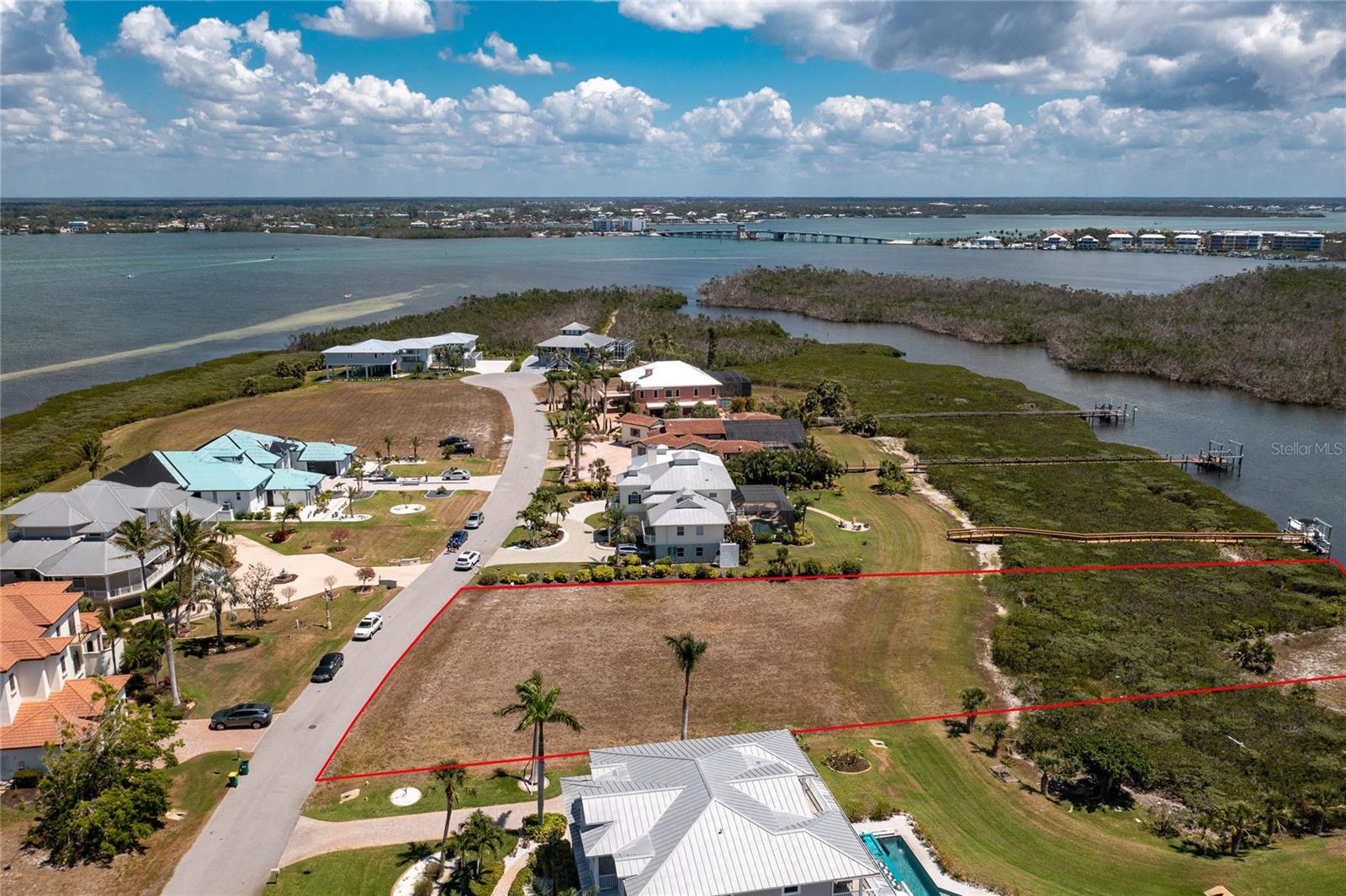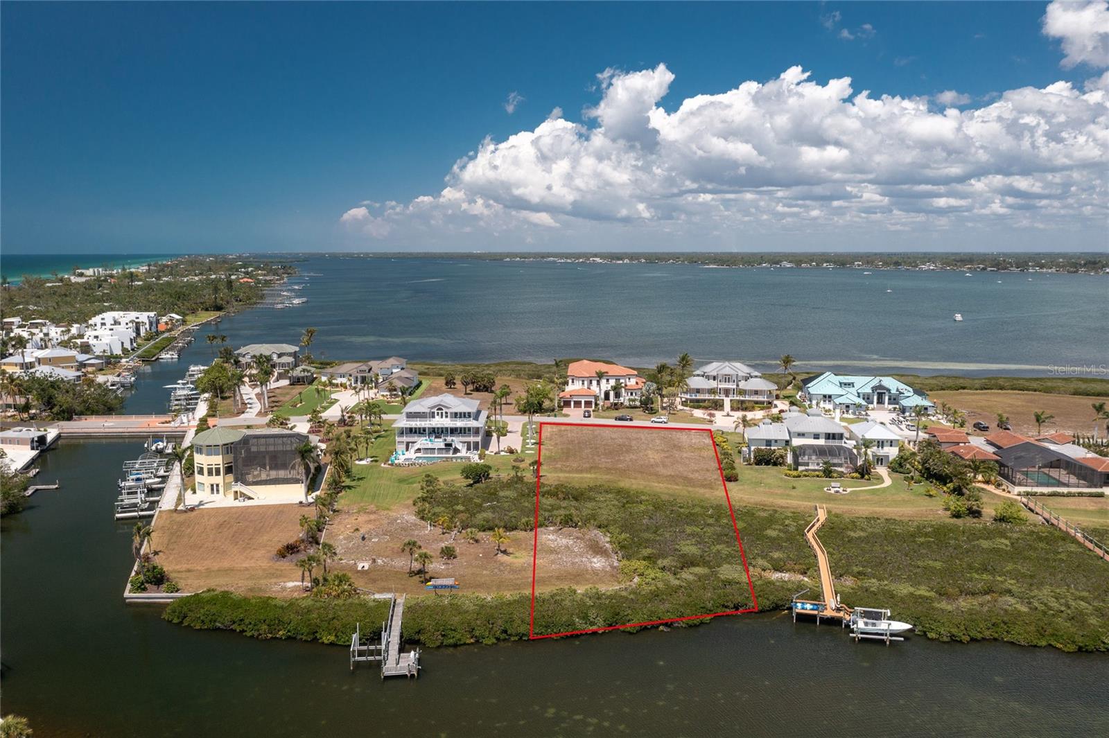 PRIVATE ISLAND COMMUNITY LOCATED ON MANASOTA KEY WITH PRIVATE DEEDED ACCESS TO THE BEACH. GATED COMMUNITY OF ONLY 17 HOMESITES WITH UPSCALE HOMES FROM A MINIMUM OF 3,500 SQ.FT. TO 7,000 SQ.FT. THIS TRULY IS A UNIQUE OPPORTUNITY TO PURCHASE ONE OF THE LAST VACANT LOTS AVAILABLE. ANOTHER HOME HAS BEEN BUILT SINCE THE DRONE PICTURES HAVE BEEN TAKEN. THIS LOT HAS SOUTHERN EXPOSURE FOR THE COLDER WINTER MONTHS! UNIQUE OPPORTUNITY WITH ALL OF THE BEST FEATURES IN PLACE TO BUILD YOUR DREAM HOME NOW OR IN THE FUTURE WITH A CLEARED LOT THAT ALREADY HAS WATER/SEWER/ELECTRIC HOOK UP LOCATED ON THE PROPERTY. ASSIGNED BOAT DOCK WITH 10,000 LB LIFT IN PLACE. IF YOU NEED MORE SPACE FOR YOUR KYAKS, WATER SCOOTERS, ETC. THERE IS AN OPPORTUNITY TO BUILD ANOTHER DOCK AT THE WATER'S EDGE IN FRONT OF YOUR OWN LOT AS WELL AS SPACE FOR A GAZEBO. IF YOU ARE NOT READY TO BUILD YOUR HOME YET, START BY USING YOUR BOAT DOCK WITH A 10,000 LB LIFT AS WELL AS YOUR EASEMENT TO GO TO THE BEACH.