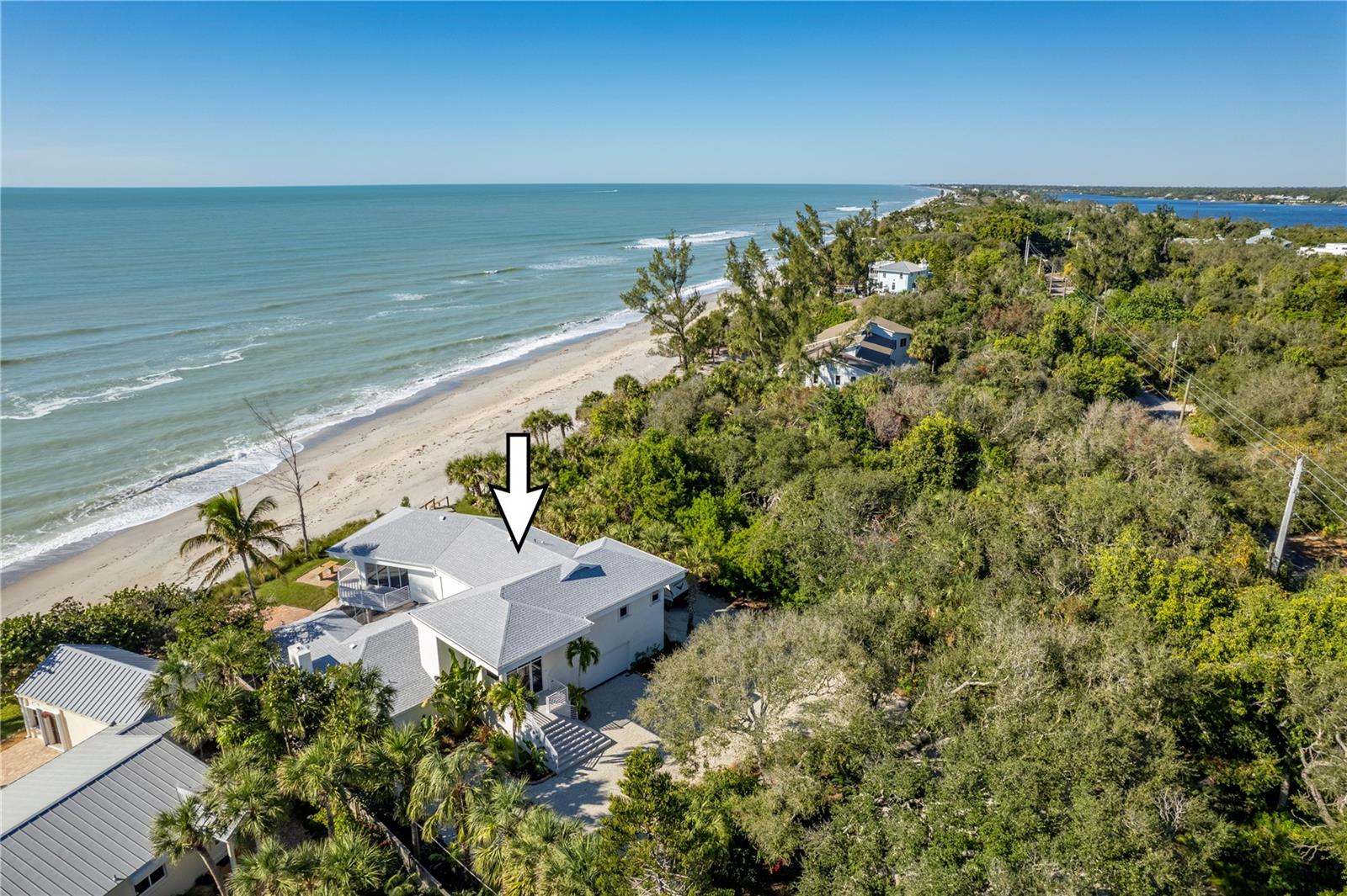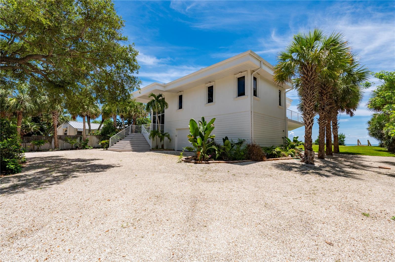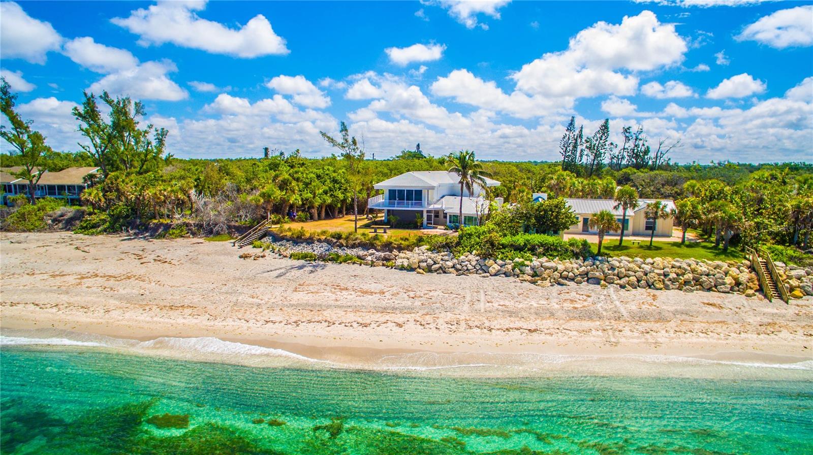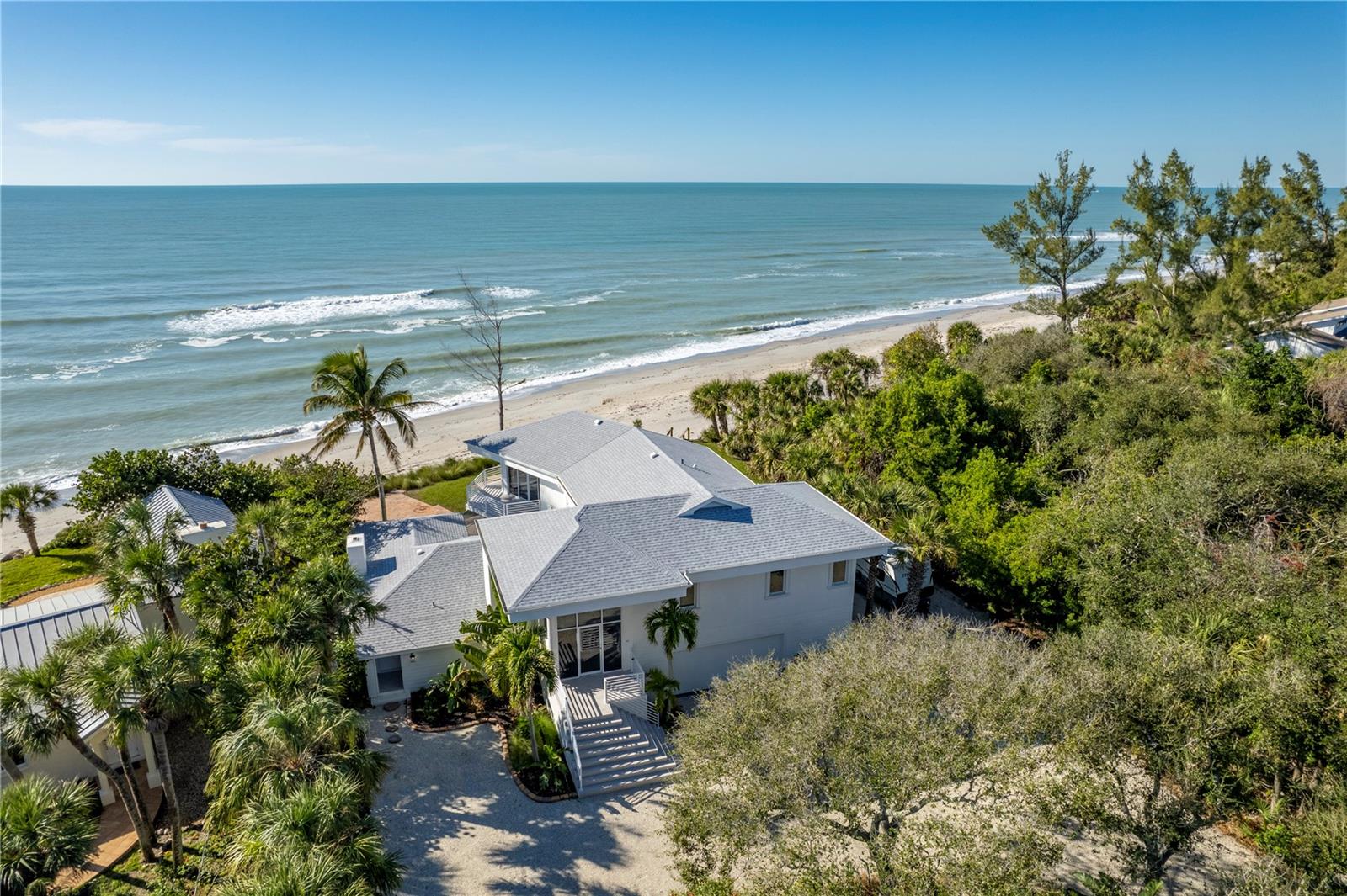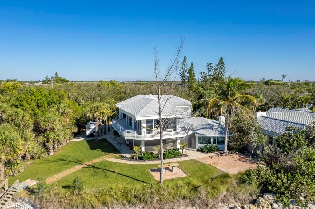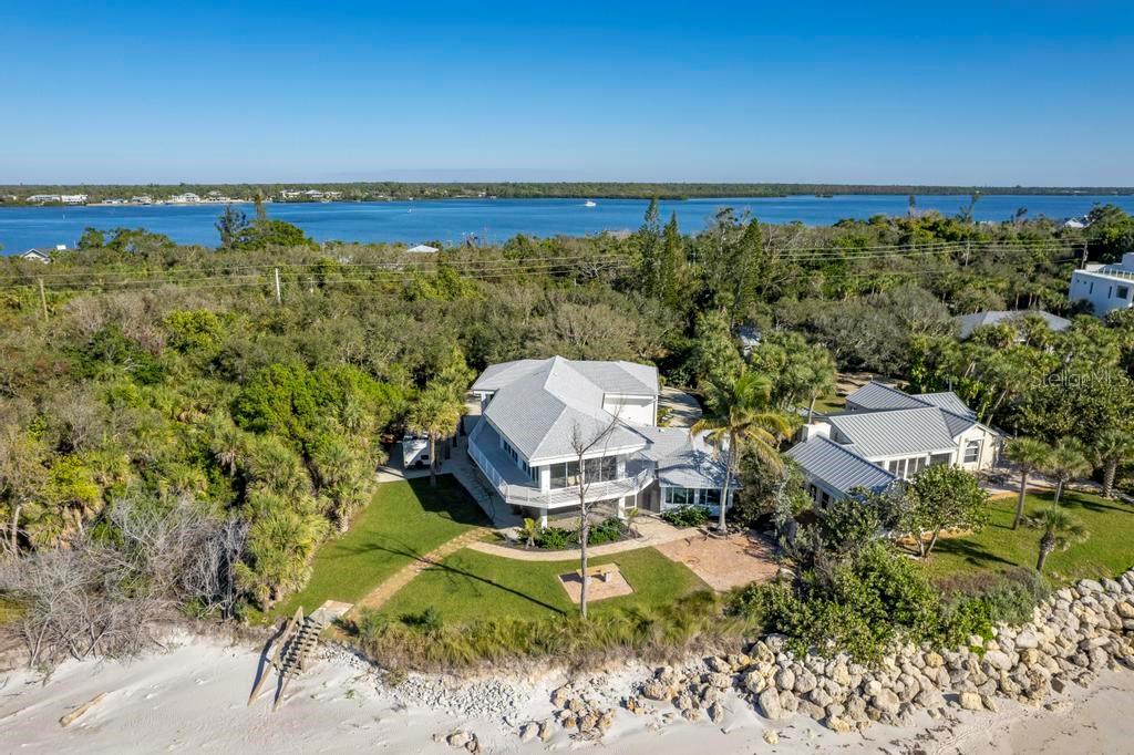 One or more photo(s) has been virtually staged. SOME PHOTOS ARE VIRTUALLY STAGED. A SHADY OAK CANOPY WILL WELCOME YOU TO YOUR NEW TROPICAL PARADISE. COME ENJOY MAJESTIC SUNSETS, COOL BREEZES AND CRYSTAL CLEAR WARM GULF WATERS ON YOUR PRISTINE PRIVATE BEACH NESTLED ON 2/3 OF AN ACRE LOT WITH A BOTNAICAL GARDEN A TROPICAL PLANTS. THIS LUXURY PROPERTY FEATURES HIGH-END NORFOLK MAPLE OYSTER BRUSH GRAY CABINETS AND A MYRIAD OF QUARTZ COUNTERTOPS. HUGE ISLAND AND BREAKFAST BAR. BUILT-IN WINE COOLER, SEPARATE KITENAIDE DOUBLE OVEN AND COOKTOP. STELLAR PANORAMIC VIEW OF THE BEACH FROM MOST EVERY ROOM IN THE HOUSE. DELUXE-WASHED GRAY CERAMIC WOOD PLANK STYLE CERAMICE TILE THROUGHOUT GIVES YOU A NEUTRAL PALATE TO DECORATE YOUR BEACH HOUSE. TWO HOMES HAS TWO FIREPLACES ONE IN THE LOWER APARTMENT AND AN ELECTRIFIED VIDEO FIREPLACE FOR GREAT ATMOSPHERE. NEW SCEENED PATIO IN THE REAR OF THE HOUSE HAS LOTS OF ROOM FOR AND OUTDOOR KITCHEN AND OUTDOOR LIVINGROOM. HUGE 4 CAR GARAGE AND PLENTY OF PARKING SPACES FOR BOATS, RVS AND OTHER TOYS. WRAP AROUND BALCONY ON TOP FLOOR WILL GIVE YOU A BIRD EYE VIEW OF THE SERENE TROPICAL WATERS. THE GATED ENTRY GIVES YOU SECURITY AND PRIVACY WITH NEWLY INSTALLED GREEN FENCING. NEW ROOF INSTALLED IN 2023. FRESHLY PAINTED INSIDE AND OUT. NEW CHANDELIER, ISLAND-STYLE CEILING FANS, AND NEW LIGHTS FIXTURES. ALL NEW VANITIES THROUGHOUT AND BATHS REMODELED. HUGE COVERED SCREEN LANAI IS PERFECT FOR ENTERTAINING. ESCAPE FROM THE HECTIC WORLD TO ISLAND PARADISE TWO SEPARATE LIVING AREAS MAKE THIS FLOOR PLAN FLEXIBLE FOR GUESTS AND A HOME OFFICE. MASTER ON SECOND FLOOR AND 2 BEDROOMS ON THE FIRST FLOOR APT WITH KITCHEN AND DEN.) THERE IS AN EASEMENT TO THE BAY WHERE YOU CAN BUILD A FUTURE SHARED DOCK, FISH OR LAUNCH A KAYAK.LOCATED 10 MINUTES FROM THE ENGLEWOOD BEACH ENTERTAINMENT DISTRICT GIVES YOU ACCESS TO SEVERAL COASTAL RESTAURANTS, BEACH BARS WITH LIVE MUSIC, OLD FLORIDA FISH MARKET, SHOPPING AND MORE.