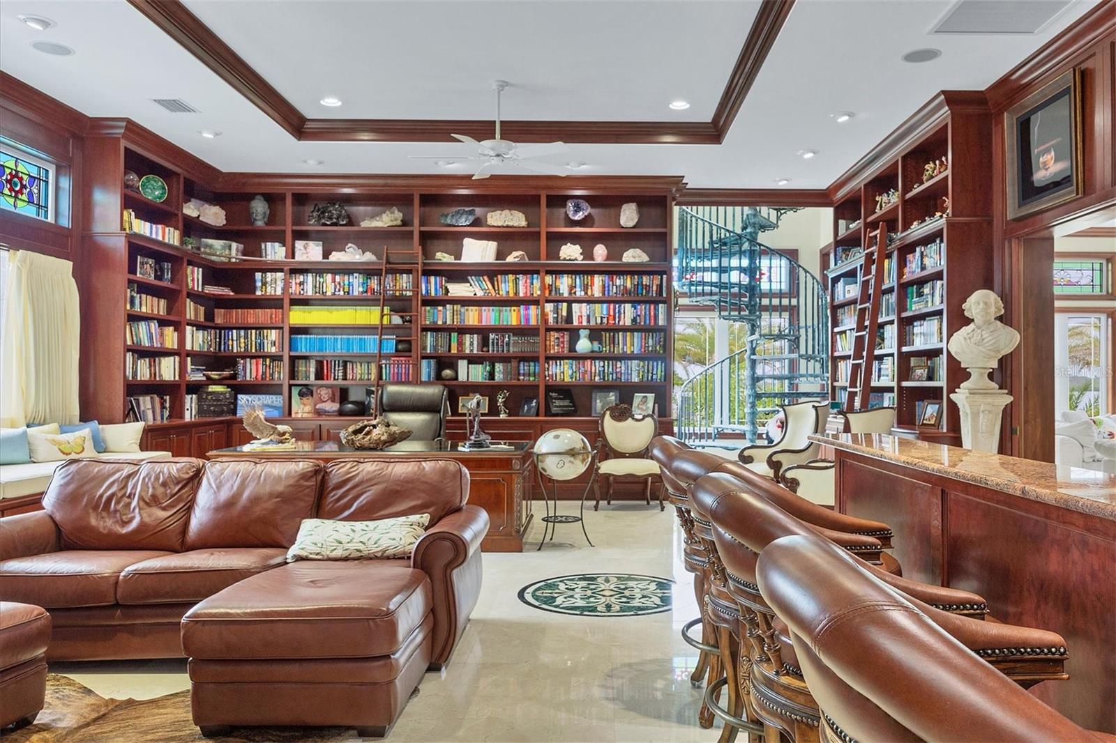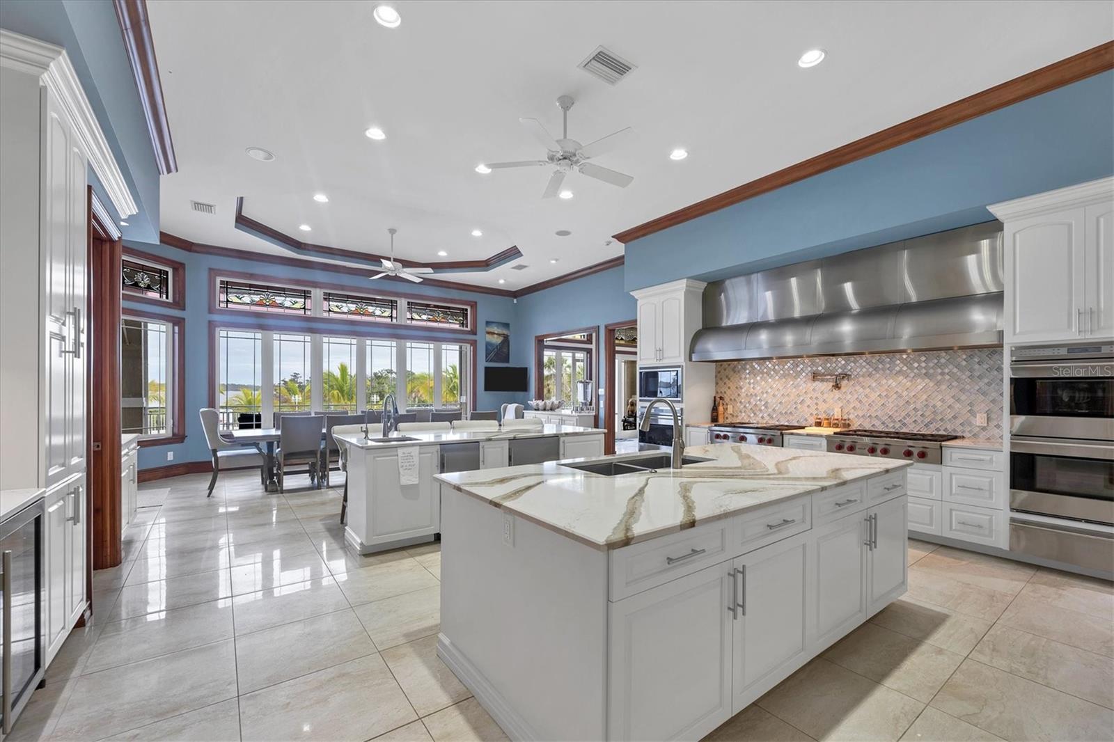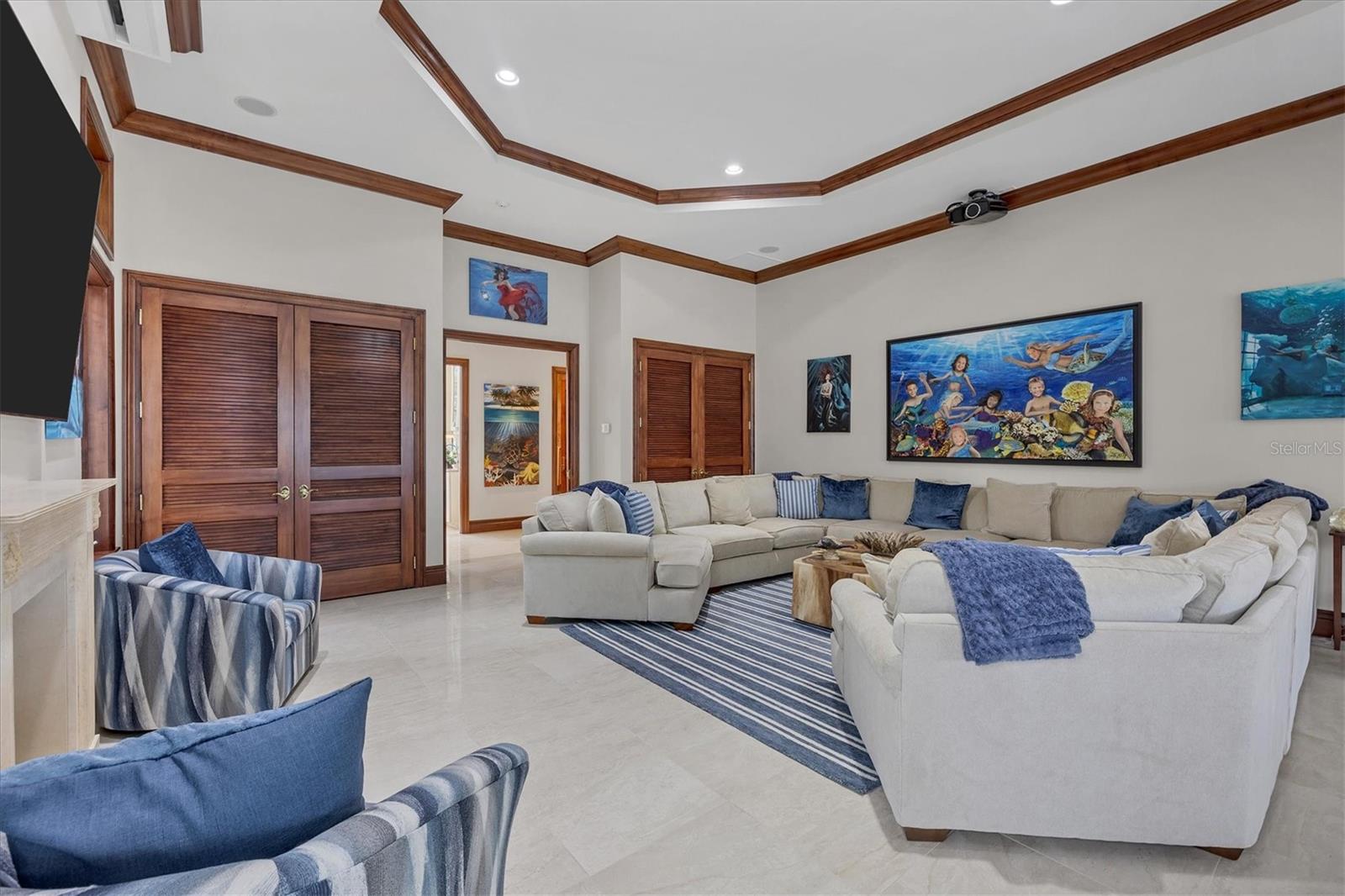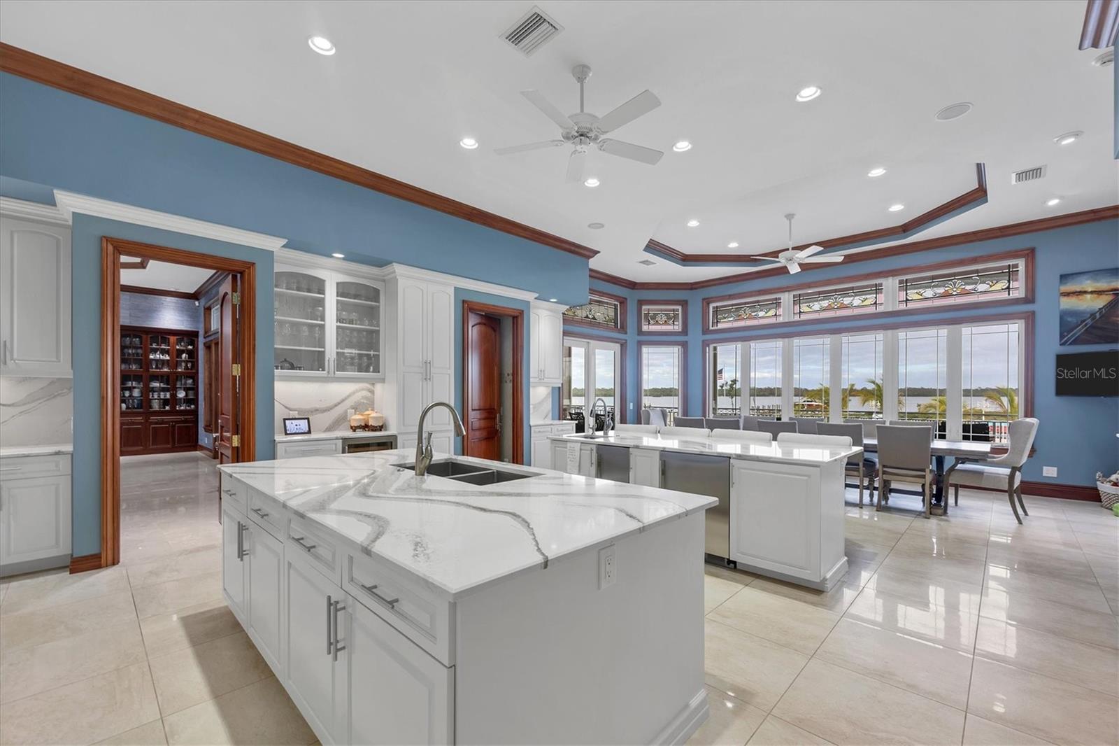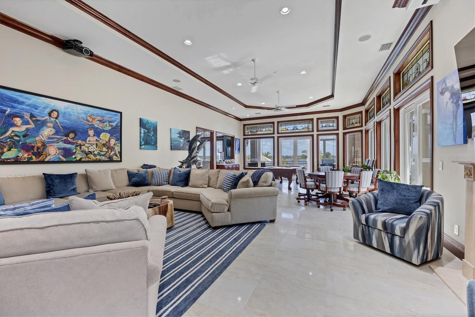 This stunning and sophisticated custom waterfront home, designed for welcoming family and friends, awaits on a luxurious 3-acre property on Manasota Key's idyllic Lemon Bay. Enter through the gates and meander along the long driveway through gardens with waterfalls, sculptures, and manicured putting greens. Arrive at the stately porte cochere – the entrance to this magnificent estate. The architectural details are striking, from the double leaded glass front entry doors to the glowing custom stained glass transom windows encircling the first floor, all leading to over 12,000 square feet of resort style living space. A glass elevator is conveniently located in the two-story foyer, completing the remarkable lobby space. Meticulous attention to detail, optimal comfort, and thoughtful design are evident in every room of this home. The residence boasts six bedrooms, ten full bathrooms, one half bathroom, and features two well-organized laundry rooms for convenience. The impressive library is adorned with floor-to-ceiling built-in bookshelves and a well-appointed bar, creating an inviting and stylish space. The family room offers multiple glass doors that lead to the terrace, providing an abundance of natural light, complemented by two closets equipped with built-in sinks, cabinets, and beverage coolers. High tray ceilings and a movie screen with projector enhance the ambiance of this space, while a bonus room, an office, an expansive living room, a state-of-the-art gym, and a formal dining room collectively ensure ample accommodation for guests. The kitchen is a professional chef’s dream, with two islands, Sub-Zero appliances, a ten-burner Wolf cooking range, wine refrigerator, beverage cooler drawers, an ice maker, a massive walk-in pantry, and a dining area overlooking the outdoor area and bay. Retreat to the primary suite, with unparalleled views of the bay from the private screened-in terrace, a cozy fireplace, a separate sitting room, elegant bath amenities, ample custom closets and a spiral staircase down to the library. Each ensuite bedroom has access to the expansive upper terrace or the rooftop deck for ultimate views and relaxation. An additional 15,000 square feet of space includes the oversized and newly resurfaced saltwater pool, spa, full outdoor kitchen, outdoor dining and entertaining space, multiple terraces, a bocce court, and a volleyball court, all leading to the dock with boat lift. Entertain grandly, with ample space for parking, or create the ultimate car collection in the ground-level newly tiled garage that can easily accommodate 20 cars. Deeded access to the beach and the sparkling waters of the Gulf of Mexico completes this grand estate. This home is perfect for those who value privacy and opulence yet love to entertain. Conveniently located on Manasota Key, yet only a short drive to all that Venice and Sarasota have to offer. This home and property are truly one of a kind! Bedroom Closet Type: Walk-in Closet (Primary Bedroom).