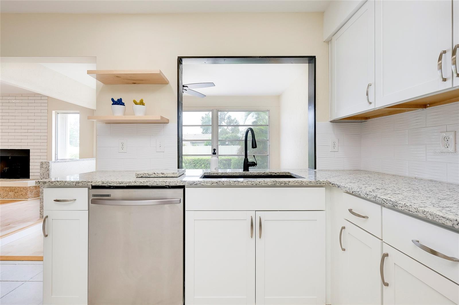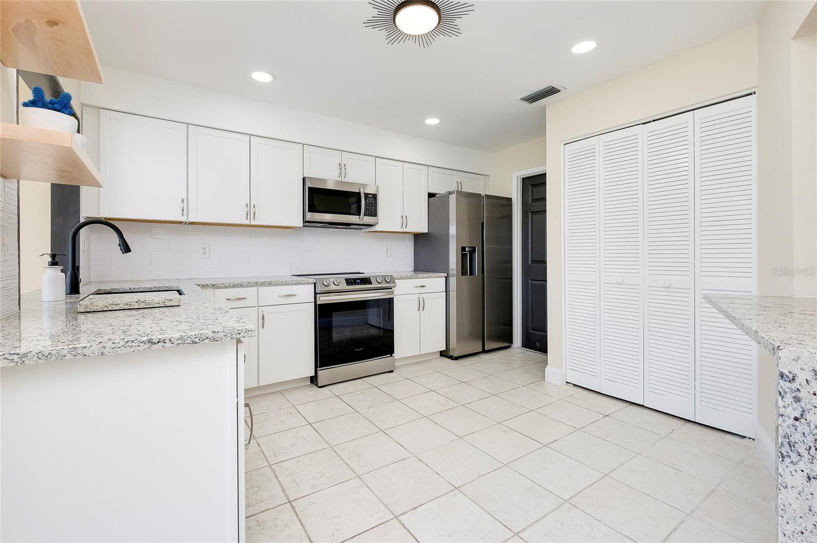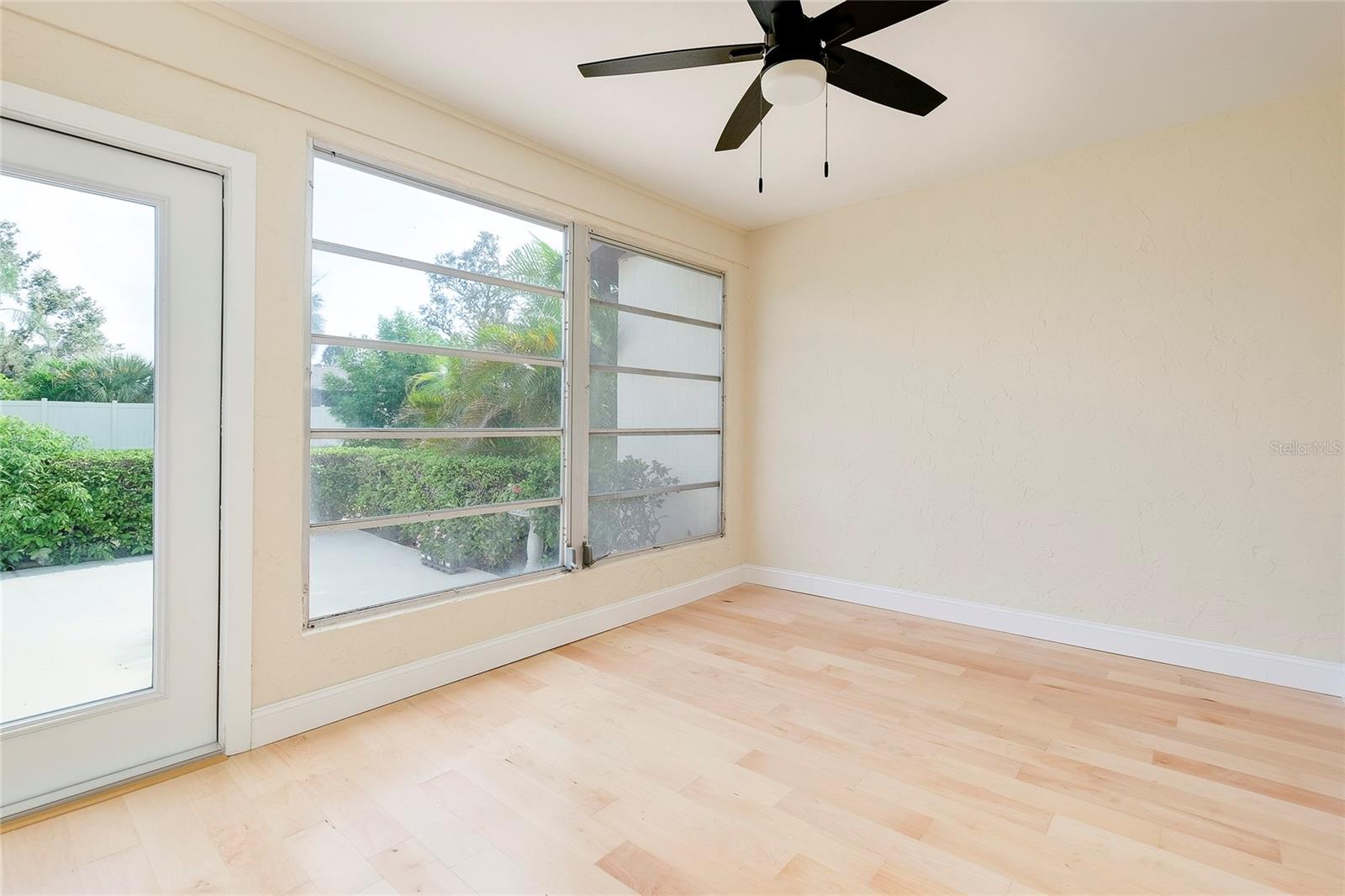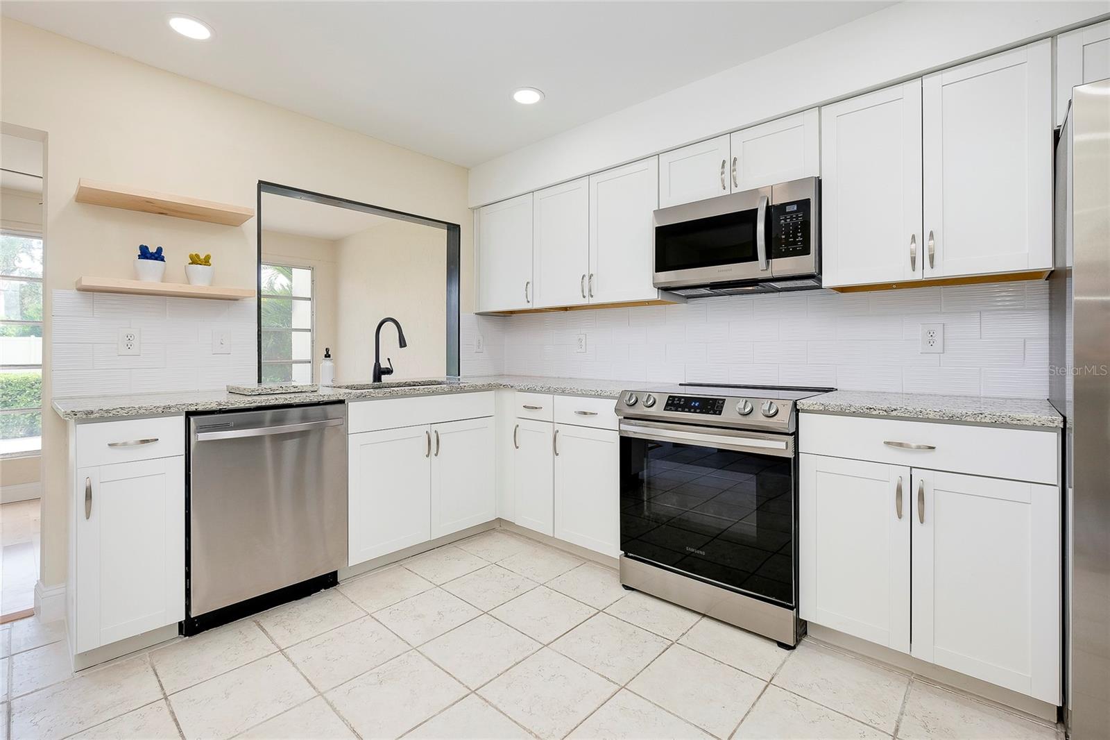 This is a lovely and active 55+ community with community pool, community center, Tennis/pickleball courts and much more. A very walkable neighborhood with sidewalks. Only a few miles to the incredibly beautiful beaches, great restaurants and shopping! This home has been completely remodeled with new HURRICAN IMPACT WINDOWS THROUGHOUT! NEW ROOF & EXTERIOR PAINT. All stippled ceiling removed. The kitchen has new cabinets with granite countertops, a lovely eat on counter with a granite waterfall top and all new appliances. In the living room you will find a beautiful masonry fireplace with new tiled surround and hearth, cathedral ceilings, new recessed lighting and maple engineered hardwood floors. There are 2 master suites with maple engineered floors, new sinks, vanities, medicine cabinets and lighting in both bathrooms. The walk in closet is a dream with loads of space. This home also has a sunroom/flex space off of the kitchen and living room. with a door to the very large back patio and a private back yard. The 2 car garage has garage screening and sooooo much built in storage space for all of your storage needs.