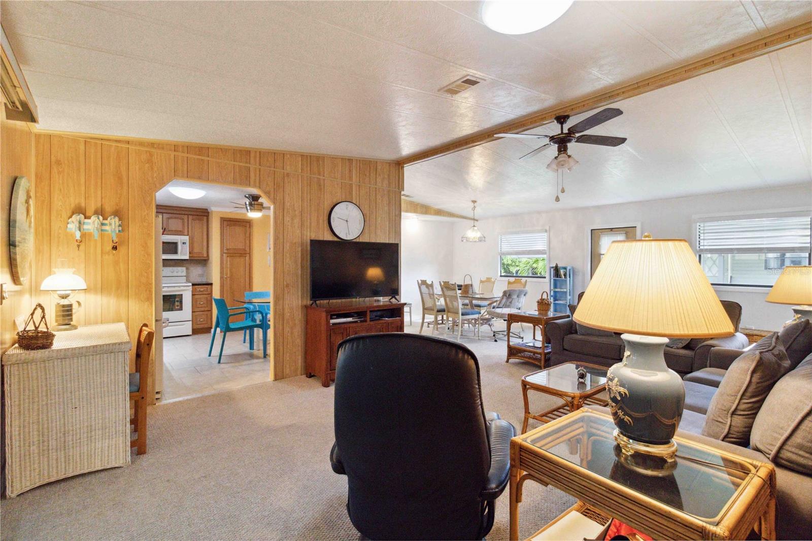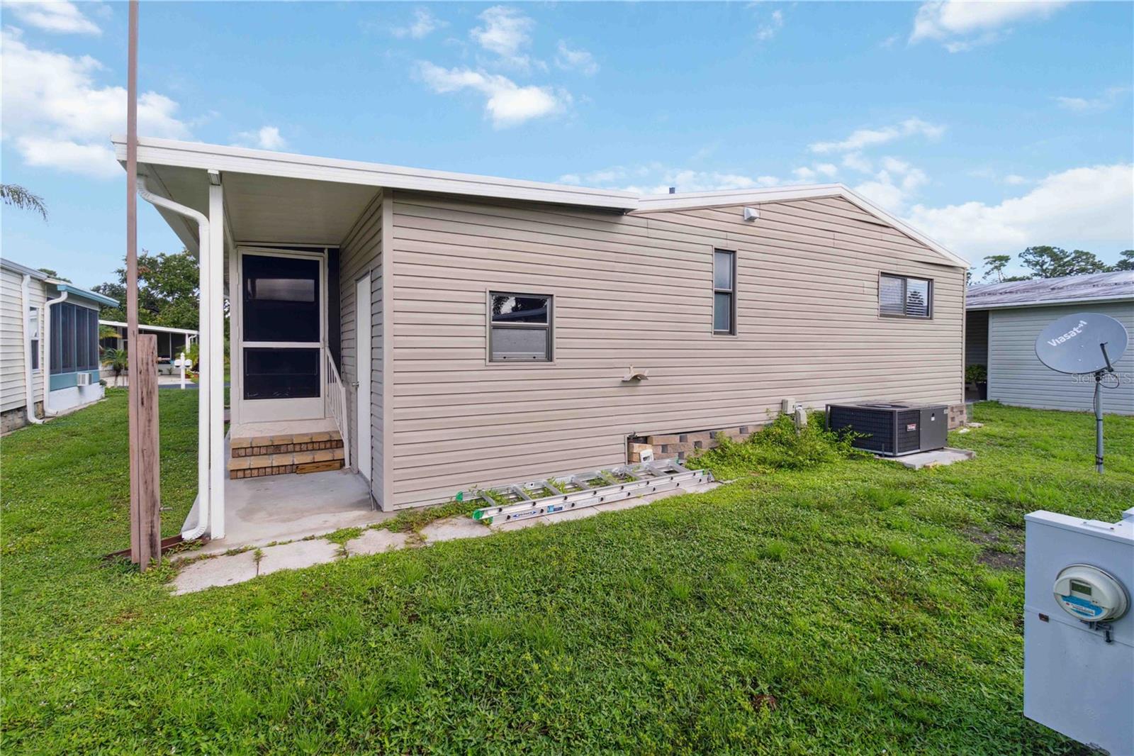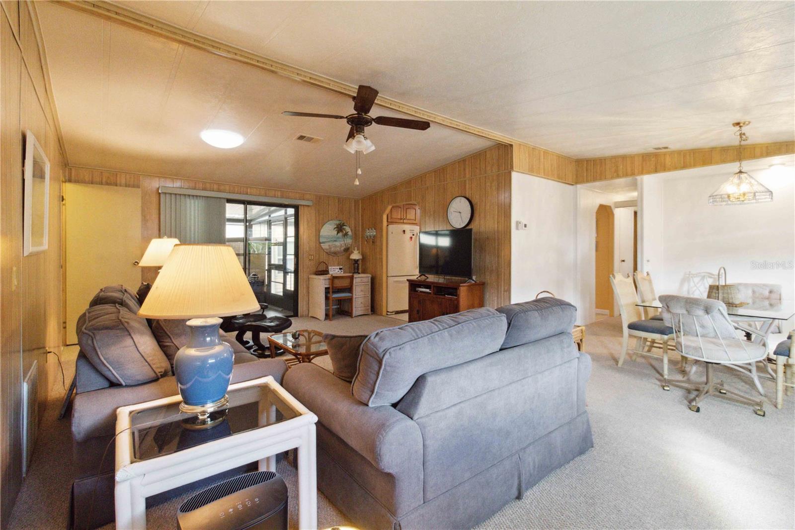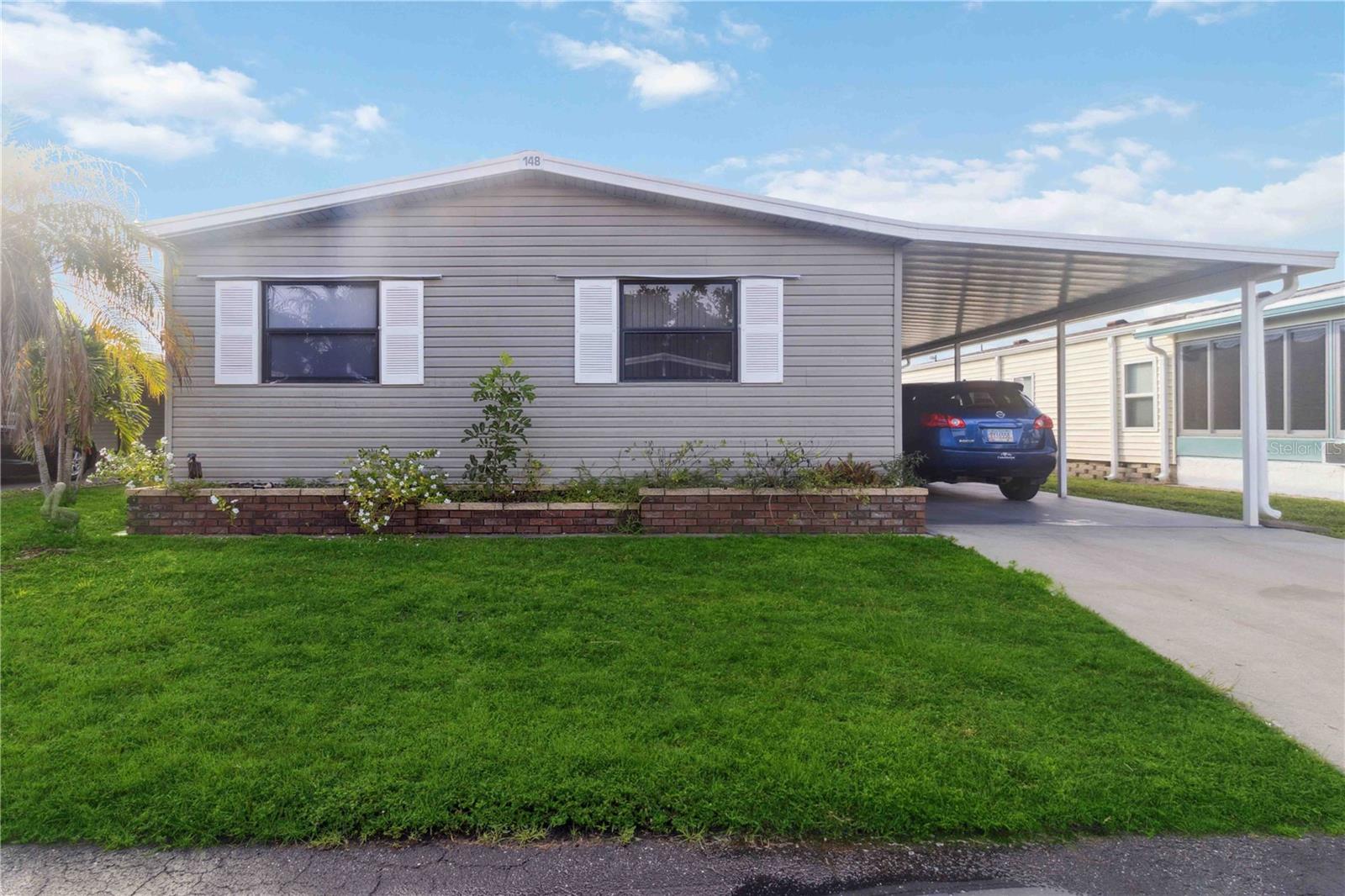For sale in the 55+ community of Polynesian Village, this partially furnished 3-bedroom, 2-bathroom, 1,248 sq. ft. doublewide home is located in the no-pet section. The home features newer carpet in the living areas and bedrooms, with tile flooring in the kitchen. In the bathrooms, there is waterproof laminate flooring. The kitchen includes a pantry for extra storage and space for a dining table. The primary bedroom boasts a walk-in closet and an updated ensuite with a newer vanity, waterproof laminate flooring, and a walk-in shower. The second updated bathroom, located near the two guest bedrooms, has a tub/shower combo and an updated vanity. Additional features include an indoor laundry room, a screened lanai for extra seating, and an outdoor storage room. Major updates were made including a newer roof, AC, and water heater. Polynesian Village offers low HOA fees, a range of activities, and is close to the beach. Polynesian Village amenities include a community pool, sun deck, 3 shuffleboard courts and a beautiful newly remodeled clubhouse that hosts many entertainment events. Extra storage available for your boat, RV or trailer or space for shed/storage at 125/yr.Located in an X flood zone, no flood insurance is required. This partially furnished home is ready for you to move in—schedule a viewing today!