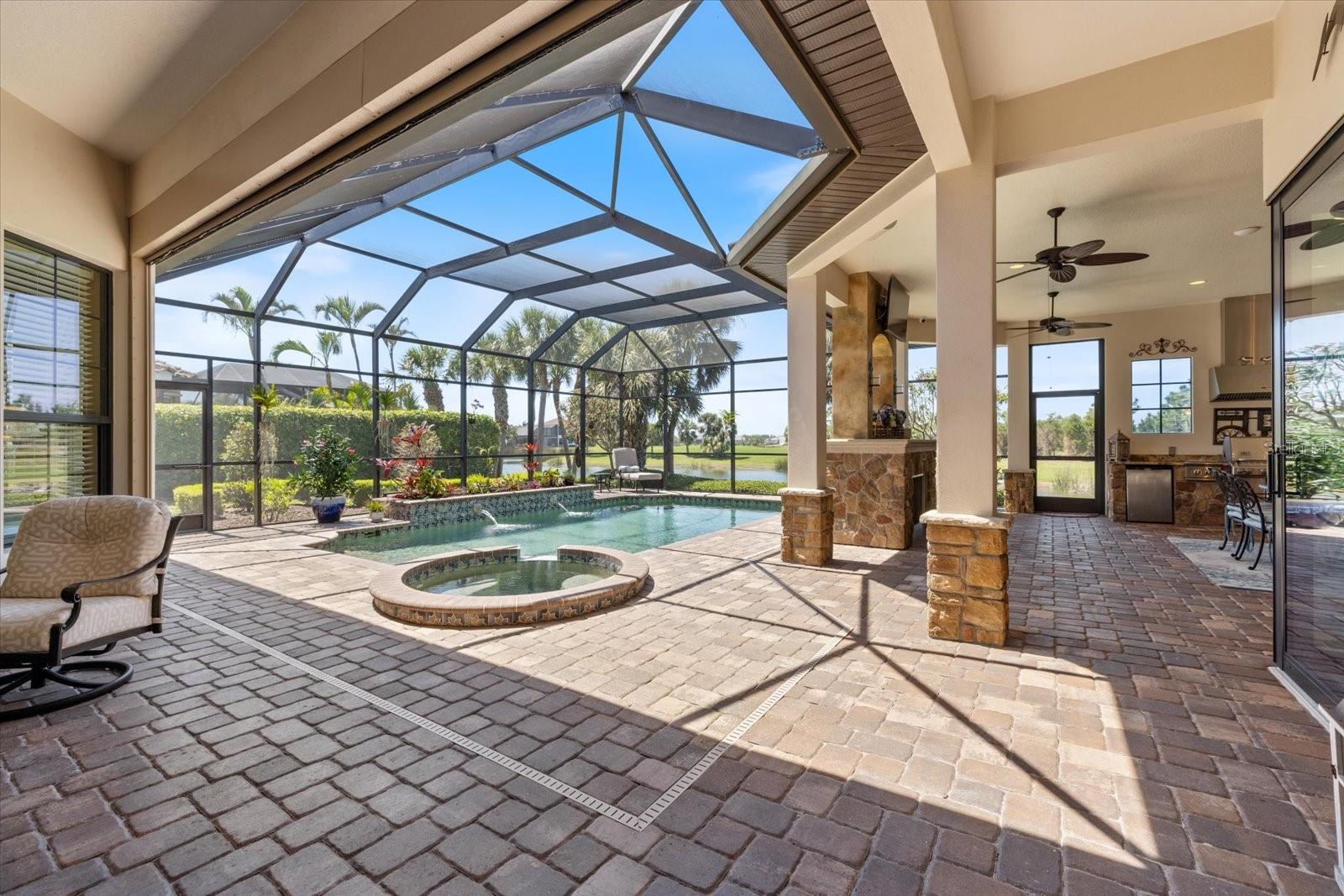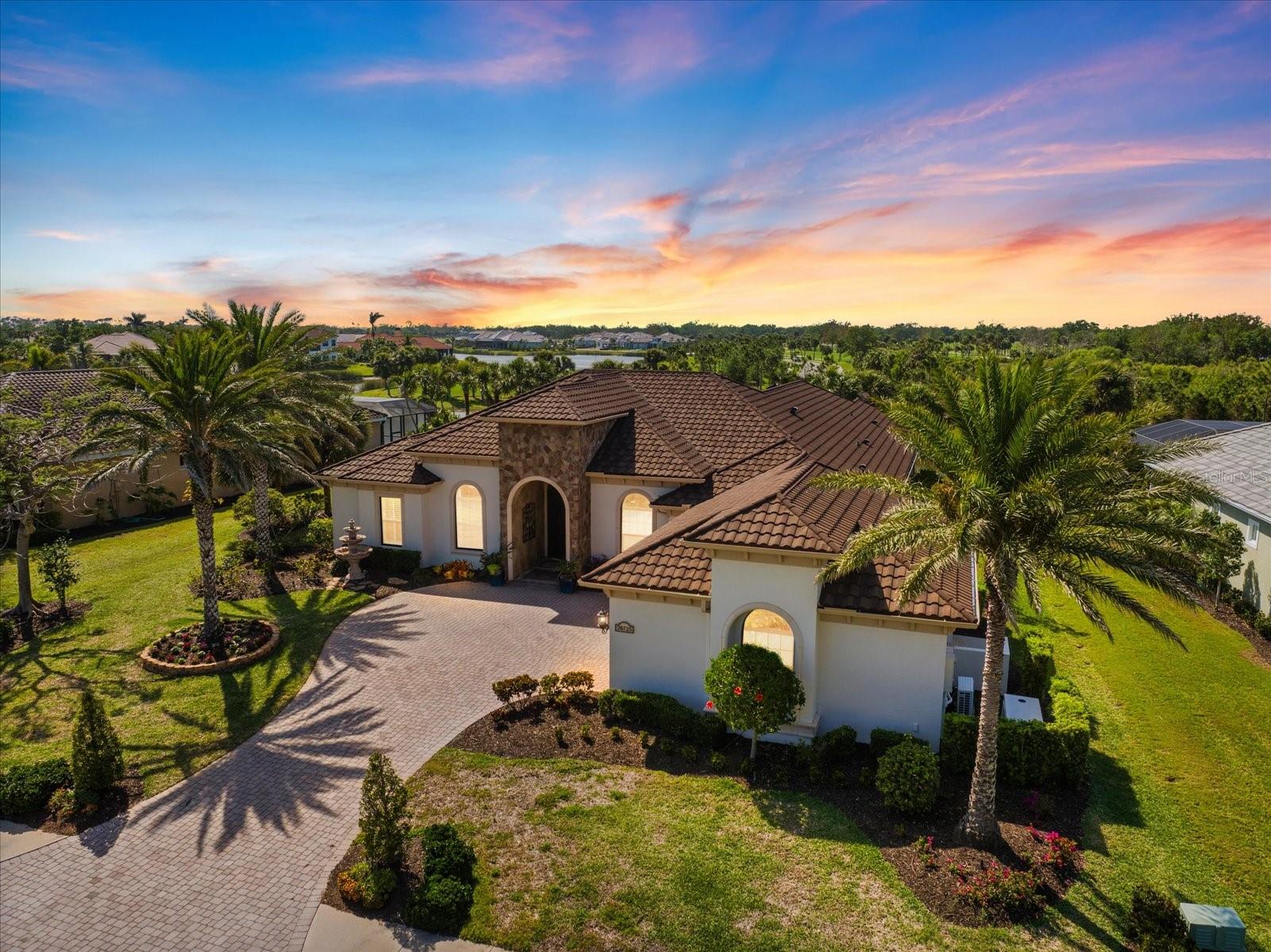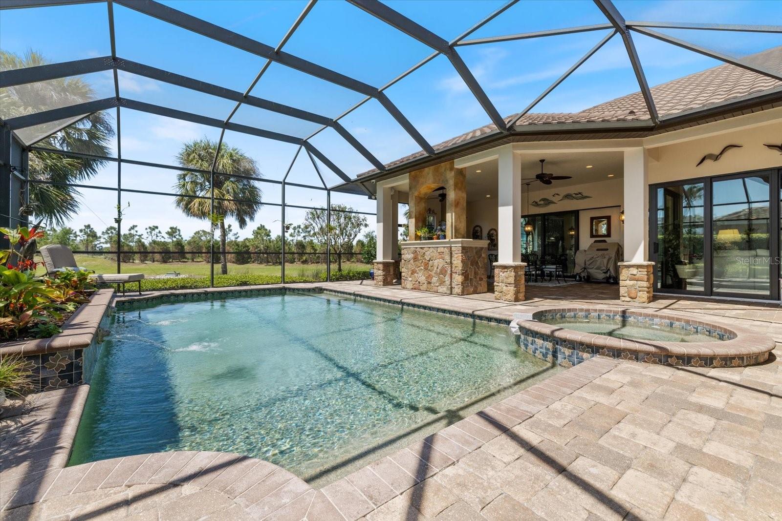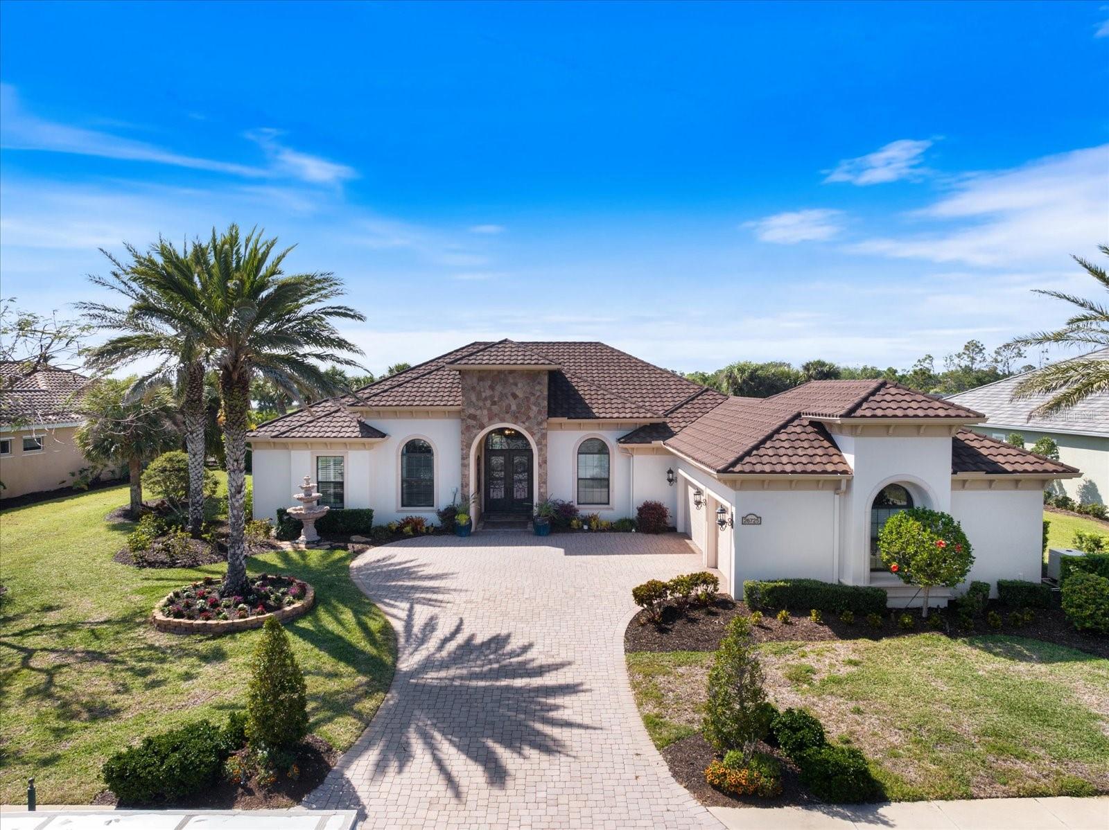 Welcome to an exquisite sanctuary of luxury and elegance nestled at 26725 Raphis Royale Boulevard, Englewood, Florida. This distinguished Arthur Rutenburg built residence stands as a testament to refined living, boasting three spacious bedrooms and four impeccably designed bathrooms within an expansive 3,846 square feet. Every corner of this home is graced with architectural flourishes that perfectly blend sophistication with comfort, catering to those with an appreciation for detail and quality craftsmanship. The exterior of this magnificent home presents a haven for relaxation and entertainment. A saltwater heated pool and spa offer a tranquil retreat, while the outdoor kitchen and fireplace extend an invitation to enjoy alfresco dining and gatherings with family and friends amidst stunning water views. The property is framed by long water and golf course vistas, providing a picturesque setting that changes with the light and seasons. This striking residence also offers peace of mind with a new metal roof, durable impact glass windows, and a whole-house generator, ensuring comfort and security are never compromised. Upon entering, you are greeted by a grand foyer that leads you to a formal dining room, perfect for hosting elegant dinners, and an inviting library/den that offers a quiet retreat for reading or working from home. The chef's kitchen is a culinary masterpiece, designed with a butler's pantry and custom cabinetry, and equipped with state-of-the-art appliances that ensure meal preparation is a pleasure rather than a chore. The eat-in kitchen seamlessly flows into the open living spaces, all thoughtfully enhanced by elegant chandeliers and custom window treatments that add a touch of luxury to everyday life. The main floor houses the primary suite, a sanctuary of its own. This luxurious space includes a walk-in closet that offers ample storage and an elegant en-suite bathroom designed for relaxation and rejuvenation. Indulge in the serene ambiance provided by working fireplaces both indoors and on the lanai, creating cozy spaces for relaxation throughout the year. Beyond the home, the lifestyle at Boca Royale offers an array of premier amenities catering to every interest and desire. Golf enthusiasts will delight in the meticulously maintained 18-hole, par-72 golf course, complete with a driving range, putting green, and fully equipped Pro Shop. Six lighted Har-Tru clay tennis and pickleball courts offer the perfect setting to enjoy the Florida sunshine and engage in friendly competition. Membership options are thoughtfully tailored to meet diverse interests, encompassing golf, tennis, pickleball, fitness, and social engagement, ensuring there is something for everyone. The Boca Royale lifestyle extends beyond the immediate confines of the home. The elegant Georgian-style Clubhouse provides breathtaking views of the golf course and a variety of dining options, from casual to refined, catering to every palate. Additionally, the location is conveniently close to beautiful beaches, a variety of restaurants, and the vibrant downtown Wellen Park area, ensuring that culture, leisure, and entertainment are always within reach. This residence is truly a masterpiece, offering an unparalleled lifestyle of comfort, elegance, and security.