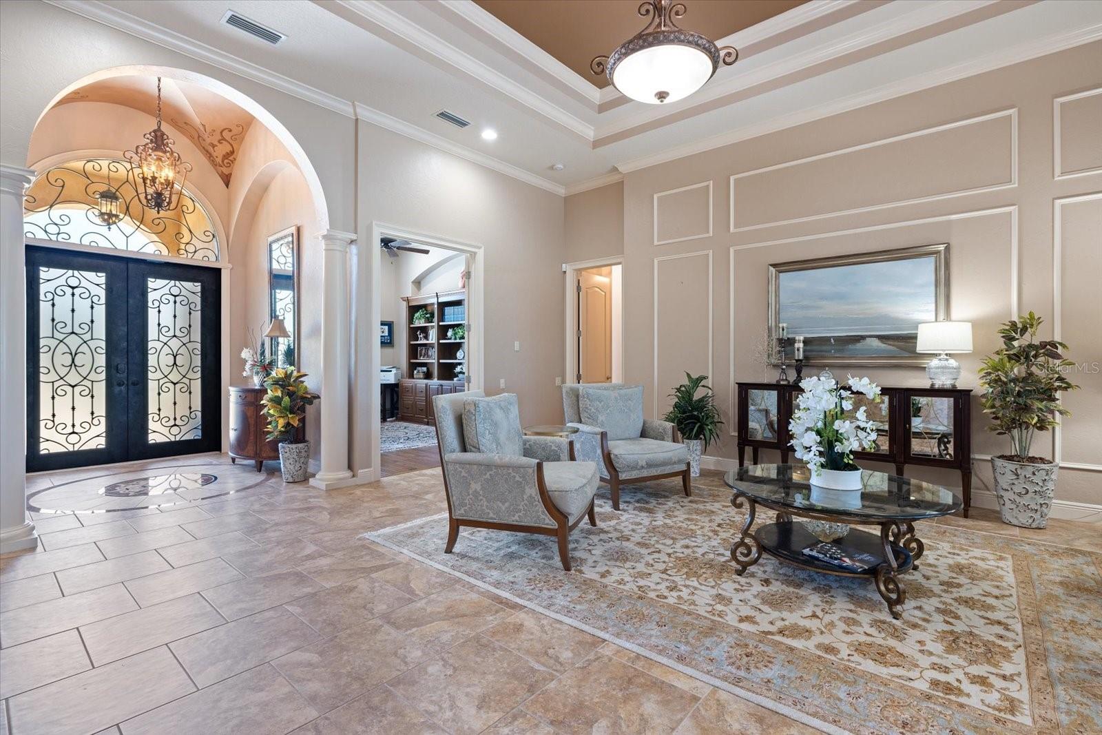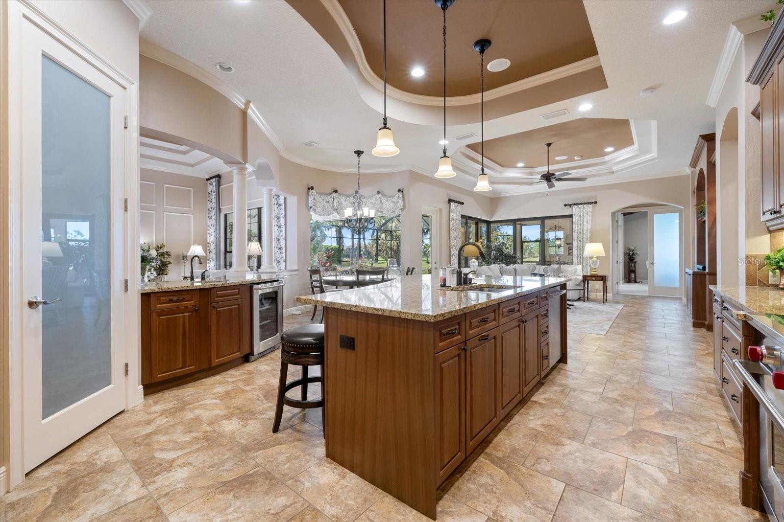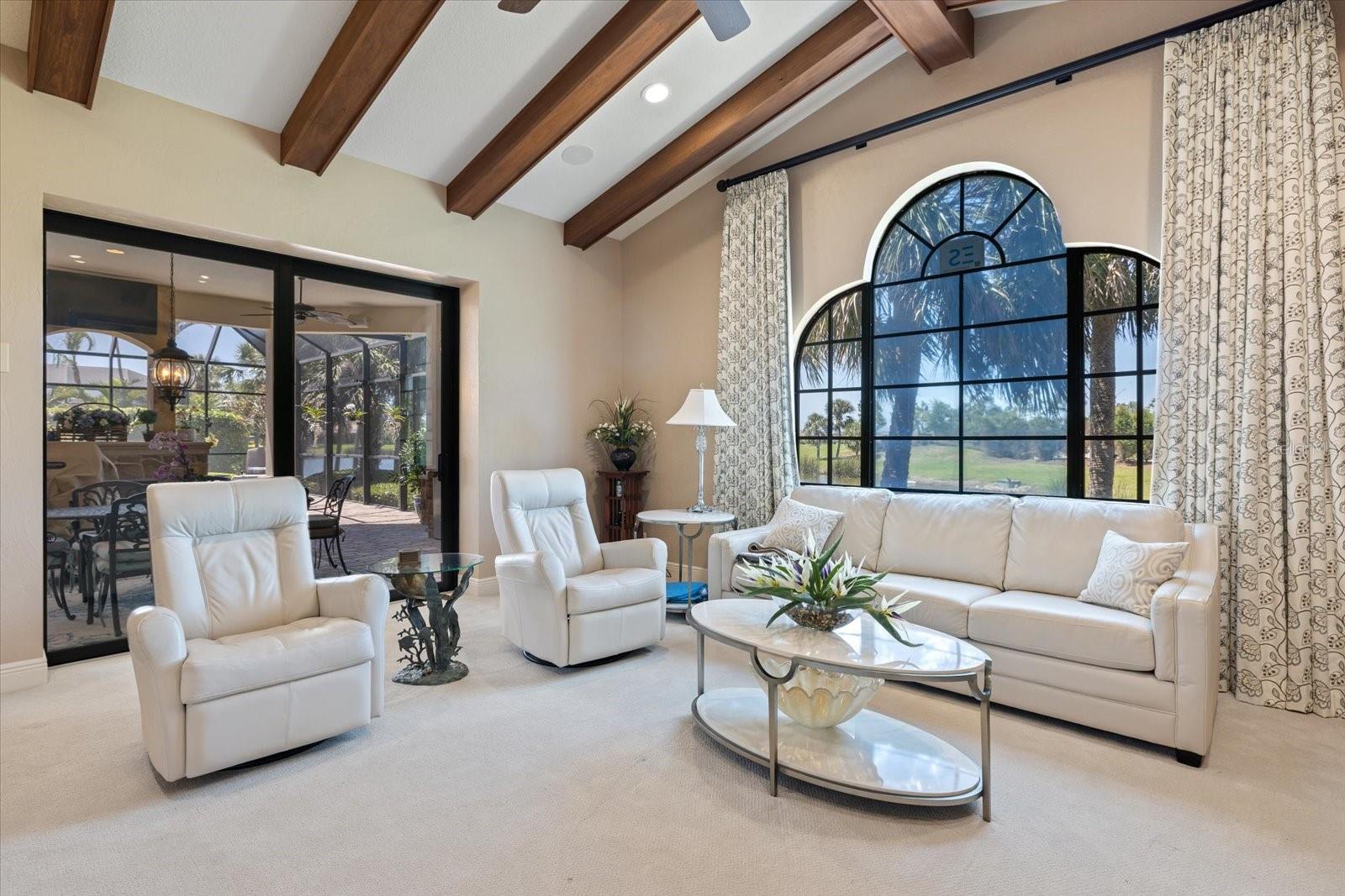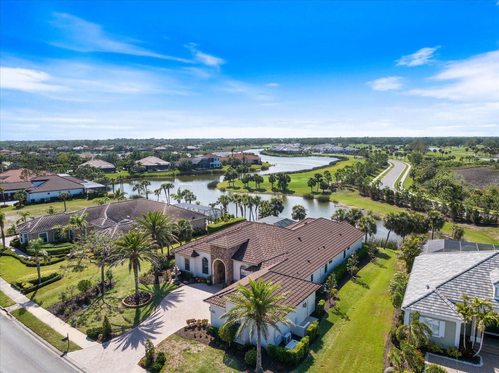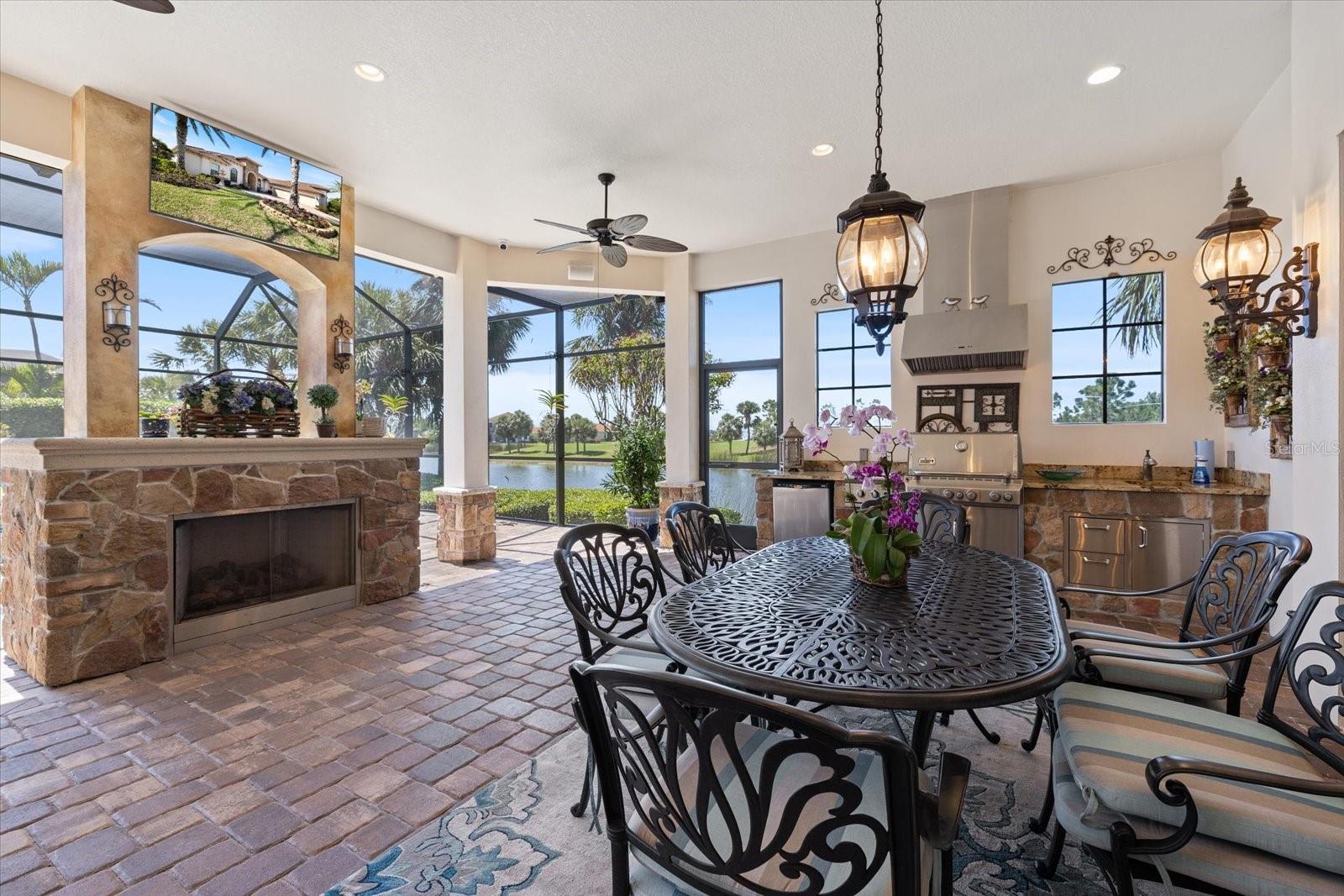 Welcome to an exquisite sanctuary of luxury and elegance nestled at 26725 Raphis Royale Boulevard, Englewood, Florida. This distinguished Arthur Rutenburg built residence stands as a testament to refined living, boasting three spacious bedrooms and four impeccably designed bathrooms within an expansive 3,846 square feet. Every corner of this home is graced with architectural flourishes that perfectly blend sophistication with comfort, catering to those with an appreciation for detail and quality craftsmanship. The exterior of this magnificent home presents a haven for relaxation and entertainment. A saltwater heated pool and spa offer a tranquil retreat, while the outdoor kitchen and fireplace extend an invitation to enjoy alfresco dining and gatherings with family and friends amidst stunning water views. The property is framed by long water and golf course vistas, providing a picturesque setting that changes with the light and seasons. This striking residence also offers peace of mind with a new metal roof, durable impact glass windows, and a whole-house generator, ensuring comfort and security are never compromised. Upon entering, you are greeted by a grand foyer that leads you to a formal dining room, perfect for hosting elegant dinners, and an inviting library/den that offers a quiet retreat for reading or working from home. The chef's kitchen is a culinary masterpiece, designed with a butler's pantry and custom cabinetry, and equipped with state-of-the-art appliances that ensure meal preparation is a pleasure rather than a chore. The eat-in kitchen seamlessly flows into the open living spaces, all thoughtfully enhanced by elegant chandeliers and custom window treatments that add a touch of luxury to everyday life. The main floor houses the primary suite, a sanctuary of its own. This luxurious space includes a walk-in closet that offers ample storage and an elegant en-suite bathroom designed for relaxation and rejuvenation. Indulge in the serene ambiance provided by working fireplaces both indoors and on the lanai, creating cozy spaces for relaxation throughout the year. Beyond the home, the lifestyle at Boca Royale offers an array of premier amenities catering to every interest and desire. Golf enthusiasts will delight in the meticulously maintained 18-hole, par-72 golf course, complete with a driving range, putting green, and fully equipped Pro Shop. Six lighted Har-Tru clay tennis and pickleball courts offer the perfect setting to enjoy the Florida sunshine and engage in friendly competition. Membership options are thoughtfully tailored to meet diverse interests, encompassing golf, tennis, pickleball, fitness, and social engagement, ensuring there is something for everyone. The Boca Royale lifestyle extends beyond the immediate confines of the home. The elegant Georgian-style Clubhouse provides breathtaking views of the golf course and a variety of dining options, from casual to refined, catering to every palate. Additionally, the location is conveniently close to beautiful beaches, a variety of restaurants, and the vibrant downtown Wellen Park area, ensuring that culture, leisure, and entertainment are always within reach. This residence is truly a masterpiece, offering an unparalleled lifestyle of comfort, elegance, and security.
