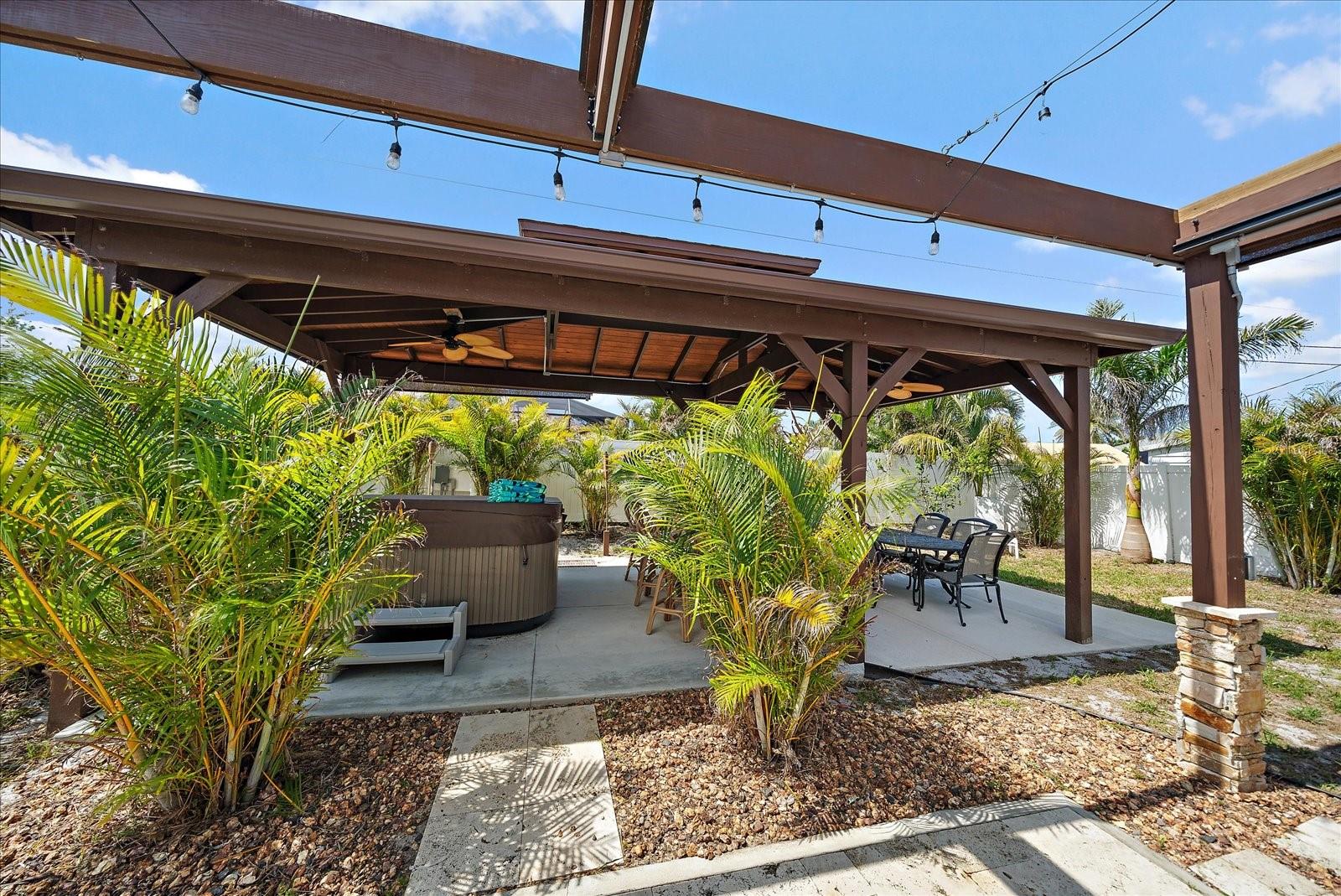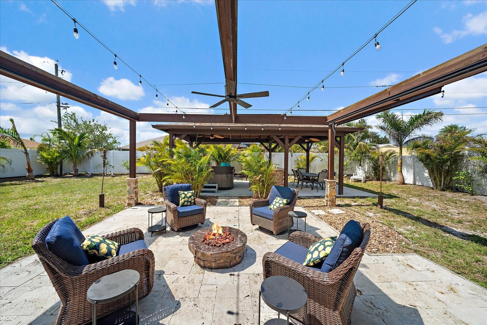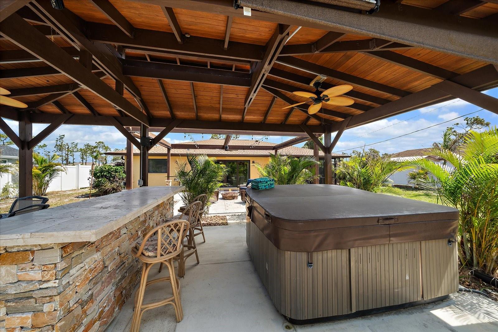 This turnkey furnished home features a hot tub surrounded by a private backyard oasis, complete with an outdoor bar and fire pit. With an abundance of palm trees and privacy fencing, this space is the perfect place to relax and unwind. As you step through the front door, you will be greeted by an open floor plan that enhances the flow of the living space. This 3-bedroom, 2-bathroom home boasts a split floor plan, an indoor laundry room, ample storage, and a screened-in lanai just off the kitchen. From the kitchen sink, you'll enjoy a lovely view of your backyard oasis. Conveniently located, this property is close to beaches, shopping, and all the vibrant aspects of the Florida lifestyle waiting for you.