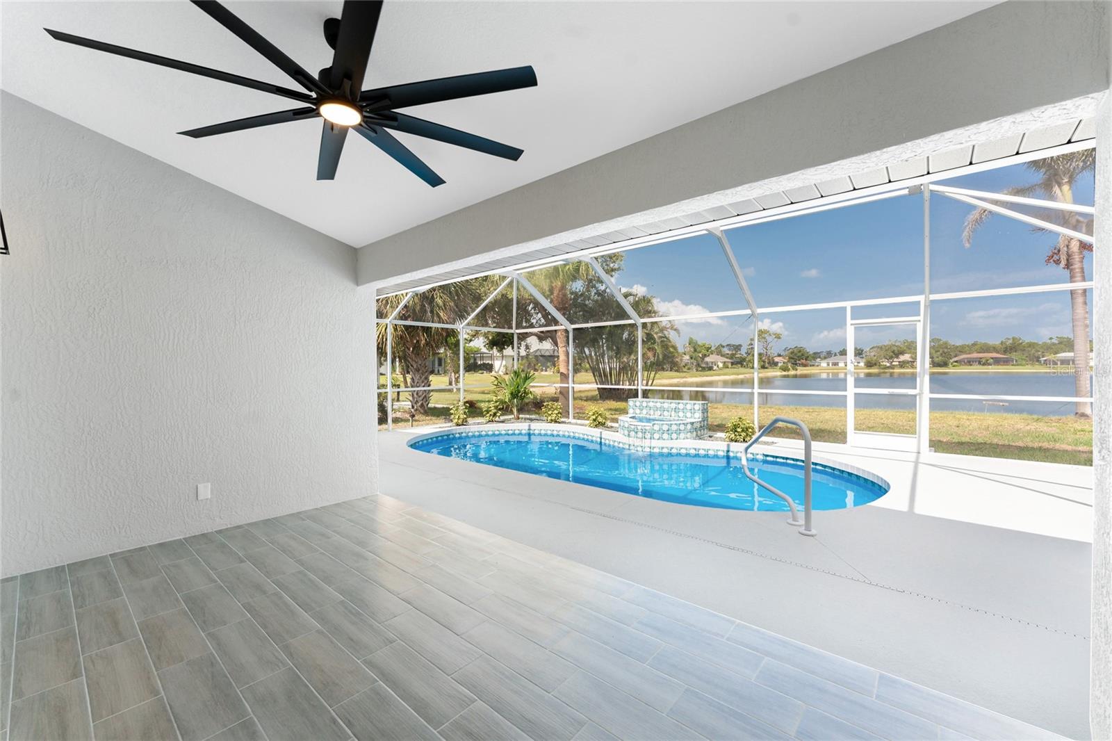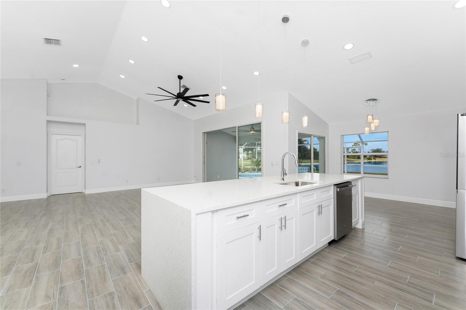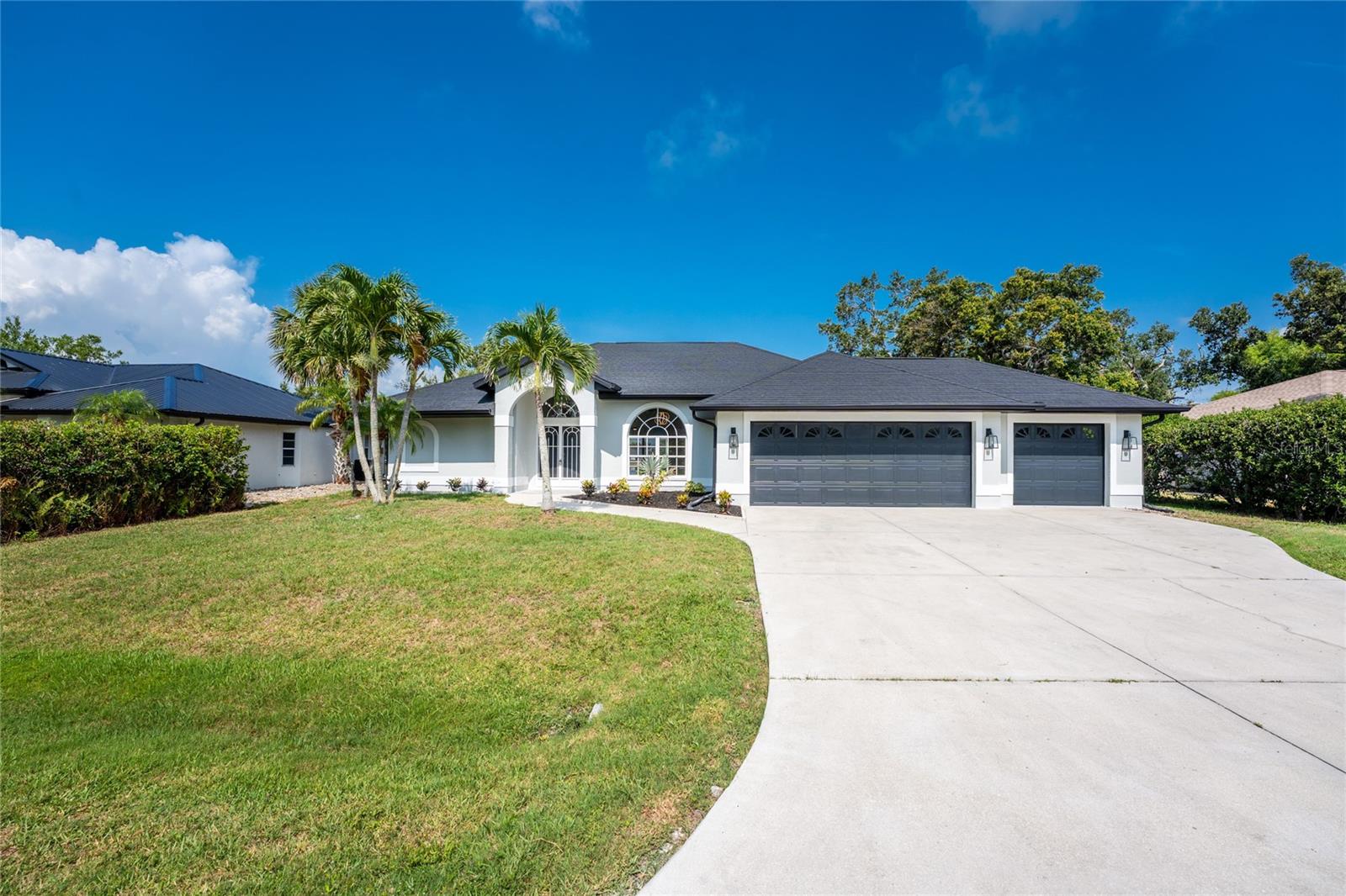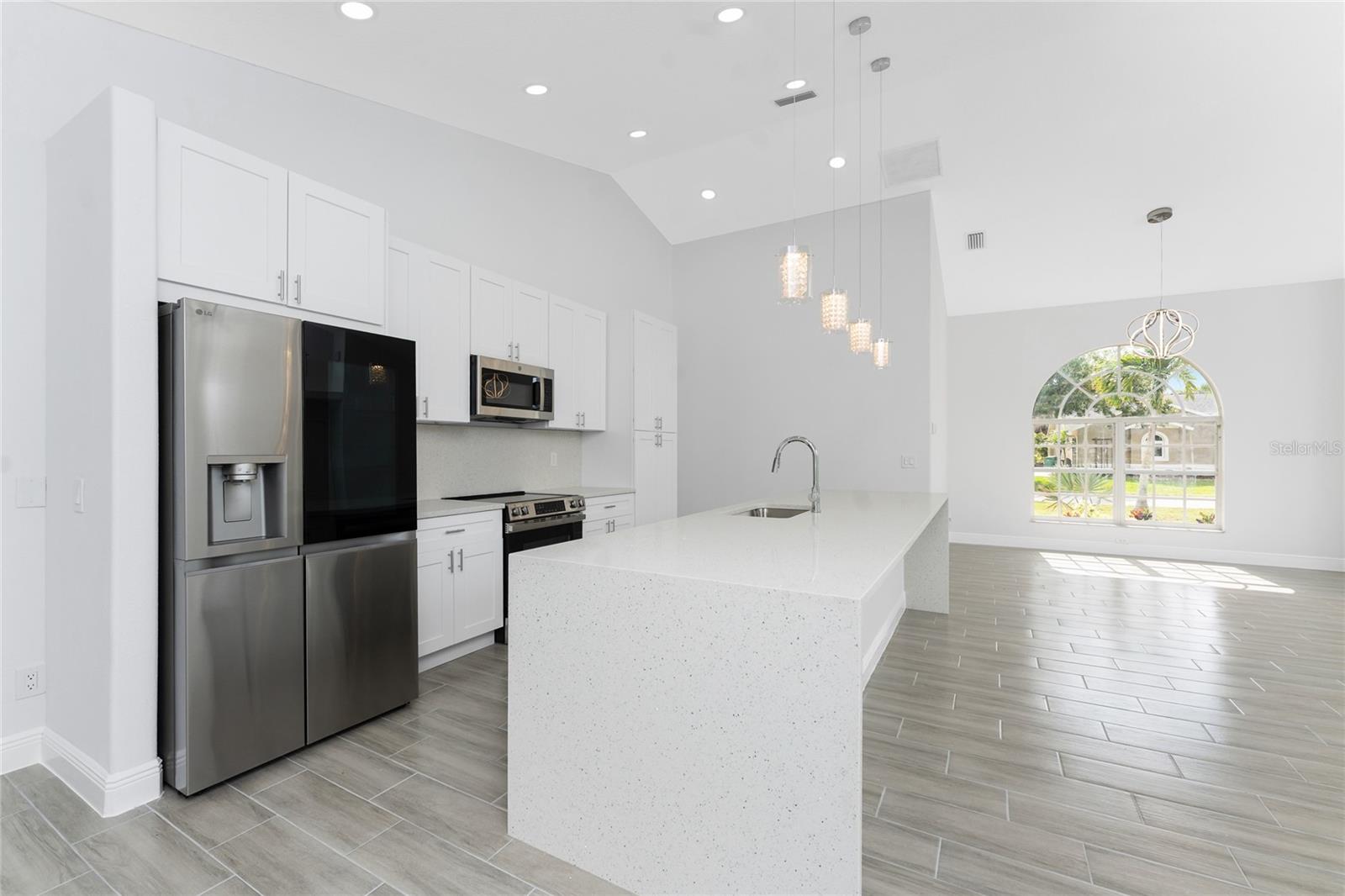 Completely Remodeled Lakefront Pool Home with 3-Car Garage! Welcome to your dream home! This stunning 3-bedroom, 2-bath residence has been beautifully renovated from top to bottom and sits on a picturesque lakefront lot with breathtaking sunset views. Built in 1999 and offering nearly 2,000 sq ft of living space, this home combines modern upgrades with timeless Florida charm. Step inside to find a brand-new kitchen featuring wood cabinetry, elegant quartz countertops with a dramatic waterfall island, and stainless steel appliances—perfect for entertaining. Both bathrooms have been fully renovated with stylish finishes. The home boasts fresh interior and exterior paint, and gorgeous wood-look ceramic plank tile flows throughout. Enjoy the Florida lifestyle with a sparkling pool and spacious lanai overlooking the tranquil lake—no rear neighbors, just nature and peace. Additional features include city water and sewer, a 3-car garage, and no flood insurance required. All this just minutes from Gulf beaches, shopping, dining, and more. Don't miss this exceptional move-in-ready home!