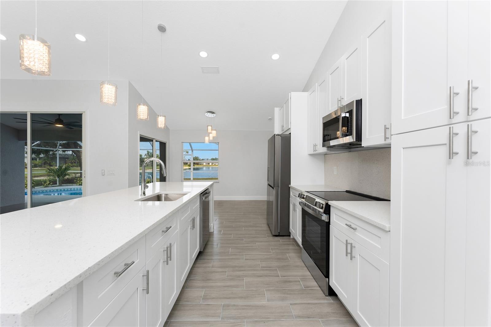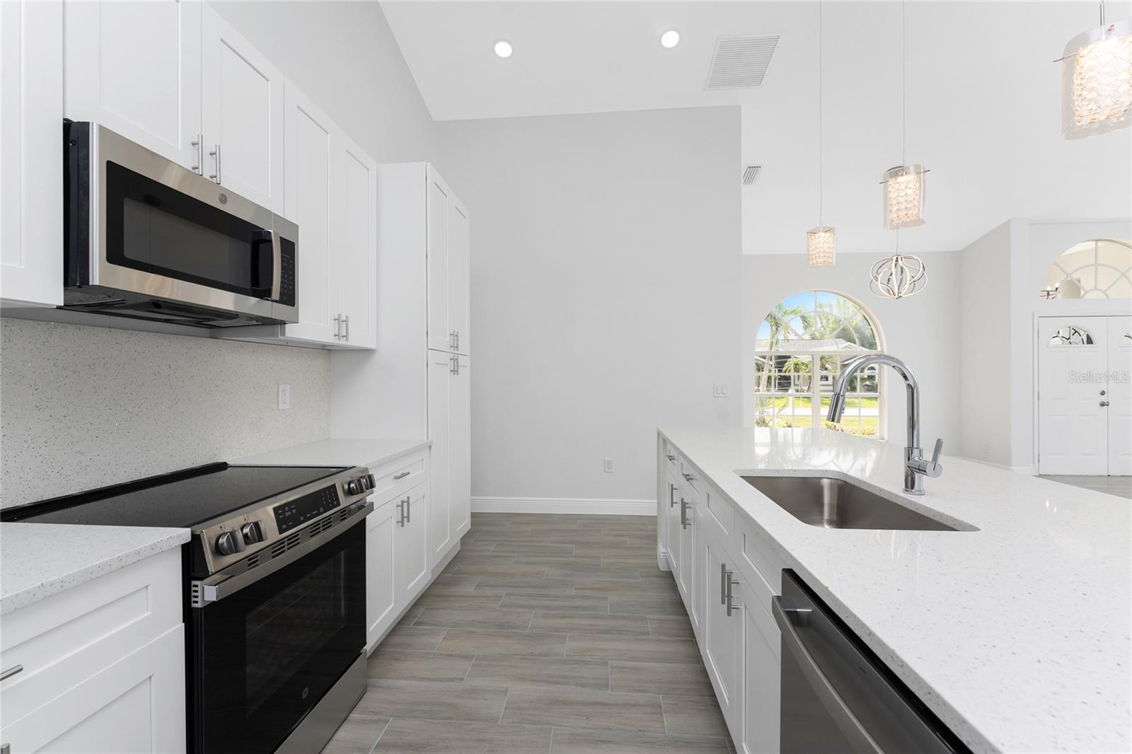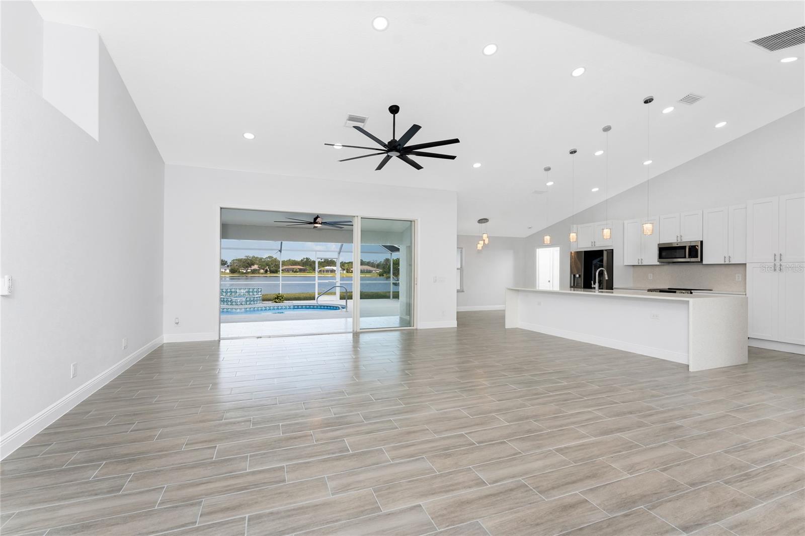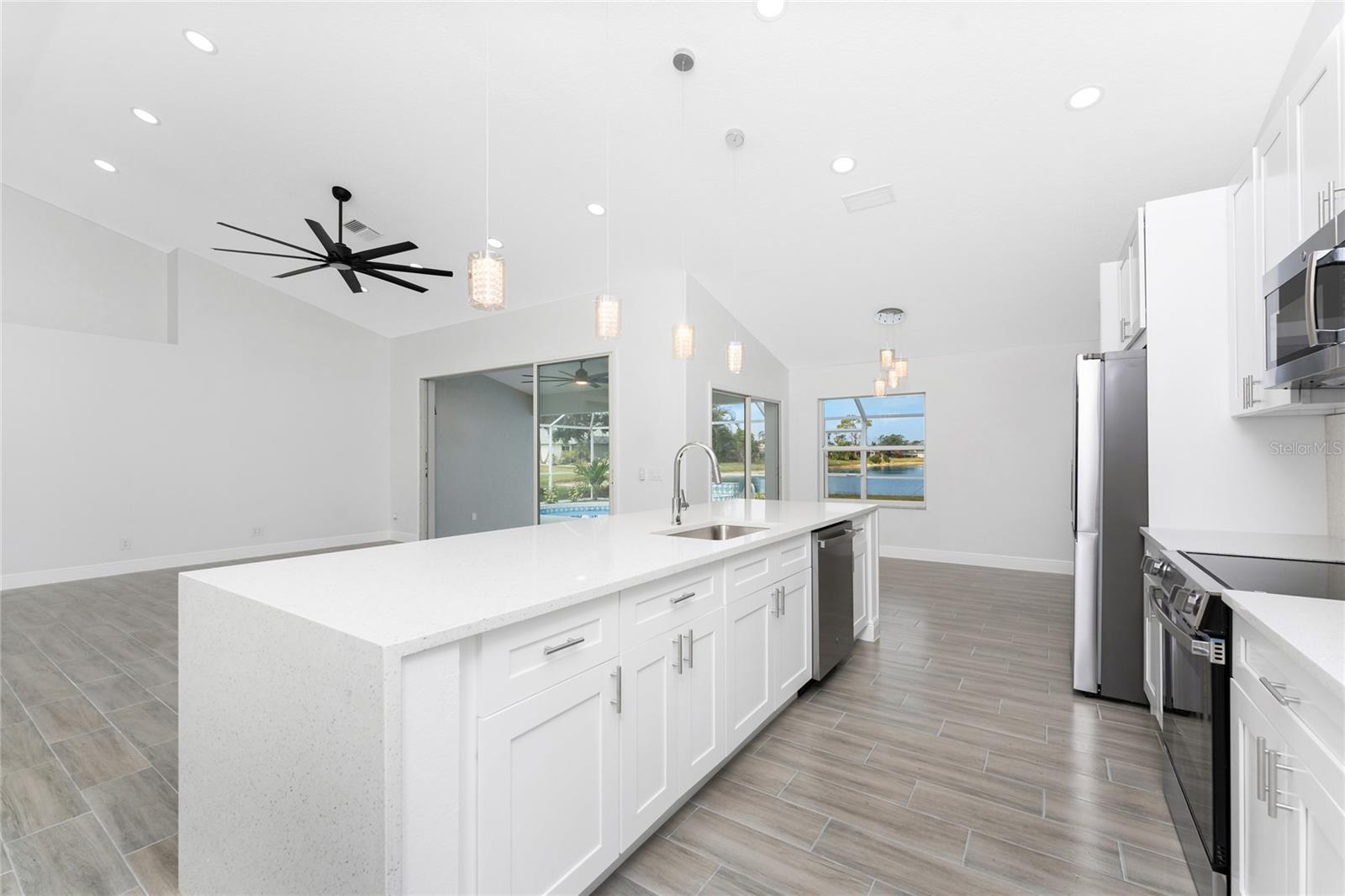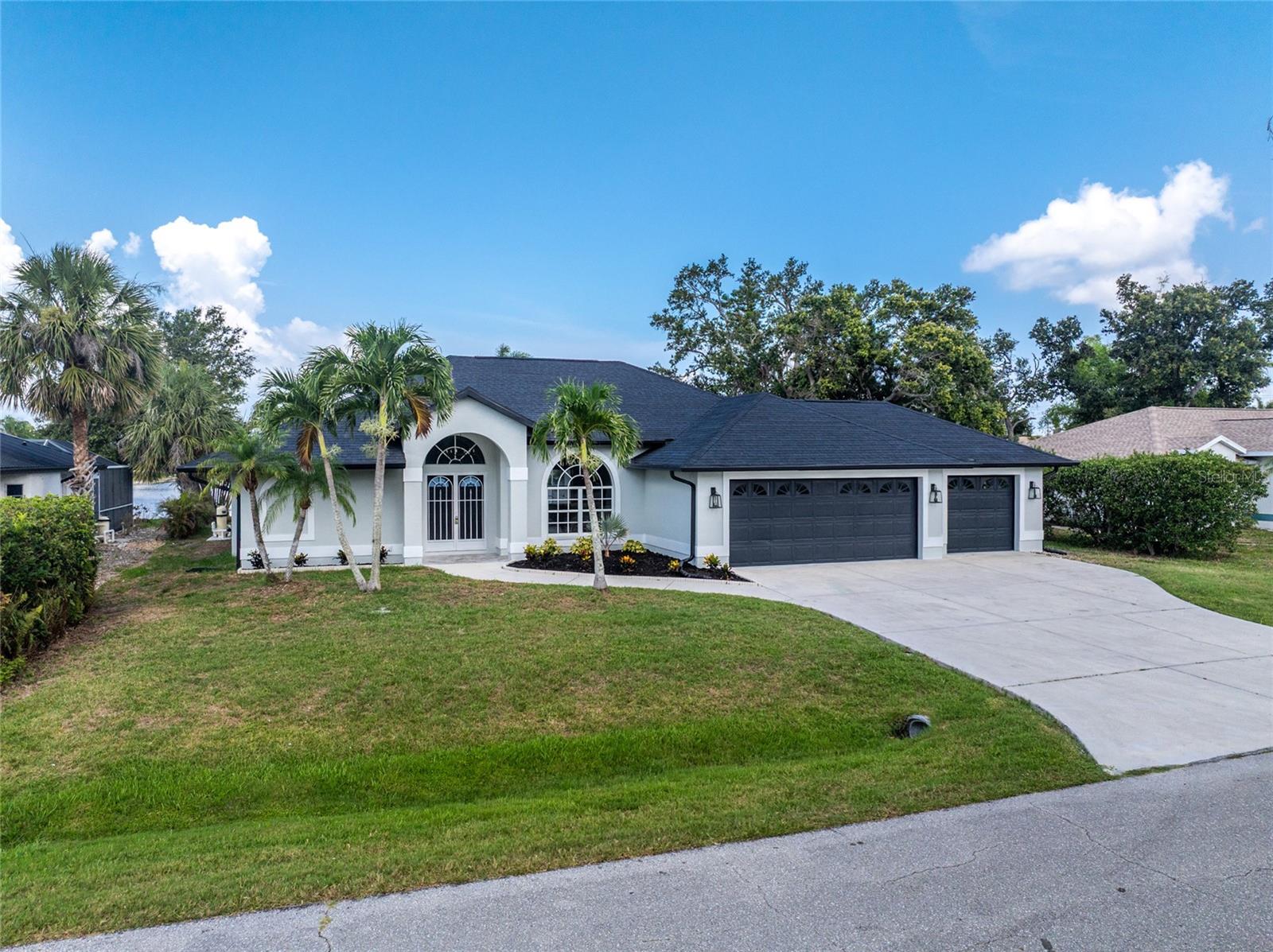 Completely Remodeled Lakefront Pool Home with 3-Car Garage! Welcome to your dream home! This stunning 3-bedroom, 2-bath residence has been beautifully renovated from top to bottom and sits on a picturesque lakefront lot with breathtaking sunset views. Built in 1999 and offering nearly 2,000 sq ft of living space, this home combines modern upgrades with timeless Florida charm. Step inside to find a brand-new kitchen featuring wood cabinetry, elegant quartz countertops with a dramatic waterfall island, and stainless steel appliances—perfect for entertaining. Both bathrooms have been fully renovated with stylish finishes. The home boasts fresh interior and exterior paint, and gorgeous wood-look ceramic plank tile flows throughout. Enjoy the Florida lifestyle with a sparkling pool and spacious lanai overlooking the tranquil lake—no rear neighbors, just nature and peace. Additional features include city water and sewer, a 3-car garage, and no flood insurance required. All this just minutes from Gulf beaches, shopping, dining, and more. Don't miss this exceptional move-in-ready home!