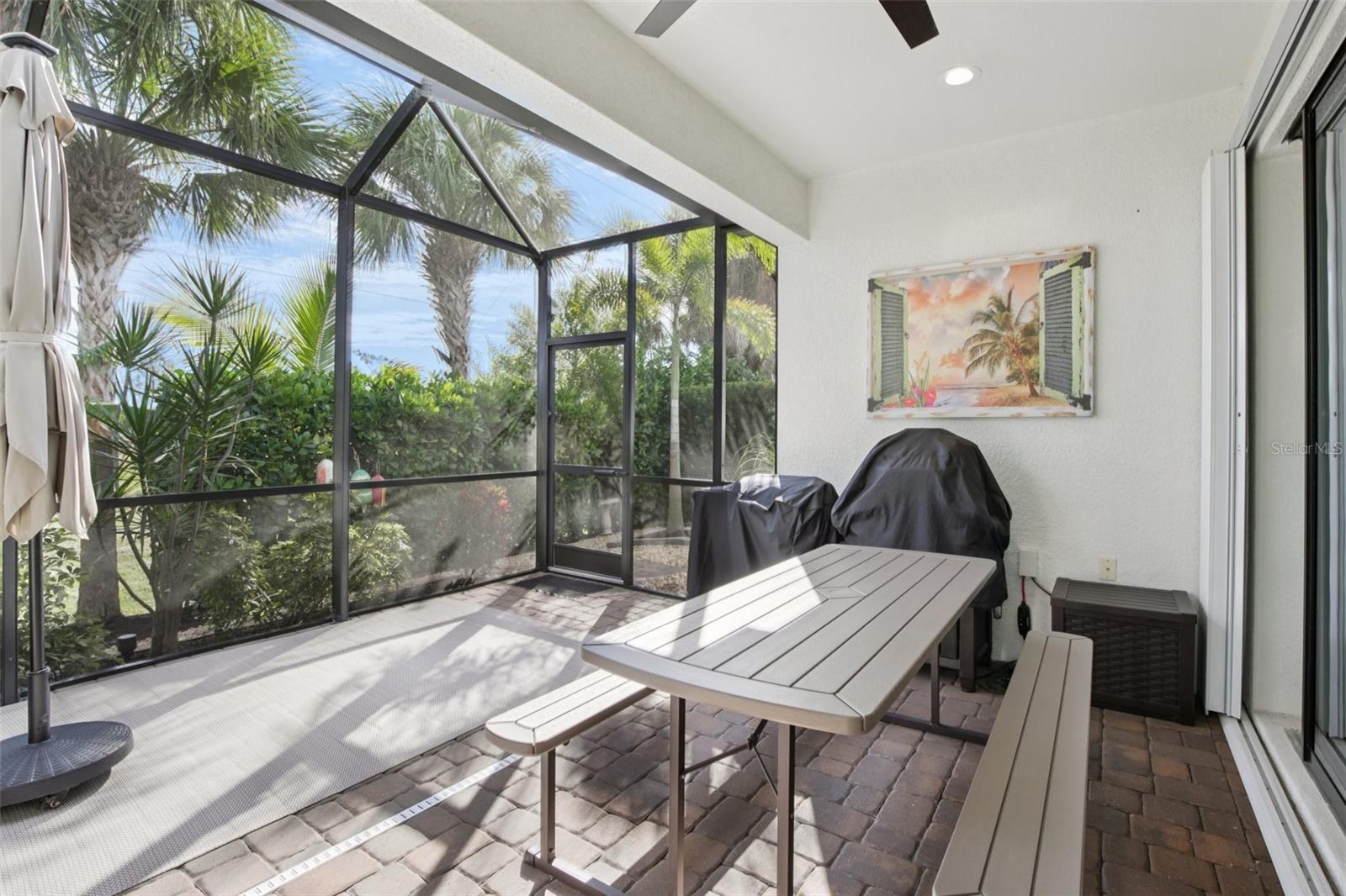 Just minutes from the pristine shores of Englewood, Manasota and Venice Beaches, this exceptional residence is located within the gated and highly sought-after Boca Royale Golf and Country Club. Nestled in the maintenance-free Belize neighborhood, the home offers an open, airy floor plan designed for both relaxed everyday living and effortless entertaining. The gourmet kitchen serves as the heart of the home, showcasing quartz countertops, counter-height seating for four, white glass appliances with a gas oven, and a spacious pantry. Overlooking the dining area and great room, the space is highlighted by an elegant octagonal coffered ceiling and oversized ceiling fan. Expansive pocketing glass doors open seamlessly to the lanai, creating a true indoor-outdoor living experience. Glass French doors lead to a generous den or home office, providing flexible living options. Plantation shutters and crown molding accent the entryway, kitchen, dining, and great room, while coastal shiplap details in the entry, kitchen, great room, and primary suite enhance the home’s relaxed seaside aesthetic. The primary suite is a private retreat featuring an upgraded oversized walk-in closet, dual vanities, a large Roman-style walk-in shower, and a private water closet with linen storage. Two additional bedrooms are thoughtfully positioned on the opposite side of the home and share a full bath. Neutral ceramic tile flooring flows throughout, reinforcing the fresh coastal and contemporary design. Outdoor living is elevated on the spacious east-facing lanai, complete with a ceiling fan and gas hookup, offering afternoon shade and tranquil views of open green space and breathtaking Florida sunrises. The desirable end-lot location is enhanced by mature trees, providing added privacy. An oversized two-car garage offers ample parking with 4 newly installed overhead storage racks. Additional features include accordion hurricane shutters and hookup for a whole-home portable generator. Residents of the Belize neighborhood enjoy a private community pool with an outdoor grill and dining area, while Boca Royale amenities include a resort-style pool and tiki bar, championship golf, tennis, pickleball, fitness facilities, and fine dining. Furniture is negotiable, with the option to include the dual-fuel whole-home portable generator, making this coastal villa truly move-in ready.