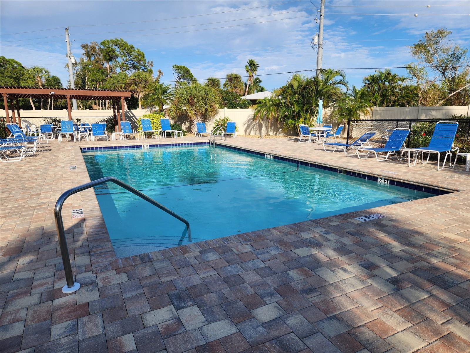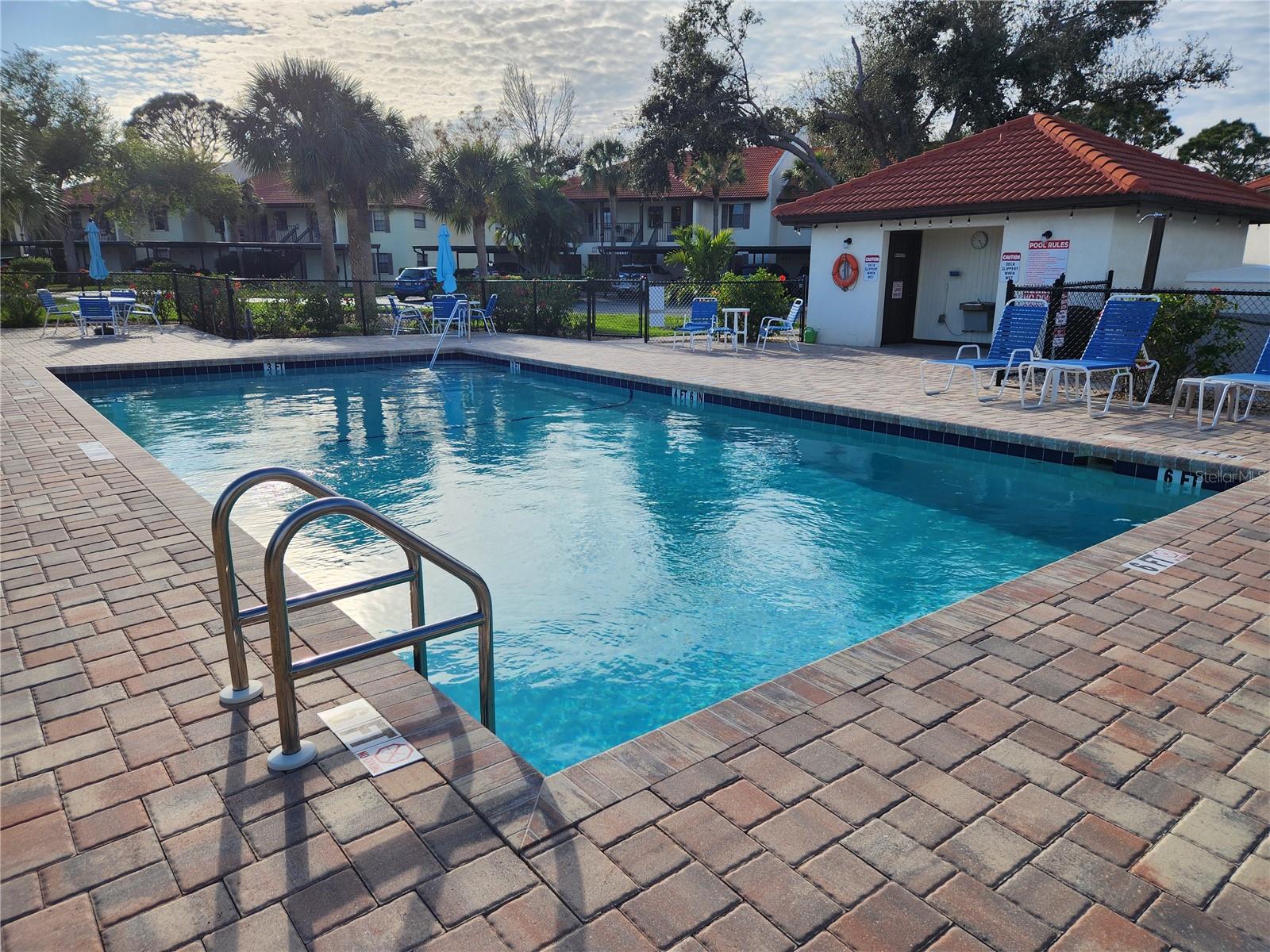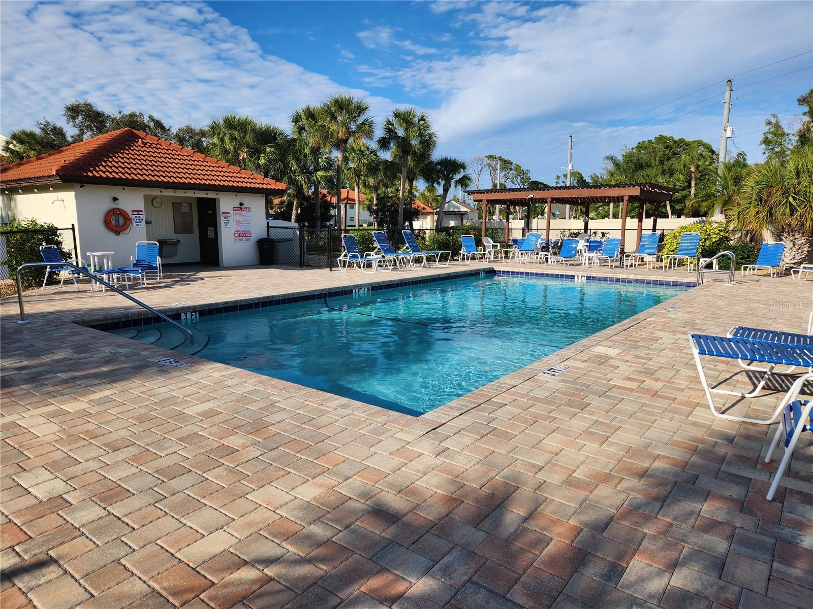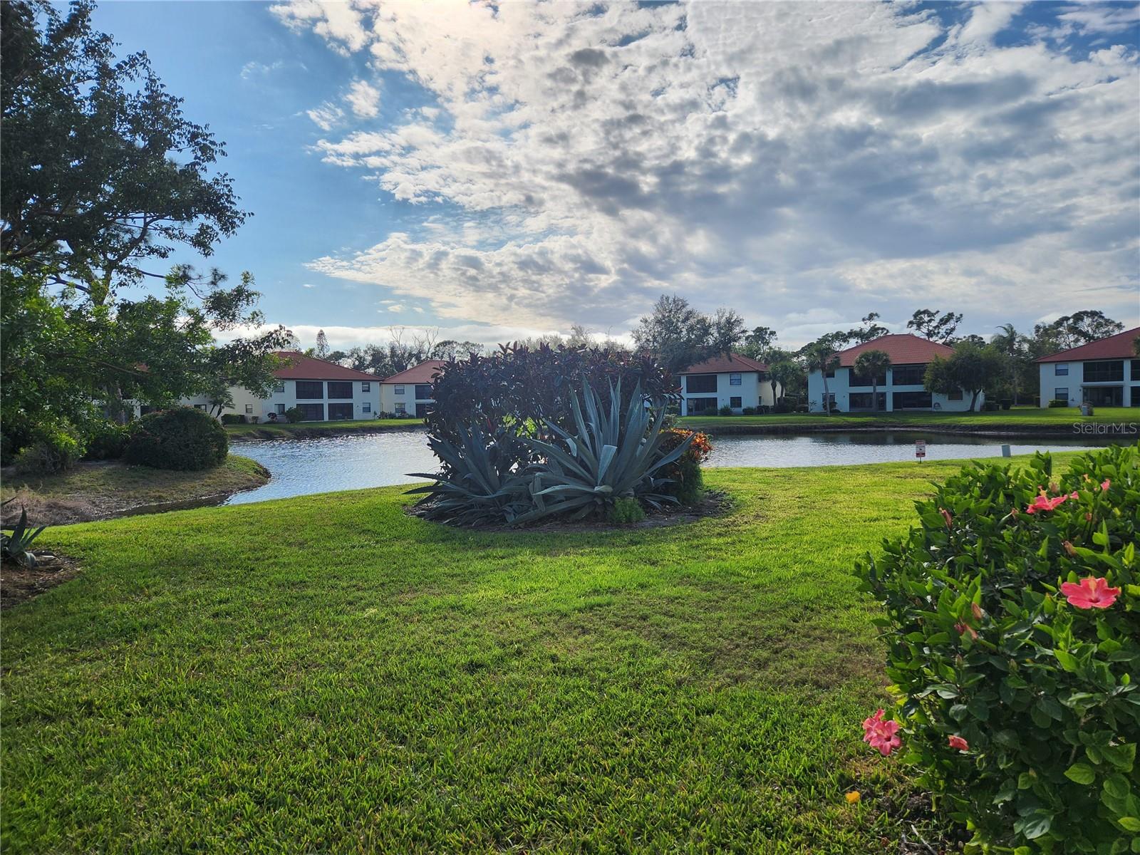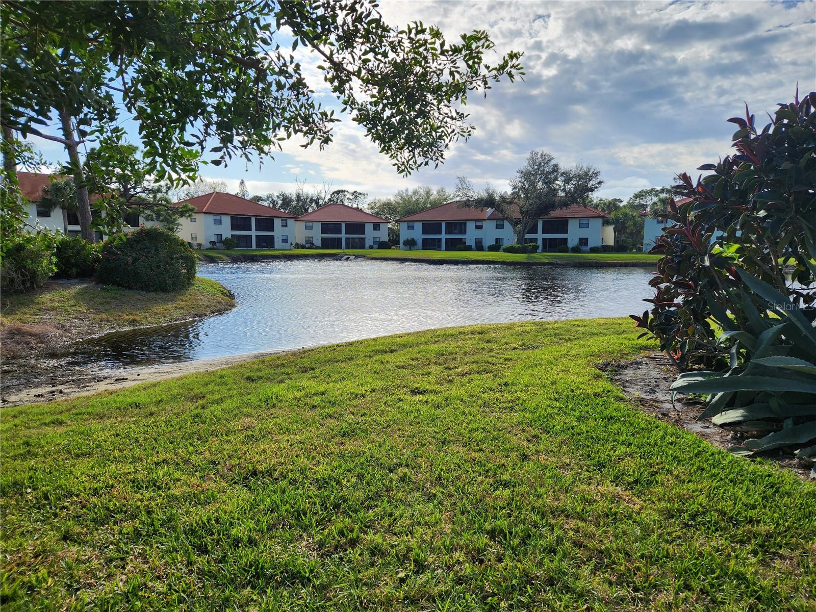 Ground Floor Unit – No Stairs or Elevator! Best location in the entire complex. Ground floor so you can walk directly out of your screened lanai to enjoy the beautiful landscaping & pond. Just 2 blocks to Dearborn St where you can walk to Publix, Walgreens and all the shops, restaurants & live music Old Dearborn St has to offer. Private secure storage shed, covered parking and only a 2–3-minute walk to the heated pool. The Master Bedroom features a walk-in closet and dual vanities. The screened-in lanai has remote control electric roll-down sun shade/shutters; no damage from Ian! Solid wood cabinets in the kitchen, real wood flooring in the main living area and tile in the kitchen, bedrooms, bathrooms and lanai. This unit is well cared for and move-in ready. Roof was replaced in 2019. Newer appliances (A/C new in, 2017, refrigerator in 2023, range 2016, dishwasher 2014 and water heater in 2015). Private in-unit laundry closet. Very solid financials and reserves. Great location, just a few miles to the Intercoastal Waterway, Lemon Bay and the beaches. Low monthly maintenance fee includes water/sewer, all pool & exterior maintenance and professional management.