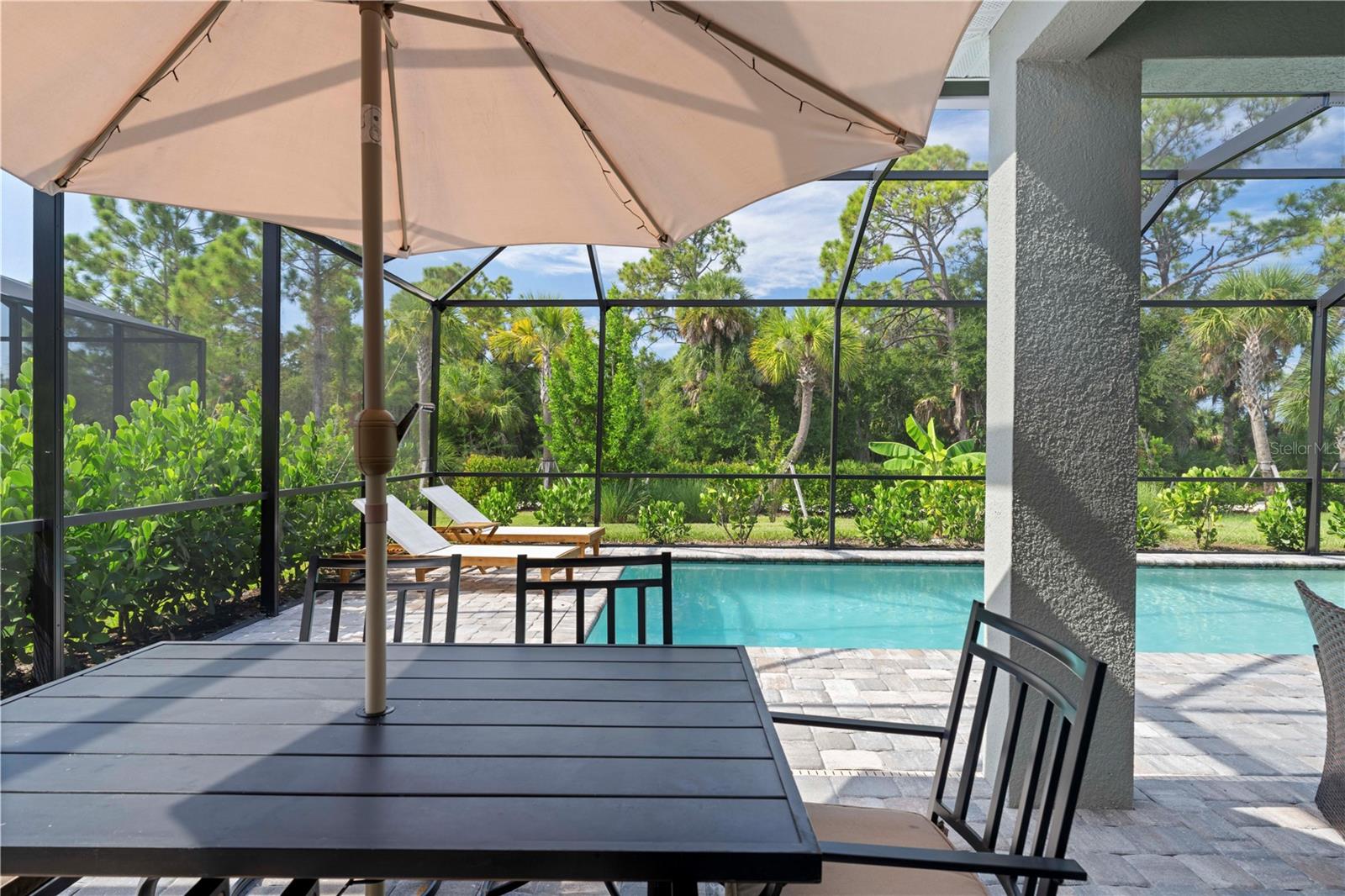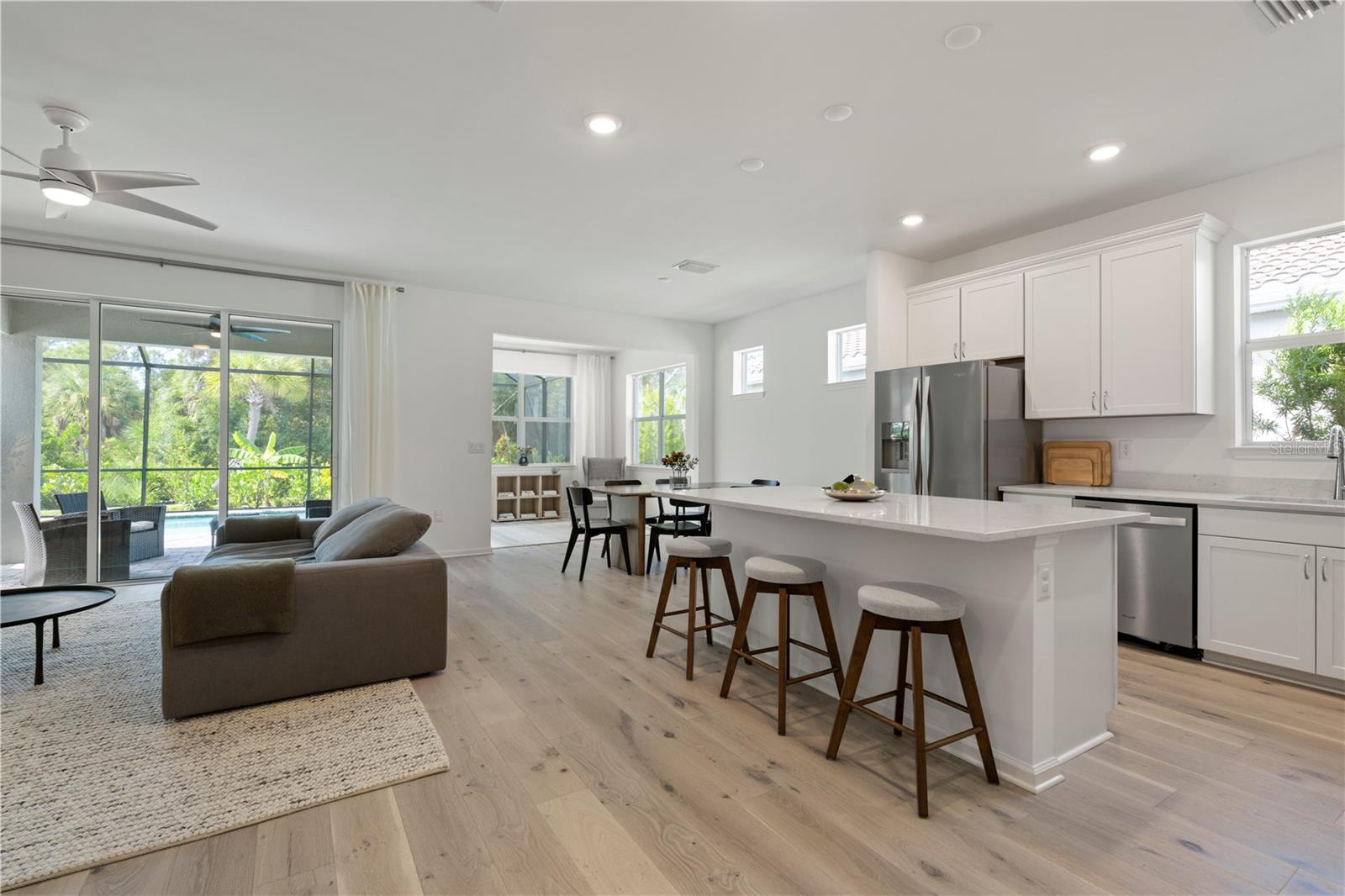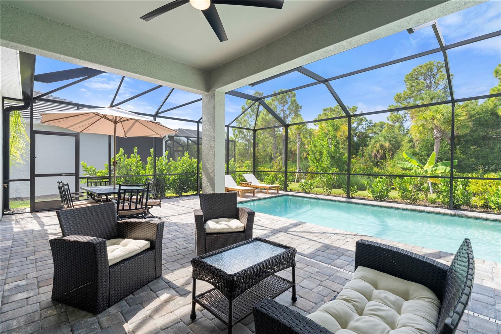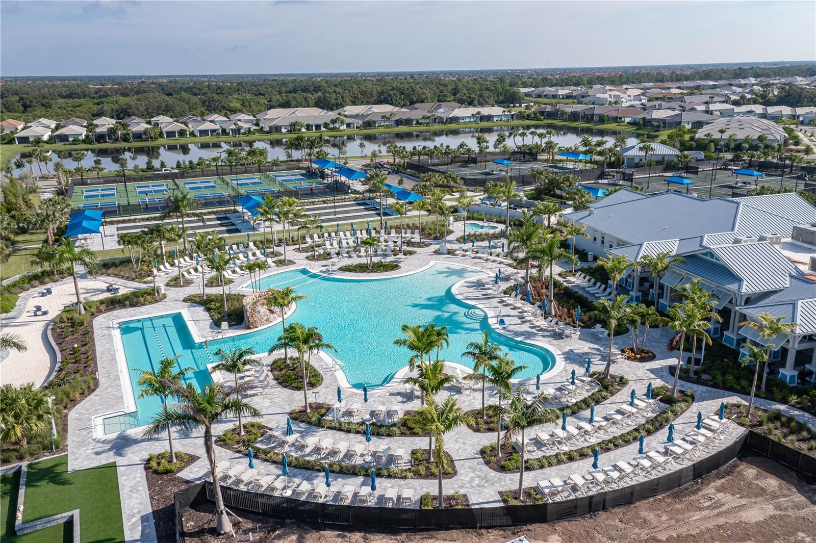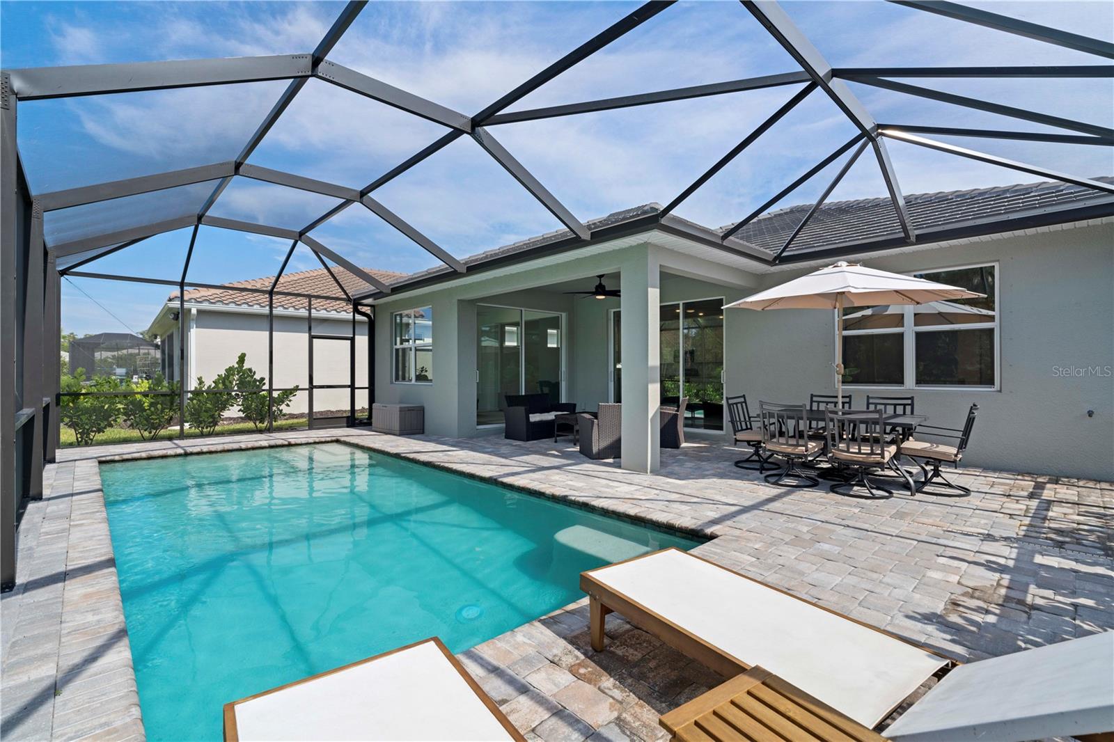 BEACHWALK POOL HOME W/MODIFIED PROSPERITY FLOOR PLAN & RESORT-LIKE AMENITIES - Why wait to build when you can buy a better than new, move-in ready home? This wonderful 3 bed/2 bath home w/2-car garage and private, saltwater pool is available for immediate occupancy. Home is just over a year old & boasts OVER $200K OF UPGRADES from base model including the addition of the upgraded owners' bath, 3rd bedroom, sunroom and optional patio extension. Inside, the home offers a spacious, open floor plan w/a modern, coastal aesthetic that includes warm wood floors, bright white walls & tons of natural light. The kitchen has gleaming quartz counters, contemporary Shaker cabinetry, a large center island w/breakfast bar seating, stainless steel appliances, a 5-burner gas range & large walk-in pantry. Pre-wiring exists for pendant lighting above the breakfast bar. The dining area is nestled in between the kitchen, sunroom & great room for easy entertaining. Architectural details include LED recessed lighting, high ceilings, 8ft doorways, openings & sliding glass doors plus oversized windows. Both the sunroom and great room open to the lanai extending the living space outdoors. Enjoy true Florida-style indoor/outdoor living here. The master suite has an en-suite bathroom w/dual sinks, soaking tub, glass-enclosed shower, private WC & an oversized walk-in closet. The two guest rooms share a lovely guest bath w/combination tub & shower. The laundry room has full-sized washer & dryer. Outside, a brick paver deck surrounds the in-ground, saltwater pool. Relax in the shade of the lanai or soak up some Florida sun poolside. Other features include an attached two-car garage w/4ft storage bump out, brick paver driveway & whole-house hurricane protection. Well-maintained tropical landscaping including banana & pomegranate trees surround the home. A small herb garden is located along the side of the home. Home is nestled up against a copse of trees creating tons of privacy. The sidewalk behind the home connects you directly to the community garden and dog park. Beachwalk by Manasota Key (a DiVosta community) offers resort-style living in a luxury, gated community that features world-class amenities including a large pool w/lap lanes, fitness center (w/adjacent aerobic room for classes), cafe, cardrooms, 5 Har-Tru tennis courts, 10 pickleball courts, 6 bocce courts, firepit, kayak launch & more! A poolside cafe features a full food & bar menu w/poolside service. Fine & casual dining options will be available in the soon-to-be-built 2nd clubhouse. Miles of sidewalks allow you to enjoy an early morning or late afternoon neighborhood stroll around the professionally-landscaped streets. All amenities are INCLUDED in your low HOA fees. Beachwalk is less than 10 minutes from Manasota Key Beach.