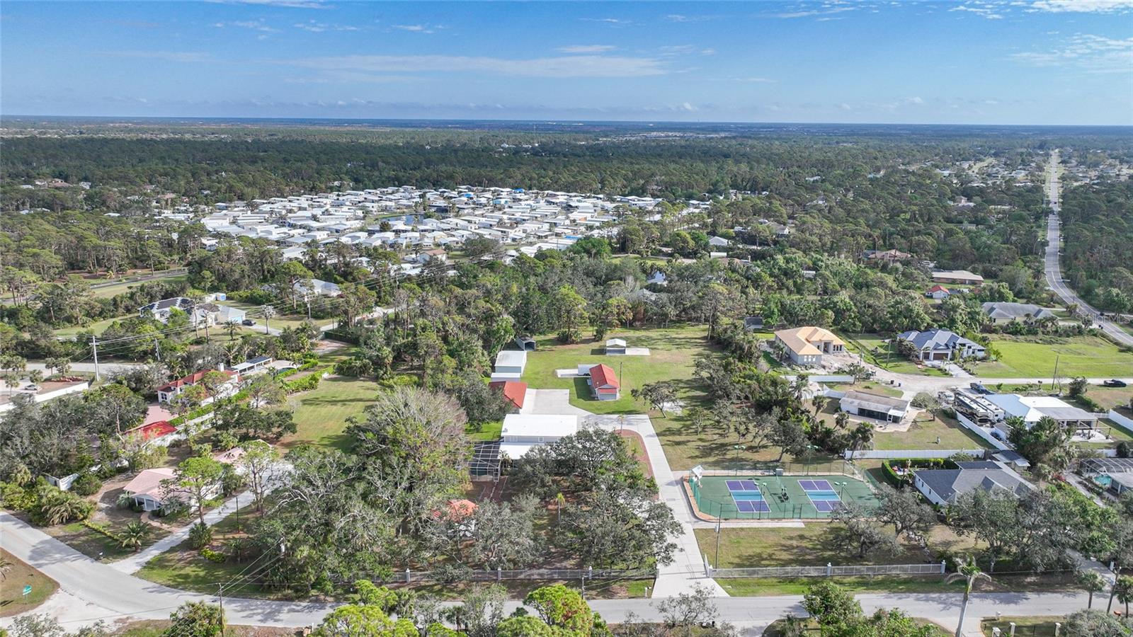 Discover your own slice of paradise with this unique 3.3-acre park-like estate, one mile from beautiful Manasota Beach and a public boat ramp. Boasting over 4,500 square feet of living space, this home embraces natural surroundings, providing a welcoming retreat and serene lifestyle. A charming white gate, adorned with globe lighting, welcomes you to the property. Upon entry, a tile-roof gazebo in the front yard evokes a sense of nostalgia beneath mature oaks, while a lighted and fenced double pickleball court (converted tennis court) offers the perfect outlet for sports enthusiasts. The wide driveway stretches to the back of the home, with a circular section providing easy, sheltered access to the entryway beneath the lattice carport. A screened-in L-shaped wraparound porch offers an ideal spot to relax and enjoy the Florida breeze. Accessible from both the front porch and the yard, the pool and hot tub are surrounded by a spacious pavered deck and screened pool cage. A built-in pet door leads to the exterior fenced dog run, giving pets the freedom to go outside on their own. The kitchen features a large island, solid surface countertops, wood cabinetry, breakfast bar, stainless appliances, stylish chimney hood, walk-in pantry, built-in desk, and decorative lighting. There is also room for a dining table, making it perfect for family gatherings. An archway opens to an additional dinette area, creating a seamless flow for entertaining. With floor-to-ceiling windows in both the dining and living rooms, abundant natural light fills the space. The living room's wood-burning fireplace adds a cozy touch on cooler Florida nights. The home features 4 bedrooms, a separate office/den that can serve as a 5th bedroom, and 4 1/2 baths, with the possibility of 3 master suites for unmatched comfort and privacy. Upstairs, the primary suite spans a generous 1,000 square feet with French doors leading to an expansive outdoor deck, and a spa-inspired bathroom featuring a jetted tub, rainfall shower, dual sinks, separate vanity. Two additional bedrooms are also located on the second floor, sharing a hallway bath with a large closet, walk-in shower, and double sinks. The remaining two rooms are downstairs, each with its own en-suite bathroom. The downstairs laundry room, designed for convenience, features custom built-in cabinets, shelves, and a storage closet. A laundry chute runs from beneath the upstairs bathroom sink cabinet to a laundry room cabinet, where clothes are gathered until wash day. A half bath is located in the hallway just outside the laundry room. The lower level family room will be one of the most frequently used spaces in the home, and features an exterior door leading to the double carport. Outdoors, you will find a total of 9 garage bays and 3 carports offering abundant parking for everything. The closest building is currently used as a game room and also includes a solid concrete safe room and full bath (making the property total 5 1/2 baths). The second building has a 2-car garage, 2 storage rooms, and a room ideal for a home gym with a mirror wall. There are 6 RV plugs on the property (four 30-amp and two 50-amp). There’s also a 3-bay garage with electric roll-up doors and 3 more open metal buildings. Some noteworthy features include public water and sewer, along with a well and pump system for exterior needs. The modified low-slope roof was replaced in 2020. This estate is a true sanctuary. Virtual tour and video are available.