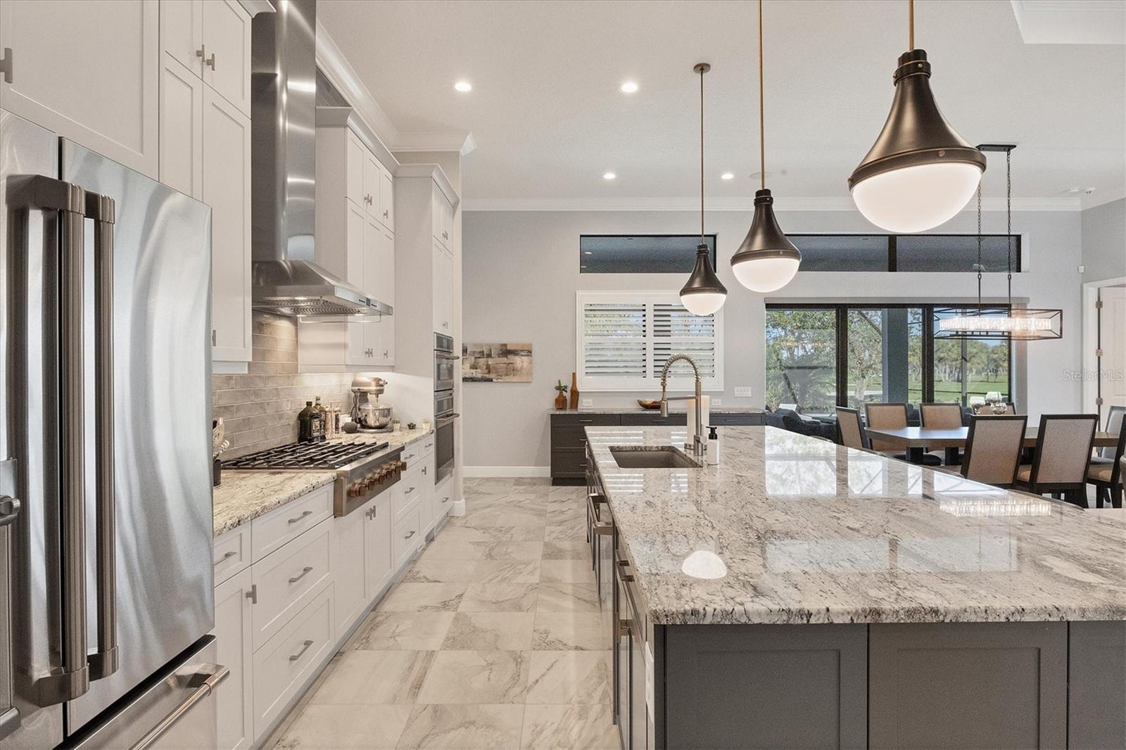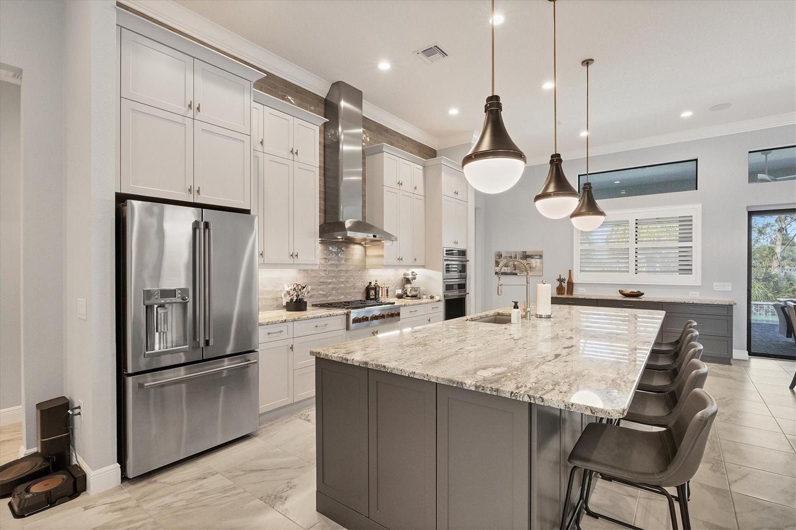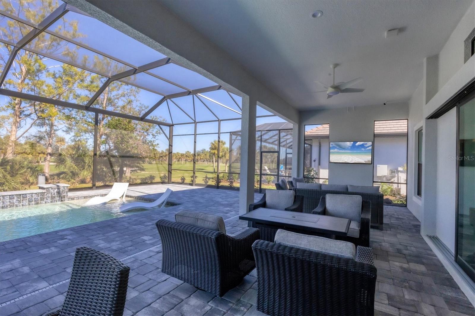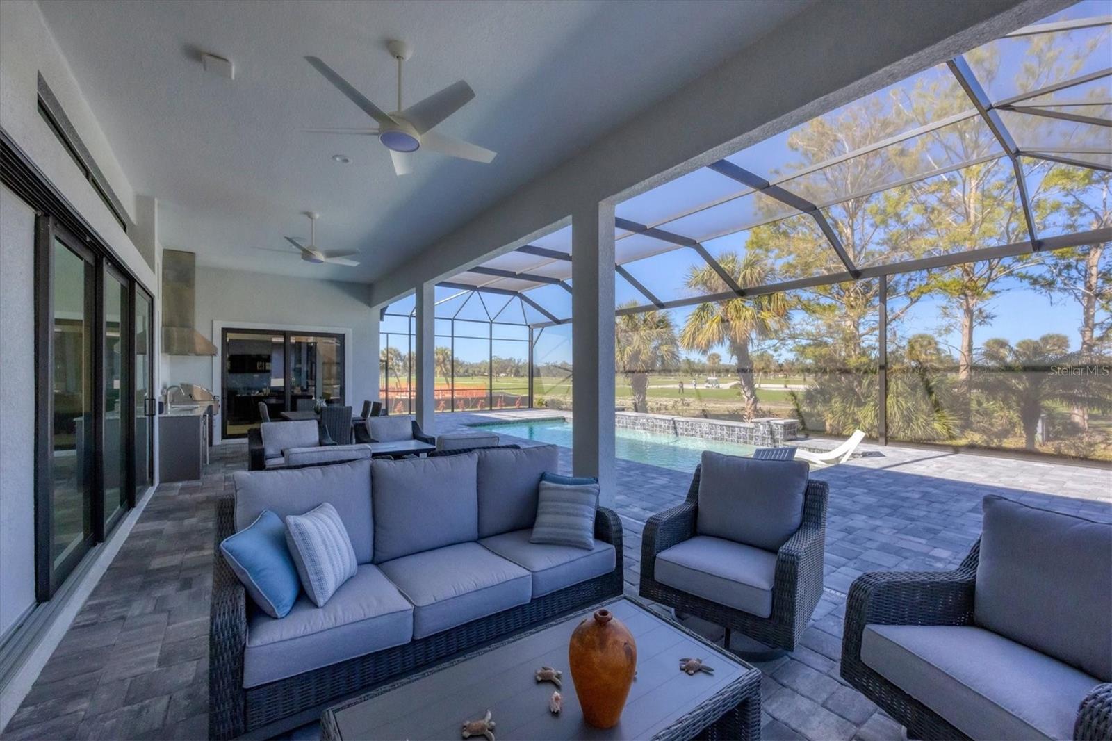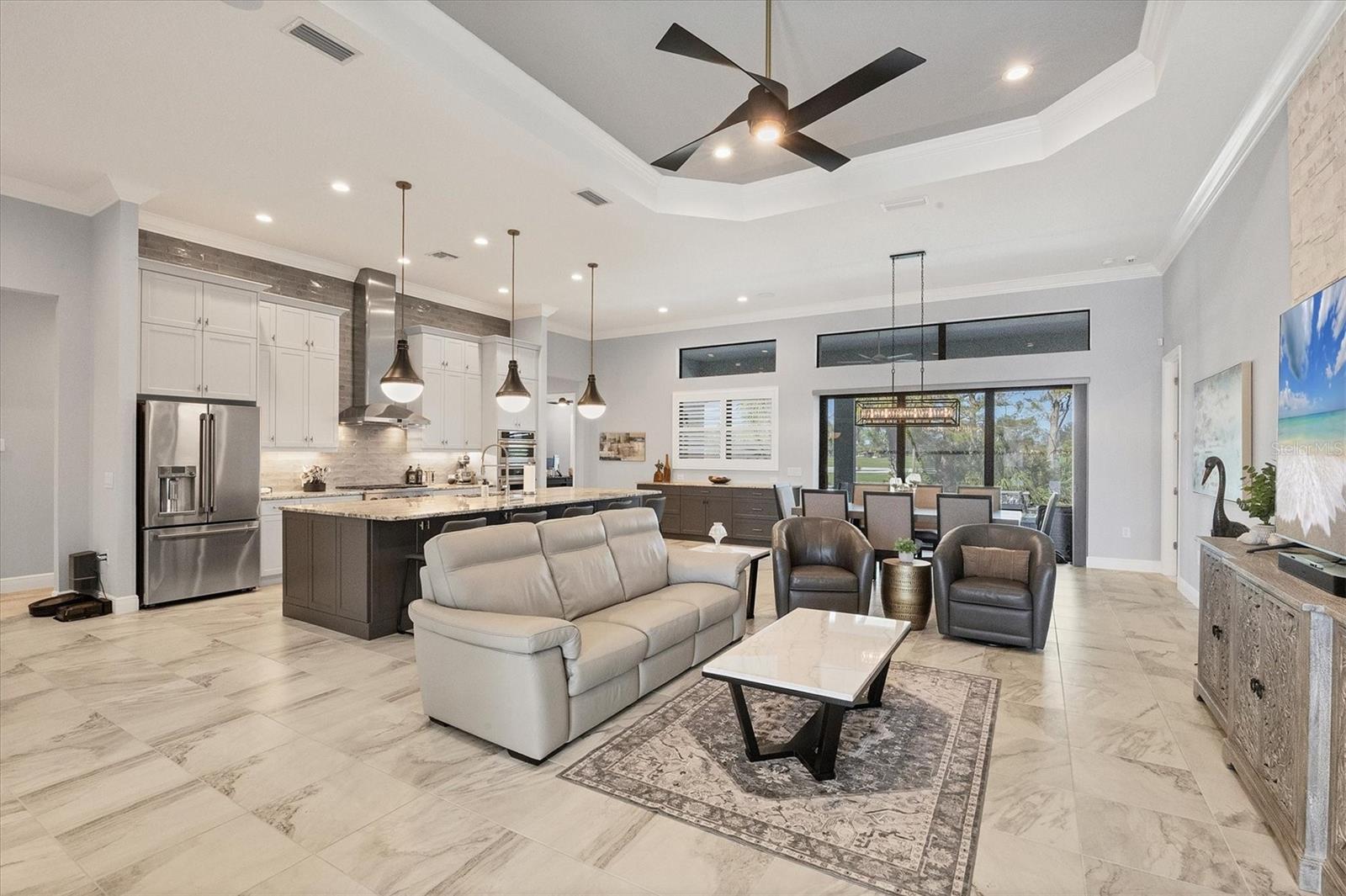 Welcome to this luxurious semi-custom built Pebble Beach model, nestled in the exclusive St. Lucia neighborhood within Boca Royale Golf & Country Club. Crafted by Neal Signature Homes, this stunning residence offers over 3,000 square feet of living space, featuring 3 bedrooms, 3 bathrooms, a spacious OFFICE/DEN, and a BONUS ROOM. Built in 2024 and only lived in for a few months, this home is better than new, featuring over $100,000 in additional upgrades. Every detail has been thoughtfully designed and enhanced by the owners. Upon entering, you are greeted by a grand, open great room with a tray ceiling, crown molding, and a striking stone accent wall. Pocket sliders seamlessly open to the oversized lanai, where you'll find a built-in SUMMER KITCHEN and a HEATED, SALT WATER POOL which can be chilled for year-round enjoyment. The pool area is a true oasis, offering a Baja tanning shelf and four tranquil waterfalls, all framed by a clear-view screened pool cage that offers VIEWS OF THE LUSH GOLF COURSE. The gourmet kitchen features an upgraded, WiFi, GE Café appliance package including a natural gas cooktop with a designer vented hood, a wall oven, and 42-inch upper cabinets. Stunning granite countertops provide both beauty and functionality, while an enormous 9x7 BUTLER’S PANTRY offers abundant storage and prep space. The primary suite is a true retreat, with two large walk-in closets and an en-suite bathroom that includes a walk-in shower, his and her sinks, and a luxurious garden tub for the ultimate relaxation. A private guest suite offers a spacious bedroom, walk-in closet, and a full private bath, ensuring comfort and privacy for your guests. Tucked at the back of the home, the bonus room provides an ideal space to unwind or entertain, with views of the pool area and golf course. This flexible room can easily be transformed to suit your needs, whether as a media room, game room, or cozy gathering space. Additional features include HURRICANE IMPACT WINDOWS AND DOOR THROUGHOUT, a spacious 3-car garage, and a dedicated laundry room with a utility sink and cabinetry for added convenience. The home is also fully equipped with SMART HOME TECHNOLOGY for ease of control and energy efficiency. Other upgrades include a TANK-LESS HOT WATER HEATER, CENTRAL VACUUM system with kitchen kickplate, PLANTATION SHUTTERS throughout and built-in SURROUND SOUND SPEAKERS. Boca Royale Golf & Country Club provides resort-style amenities, including a heated community pool, a well-equipped fitness center, and a calendar full of social activities for residents to enjoy. Optional golf and racket memberships (including tennis and pickleball) offer additional ways to personalize your lifestyle. For pet lovers, there’s a dog park with separate areas for large and small dogs. And, with its close proximity to five pristine Gulf beaches, you’ll experience the best of coastal living. Furnishings, décor and turn key items are available to purchase as a separate package.