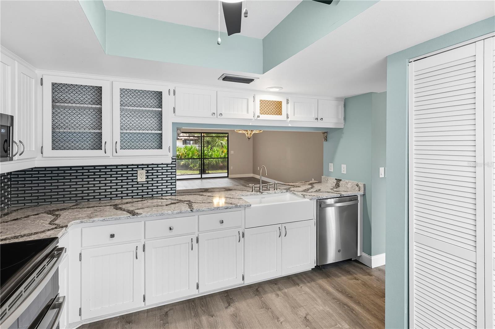 Discover this hidden gem 2-bedroom, 2-bathroom first-floor condo in the desirable 55+ WATERFRONT community with GULF ACCESS & COMMUNITY DOCKS, in Gasparilla Condos in Englewood. CLICK ON THE VIRTUAL TOUR LINK 1 FOR THE VIDEO AND VIRTUAL LINK 2 FOR THE 3D TOUR. This updated condo offers a bright open floor plan with vaulted and tray ceilings and luxury vinyl flooring throughout. The kitchen features stainless steel appliances including a double oven, solid surface countertops, farmhouse sink, tiled backsplash, a breakfast bar, and plenty of cabinets for storage, along with a convenient laundry closet. The master suite provides a peaceful retreat with dual closets, private access to the screened lanai, and an en-suite bath with a walk-in shower and single sink vanity. The guest bedroom offers a built-in closet and nearby bath with a tub/shower combo. Step out to the screened lanai, a serene space surrounded by lush landscaping—perfect for enjoying morning coffee or evening relaxation. Gasparilla Condominiums is a charming 55+ waterfront community situated on Gottfried Creek. Residents enjoy a relaxed coastal lifestyle with access to a clubhouse, community pool, and shuffleboard courts. For those who love the water, kayak storage and community docks are available on a first-come, first-served basis for an additional fee. Perfectly located just minutes from local dining, live entertainment, shopping, golf, and the pristine Gulf beaches, Gasparilla Condos offers the best of Florida living in a welcoming and active community. Schedule your showing TODAY!