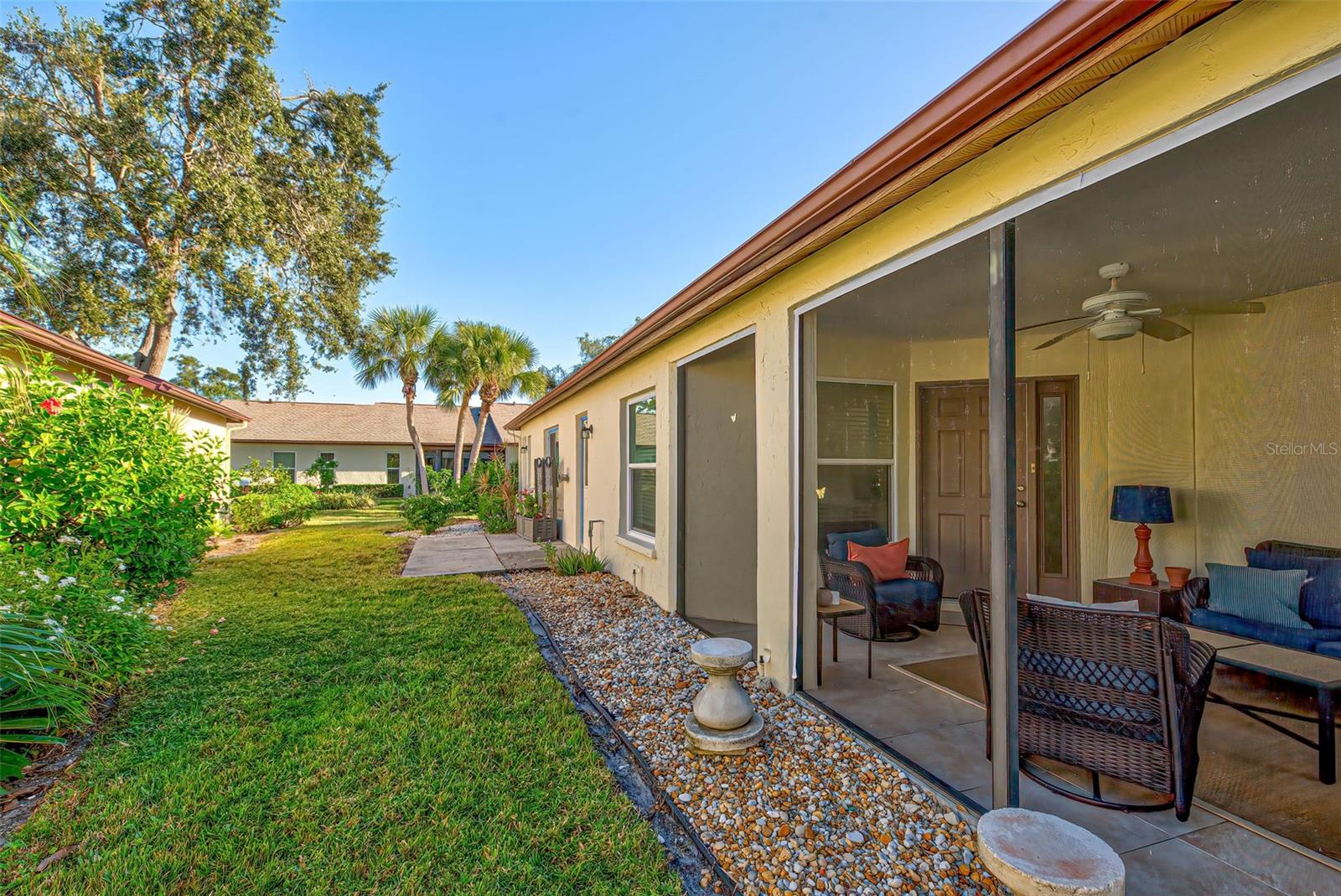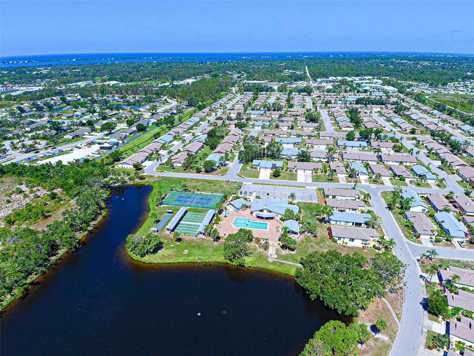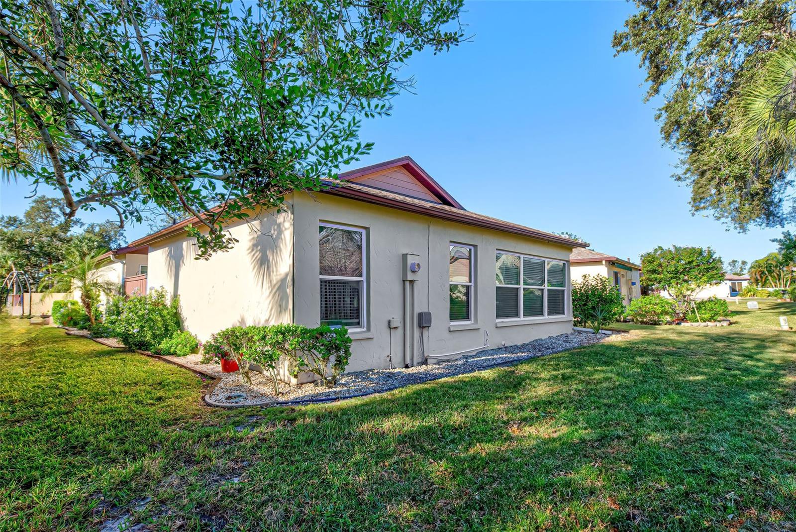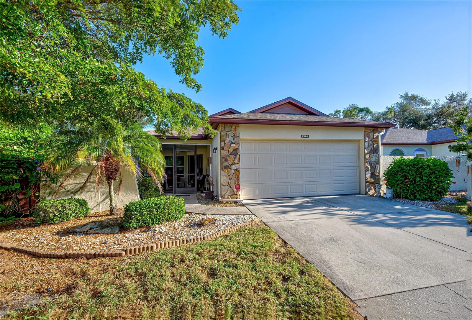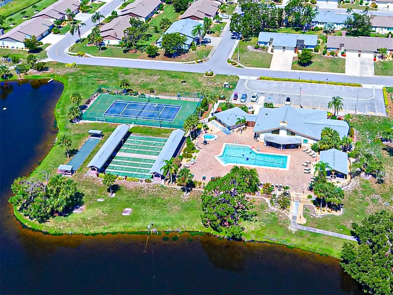 SINGLE FAMILY HOME - STAND ALONE - PRIVATE - SPLIT PLAN - TWO CAR GARAGE - UPDATED AND BEAUTIFUL INSIDE - READY FOR OCCUPANCY- DIRECTLY ACROSS FROM THE LAKE AND CLUBHOUSE FACILITIES. Come take a look at this super nice home. First thing walking in you have a screened in lanai that gives you 170 square feet of covered area to enjoy your morning coffee as you look over to the lake - no houses in your view! Newer updates, Kitchen has all stainless appliances, Debut Cabinetry with slide outs and custom pantry with drawers, all countertops are granite. Side entry to kitchen takes you outdoors to a 16x8 concrete pad for convenient grilling space and room for table and chairs. Flooring is larger neutral color tiles and wood grain laminate throughout. The large primary bedroom has its own attached ensuite with a custom tiled walk-in shower. Living room is bright and airy with vaulted ceilings and open feel. The dining area has a view of the garden/ spa area. Open the sliders to bring this outdoor privacy space into your home. All windows are impact glass, Full size 2 car garage with built in cabinets, workspace and impact rated overhead door. NEW ROOF - NEW HOT WATER HEATER - AC IS 5 YEARS. Check out this wonderful home in a friendly and active community. COME DISCOVER THIS LOVELY HOME - CALL FOR YOUR SHOWING APPOINTMENT TODAY!!