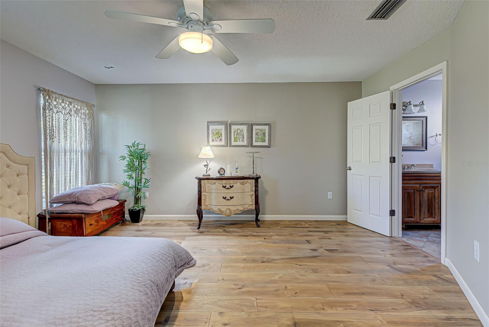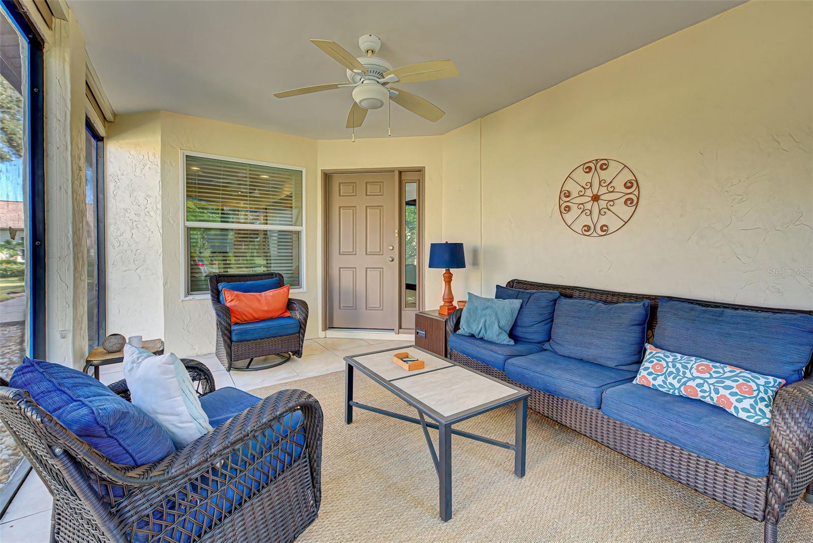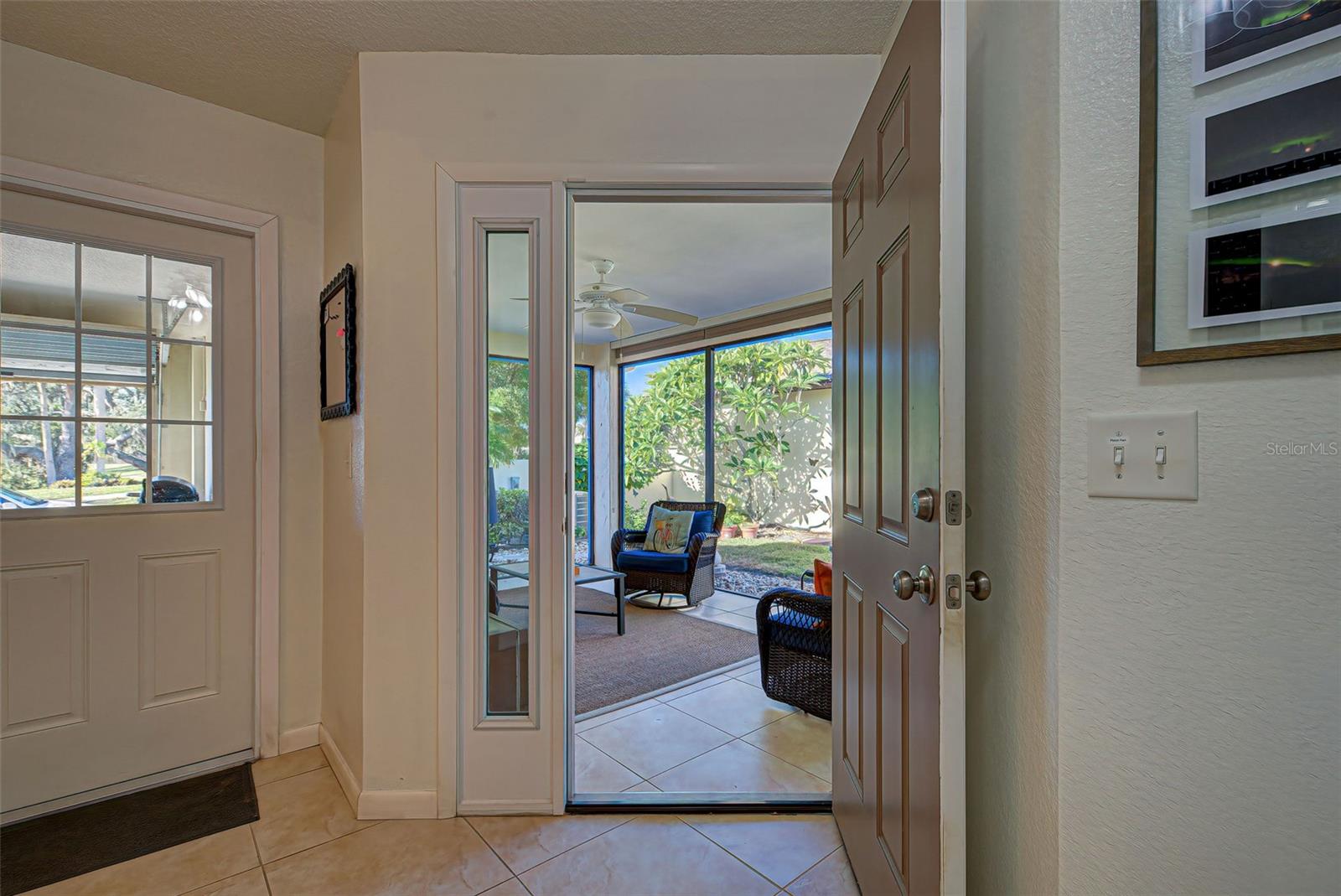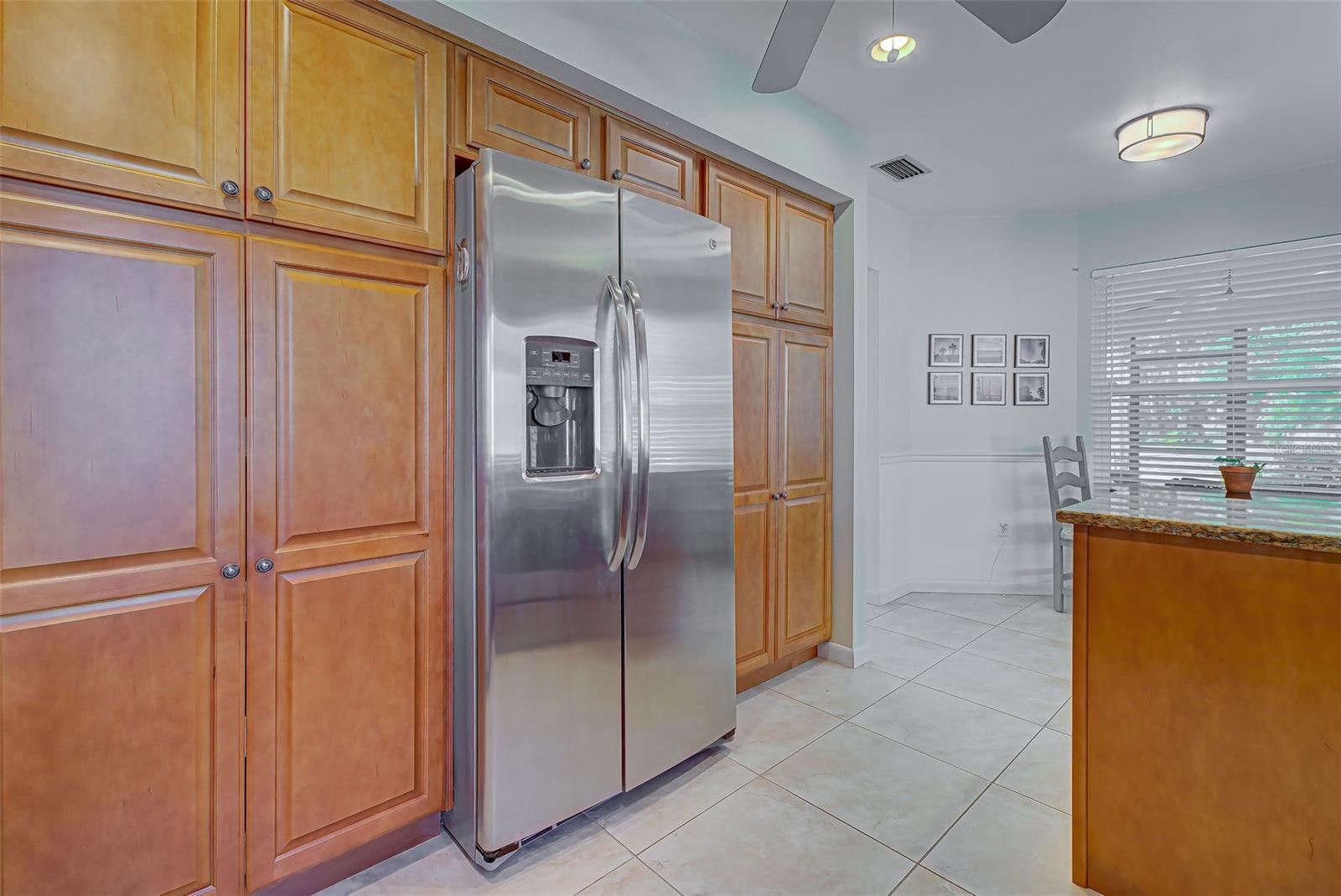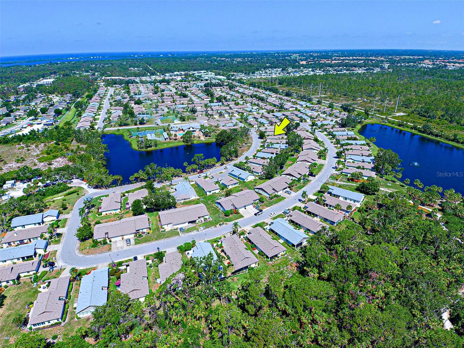 SINGLE FAMILY HOME - STAND ALONE - PRIVATE - SPLIT PLAN - TWO CAR GARAGE - UPDATED AND BEAUTIFUL INSIDE - READY FOR OCCUPANCY- DIRECTLY ACROSS FROM THE LAKE AND CLUBHOUSE FACILITIES. Come take a look at this super nice home. First thing walking in you have a screened in lanai that gives you 170 square feet of covered area to enjoy your morning coffee as you look over to the lake - no houses in your view! Newer updates, Kitchen has all stainless appliances, Debut Cabinetry with slide outs and custom pantry with drawers, all countertops are granite. Side entry to kitchen takes you outdoors to a 16x8 concrete pad for convenient grilling space and room for table and chairs. Flooring is larger neutral color tiles and wood grain laminate throughout. The large primary bedroom has its own attached ensuite with a custom tiled walk-in shower. Living room is bright and airy with vaulted ceilings and open feel. The dining area has a view of the garden/ spa area. Open the sliders to bring this outdoor privacy space into your home. All windows are impact glass, Full size 2 car garage with built in cabinets, workspace and impact rated overhead door. NEW ROOF - NEW HOT WATER HEATER - AC IS 5 YEARS. Check out this wonderful home in a friendly and active community. COME DISCOVER THIS LOVELY HOME - CALL FOR YOUR SHOWING APPOINTMENT TODAY!!