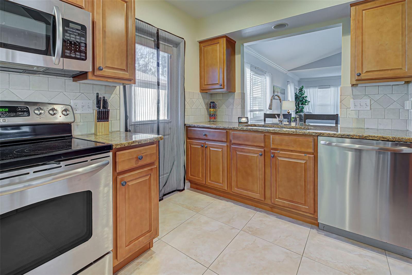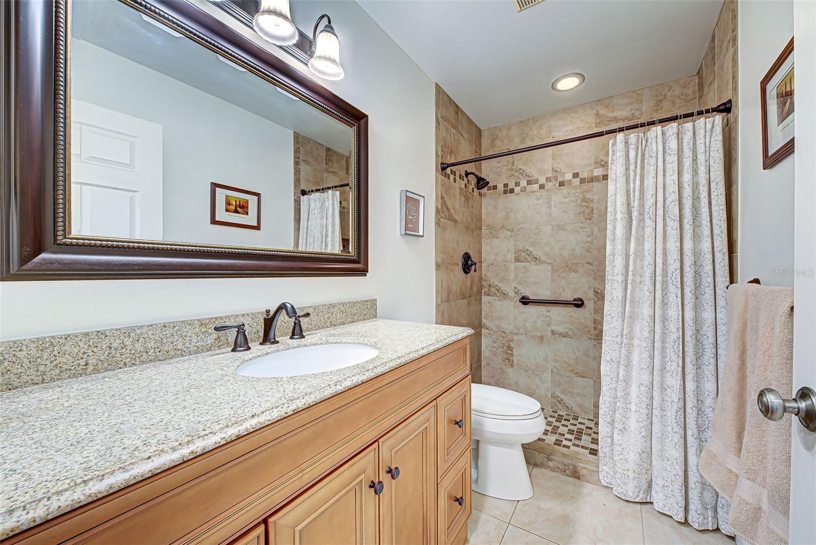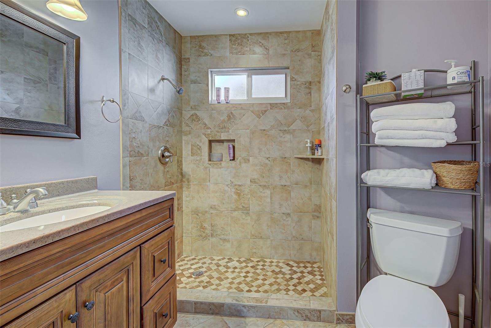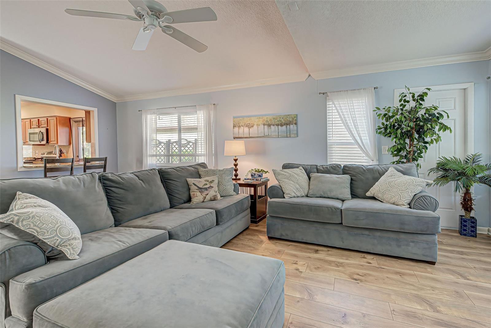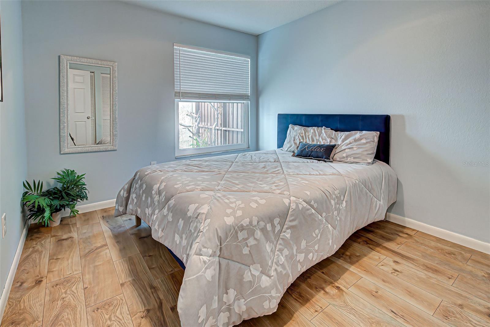 SINGLE FAMILY HOME - STAND ALONE - PRIVATE - SPLIT PLAN - TWO CAR GARAGE - UPDATED AND BEAUTIFUL INSIDE - READY FOR OCCUPANCY- DIRECTLY ACROSS FROM THE LAKE AND CLUBHOUSE FACILITIES. Come take a look at this super nice home. First thing walking in you have a screened in lanai that gives you 170 square feet of covered area to enjoy your morning coffee as you look over to the lake - no houses in your view! Newer updates, Kitchen has all stainless appliances, Debut Cabinetry with slide outs and custom pantry with drawers, all countertops are granite. Side entry to kitchen takes you outdoors to a 16x8 concrete pad for convenient grilling space and room for table and chairs. Flooring is larger neutral color tiles and wood grain laminate throughout. The large primary bedroom has its own attached ensuite with a custom tiled walk-in shower. Living room is bright and airy with vaulted ceilings and open feel. The dining area has a view of the garden/ spa area. Open the sliders to bring this outdoor privacy space into your home. All windows are impact glass, Full size 2 car garage with built in cabinets, workspace and impact rated overhead door. NEW ROOF - NEW HOT WATER HEATER - AC IS 5 YEARS. Check out this wonderful home in a friendly and active community. COME DISCOVER THIS LOVELY HOME - CALL FOR YOUR SHOWING APPOINTMENT TODAY!!