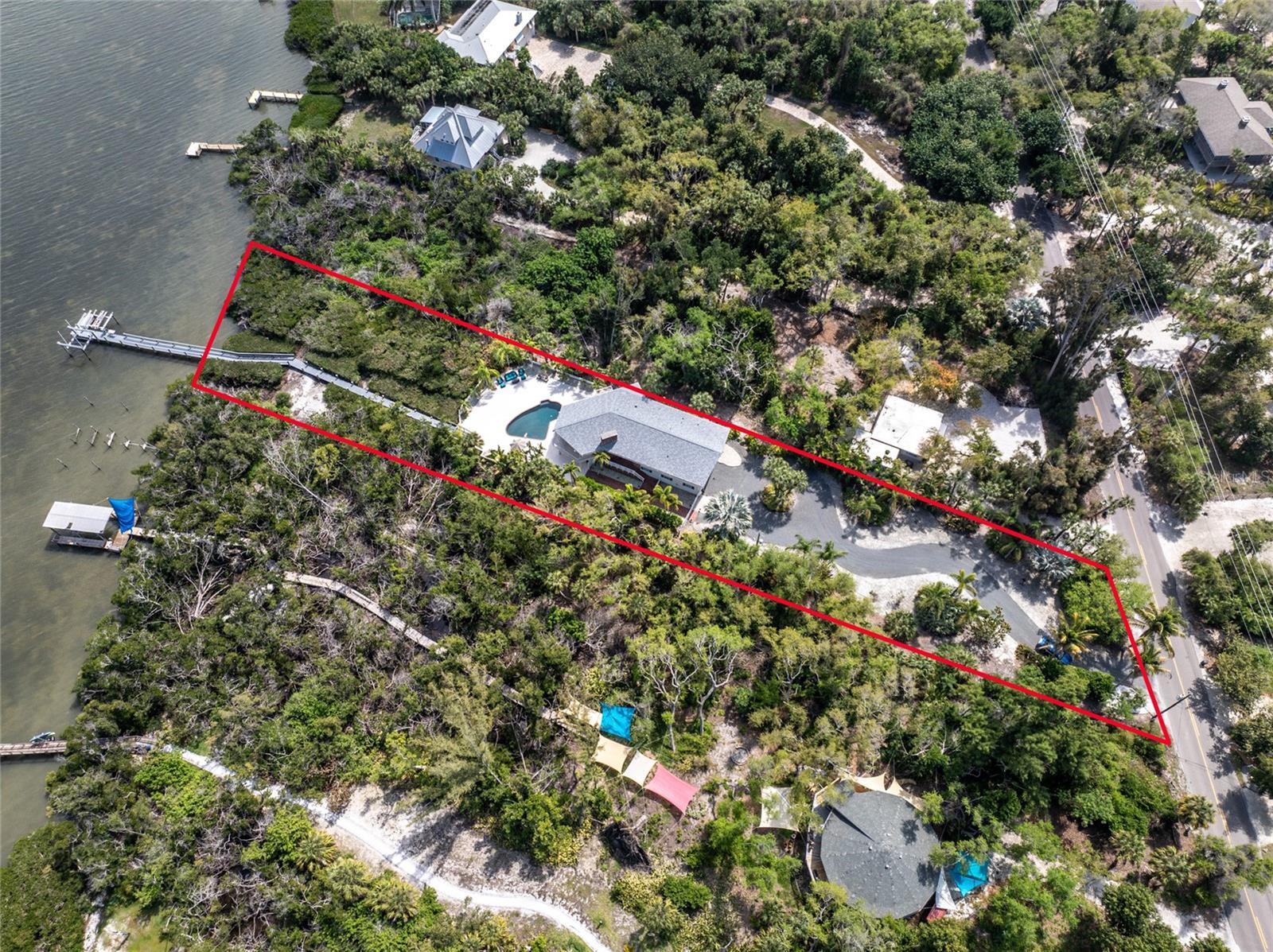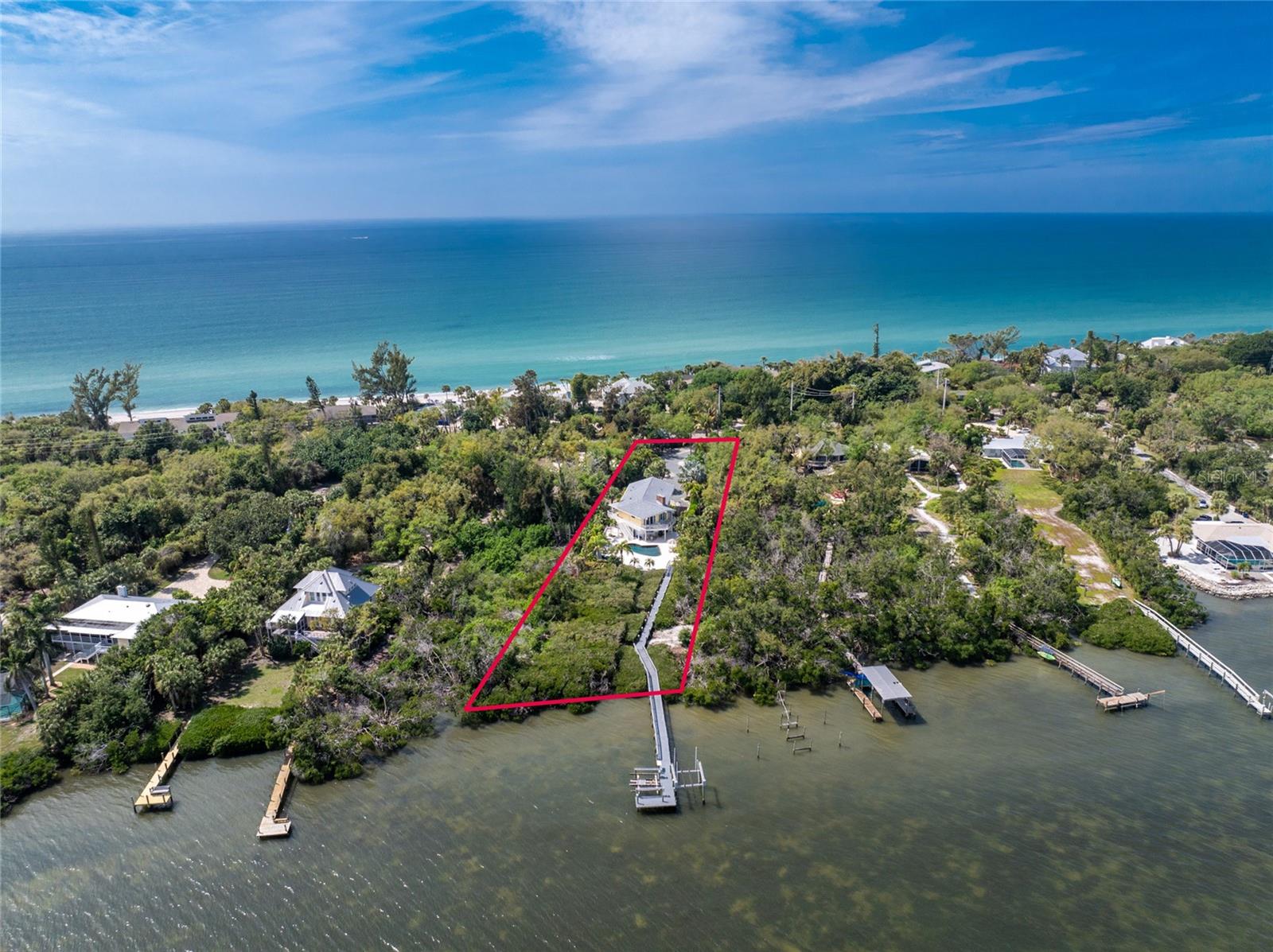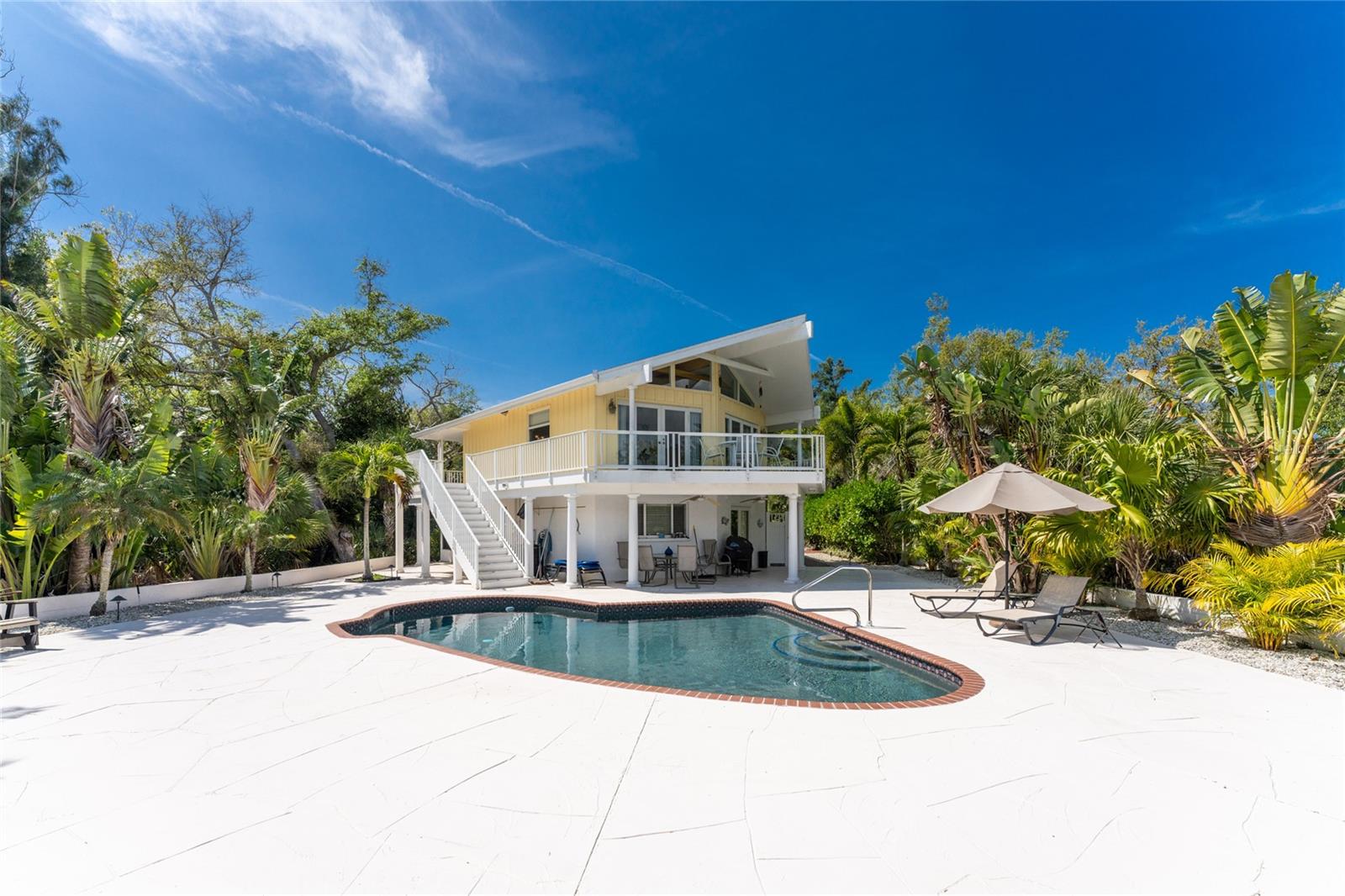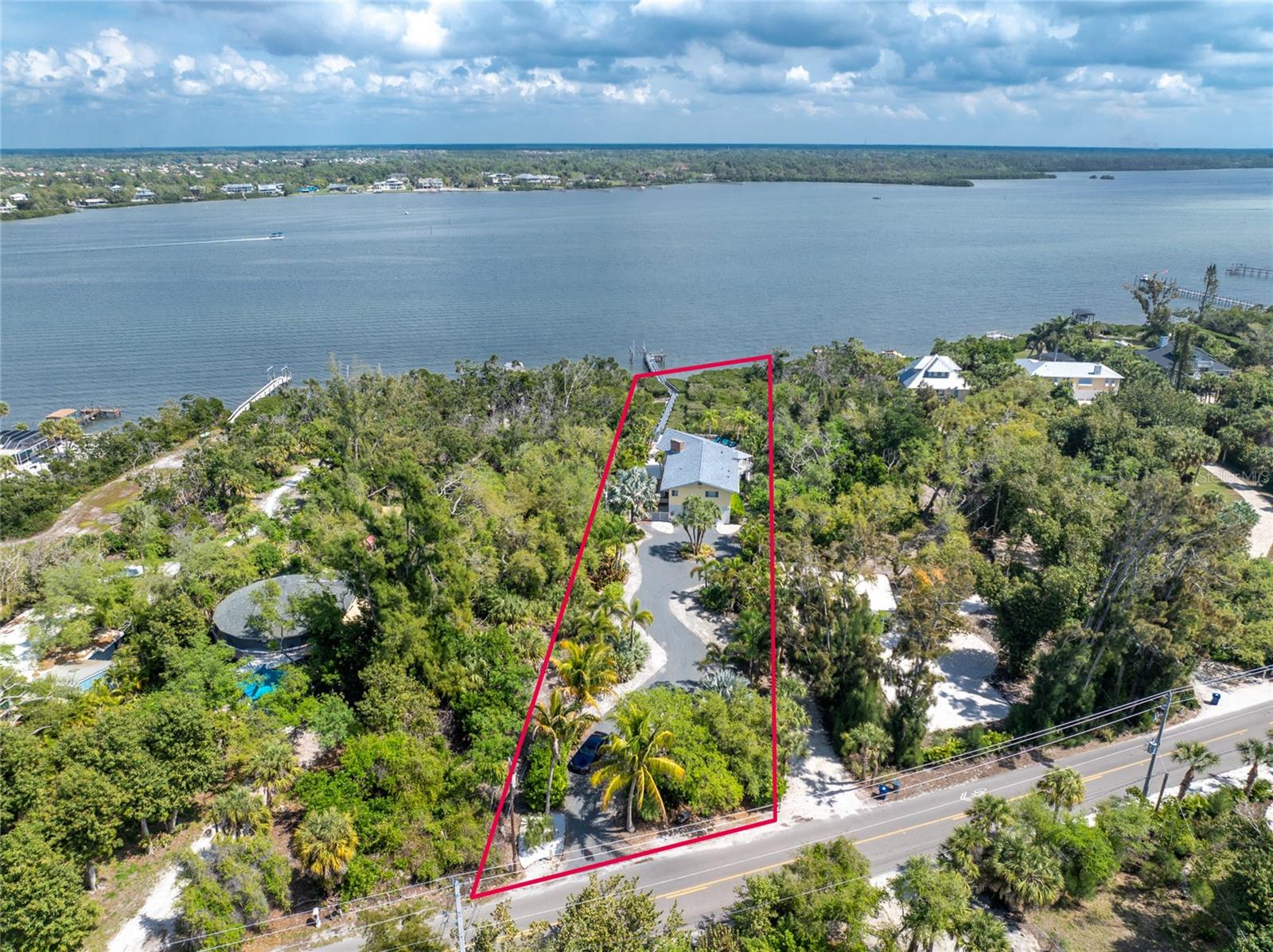 MANASOTA KEY – Don’t’ miss this BAYFRONT PRIVATE RETREAT -- with the laid-back charm of Island living. Located on almost 3/4 acre, this residence is nestled on a private waterfront lot surrounded by mature trees and tropical foliage. Sold fully furnished, boasting two living levels, 3 Bedrooms, 3 Bathrooms, and over 3,100 sq ft of airy, sunlit living space, this lovely waterfront residence features an awe-inspiring 2nd floor Great Room with a Cathedral ceiling and wood burning fireplace, and access to the covered, wrap-around balcony, perfect for watching sunrises over Lemon Bay. The formal dining room includes separate balcony access for outdoor dining and is located adjacent to the updated kitchen. Down the hall, the oversized Primary suite includes a walk-in closet and upgraded, en-suite bathroom with double-sink vanity and luxurious Roman shower with mounted body jets. The guest bedroom includes an adjacent bathroom with jetted tub. The ground level includes a welcoming family room, a 3rd full bathroom, 2 additional bedrooms alongside a utility room with full size washer/dryer, utility sink and an enclosed lanai located just off the pool area. Step outdoors and unwind on the spacious pool deck, perfect for hosting guests, or enjoy a refreshing swim in the heated pool. Adjacent to this area lies the boardwalk leading to the boat dock with 2 lifts; one for your boat, the other for your personal watercraft/jet skiis. New roof January 2022, new A/C in 2023 and 2020. Storm-rated windows and doors throughout and spacious 2-car garage with storage closets. This is the ideal spot to discover the quintessential Island experience. Paradise awaits!