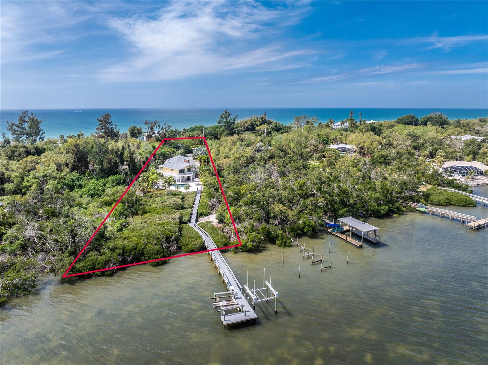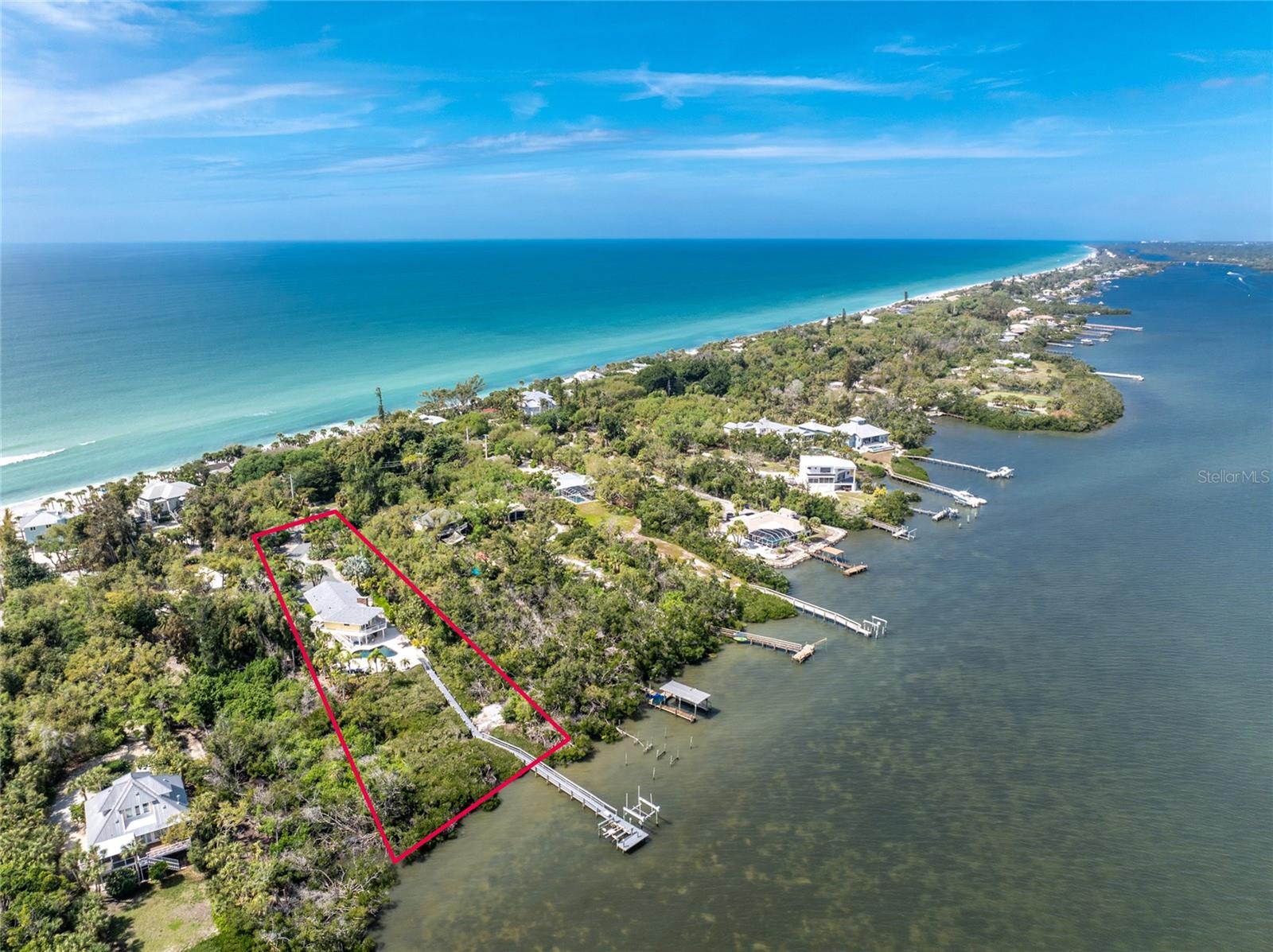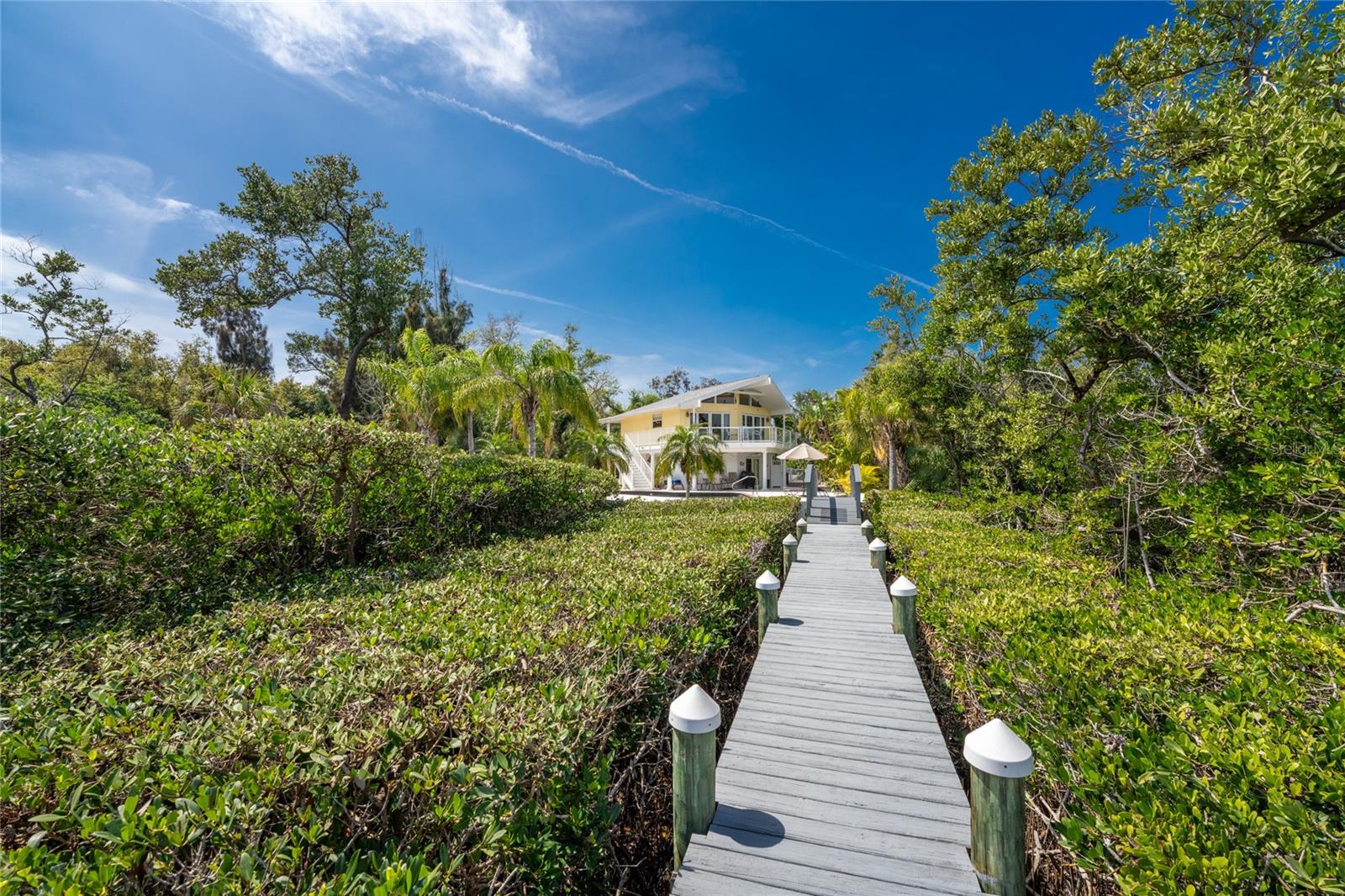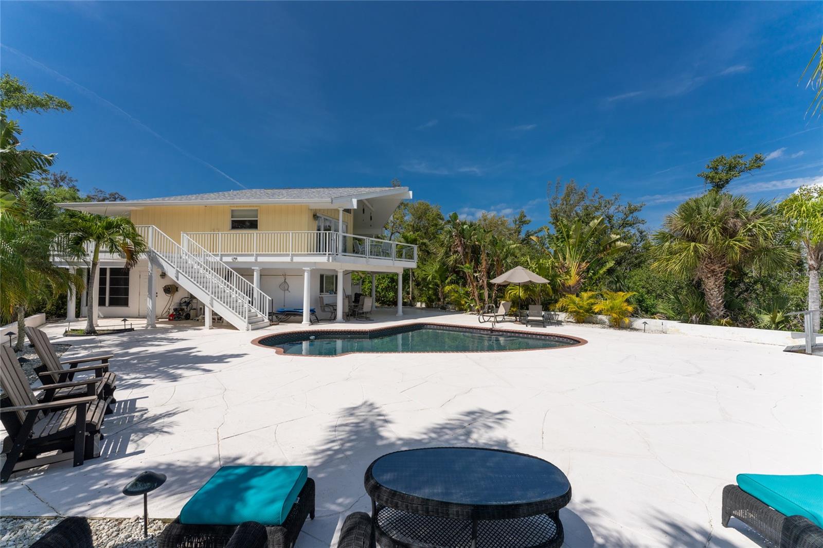 MANASOTA KEY – Don’t’ miss this BAYFRONT PRIVATE RETREAT -- with the laid-back charm of Island living. Located on almost 3/4 acre, this residence is nestled on a private waterfront lot surrounded by mature trees and tropical foliage. Sold fully furnished, boasting two living levels, 3 Bedrooms, 3 Bathrooms, and over 3,100 sq ft of airy, sunlit living space, this lovely waterfront residence features an awe-inspiring 2nd floor Great Room with a Cathedral ceiling and wood burning fireplace, and access to the covered, wrap-around balcony, perfect for watching sunrises over Lemon Bay. The formal dining room includes separate balcony access for outdoor dining and is located adjacent to the updated kitchen. Down the hall, the oversized Primary suite includes a walk-in closet and upgraded, en-suite bathroom with double-sink vanity and luxurious Roman shower with mounted body jets. The guest bedroom includes an adjacent bathroom with jetted tub. The ground level includes a welcoming family room, a 3rd full bathroom, 2 additional bedrooms alongside a utility room with full size washer/dryer, utility sink and an enclosed lanai located just off the pool area. Step outdoors and unwind on the spacious pool deck, perfect for hosting guests, or enjoy a refreshing swim in the heated pool. Adjacent to this area lies the boardwalk leading to the boat dock with 2 lifts; one for your boat, the other for your personal watercraft/jet skiis. New roof January 2022, new A/C in 2023 and 2020. Storm-rated windows and doors throughout and spacious 2-car garage with storage closets. This is the ideal spot to discover the quintessential Island experience. Paradise awaits!