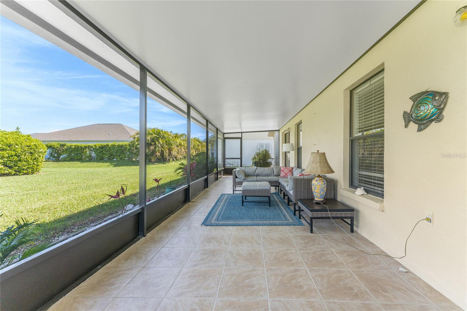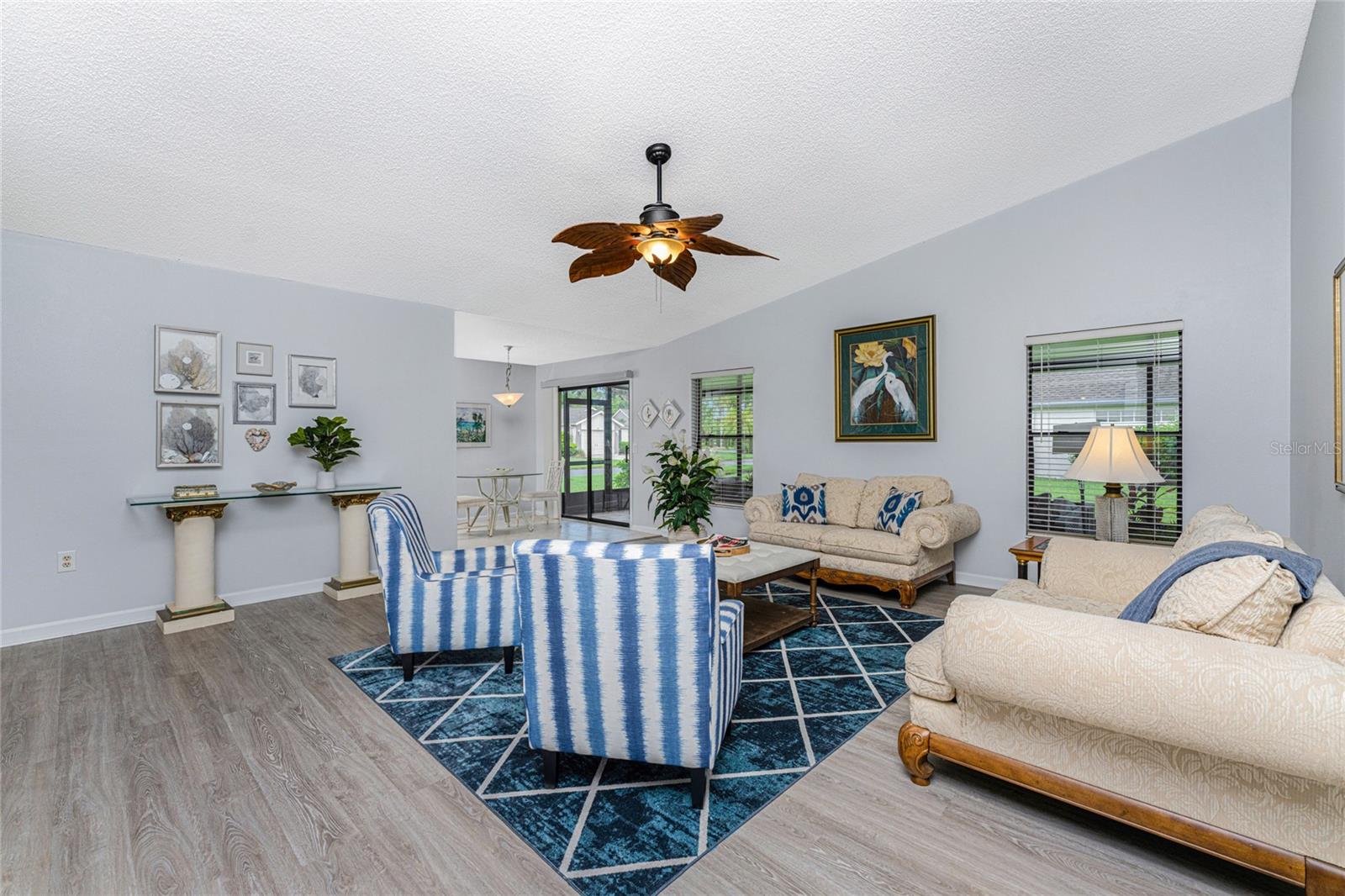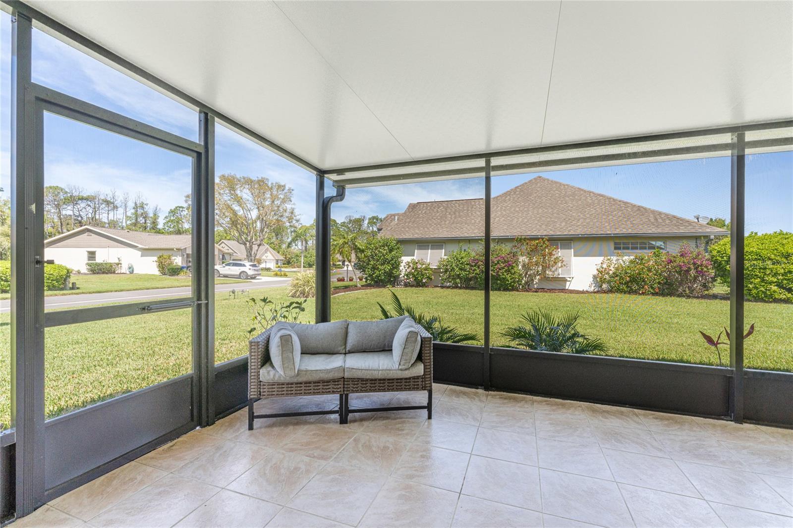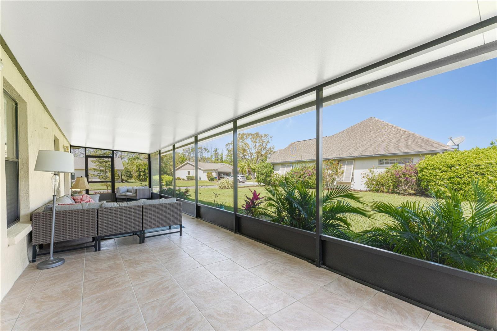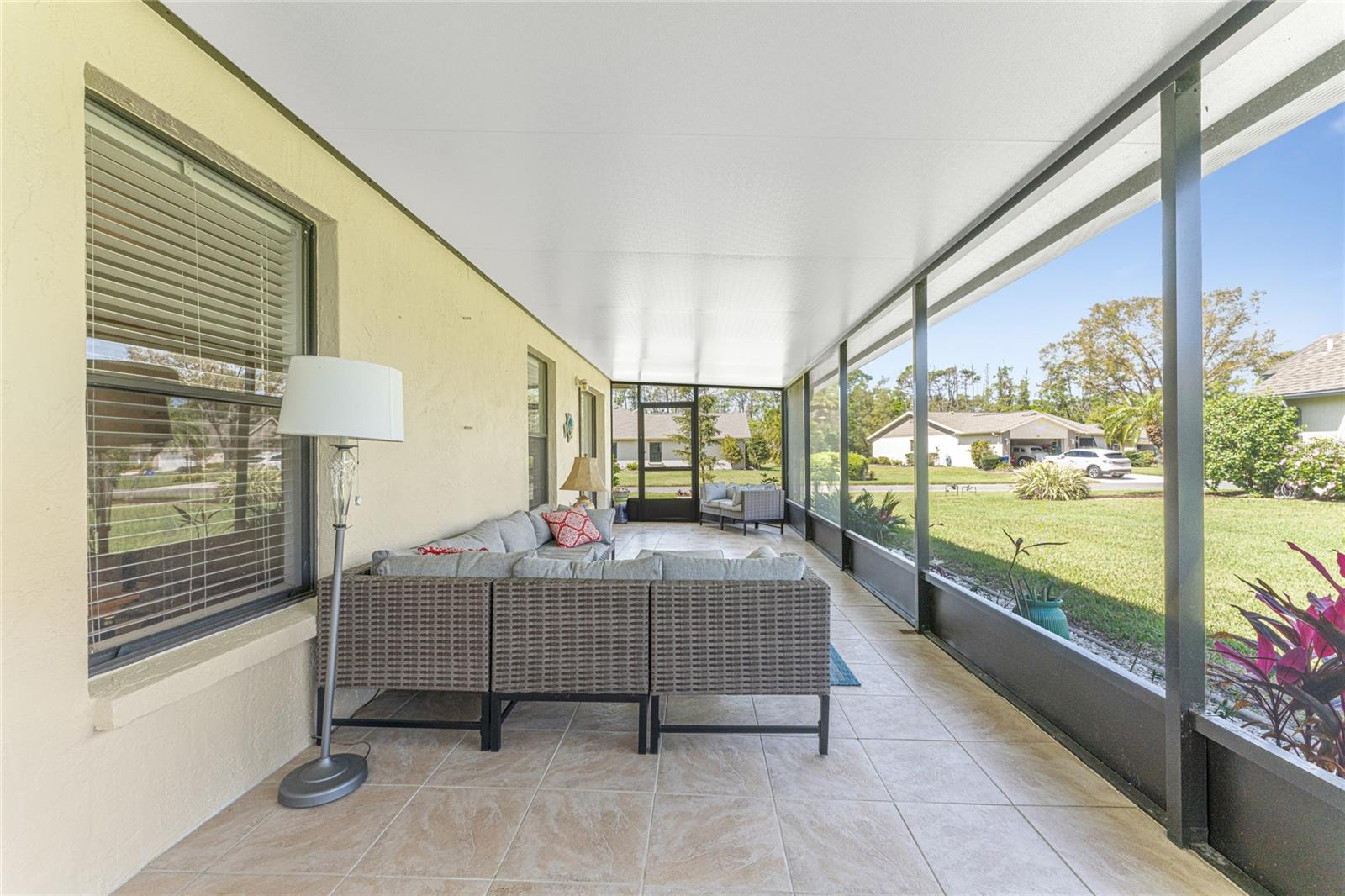 Welcome to the gated 55+ Community of Park Forest, nestled in the heart of Englewood. As you drive through the archway of Florida Oak Trees that surround the front entry. You will see mature landscaping. Drive up to this charming corner lot home & awe at the lush tropical landscape. Step inside the screened front entry patio, a perfect place to enjoy your morning coffee. Step through the foyer and into the Great Room with vaulted ceilings, new wood look flooring and a wet bar area for entertaining guests. Step around the dining and kitchen area and enjoy easy lanai access through the sliding doors. Perfect area to wind down after a long day at the beach. The expansive lanai extends along the the rear of the home, and is upgraded with tile flooring and new cage, a fabulous place for entertaining family and neighbors. It is also accessible from the spacious Master bedroom. Many updates in home include flooring, lighting, paint, interior doors, partial updates in baths including new vanities. The Master Bedroom has brand new neutral carpet, walk-in closet and ensuite bathroom with a step in shower and new vanity. The Guest Bedroom also has updated carpet and new matching vanity and a wall of closets. Loads of storage in this home. Other recent updates include 2018 A/C system, new roof March 2024. Home has interior laundry closet for your convenience. When you're ready, jump on your golf cart and take a short ride to the community pool or meet your friends for a tennis match. Park Forest is a highly sought after community where you can enjoy the peace of mind with*MAINTENANCE FREE LIVING including exterior, roofs and painting of homes on a regular basis. Full community calendar including swimming pool, recreation center, pickleball and tennis courts. There is also boat and RV storage within the community. Plus you will be just a few miles from numerous Gulf Beaches, restaurants and shopping! Home is furnished minus the lamps and some home decor. Call today for your private appointment.
