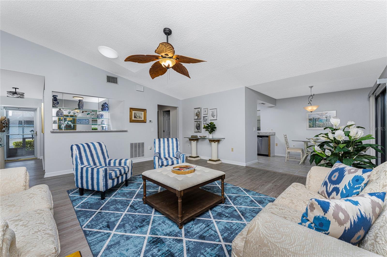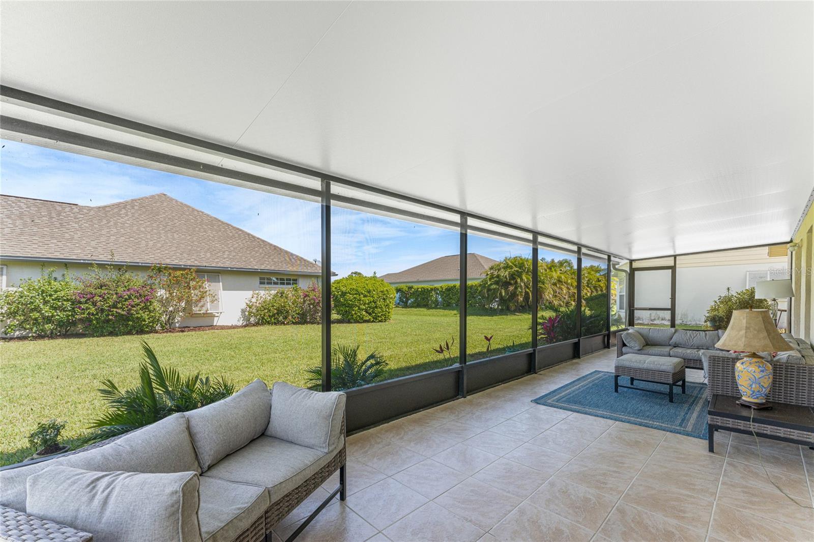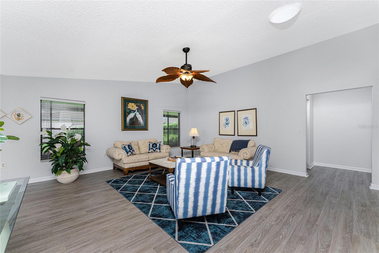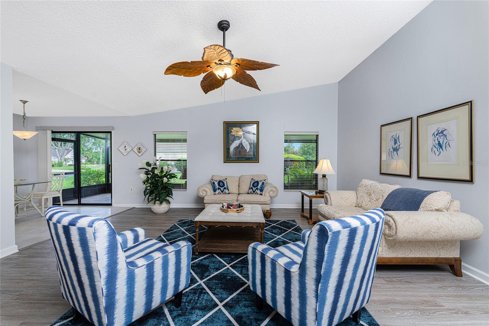 Welcome to the gated 55+ Community of Park Forest, nestled in the heart of Englewood. As you drive through the archway of Florida Oak Trees that surround the front entry. You will see mature landscaping. Drive up to this charming corner lot home & awe at the lush tropical landscape. Step inside the screened front entry patio, a perfect place to enjoy your morning coffee. Step through the foyer and into the Great Room with vaulted ceilings, new wood look flooring and a wet bar area for entertaining guests. Step around the dining and kitchen area and enjoy easy lanai access through the sliding doors. Perfect area to wind down after a long day at the beach. The expansive lanai extends along the the rear of the home, and is upgraded with tile flooring and new cage, a fabulous place for entertaining family and neighbors. It is also accessible from the spacious Master bedroom. Many updates in home include flooring, lighting, paint, interior doors, partial updates in baths including new vanities. The Master Bedroom has brand new neutral carpet, walk-in closet and ensuite bathroom with a step in shower and new vanity. The Guest Bedroom also has updated carpet and new matching vanity and a wall of closets. Loads of storage in this home. Other recent updates include 2018 A/C system, new roof March 2024. Home has interior laundry closet for your convenience. When you're ready, jump on your golf cart and take a short ride to the community pool or meet your friends for a tennis match. Park Forest is a highly sought after community where you can enjoy the peace of mind with*MAINTENANCE FREE LIVING including exterior, roofs and painting of homes on a regular basis. Full community calendar including swimming pool, recreation center, pickleball and tennis courts. There is also boat and RV storage within the community. Plus you will be just a few miles from numerous Gulf Beaches, restaurants and shopping! Home is furnished minus the lamps and some home decor. Call today for your private appointment.