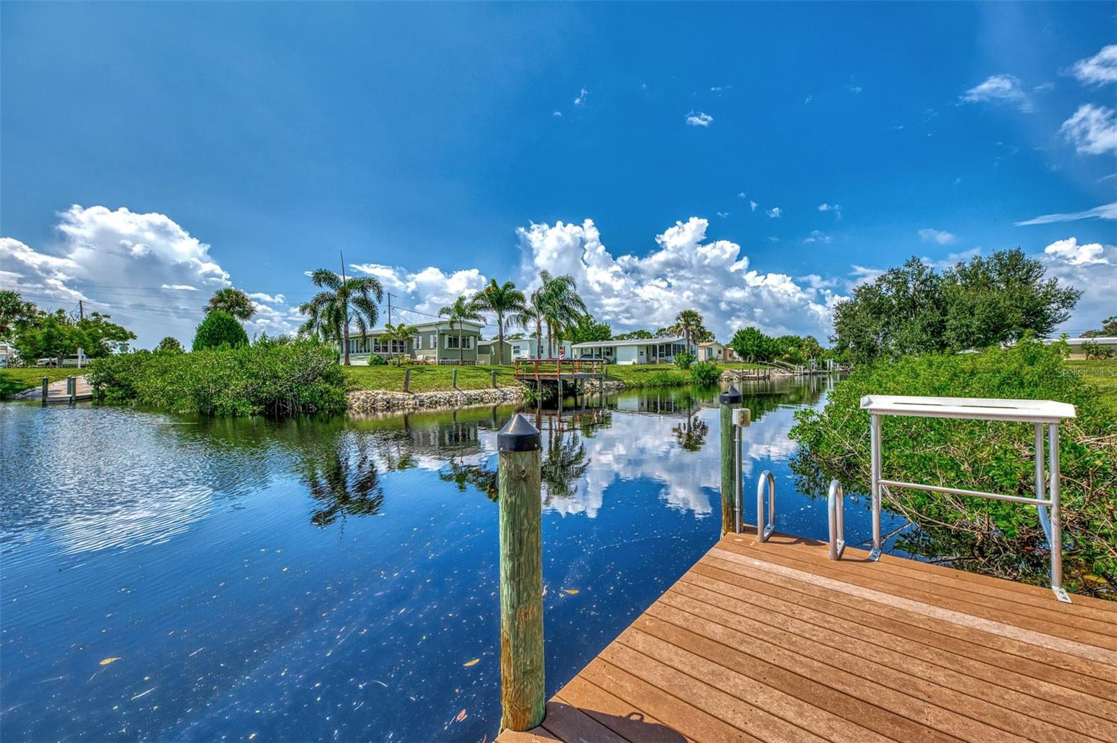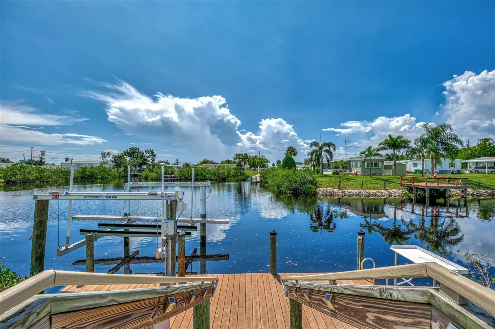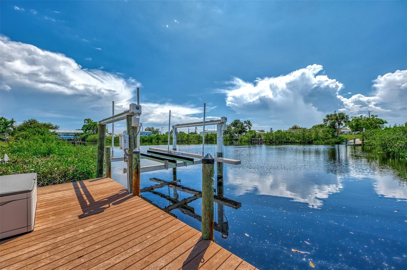 Waterfront, Updated and Renovated Home located in Manatee Cove, a 55+ active community! You have found your next Florida home. This 3 bedroom, two bathroom and enclosed Florida Room, situated on over a quarter acre of land, will check ALL your boxes. Take a boat ride out through Catfish Canal to Rock Creek, leading out to Lemon Bay and the Gulf of Mexico from your private dock with boat lift. Fish right off your dock and watch the sunset without leaving your backyard! This home has been lovingly updated and renovated over the past few years. In 2023, a NEW Roof, Vapor Barrier and Insulation, 2nd & 3rd bedrooms were painted, new ceiling fans and insulation installed. Improvements in 2024 include NEW Carport, Shed, Gutters & Downspouts, Screens on home and Florida Room, interior paint on Ceilings and walls in Living Room, Kitchen, Dining Room and both Bathrooms. Updates in 2019, New Washing Machine, Refrigerator, Stove, Formica countertops and walls, stainless steel sink and faucet, paneled & painted laundry room, storage cabinets above washer and dryer, added pantry cabinet, new outlets, switches and plates throughout home, New Pergo Outlast Waterproof Laminate Flooring and molding, replaced carpet, ceiling fan & screen door in Florida Room as well as Sunblock Roll down shades, Installed 3M NBI Sun Control window film, New Sliding Glass door and Window from 2nd & 3rd bedrooms to Florida Room, New Vanities, Sinks, Light Fixtures and Medicine Cabinets in both bathrooms. Walkway deck and steps leading to the dock, replaced with Wear Plastic Decking, 6000 lbs Hightide Boat Lift with remote control, 22' Aluminum Catwalk, All pylons wrapped, fish cleaning station installed and water run to dock with 2 faucets. Water heater replaced in 2020. More updates include new siding, skirting, shutters and sliding door kitchen to carport in 2017. New toilets installed in both bathrooms in 2015, HVAC in 2014, primary bathroom shower replaced in 2011, New Electrical Panel and Trex Dock 8x24' in 2006. This home is move-in ready! Manatee Cove offers optional amenities that include access to the community boat launch, clubhouse and shuffleboard courts. Minutes away from multiple banks, grocery stores, shopping, the iconic Dearborn Street and Englewood Beach. Make this waterfront home yours!