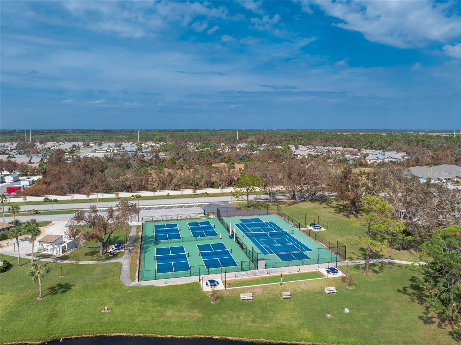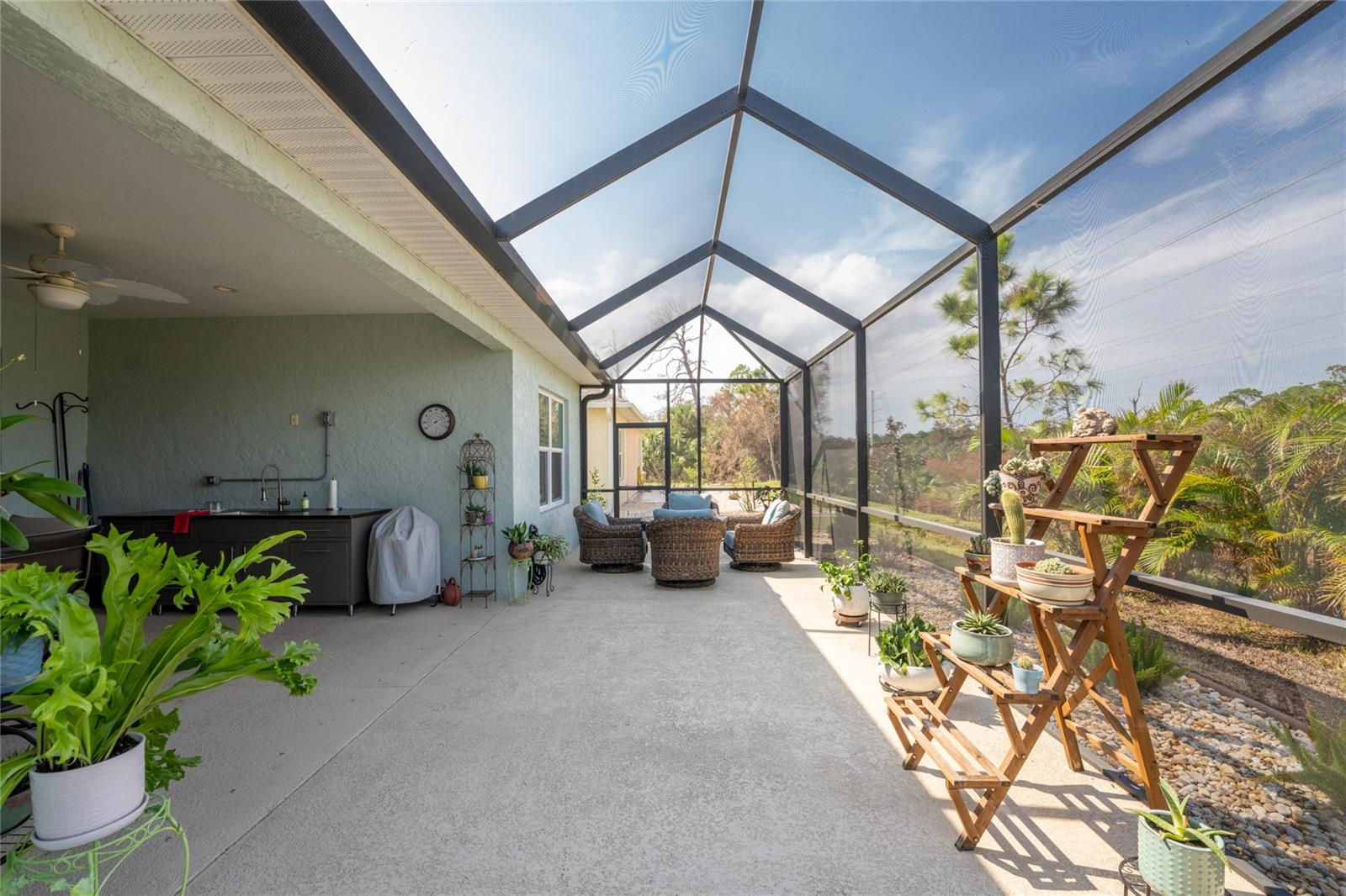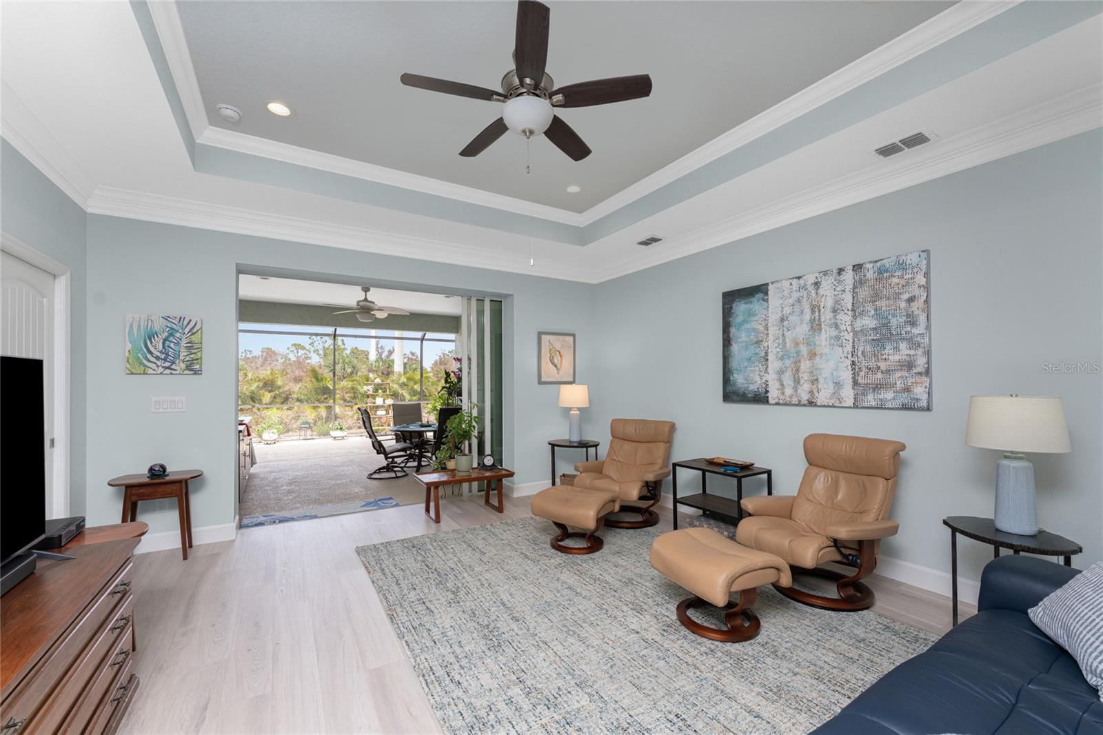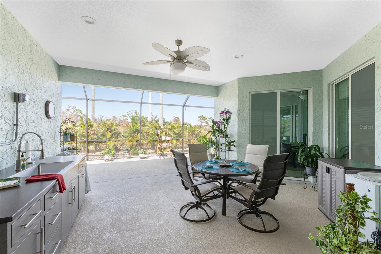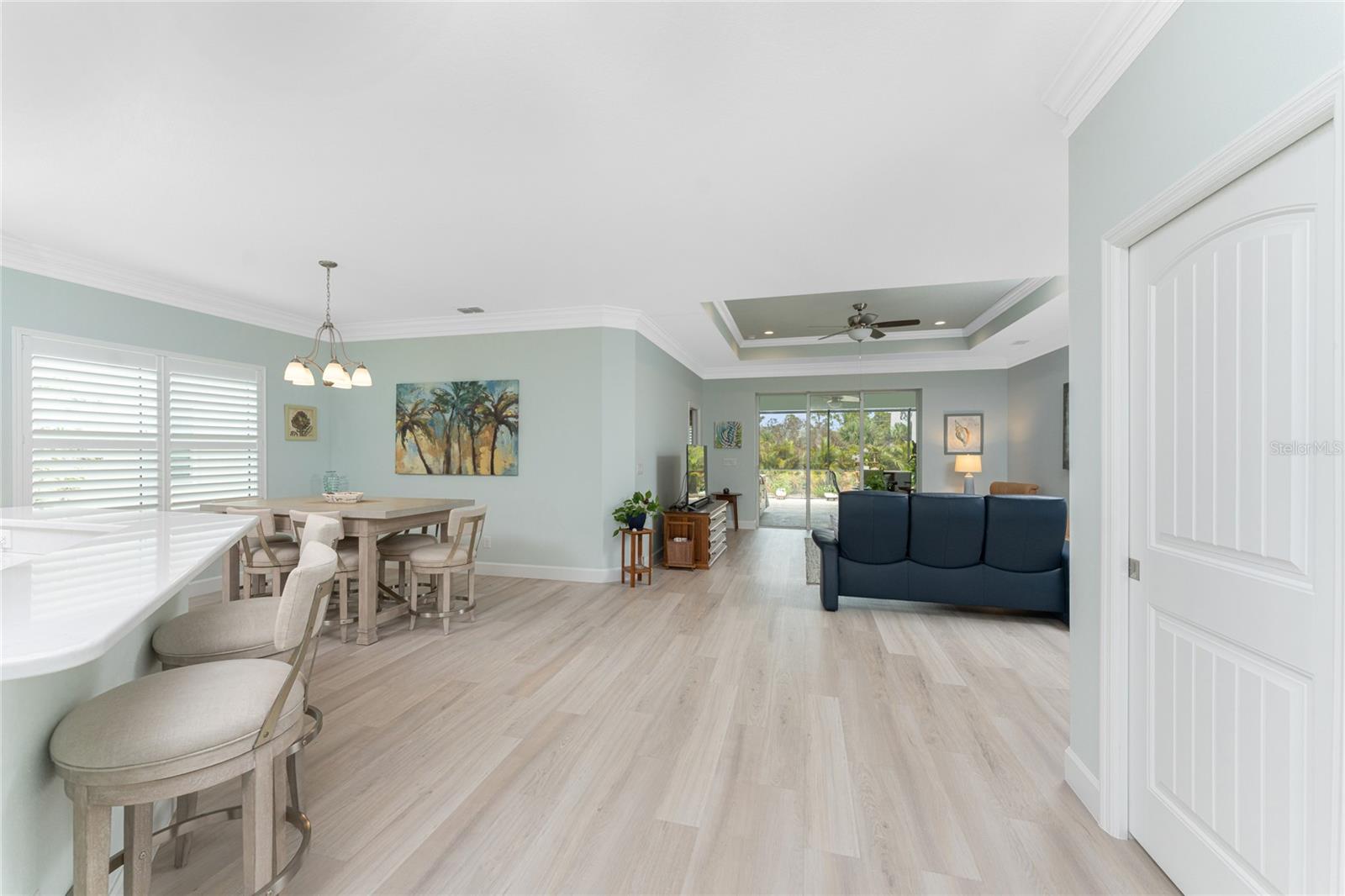 WHY BUILD OR BUY NEW? This 3 bedroom, 2 bath, 2 car garage home has so many upgrades that if you build, will cost you $1000's of dollars extra! Luxury Vinyl Plank flooring through out, crown molding in all major rooms, upgraded kitchen appliances, screened entry with pavers, extended screened lanai area, USB'S in some outlets, Impact windows and doors and so much more!!! Popular Pearl floor plan features a spacious Living area with a tray ceiling with a ceiling fan and pocket sliding doors to the lanai! Adjacent dining area is spacious with plenty of room for entertaining! Kitchen has upgraded Quartz counter tops, upgraded composite sink, pretty backsplash, closet pantry, breakfast bar, ceiling fan and a dinette area with additional cabinetry added for plenty of storage! Appliances include: GE Kitchen Hub Entertainment and Ventilation System, GE Cafe French door refrigerator, GE Cafe microwave, GE Cafe built in oven, GE Cafe dishwasher and GE Profile induction range! Main bedroom has a tray ceiling with crown molding and a ceiling fan, walk in closet with built ins, separate office/den area and another set of sliding glass doors to the lanai!! Main bath has a double vanity with upgraded Quartz top, added cabinetry for lots of storage, Oversized shower with door, privacy commode area and a linen closet. Bedrooms #2 and #3 have ceiling fans and wall closets. The adjacent Guest bath is handily located in between the Guest bedrooms, and features upgraded wood vanity with solid surface countertop, Shower with door (shower walls are tiled to the ceiling, so no wet drywall!) and linen closet. Pocket door to the guest bedrooms adds extra privacy for your guests! Laundry room has a pocket door for access, GE front load washer and dryer, utility tub, and extra cabinetry above for extra storage. The screened lanai has a ceiling fan, OUTDOOR KITCHEN with built in sink with water and electric, perfect for outdoor entertaining! The CAGED AREA has been dramatically increased, so there's plenty of outdoor living area for a firepit, plants, hot tub or whatever you choose!. The 2 car garage has an automatic garage door and pull down stairs for extra storage in the attic! The beautiful tropical landscaping adds to this amazing home. This is a special home and you would do well to call it your Florida paradise! This home is located in one of Englewood's favorite communities, with great amenities such as: clubhouse, pool, tennis/pickleball courts, RV/Boat Parking, and more activities than you could possibly take advantage of! Come take a tour today!