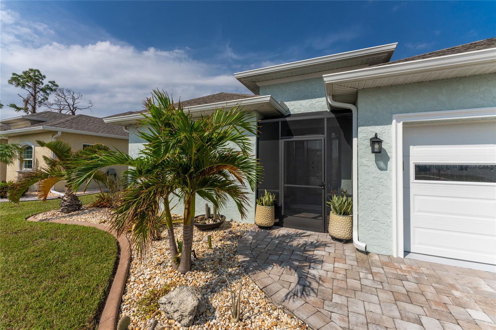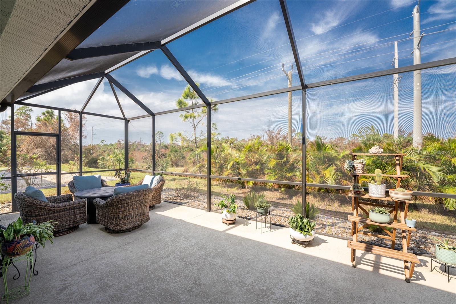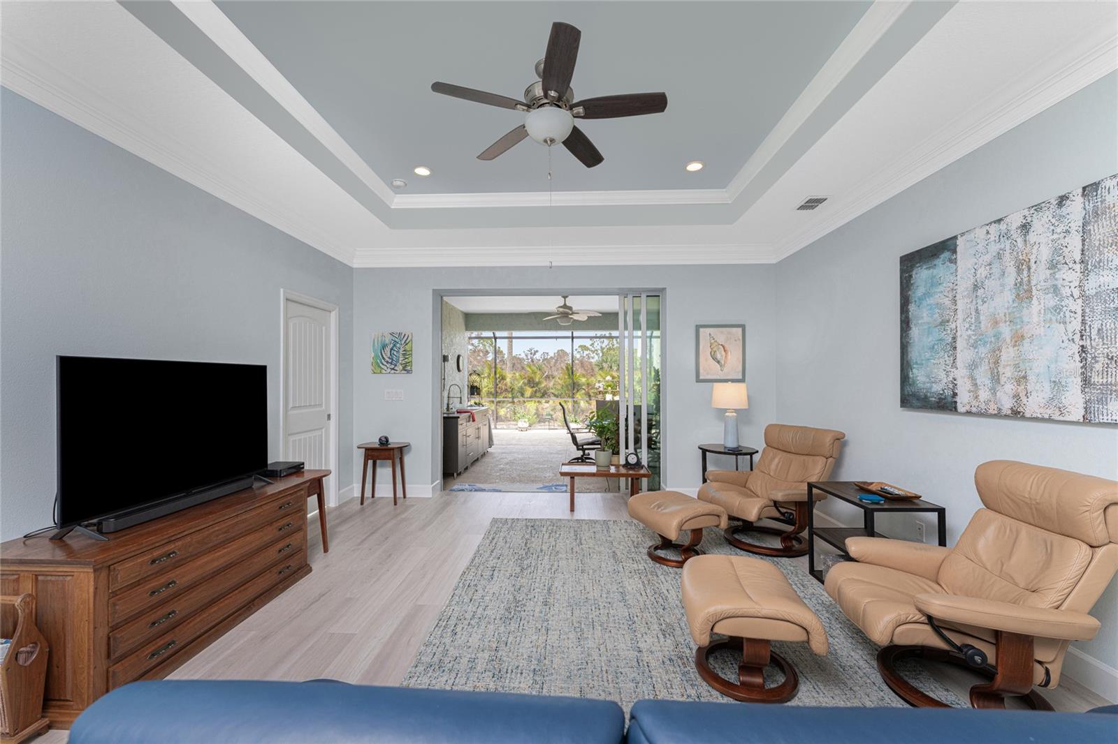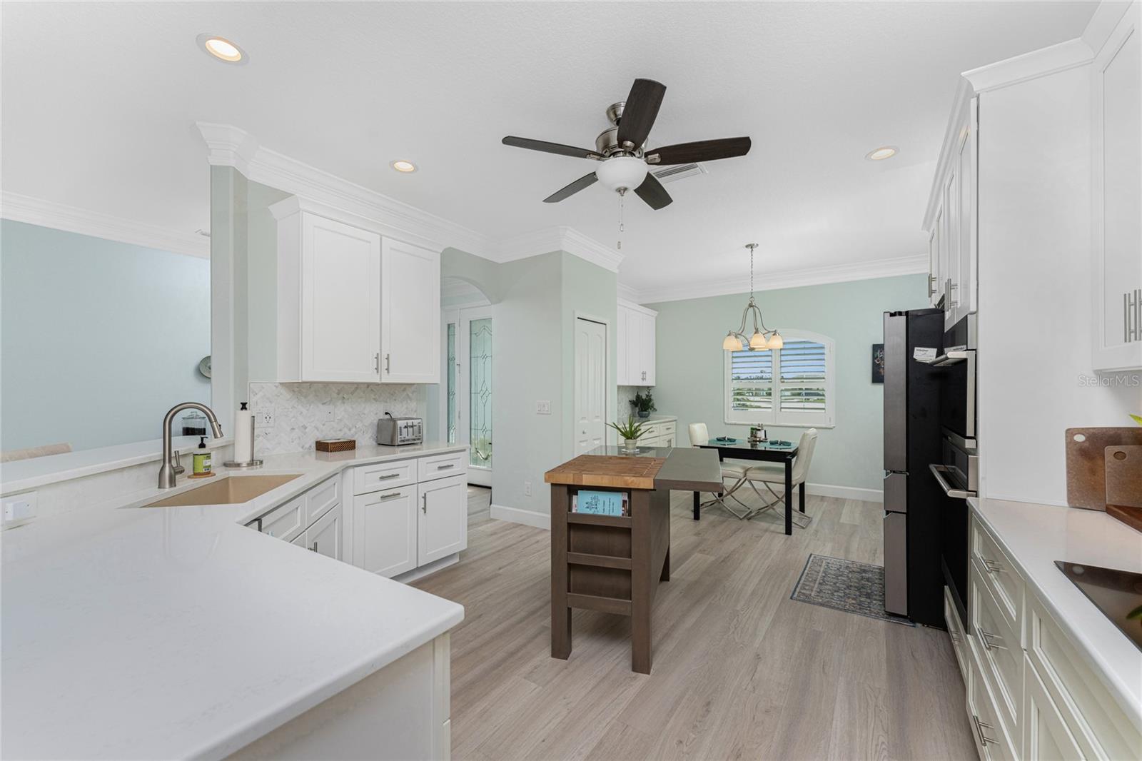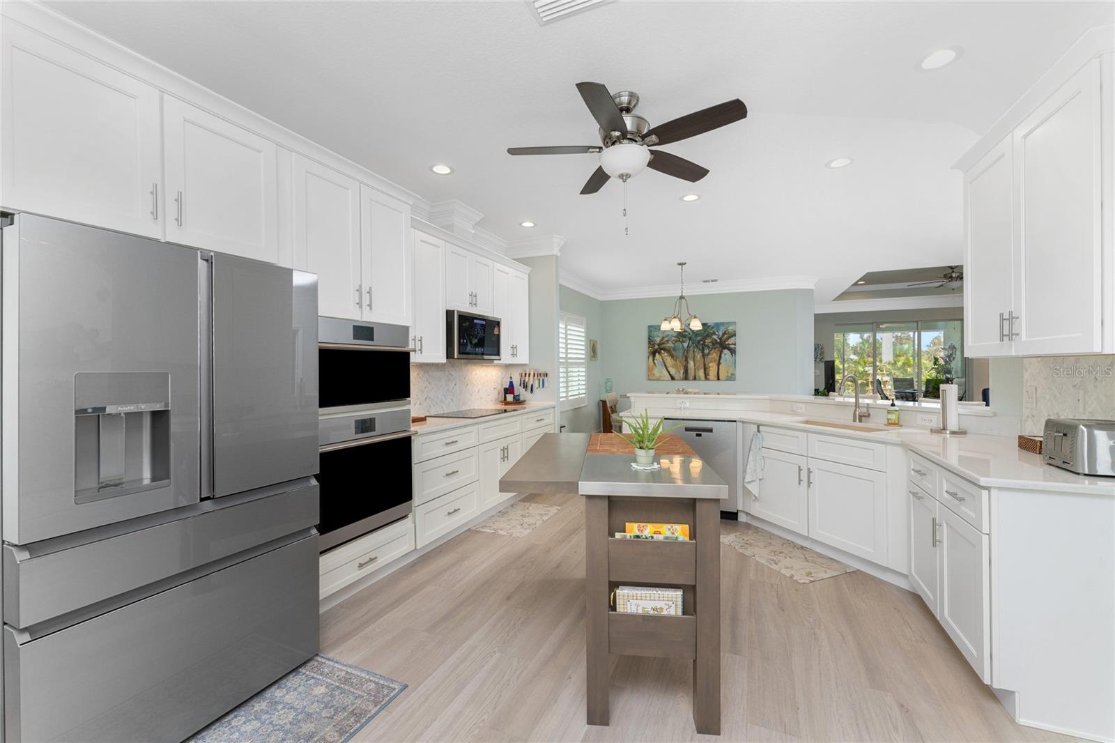 WHY BUILD OR BUY NEW? This 3 bedroom, 2 bath, 2 car garage home has so many upgrades that if you build, will cost you $1000's of dollars extra! Luxury Vinyl Plank flooring through out, crown molding in all major rooms, upgraded kitchen appliances, screened entry with pavers, extended screened lanai area, USB'S in some outlets, Impact windows and doors and so much more!!! Popular Pearl floor plan features a spacious Living area with a tray ceiling with a ceiling fan and pocket sliding doors to the lanai! Adjacent dining area is spacious with plenty of room for entertaining! Kitchen has upgraded Quartz counter tops, upgraded composite sink, pretty backsplash, closet pantry, breakfast bar, ceiling fan and a dinette area with additional cabinetry added for plenty of storage! Appliances include: GE Kitchen Hub Entertainment and Ventilation System, GE Cafe French door refrigerator, GE Cafe microwave, GE Cafe built in oven, GE Cafe dishwasher and GE Profile induction range! Main bedroom has a tray ceiling with crown molding and a ceiling fan, walk in closet with built ins, separate office/den area and another set of sliding glass doors to the lanai!! Main bath has a double vanity with upgraded Quartz top, added cabinetry for lots of storage, Oversized shower with door, privacy commode area and a linen closet. Bedrooms #2 and #3 have ceiling fans and wall closets. The adjacent Guest bath is handily located in between the Guest bedrooms, and features upgraded wood vanity with solid surface countertop, Shower with door (shower walls are tiled to the ceiling, so no wet drywall!) and linen closet. Pocket door to the guest bedrooms adds extra privacy for your guests! Laundry room has a pocket door for access, GE front load washer and dryer, utility tub, and extra cabinetry above for extra storage. The screened lanai has a ceiling fan, OUTDOOR KITCHEN with built in sink with water and electric, perfect for outdoor entertaining! The CAGED AREA has been dramatically increased, so there's plenty of outdoor living area for a firepit, plants, hot tub or whatever you choose!. The 2 car garage has an automatic garage door and pull down stairs for extra storage in the attic! The beautiful tropical landscaping adds to this amazing home. This is a special home and you would do well to call it your Florida paradise! This home is located in one of Englewood's favorite communities, with great amenities such as: clubhouse, pool, tennis/pickleball courts, RV/Boat Parking, and more activities than you could possibly take advantage of! Come take a tour today!