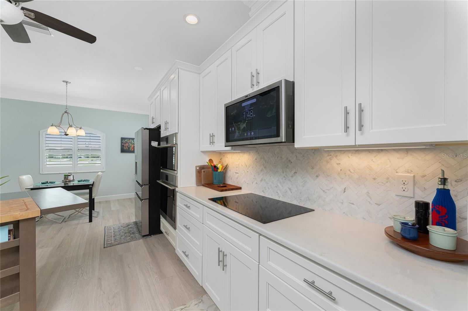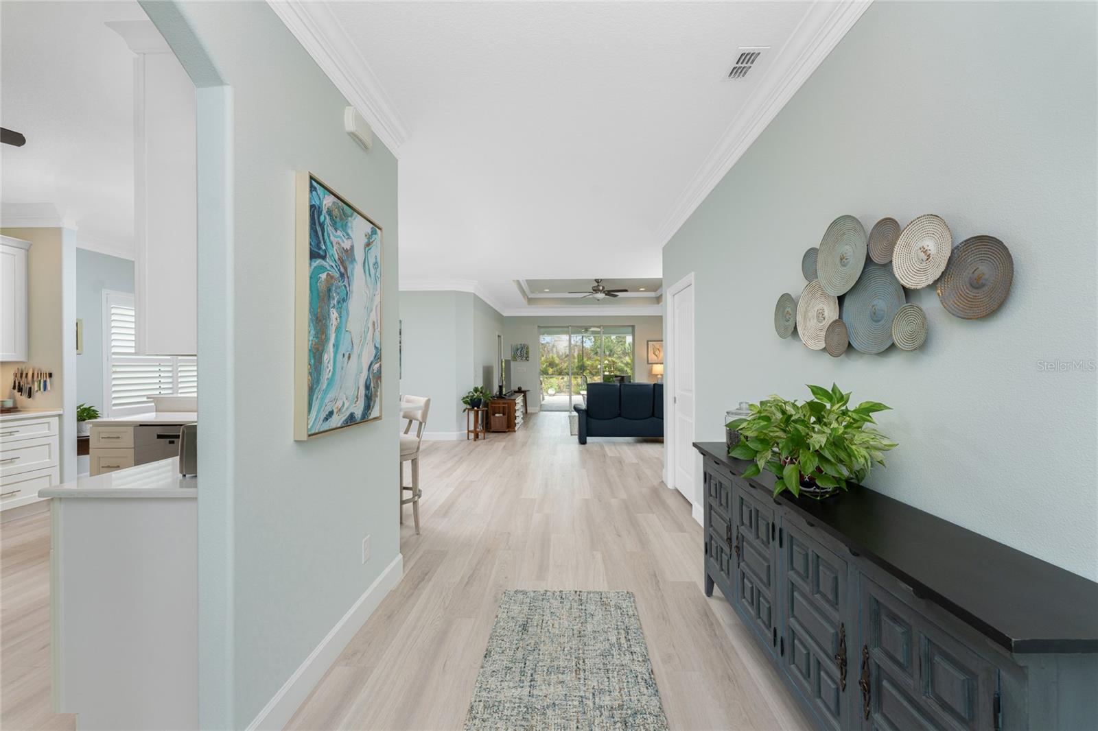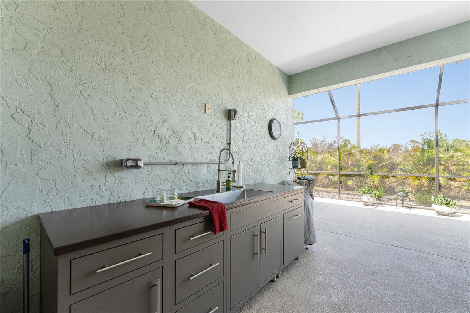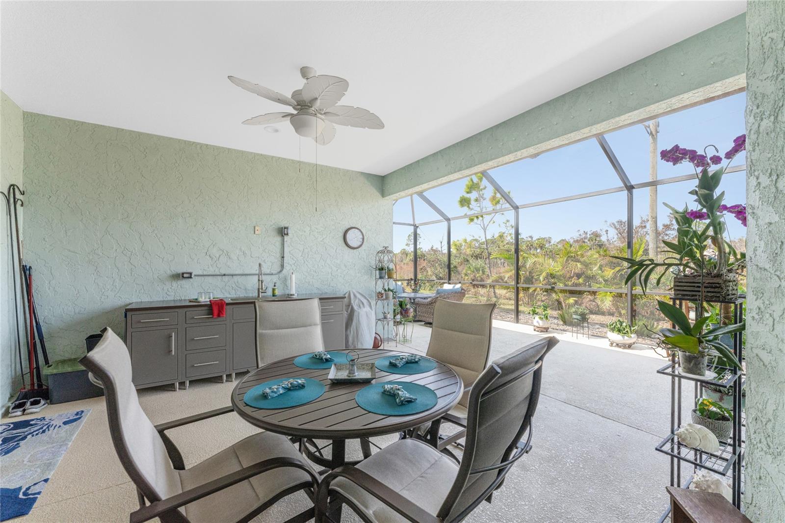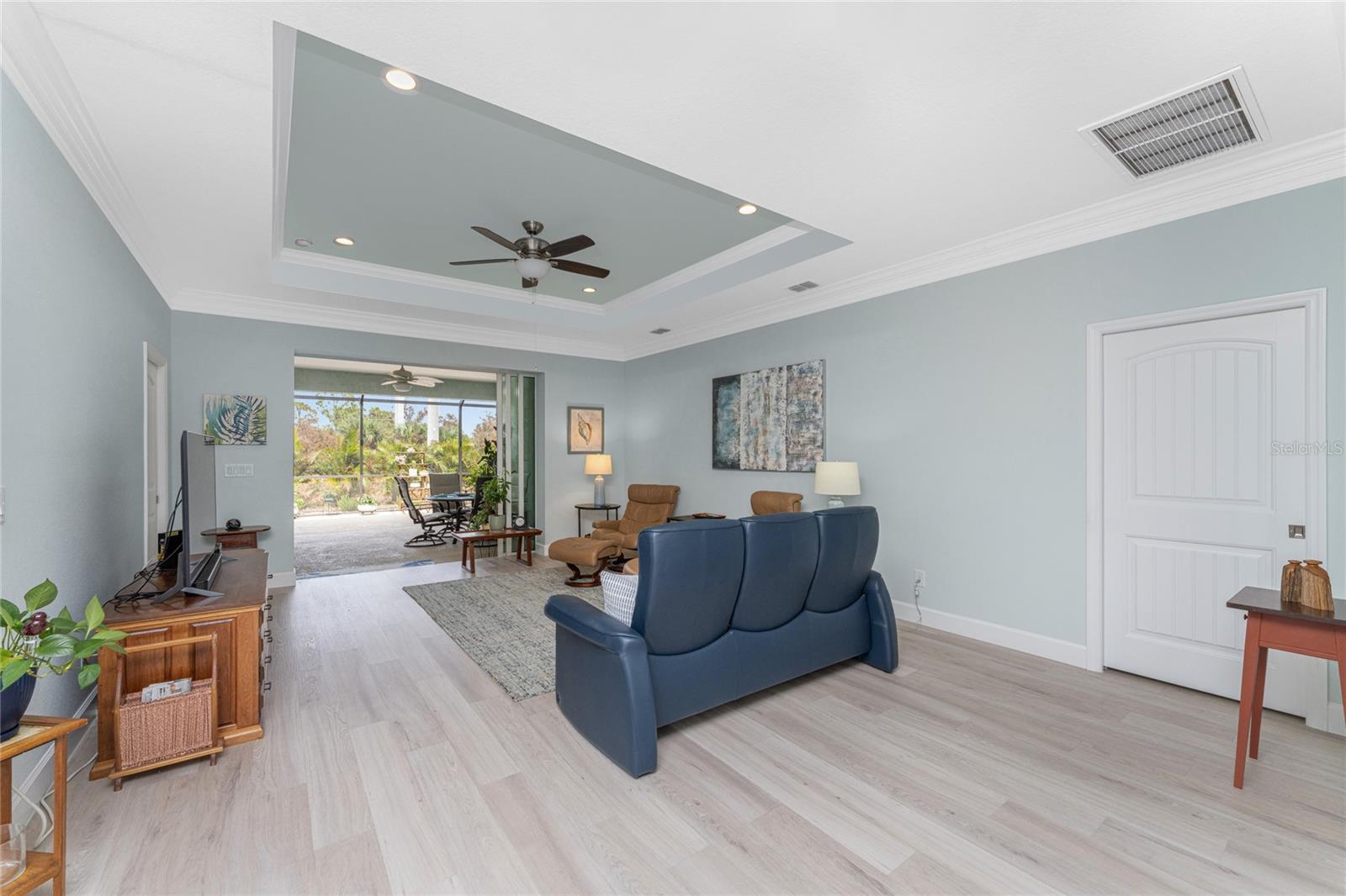 WHY BUILD OR BUY NEW? This 3 bedroom, 2 bath, 2 car garage home has so many upgrades that if you build, will cost you $1000's of dollars extra! Luxury Vinyl Plank flooring through out, crown molding in all major rooms, upgraded kitchen appliances, screened entry with pavers, extended screened lanai area, USB'S in some outlets, Impact windows and doors and so much more!!! Popular Pearl floor plan features a spacious Living area with a tray ceiling with a ceiling fan and pocket sliding doors to the lanai! Adjacent dining area is spacious with plenty of room for entertaining! Kitchen has upgraded Quartz counter tops, upgraded composite sink, pretty backsplash, closet pantry, breakfast bar, ceiling fan and a dinette area with additional cabinetry added for plenty of storage! Appliances include: GE Kitchen Hub Entertainment and Ventilation System, GE Cafe French door refrigerator, GE Cafe microwave, GE Cafe built in oven, GE Cafe dishwasher and GE Profile induction range! Main bedroom has a tray ceiling with crown molding and a ceiling fan, walk in closet with built ins, separate office/den area and another set of sliding glass doors to the lanai!! Main bath has a double vanity with upgraded Quartz top, added cabinetry for lots of storage, Oversized shower with door, privacy commode area and a linen closet. Bedrooms #2 and #3 have ceiling fans and wall closets. The adjacent Guest bath is handily located in between the Guest bedrooms, and features upgraded wood vanity with solid surface countertop, Shower with door (shower walls are tiled to the ceiling, so no wet drywall!) and linen closet. Pocket door to the guest bedrooms adds extra privacy for your guests! Laundry room has a pocket door for access, GE front load washer and dryer, utility tub, and extra cabinetry above for extra storage. The screened lanai has a ceiling fan, OUTDOOR KITCHEN with built in sink with water and electric, perfect for outdoor entertaining! The CAGED AREA has been dramatically increased, so there's plenty of outdoor living area for a firepit, plants, hot tub or whatever you choose!. The 2 car garage has an automatic garage door and pull down stairs for extra storage in the attic! The beautiful tropical landscaping adds to this amazing home. This is a special home and you would do well to call it your Florida paradise! This home is located in one of Englewood's favorite communities, with great amenities such as: clubhouse, pool, tennis/pickleball courts, RV/Boat Parking, and more activities than you could possibly take advantage of! Come take a tour today!