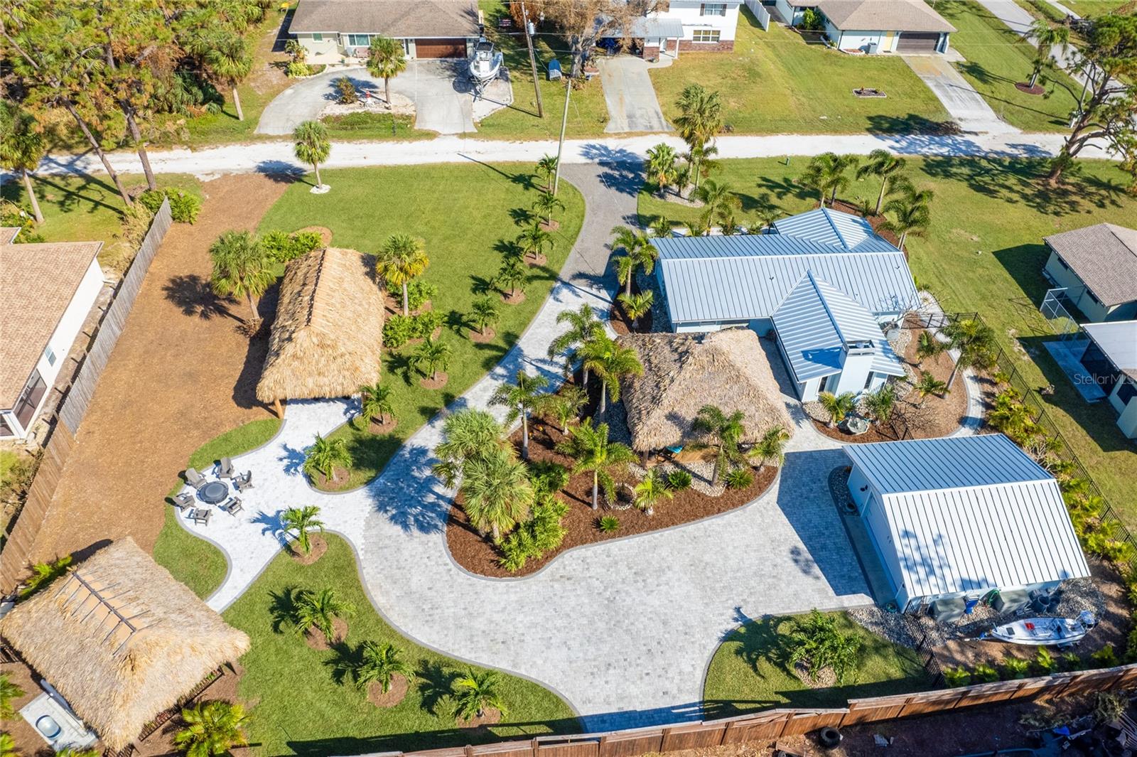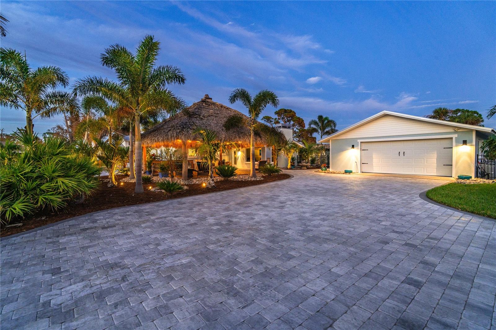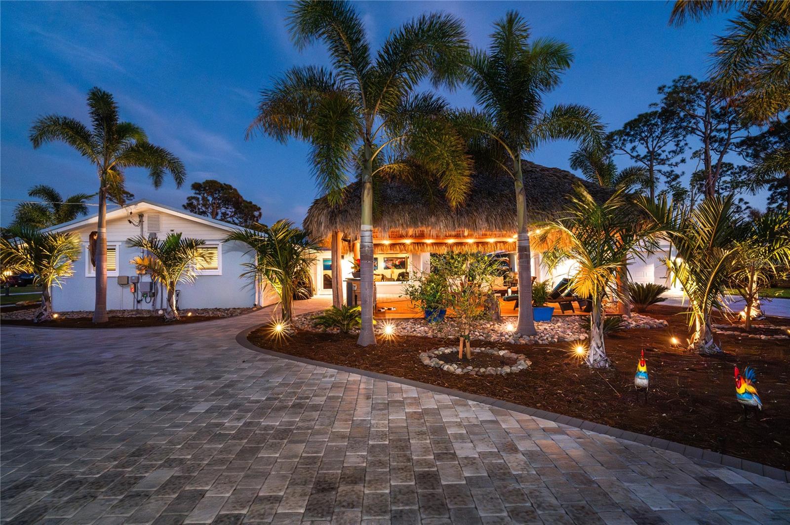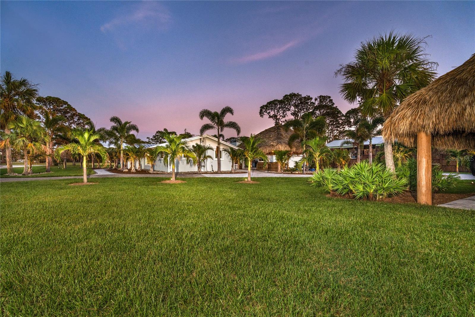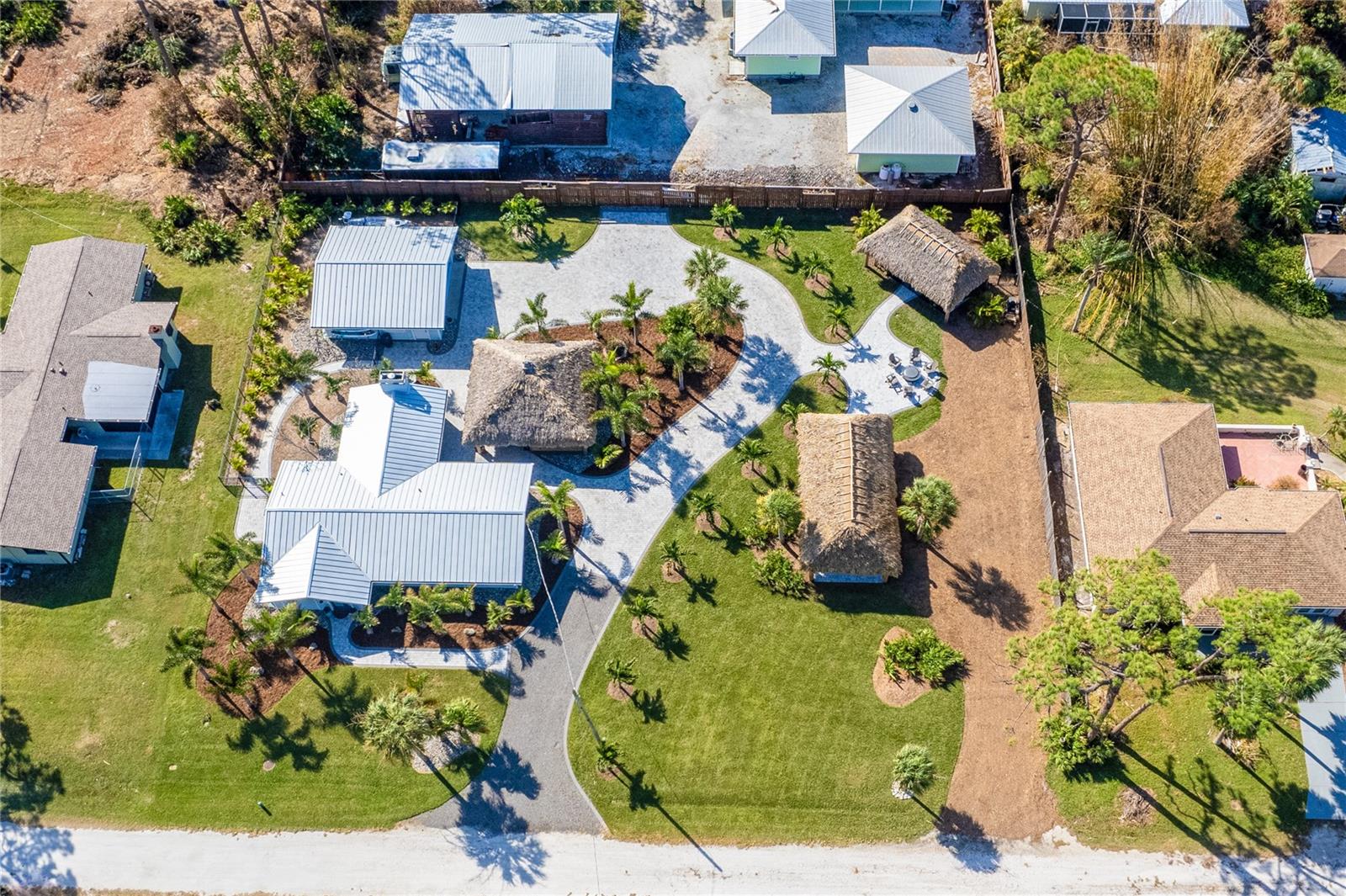 Welcome to an unparalleled sanctuary of luxury upgrades—this extraordinary 3-bedroom, 2-bathroom Florida estate redefines sophistication and leisure, nestled on over half an acre of meticulously landscaped grounds. Crafted for the discerning homeowner, this private retreat boasts an expansive outdoor oasis with three stunning Tiki Huts, perfect for hosting lavish gatherings, unwinding in the serene spa area, or accommodating your recreational toys in style. For peace of mind, this property has never experienced flooding or hurricane damage and is further protected by the nearby Lemon Bay Park. The estate's exquisite outdoor space continues with a detached 25’x25’ garage, featuring an air-conditioned office, granite countertops, and a whole-house attic fan, ensuring year-round comfort. For your convenience, the property also includes a 50-amp RV hookup, and elegantly paved driveways and walkways that weave through the lush tropical landscape. Uncompromising in its attention to detail, this estate offers state-of-the-art HURRICANE IMPACT WINDOWS AND DOORS on both the home and the garage, complemented by stunning landscape lighting, commercial-grade gutters, and a show-stopping 2023 COMMERCIAL GRADE STANDING SEAM ALUMINUM ROOF. The exterior finishes are further elevated by custom smooth stucco, Azek fascia and soffits, and luxurious tropical foliage including foxtail palms, Christmas palms, lime trees, and plumeria. For the ultimate outdoor entertaining experience, a marine-grade kitchen awaits, fully equipped with two beverage refrigerators, a sink, and weather-resistant materials, creating a seamless flow between indoor and outdoor living. Step inside to a world of refined elegance, where every detail has been curated for modern luxury. Porcelain tile floors extend throughout the home, paired with plantation shutters, shiplap walls and ceilings, and bespoke barn doors on all closets. The family room's centerpiece, a stunning Virginia ledgestone wood-burning fireplace, radiates warmth and charm, while the gourmet kitchen is a chef’s dream, featuring top-of-the-line Bosch stainless steel appliances, leather overlay granite countertops, a farmhouse-style stainless steel sink, and custom wood cabinetry. No stone has been left unturned in this estate’s design—from the custom barn doors to the air-conditioned garage that doubles as a functional office space. The fully automated irrigation system ensures your St. Augustine grass and tropical gardens remain lush year-round. Additionally, the estate’s "X" flood zone designation offers peace of mind for both the home and detached garage. Whether you're basking under the tranquil Tiki Huts, soaking in the spa, or hosting lavish outdoor soirées, this extraordinary estate is a masterpiece of elegance, privacy, and natural beauty. Truly a one-of-a-kind Florida oasis, it offers a lifestyle defined by comfort, grandeur, and thoughtful craftsmanship at every turn. This fabulous location offers convenient access to Downtown Englewood and Dearborn Street, just 5 minutes from the pristine beaches and a short walk to the scenic Lemon Bay Park. Leave the car at home and cruise around in your street-legal golf cart, exploring all the wonderful spots in our charming community.