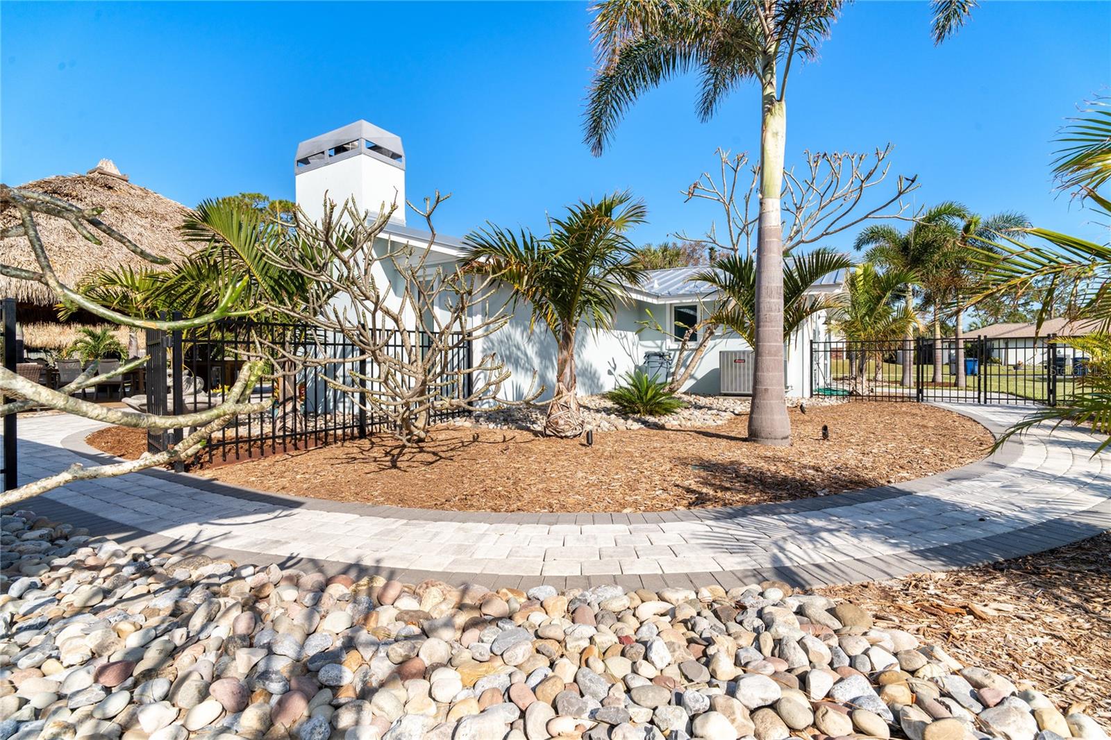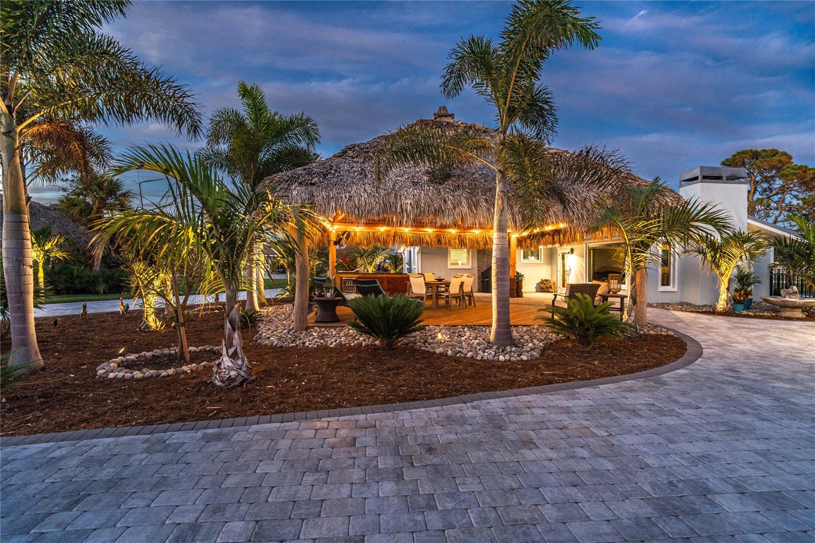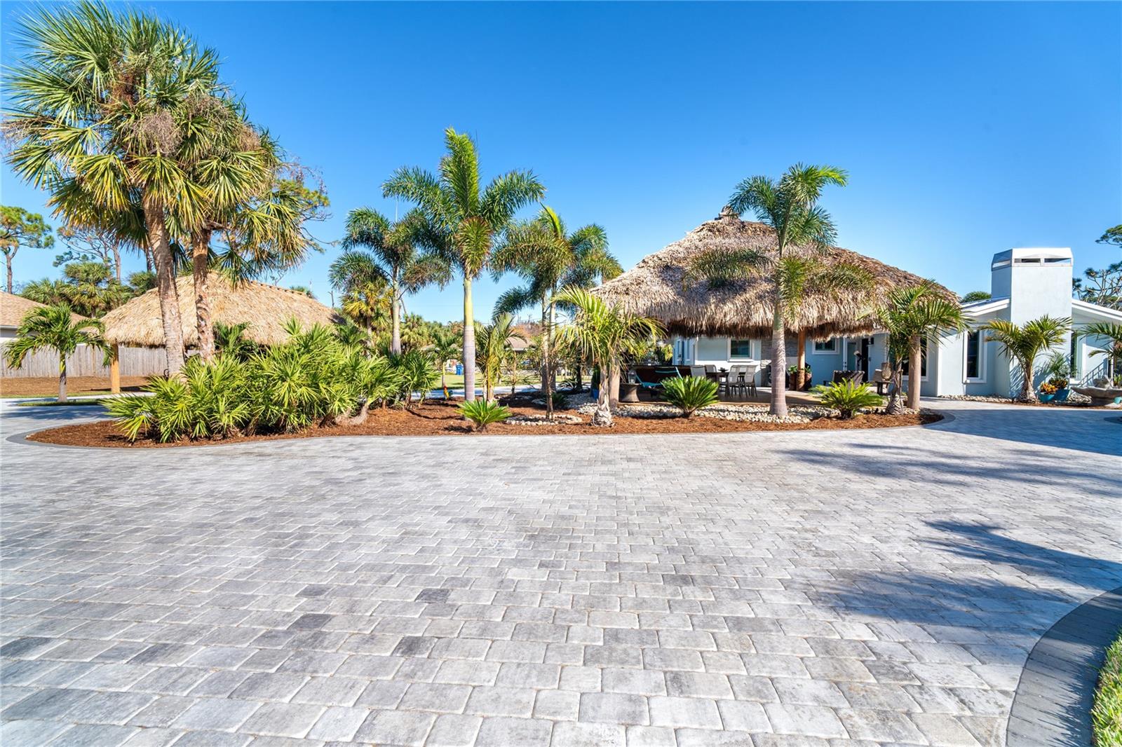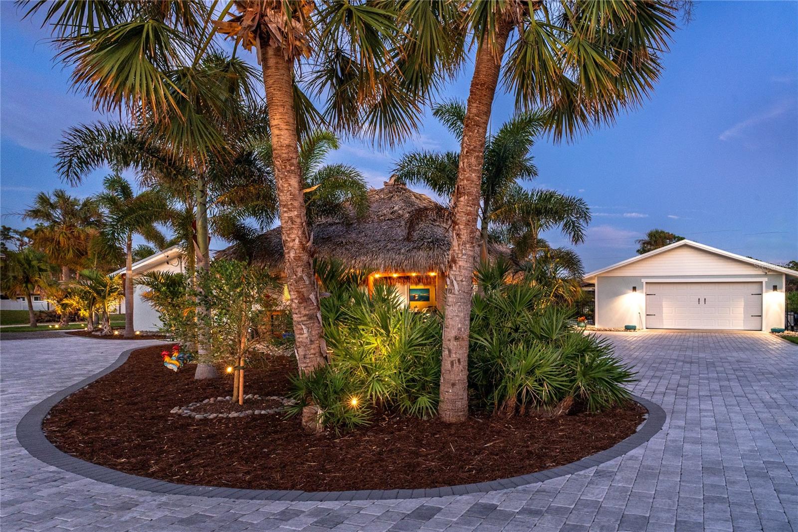 Welcome to an unparalleled sanctuary of luxury upgrades—this extraordinary 3-bedroom, 2-bathroom Florida estate redefines sophistication and leisure, nestled on over half an acre of meticulously landscaped grounds. Crafted for the discerning homeowner, this private retreat boasts an expansive outdoor oasis with three stunning Tiki Huts, perfect for hosting lavish gatherings, unwinding in the serene spa area, or accommodating your recreational toys in style. For peace of mind, this property has never experienced flooding or hurricane damage and is further protected by the nearby Lemon Bay Park. The estate's exquisite outdoor space continues with a detached 25’x25’ garage, featuring an air-conditioned office, granite countertops, and a whole-house attic fan, ensuring year-round comfort. For your convenience, the property also includes a 50-amp RV hookup, and elegantly paved driveways and walkways that weave through the lush tropical landscape. Uncompromising in its attention to detail, this estate offers state-of-the-art HURRICANE IMPACT WINDOWS AND DOORS on both the home and the garage, complemented by stunning landscape lighting, commercial-grade gutters, and a show-stopping 2023 COMMERCIAL GRADE STANDING SEAM ALUMINUM ROOF. The exterior finishes are further elevated by custom smooth stucco, Azek fascia and soffits, and luxurious tropical foliage including foxtail palms, Christmas palms, lime trees, and plumeria. For the ultimate outdoor entertaining experience, a marine-grade kitchen awaits, fully equipped with two beverage refrigerators, a sink, and weather-resistant materials, creating a seamless flow between indoor and outdoor living. Step inside to a world of refined elegance, where every detail has been curated for modern luxury. Porcelain tile floors extend throughout the home, paired with plantation shutters, shiplap walls and ceilings, and bespoke barn doors on all closets. The family room's centerpiece, a stunning Virginia ledgestone wood-burning fireplace, radiates warmth and charm, while the gourmet kitchen is a chef’s dream, featuring top-of-the-line Bosch stainless steel appliances, leather overlay granite countertops, a farmhouse-style stainless steel sink, and custom wood cabinetry. No stone has been left unturned in this estate’s design—from the custom barn doors to the air-conditioned garage that doubles as a functional office space. The fully automated irrigation system ensures your St. Augustine grass and tropical gardens remain lush year-round. Additionally, the estate’s "X" flood zone designation offers peace of mind for both the home and detached garage. Whether you're basking under the tranquil Tiki Huts, soaking in the spa, or hosting lavish outdoor soirées, this extraordinary estate is a masterpiece of elegance, privacy, and natural beauty. Truly a one-of-a-kind Florida oasis, it offers a lifestyle defined by comfort, grandeur, and thoughtful craftsmanship at every turn. This fabulous location offers convenient access to Downtown Englewood and Dearborn Street, just 5 minutes from the pristine beaches and a short walk to the scenic Lemon Bay Park. Leave the car at home and cruise around in your street-legal golf cart, exploring all the wonderful spots in our charming community.