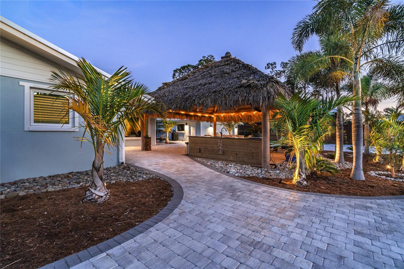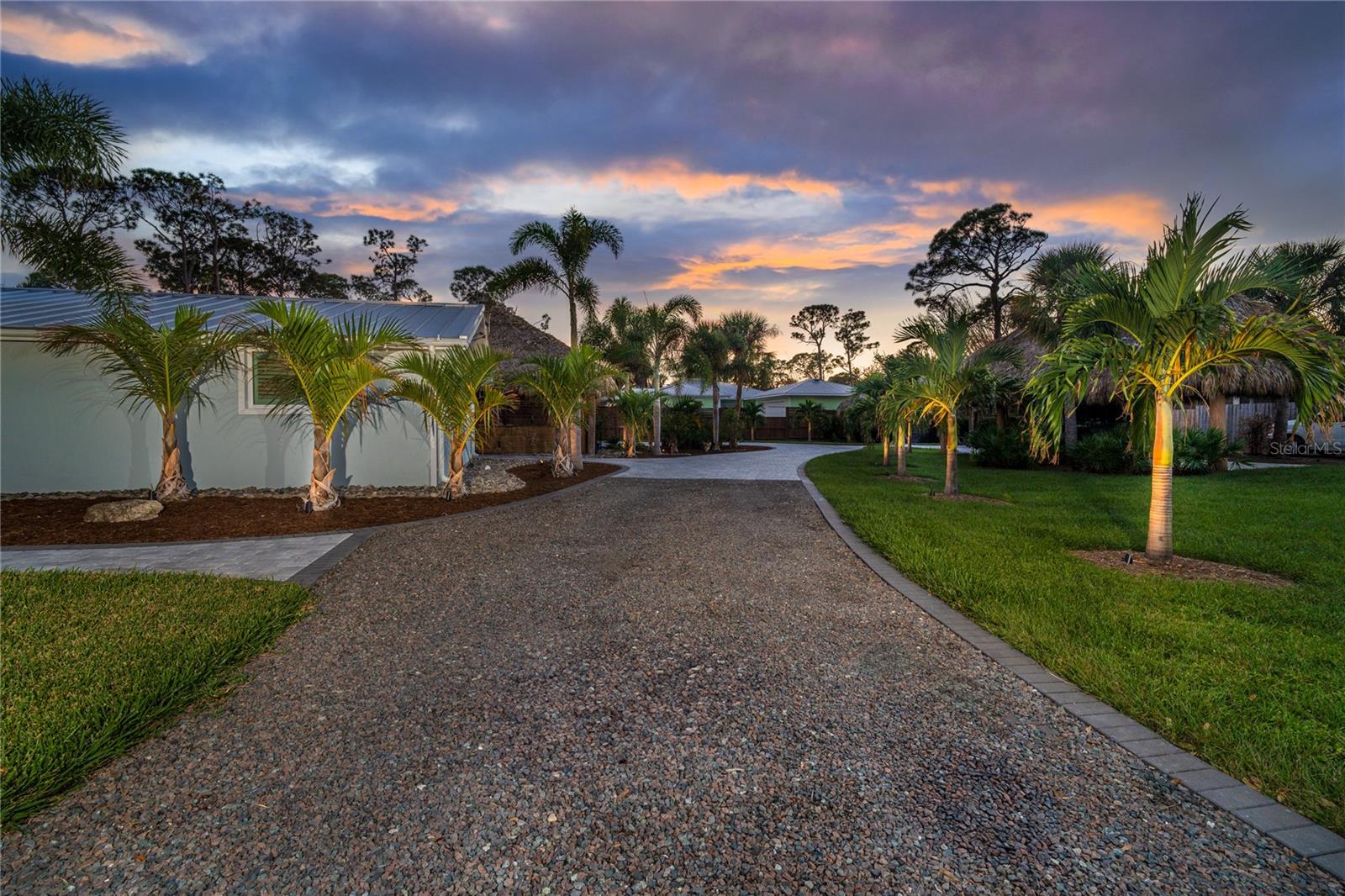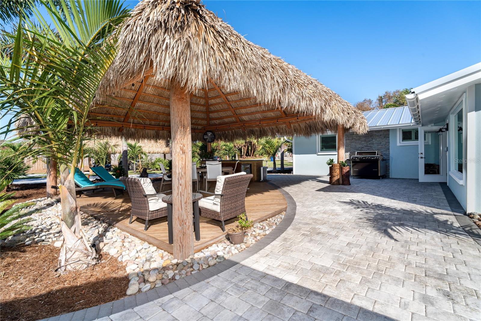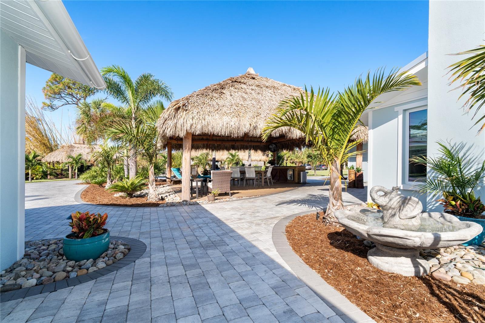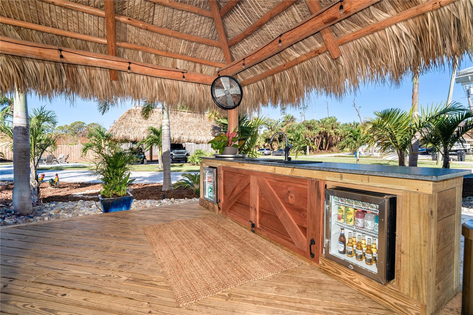 Welcome to an unparalleled sanctuary of luxury upgrades—this extraordinary 3-bedroom, 2-bathroom Florida estate redefines sophistication and leisure, nestled on over half an acre of meticulously landscaped grounds. Crafted for the discerning homeowner, this private retreat boasts an expansive outdoor oasis with three stunning Tiki Huts, perfect for hosting lavish gatherings, unwinding in the serene spa area, or accommodating your recreational toys in style. For peace of mind, this property has never experienced flooding or hurricane damage and is further protected by the nearby Lemon Bay Park. The estate's exquisite outdoor space continues with a detached 25’x25’ garage, featuring an air-conditioned office, granite countertops, and a whole-house attic fan, ensuring year-round comfort. For your convenience, the property also includes a 50-amp RV hookup, and elegantly paved driveways and walkways that weave through the lush tropical landscape. Uncompromising in its attention to detail, this estate offers state-of-the-art HURRICANE IMPACT WINDOWS AND DOORS on both the home and the garage, complemented by stunning landscape lighting, commercial-grade gutters, and a show-stopping 2023 COMMERCIAL GRADE STANDING SEAM ALUMINUM ROOF. The exterior finishes are further elevated by custom smooth stucco, Azek fascia and soffits, and luxurious tropical foliage including foxtail palms, Christmas palms, lime trees, and plumeria. For the ultimate outdoor entertaining experience, a marine-grade kitchen awaits, fully equipped with two beverage refrigerators, a sink, and weather-resistant materials, creating a seamless flow between indoor and outdoor living. Step inside to a world of refined elegance, where every detail has been curated for modern luxury. Porcelain tile floors extend throughout the home, paired with plantation shutters, shiplap walls and ceilings, and bespoke barn doors on all closets. The family room's centerpiece, a stunning Virginia ledgestone wood-burning fireplace, radiates warmth and charm, while the gourmet kitchen is a chef’s dream, featuring top-of-the-line Bosch stainless steel appliances, leather overlay granite countertops, a farmhouse-style stainless steel sink, and custom wood cabinetry. No stone has been left unturned in this estate’s design—from the custom barn doors to the air-conditioned garage that doubles as a functional office space. The fully automated irrigation system ensures your St. Augustine grass and tropical gardens remain lush year-round. Additionally, the estate’s "X" flood zone designation offers peace of mind for both the home and detached garage. Whether you're basking under the tranquil Tiki Huts, soaking in the spa, or hosting lavish outdoor soirées, this extraordinary estate is a masterpiece of elegance, privacy, and natural beauty. Truly a one-of-a-kind Florida oasis, it offers a lifestyle defined by comfort, grandeur, and thoughtful craftsmanship at every turn. This fabulous location offers convenient access to Downtown Englewood and Dearborn Street, just 5 minutes from the pristine beaches and a short walk to the scenic Lemon Bay Park. Leave the car at home and cruise around in your street-legal golf cart, exploring all the wonderful spots in our charming community.