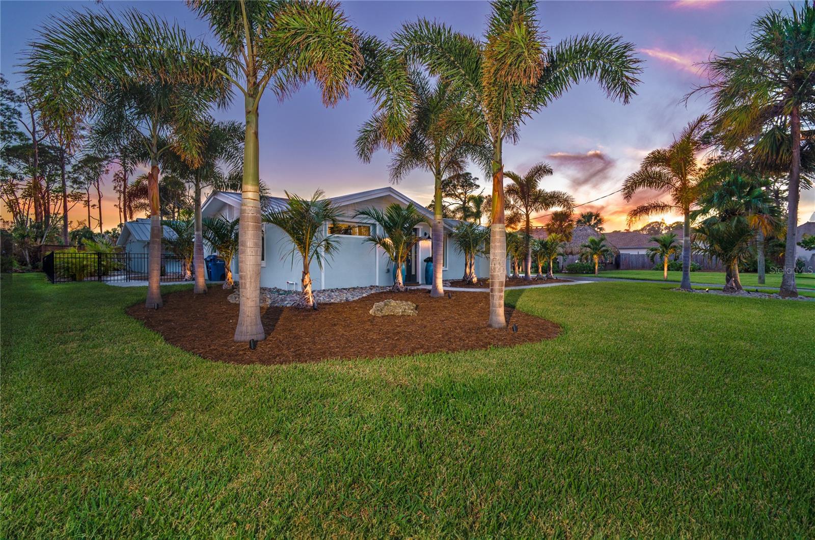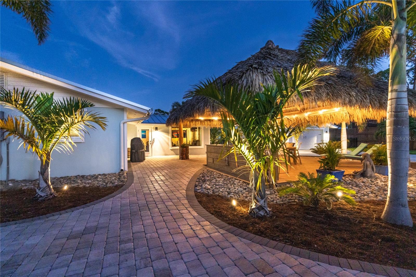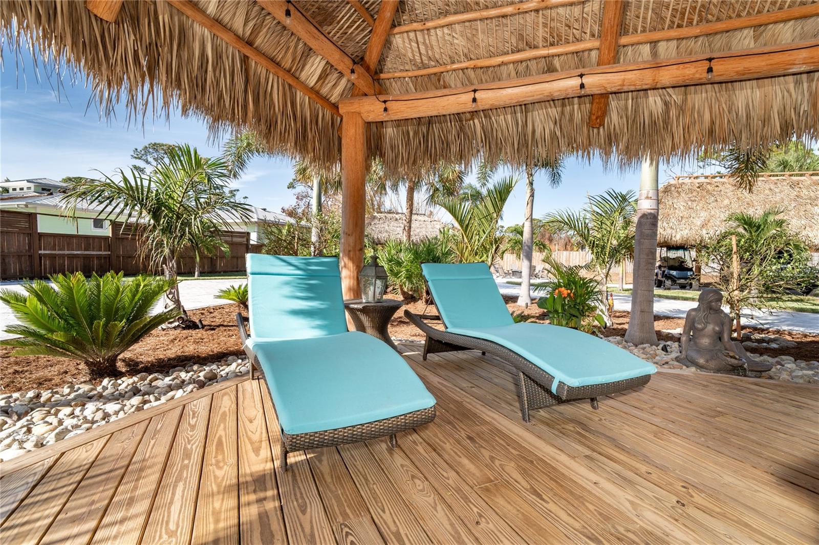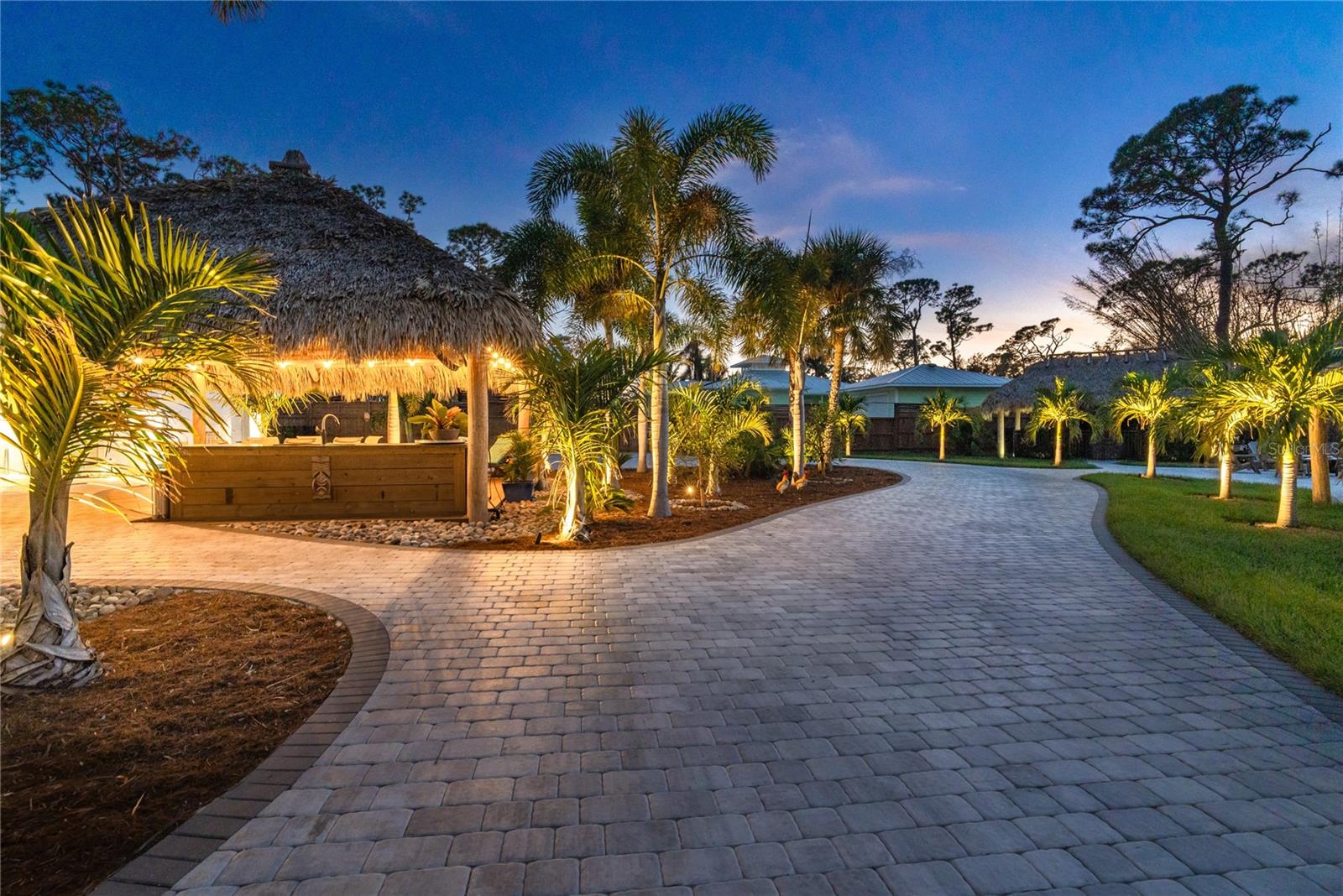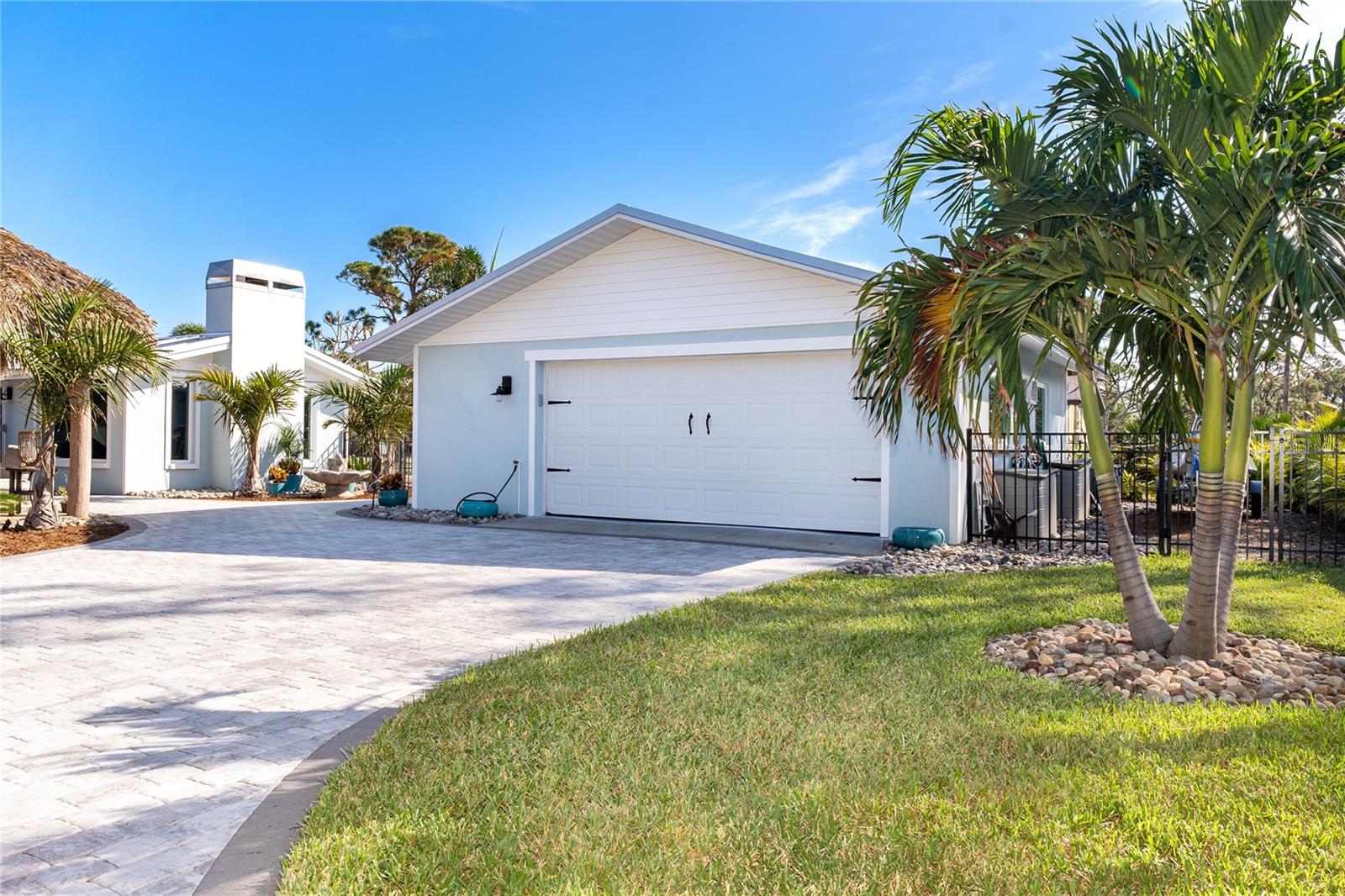 Welcome to an unparalleled sanctuary of luxury upgrades—this extraordinary 3-bedroom, 2-bathroom Florida estate redefines sophistication and leisure, nestled on over half an acre of meticulously landscaped grounds. Crafted for the discerning homeowner, this private retreat boasts an expansive outdoor oasis with three stunning Tiki Huts, perfect for hosting lavish gatherings, unwinding in the serene spa area, or accommodating your recreational toys in style. For peace of mind, this property has never experienced flooding or hurricane damage and is further protected by the nearby Lemon Bay Park. The estate's exquisite outdoor space continues with a detached 25’x25’ garage, featuring an air-conditioned office, granite countertops, and a whole-house attic fan, ensuring year-round comfort. For your convenience, the property also includes a 50-amp RV hookup, and elegantly paved driveways and walkways that weave through the lush tropical landscape. Uncompromising in its attention to detail, this estate offers state-of-the-art HURRICANE IMPACT WINDOWS AND DOORS on both the home and the garage, complemented by stunning landscape lighting, commercial-grade gutters, and a show-stopping 2023 COMMERCIAL GRADE STANDING SEAM ALUMINUM ROOF. The exterior finishes are further elevated by custom smooth stucco, Azek fascia and soffits, and luxurious tropical foliage including foxtail palms, Christmas palms, lime trees, and plumeria. For the ultimate outdoor entertaining experience, a marine-grade kitchen awaits, fully equipped with two beverage refrigerators, a sink, and weather-resistant materials, creating a seamless flow between indoor and outdoor living. Step inside to a world of refined elegance, where every detail has been curated for modern luxury. Porcelain tile floors extend throughout the home, paired with plantation shutters, shiplap walls and ceilings, and bespoke barn doors on all closets. The family room's centerpiece, a stunning Virginia ledgestone wood-burning fireplace, radiates warmth and charm, while the gourmet kitchen is a chef’s dream, featuring top-of-the-line Bosch stainless steel appliances, leather overlay granite countertops, a farmhouse-style stainless steel sink, and custom wood cabinetry. No stone has been left unturned in this estate’s design—from the custom barn doors to the air-conditioned garage that doubles as a functional office space. The fully automated irrigation system ensures your St. Augustine grass and tropical gardens remain lush year-round. Additionally, the estate’s "X" flood zone designation offers peace of mind for both the home and detached garage. Whether you're basking under the tranquil Tiki Huts, soaking in the spa, or hosting lavish outdoor soirées, this extraordinary estate is a masterpiece of elegance, privacy, and natural beauty. Truly a one-of-a-kind Florida oasis, it offers a lifestyle defined by comfort, grandeur, and thoughtful craftsmanship at every turn. This fabulous location offers convenient access to Downtown Englewood and Dearborn Street, just 5 minutes from the pristine beaches and a short walk to the scenic Lemon Bay Park. Leave the car at home and cruise around in your street-legal golf cart, exploring all the wonderful spots in our charming community.