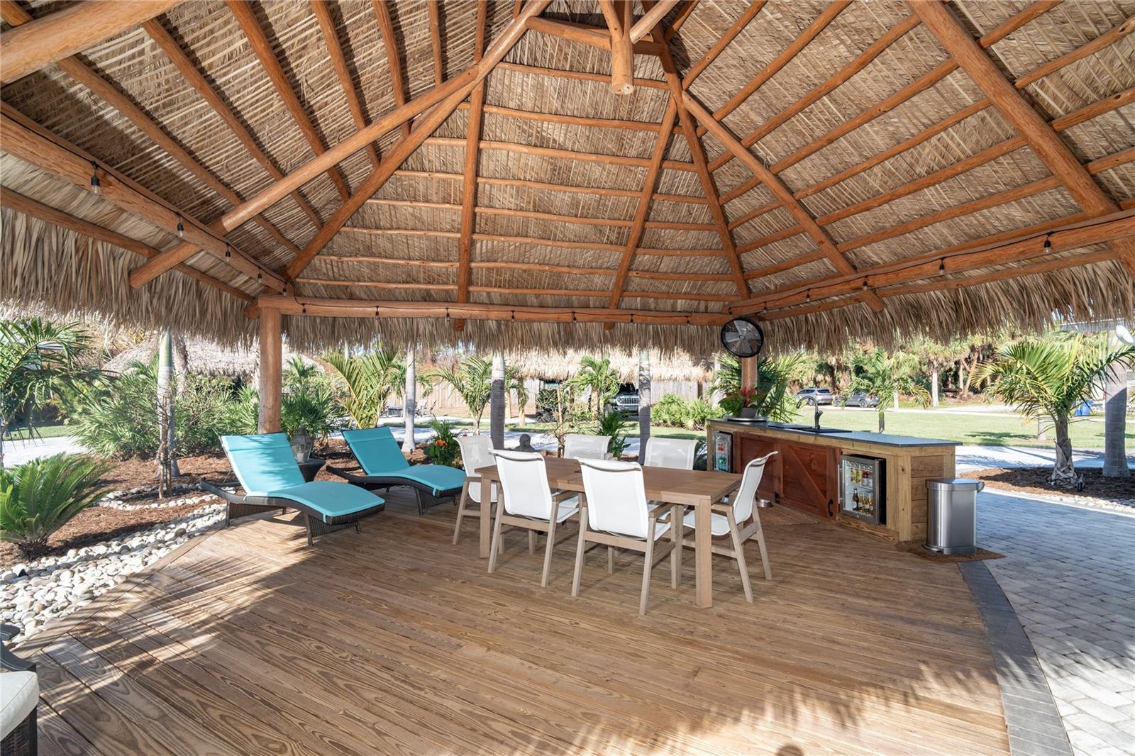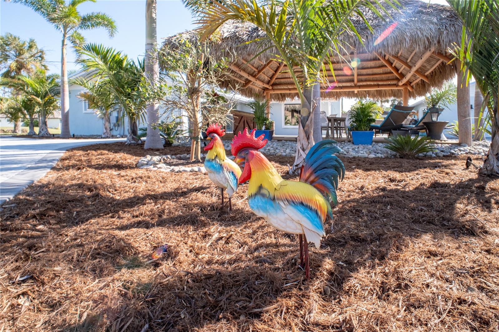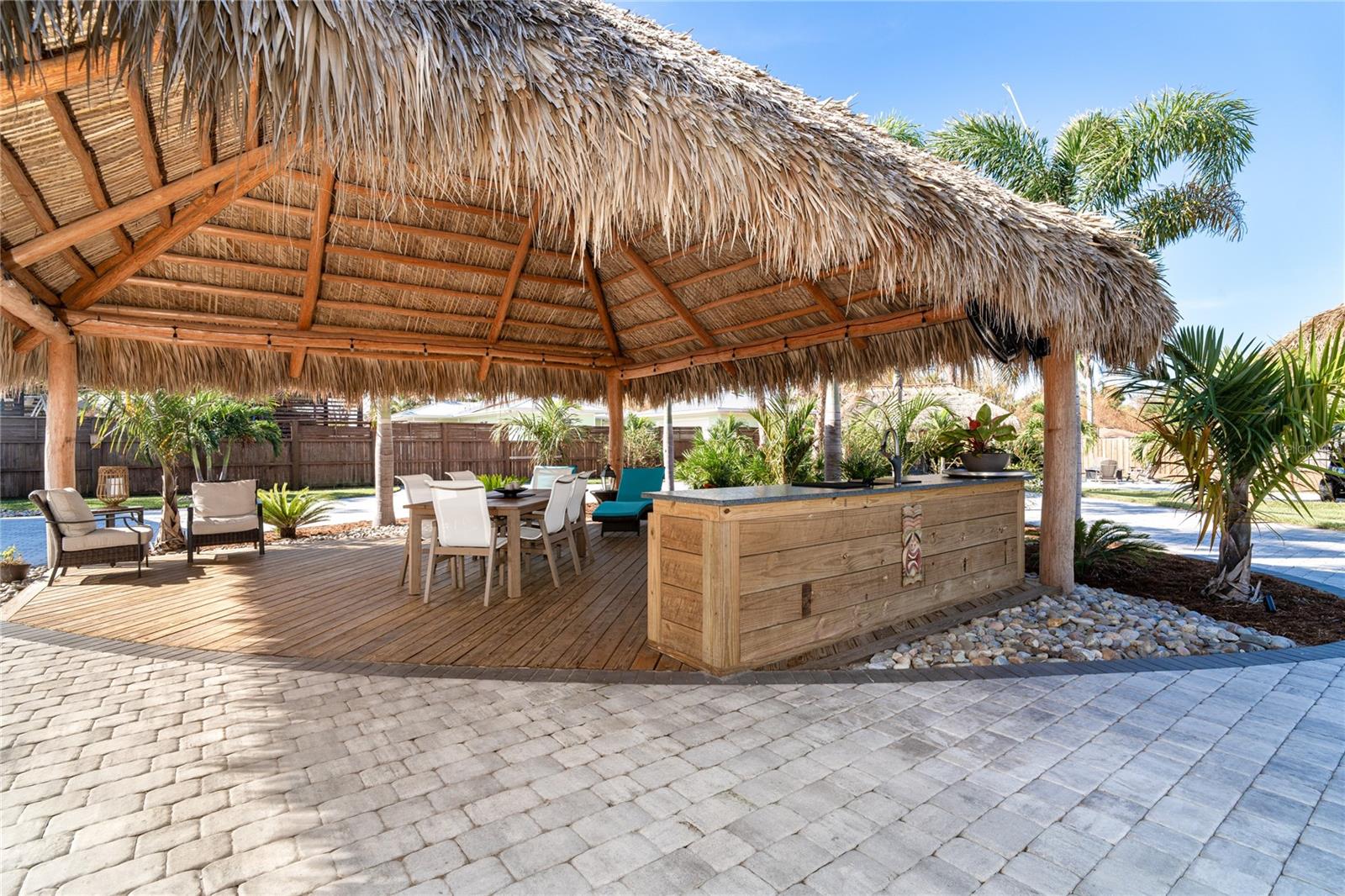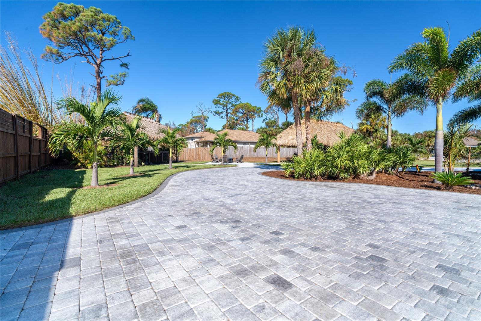 Welcome to an unparalleled sanctuary of luxury upgrades—this extraordinary 3-bedroom, 2-bathroom Florida estate redefines sophistication and leisure, nestled on over half an acre of meticulously landscaped grounds. Crafted for the discerning homeowner, this private retreat boasts an expansive outdoor oasis with three stunning Tiki Huts, perfect for hosting lavish gatherings, unwinding in the serene spa area, or accommodating your recreational toys in style. For peace of mind, this property has never experienced flooding or hurricane damage and is further protected by the nearby Lemon Bay Park. The estate's exquisite outdoor space continues with a detached 25’x25’ garage, featuring an air-conditioned office, granite countertops, and a whole-house attic fan, ensuring year-round comfort. For your convenience, the property also includes a 50-amp RV hookup, and elegantly paved driveways and walkways that weave through the lush tropical landscape. Uncompromising in its attention to detail, this estate offers state-of-the-art HURRICANE IMPACT WINDOWS AND DOORS on both the home and the garage, complemented by stunning landscape lighting, commercial-grade gutters, and a show-stopping 2023 COMMERCIAL GRADE STANDING SEAM ALUMINUM ROOF. The exterior finishes are further elevated by custom smooth stucco, Azek fascia and soffits, and luxurious tropical foliage including foxtail palms, Christmas palms, lime trees, and plumeria. For the ultimate outdoor entertaining experience, a marine-grade kitchen awaits, fully equipped with two beverage refrigerators, a sink, and weather-resistant materials, creating a seamless flow between indoor and outdoor living. Step inside to a world of refined elegance, where every detail has been curated for modern luxury. Porcelain tile floors extend throughout the home, paired with plantation shutters, shiplap walls and ceilings, and bespoke barn doors on all closets. The family room's centerpiece, a stunning Virginia ledgestone wood-burning fireplace, radiates warmth and charm, while the gourmet kitchen is a chef’s dream, featuring top-of-the-line Bosch stainless steel appliances, leather overlay granite countertops, a farmhouse-style stainless steel sink, and custom wood cabinetry. No stone has been left unturned in this estate’s design—from the custom barn doors to the air-conditioned garage that doubles as a functional office space. The fully automated irrigation system ensures your St. Augustine grass and tropical gardens remain lush year-round. Additionally, the estate’s "X" flood zone designation offers peace of mind for both the home and detached garage. Whether you're basking under the tranquil Tiki Huts, soaking in the spa, or hosting lavish outdoor soirées, this extraordinary estate is a masterpiece of elegance, privacy, and natural beauty. Truly a one-of-a-kind Florida oasis, it offers a lifestyle defined by comfort, grandeur, and thoughtful craftsmanship at every turn. This fabulous location offers convenient access to Downtown Englewood and Dearborn Street, just 5 minutes from the pristine beaches and a short walk to the scenic Lemon Bay Park. Leave the car at home and cruise around in your street-legal golf cart, exploring all the wonderful spots in our charming community.