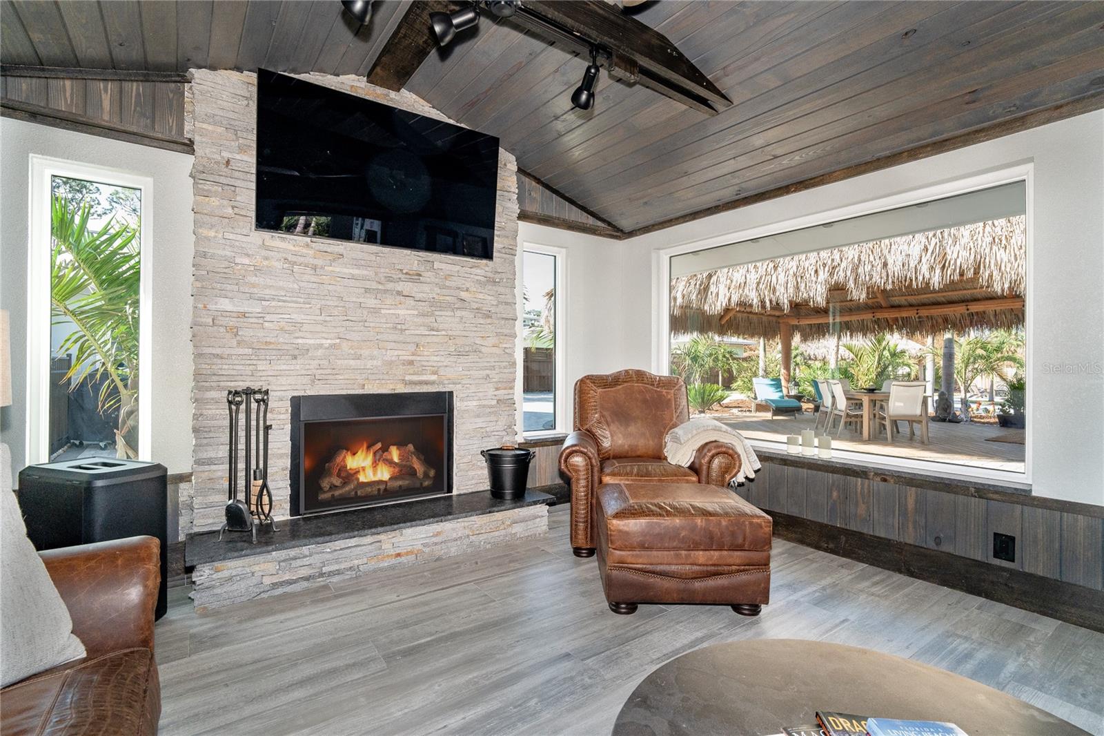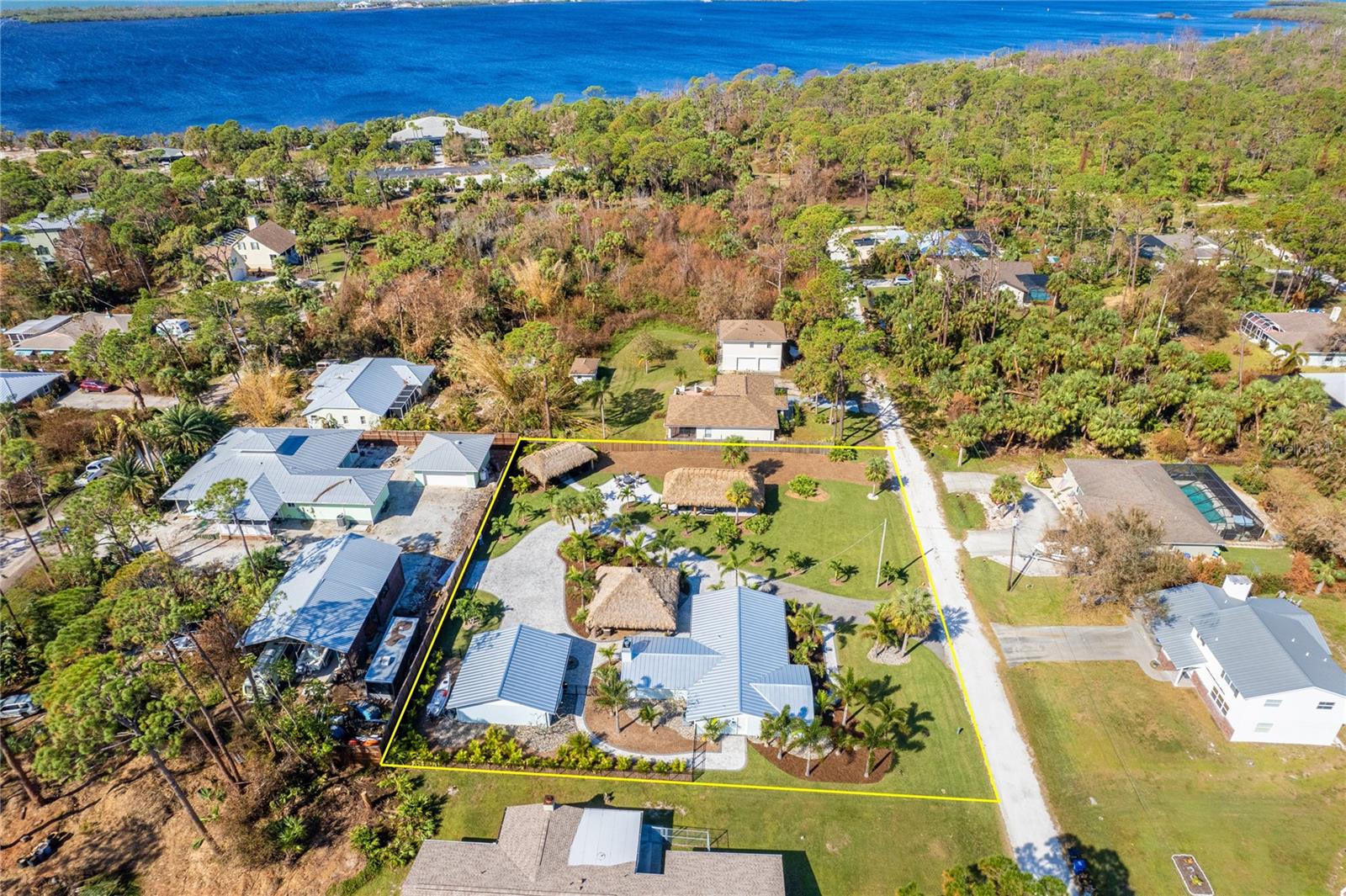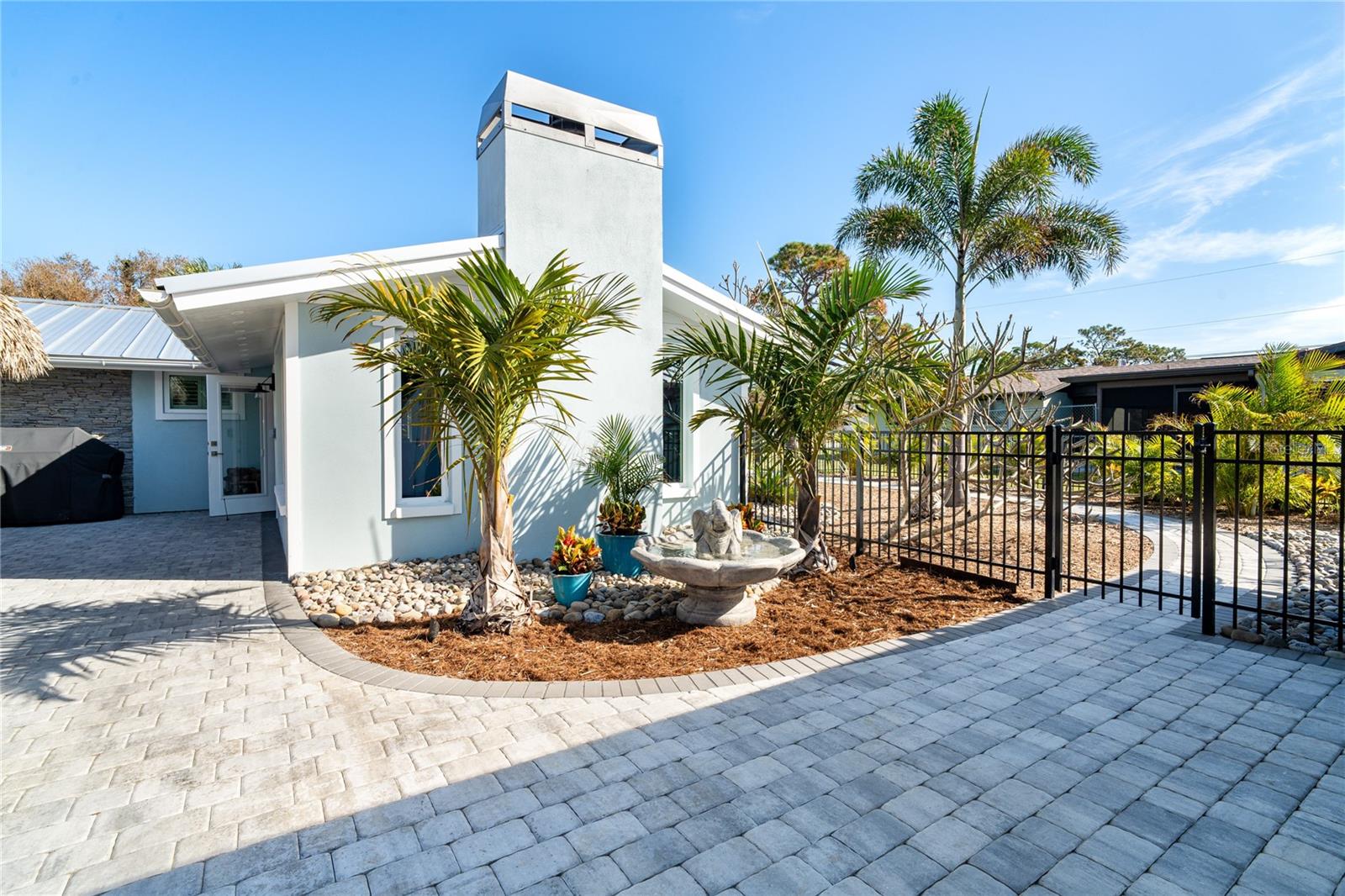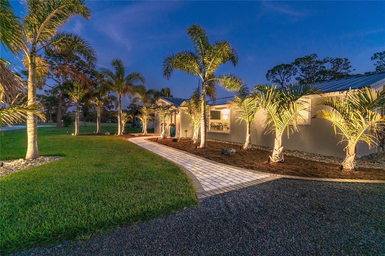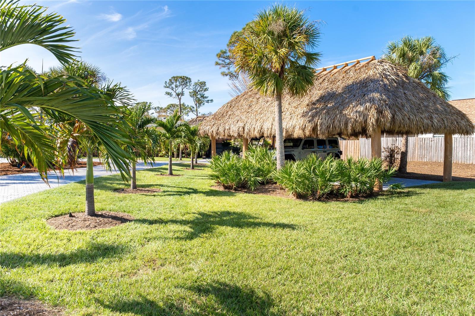 Welcome to an unparalleled sanctuary of luxury upgrades—this extraordinary 3-bedroom, 2-bathroom Florida estate redefines sophistication and leisure, nestled on over half an acre of meticulously landscaped grounds. Crafted for the discerning homeowner, this private retreat boasts an expansive outdoor oasis with three stunning Tiki Huts, perfect for hosting lavish gatherings, unwinding in the serene spa area, or accommodating your recreational toys in style. For peace of mind, this property has never experienced flooding or hurricane damage and is further protected by the nearby Lemon Bay Park. The estate's exquisite outdoor space continues with a detached 25’x25’ garage, featuring an air-conditioned office, granite countertops, and a whole-house attic fan, ensuring year-round comfort. For your convenience, the property also includes a 50-amp RV hookup, and elegantly paved driveways and walkways that weave through the lush tropical landscape. Uncompromising in its attention to detail, this estate offers state-of-the-art HURRICANE IMPACT WINDOWS AND DOORS on both the home and the garage, complemented by stunning landscape lighting, commercial-grade gutters, and a show-stopping 2023 COMMERCIAL GRADE STANDING SEAM ALUMINUM ROOF. The exterior finishes are further elevated by custom smooth stucco, Azek fascia and soffits, and luxurious tropical foliage including foxtail palms, Christmas palms, lime trees, and plumeria. For the ultimate outdoor entertaining experience, a marine-grade kitchen awaits, fully equipped with two beverage refrigerators, a sink, and weather-resistant materials, creating a seamless flow between indoor and outdoor living. Step inside to a world of refined elegance, where every detail has been curated for modern luxury. Porcelain tile floors extend throughout the home, paired with plantation shutters, shiplap walls and ceilings, and bespoke barn doors on all closets. The family room's centerpiece, a stunning Virginia ledgestone wood-burning fireplace, radiates warmth and charm, while the gourmet kitchen is a chef’s dream, featuring top-of-the-line Bosch stainless steel appliances, leather overlay granite countertops, a farmhouse-style stainless steel sink, and custom wood cabinetry. No stone has been left unturned in this estate’s design—from the custom barn doors to the air-conditioned garage that doubles as a functional office space. The fully automated irrigation system ensures your St. Augustine grass and tropical gardens remain lush year-round. Additionally, the estate’s "X" flood zone designation offers peace of mind for both the home and detached garage. Whether you're basking under the tranquil Tiki Huts, soaking in the spa, or hosting lavish outdoor soirées, this extraordinary estate is a masterpiece of elegance, privacy, and natural beauty. Truly a one-of-a-kind Florida oasis, it offers a lifestyle defined by comfort, grandeur, and thoughtful craftsmanship at every turn. This fabulous location offers convenient access to Downtown Englewood and Dearborn Street, just 5 minutes from the pristine beaches and a short walk to the scenic Lemon Bay Park. Leave the car at home and cruise around in your street-legal golf cart, exploring all the wonderful spots in our charming community.