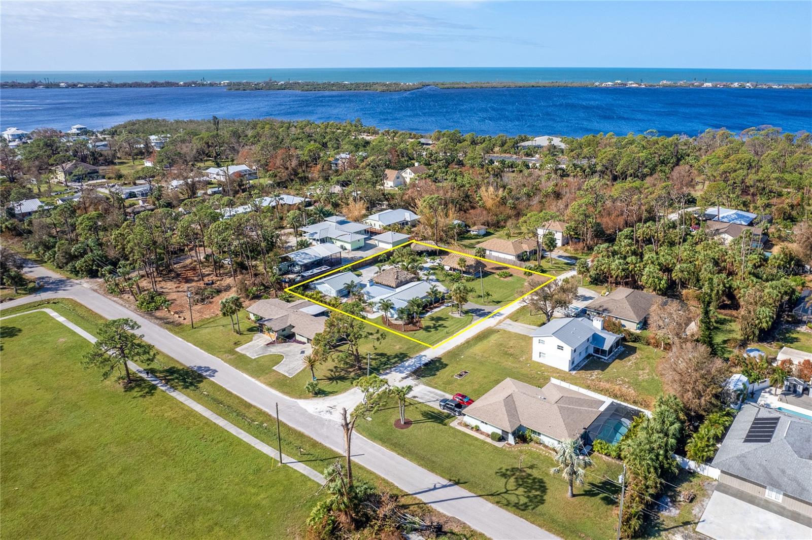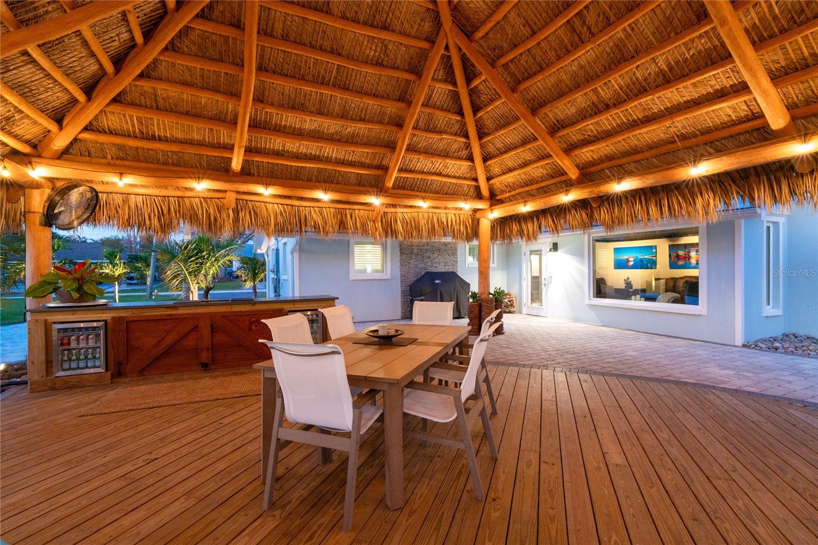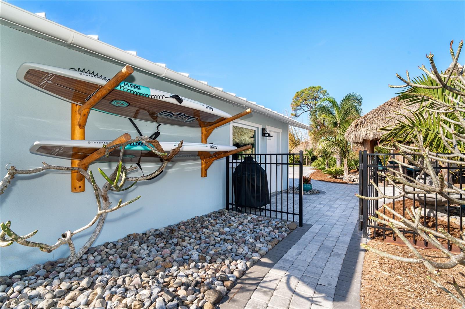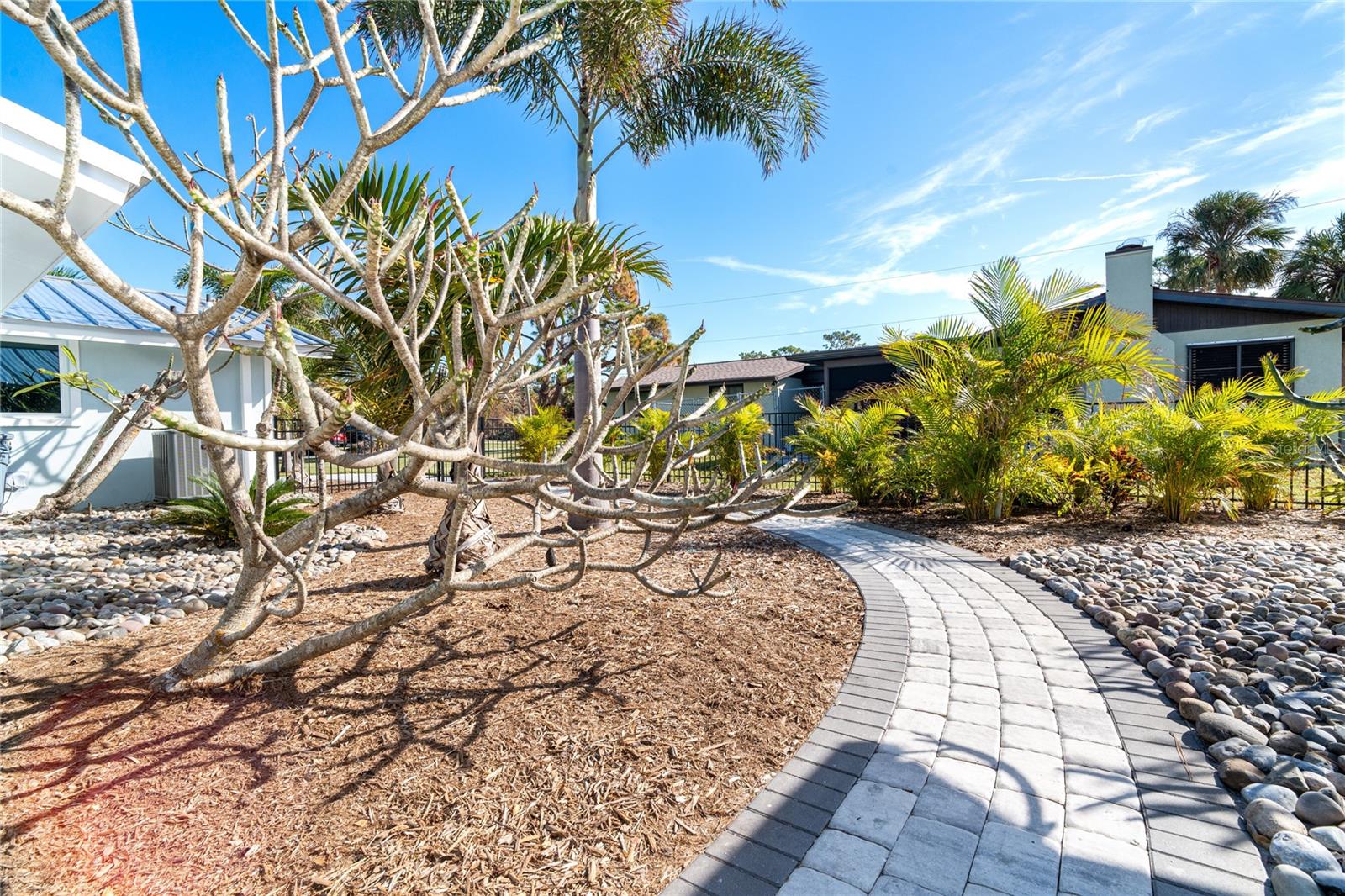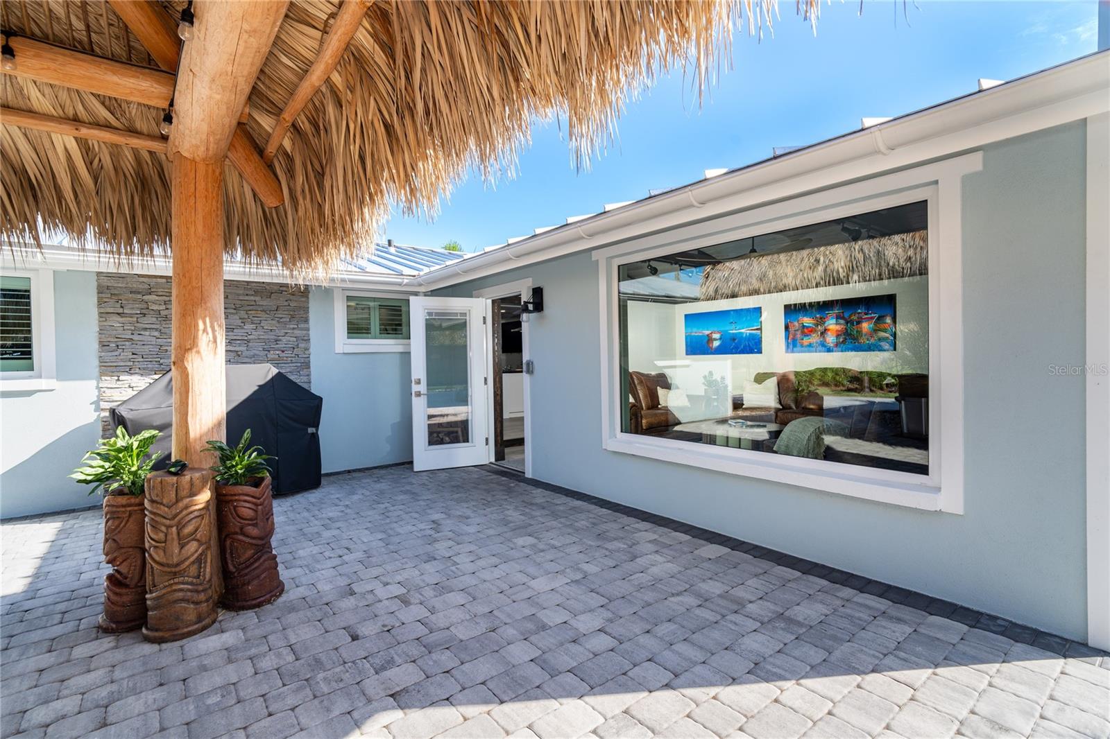 Welcome to an unparalleled sanctuary of luxury upgrades—this extraordinary 3-bedroom, 2-bathroom Florida estate redefines sophistication and leisure, nestled on over half an acre of meticulously landscaped grounds. Crafted for the discerning homeowner, this private retreat boasts an expansive outdoor oasis with three stunning Tiki Huts, perfect for hosting lavish gatherings, unwinding in the serene spa area, or accommodating your recreational toys in style. For peace of mind, this property has never experienced flooding or hurricane damage and is further protected by the nearby Lemon Bay Park. The estate's exquisite outdoor space continues with a detached 25’x25’ garage, featuring an air-conditioned office, granite countertops, and a whole-house attic fan, ensuring year-round comfort. For your convenience, the property also includes a 50-amp RV hookup, and elegantly paved driveways and walkways that weave through the lush tropical landscape. Uncompromising in its attention to detail, this estate offers state-of-the-art HURRICANE IMPACT WINDOWS AND DOORS on both the home and the garage, complemented by stunning landscape lighting, commercial-grade gutters, and a show-stopping 2023 COMMERCIAL GRADE STANDING SEAM ALUMINUM ROOF. The exterior finishes are further elevated by custom smooth stucco, Azek fascia and soffits, and luxurious tropical foliage including foxtail palms, Christmas palms, lime trees, and plumeria. For the ultimate outdoor entertaining experience, a marine-grade kitchen awaits, fully equipped with two beverage refrigerators, a sink, and weather-resistant materials, creating a seamless flow between indoor and outdoor living. Step inside to a world of refined elegance, where every detail has been curated for modern luxury. Porcelain tile floors extend throughout the home, paired with plantation shutters, shiplap walls and ceilings, and bespoke barn doors on all closets. The family room's centerpiece, a stunning Virginia ledgestone wood-burning fireplace, radiates warmth and charm, while the gourmet kitchen is a chef’s dream, featuring top-of-the-line Bosch stainless steel appliances, leather overlay granite countertops, a farmhouse-style stainless steel sink, and custom wood cabinetry. No stone has been left unturned in this estate’s design—from the custom barn doors to the air-conditioned garage that doubles as a functional office space. The fully automated irrigation system ensures your St. Augustine grass and tropical gardens remain lush year-round. Additionally, the estate’s "X" flood zone designation offers peace of mind for both the home and detached garage. Whether you're basking under the tranquil Tiki Huts, soaking in the spa, or hosting lavish outdoor soirées, this extraordinary estate is a masterpiece of elegance, privacy, and natural beauty. Truly a one-of-a-kind Florida oasis, it offers a lifestyle defined by comfort, grandeur, and thoughtful craftsmanship at every turn. This fabulous location offers convenient access to Downtown Englewood and Dearborn Street, just 5 minutes from the pristine beaches and a short walk to the scenic Lemon Bay Park. Leave the car at home and cruise around in your street-legal golf cart, exploring all the wonderful spots in our charming community.