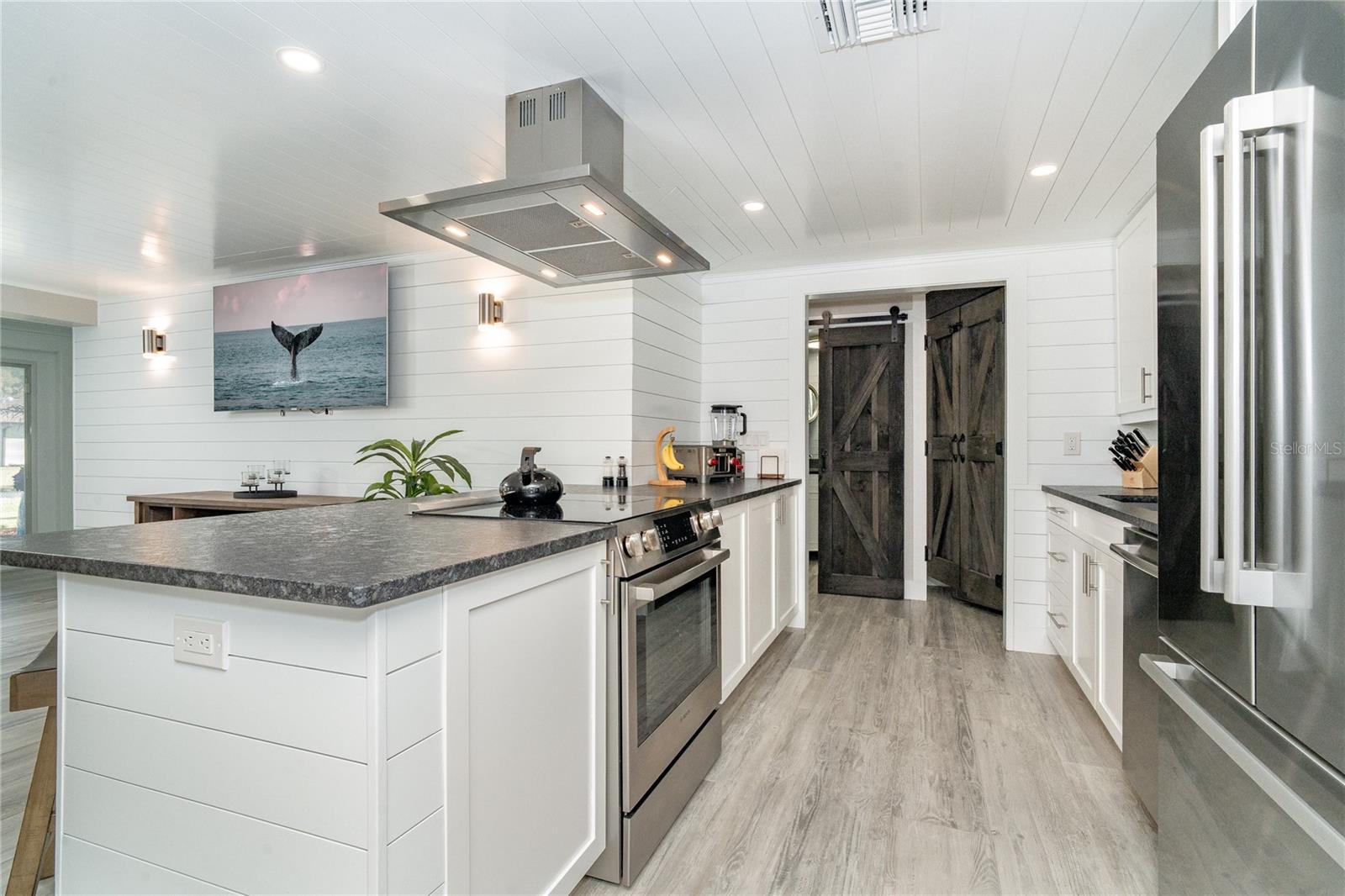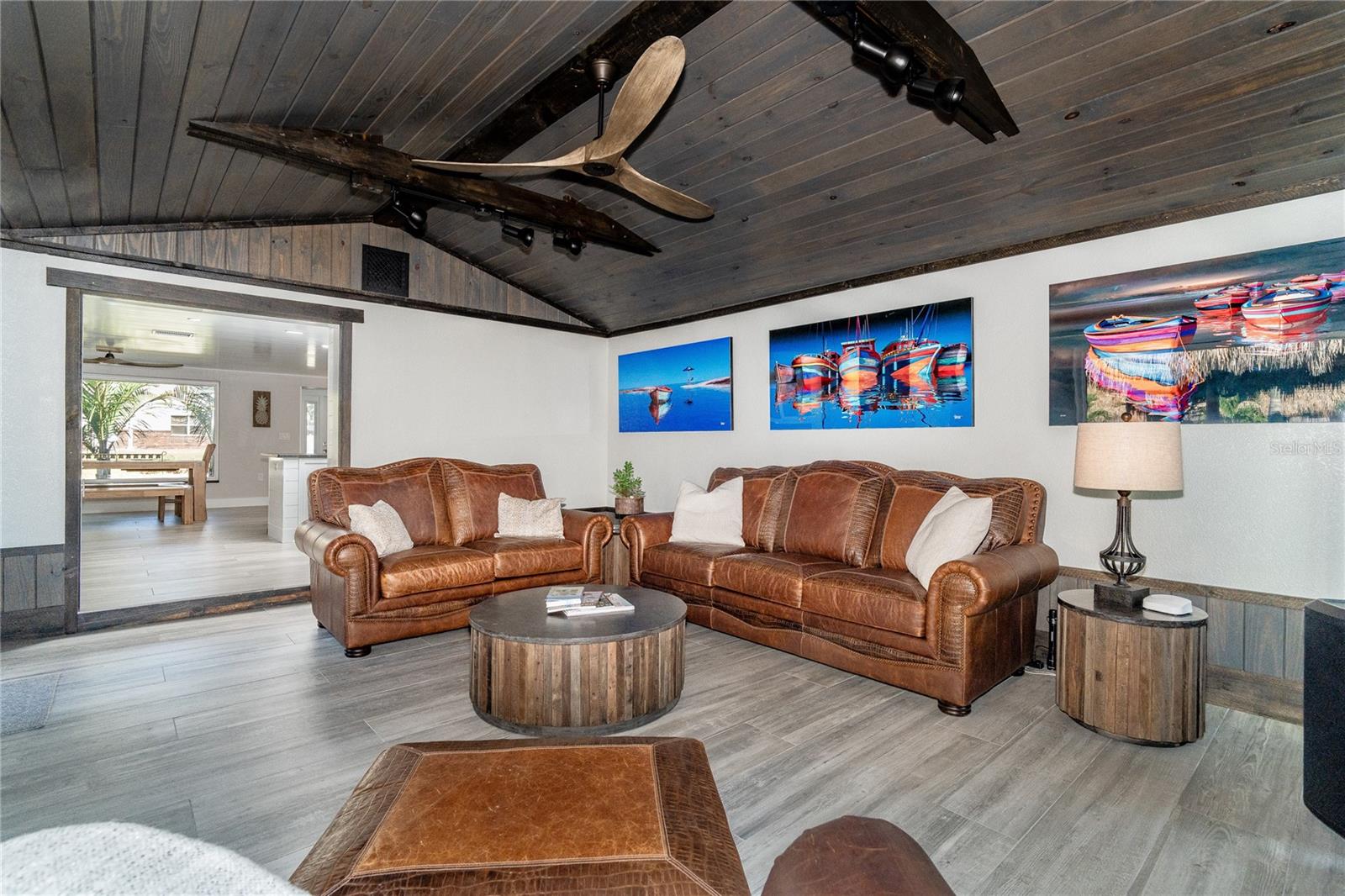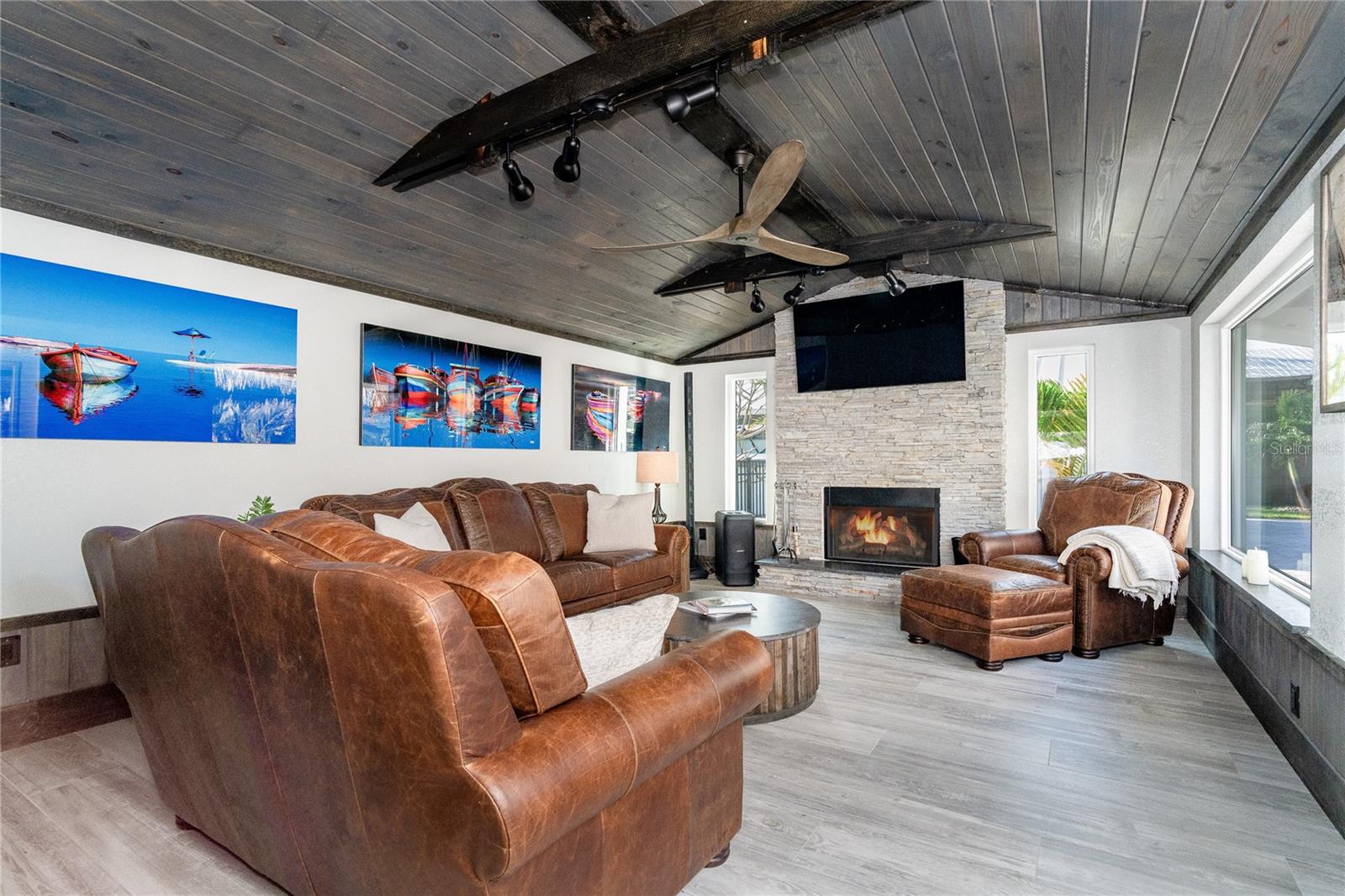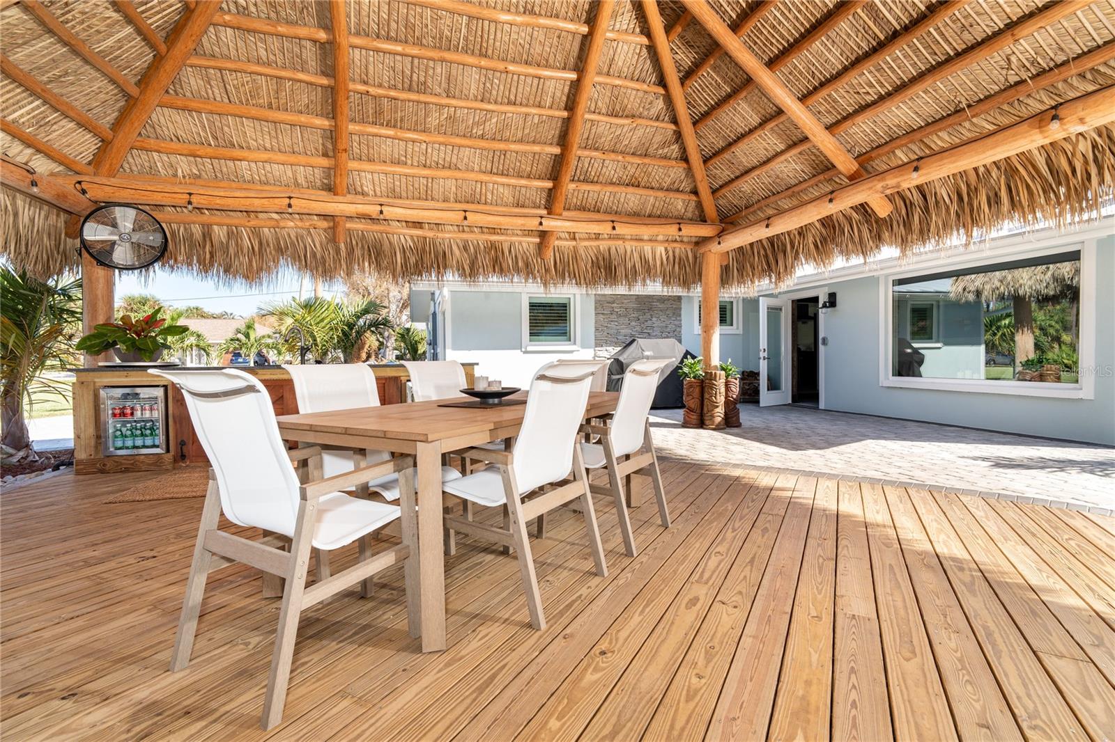 Welcome to an unparalleled sanctuary of luxury upgrades—this extraordinary 3-bedroom, 2-bathroom Florida estate redefines sophistication and leisure, nestled on over half an acre of meticulously landscaped grounds. Crafted for the discerning homeowner, this private retreat boasts an expansive outdoor oasis with three stunning Tiki Huts, perfect for hosting lavish gatherings, unwinding in the serene spa area, or accommodating your recreational toys in style. For peace of mind, this property has never experienced flooding or hurricane damage and is further protected by the nearby Lemon Bay Park. The estate's exquisite outdoor space continues with a detached 25’x25’ garage, featuring an air-conditioned office, granite countertops, and a whole-house attic fan, ensuring year-round comfort. For your convenience, the property also includes a 50-amp RV hookup, and elegantly paved driveways and walkways that weave through the lush tropical landscape. Uncompromising in its attention to detail, this estate offers state-of-the-art HURRICANE IMPACT WINDOWS AND DOORS on both the home and the garage, complemented by stunning landscape lighting, commercial-grade gutters, and a show-stopping 2023 COMMERCIAL GRADE STANDING SEAM ALUMINUM ROOF. The exterior finishes are further elevated by custom smooth stucco, Azek fascia and soffits, and luxurious tropical foliage including foxtail palms, Christmas palms, lime trees, and plumeria. For the ultimate outdoor entertaining experience, a marine-grade kitchen awaits, fully equipped with two beverage refrigerators, a sink, and weather-resistant materials, creating a seamless flow between indoor and outdoor living. Step inside to a world of refined elegance, where every detail has been curated for modern luxury. Porcelain tile floors extend throughout the home, paired with plantation shutters, shiplap walls and ceilings, and bespoke barn doors on all closets. The family room's centerpiece, a stunning Virginia ledgestone wood-burning fireplace, radiates warmth and charm, while the gourmet kitchen is a chef’s dream, featuring top-of-the-line Bosch stainless steel appliances, leather overlay granite countertops, a farmhouse-style stainless steel sink, and custom wood cabinetry. No stone has been left unturned in this estate’s design—from the custom barn doors to the air-conditioned garage that doubles as a functional office space. The fully automated irrigation system ensures your St. Augustine grass and tropical gardens remain lush year-round. Additionally, the estate’s "X" flood zone designation offers peace of mind for both the home and detached garage. Whether you're basking under the tranquil Tiki Huts, soaking in the spa, or hosting lavish outdoor soirées, this extraordinary estate is a masterpiece of elegance, privacy, and natural beauty. Truly a one-of-a-kind Florida oasis, it offers a lifestyle defined by comfort, grandeur, and thoughtful craftsmanship at every turn. This fabulous location offers convenient access to Downtown Englewood and Dearborn Street, just 5 minutes from the pristine beaches and a short walk to the scenic Lemon Bay Park. Leave the car at home and cruise around in your street-legal golf cart, exploring all the wonderful spots in our charming community.