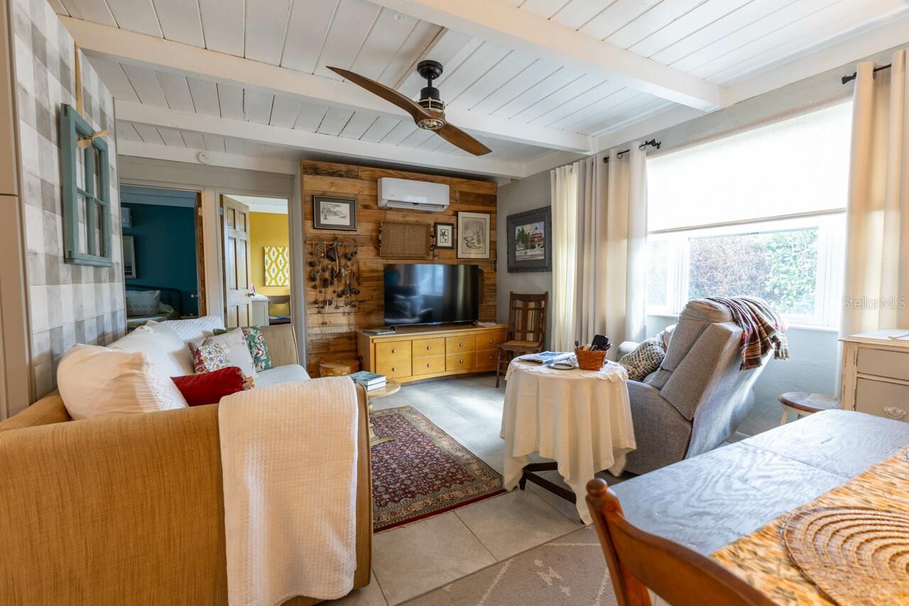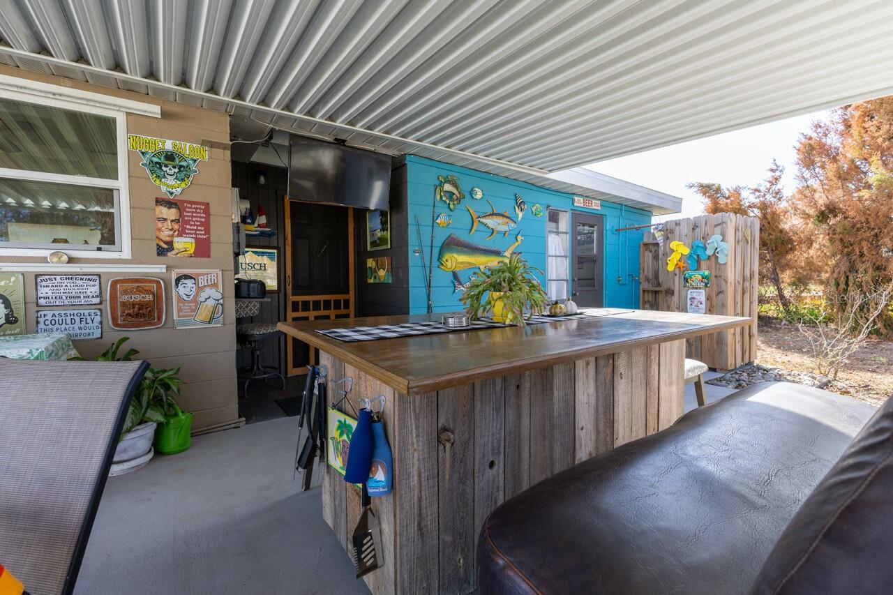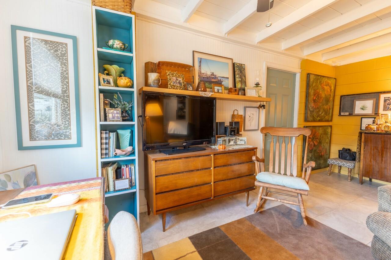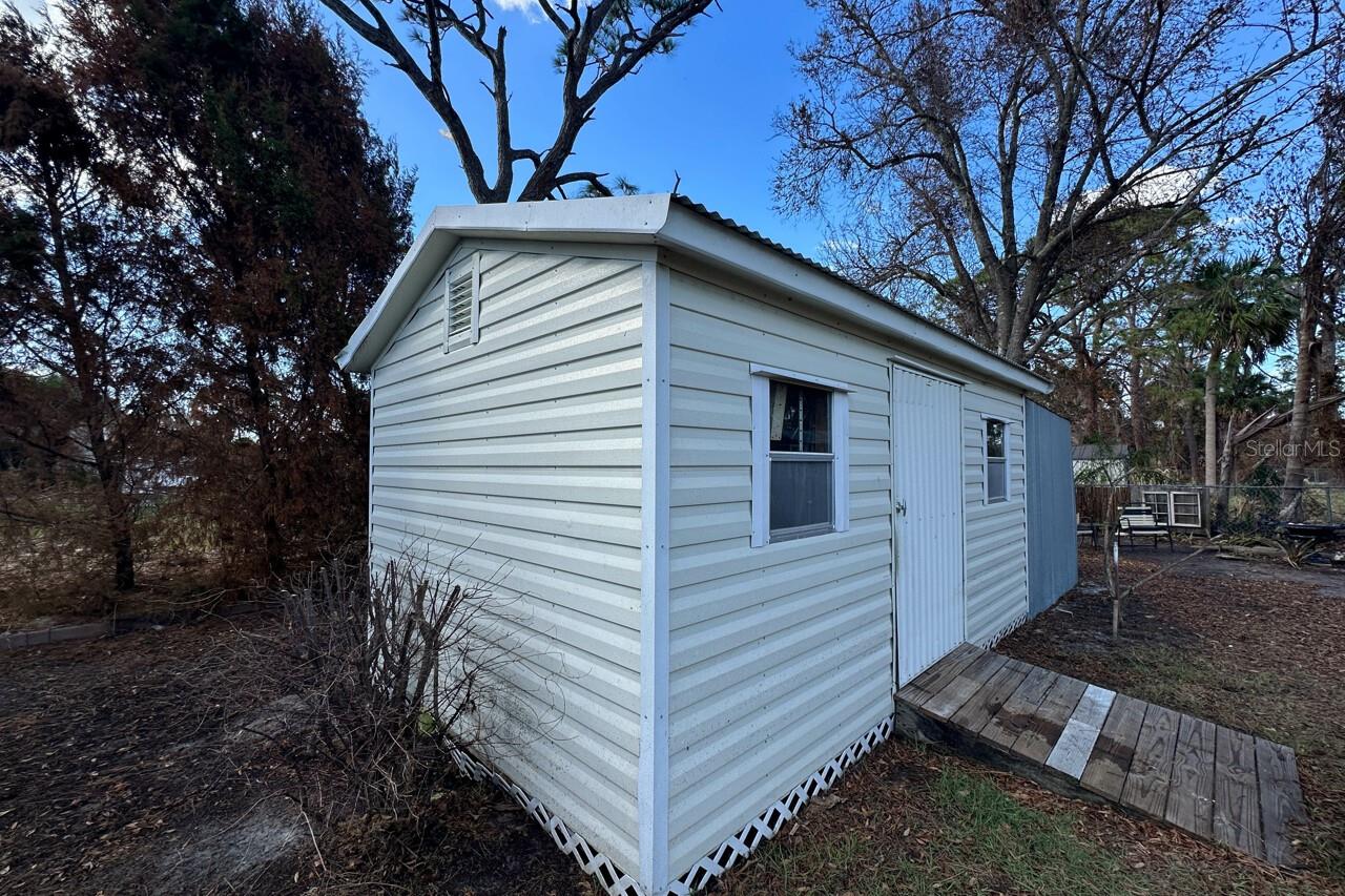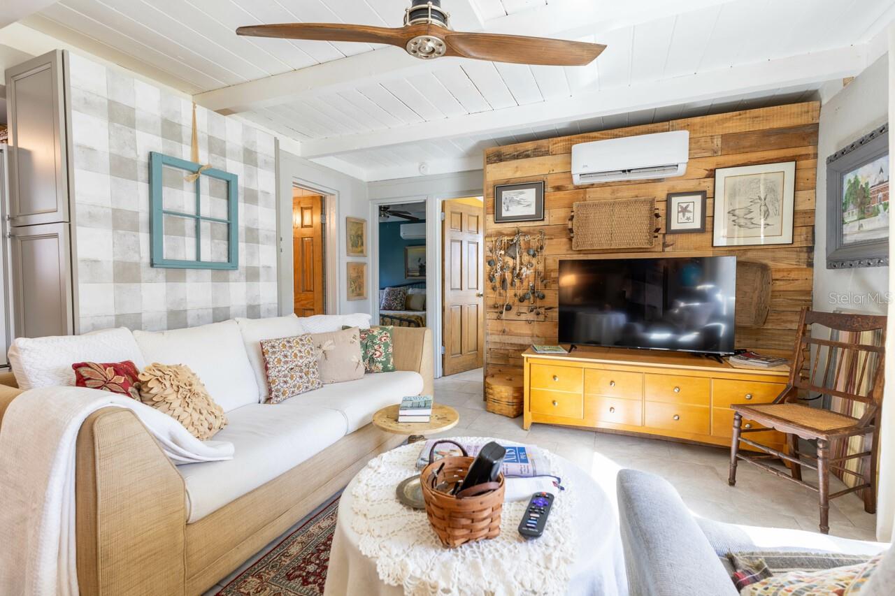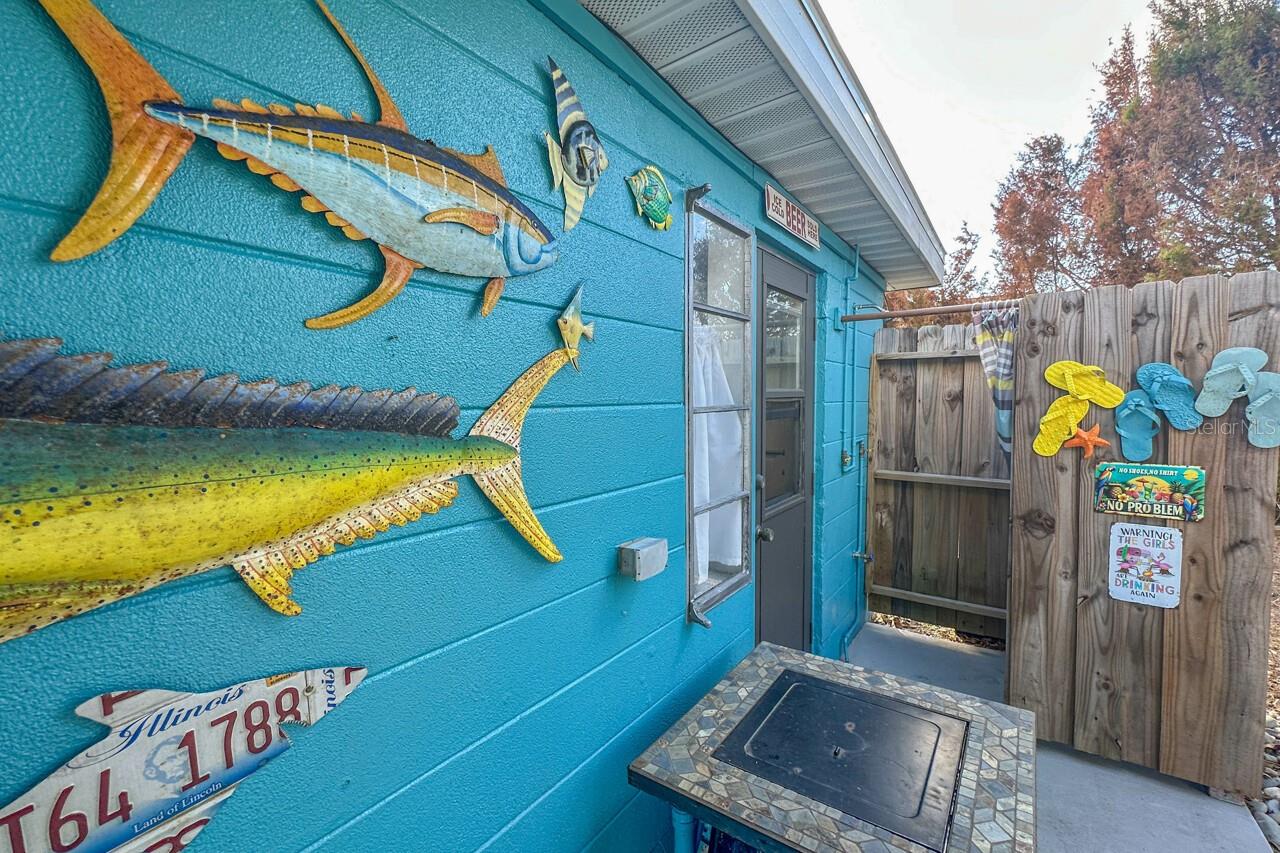 This beach cottage, meticulously maintained and boasting numerous custom upgrades, is conveniently located near Englewood Beach. The enhancements include a multi-zoned A/C mini-split system for individual room temperature control, a new roof installed in 2022 with a 25-year transferable warranty, custom wood cabinetry, and hurricane shutters for the entire home. Additionally, it features a new on-demand hot water system, an upgraded kitchen and bathroom with tile flooring throughout. The washer, dryer, and dishwasher have all been updated as of 2024. The home exudes character with its exposed wood ceiling beams, solid wood interior doors, and a private outdoor hot and cold shower, encapsulating that old Florida charm. It offers an oversized, covered outdoor living space at both the front and rear, suitable for all seasons. The expansive lot provides ample space for entertainment, storage, or potential expansion. A metal shed, included with the home, serves as additional storage or a studio space.