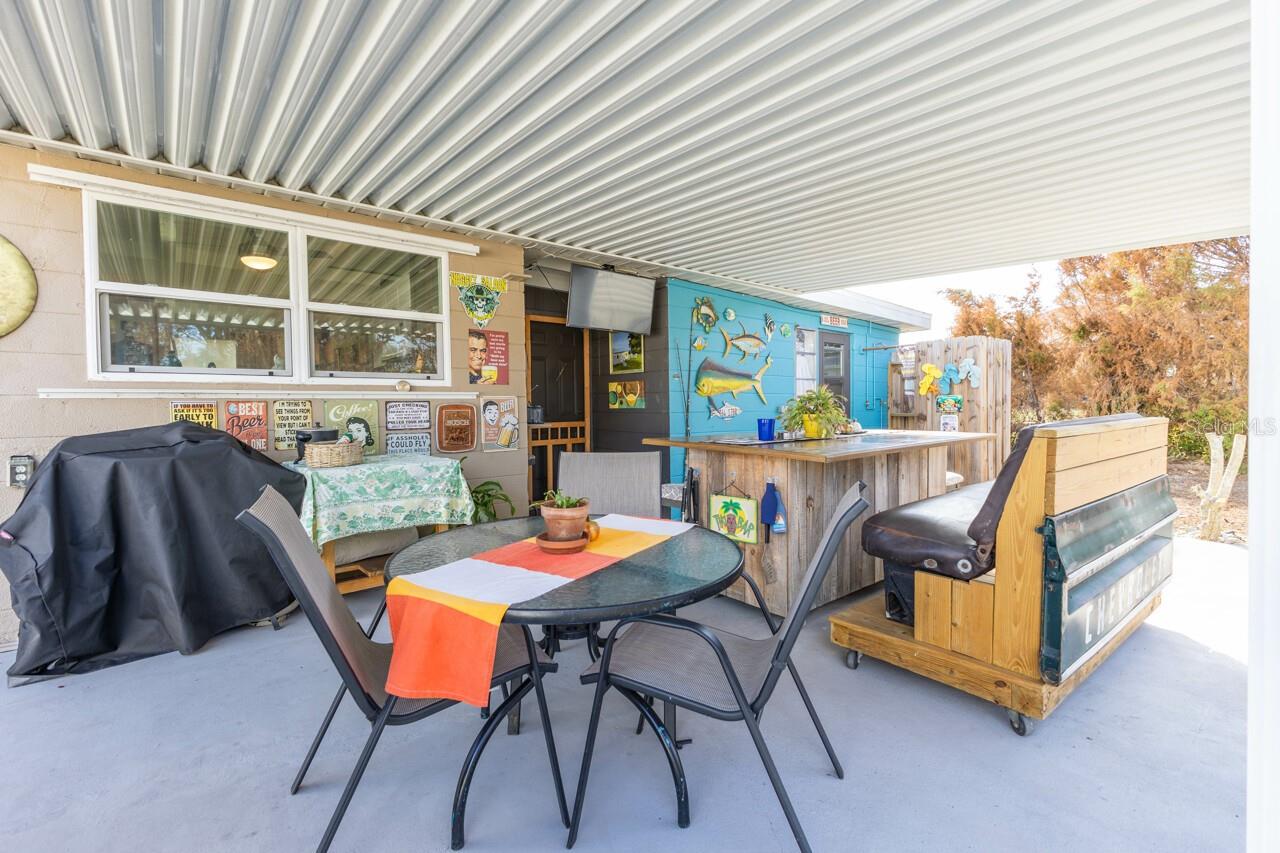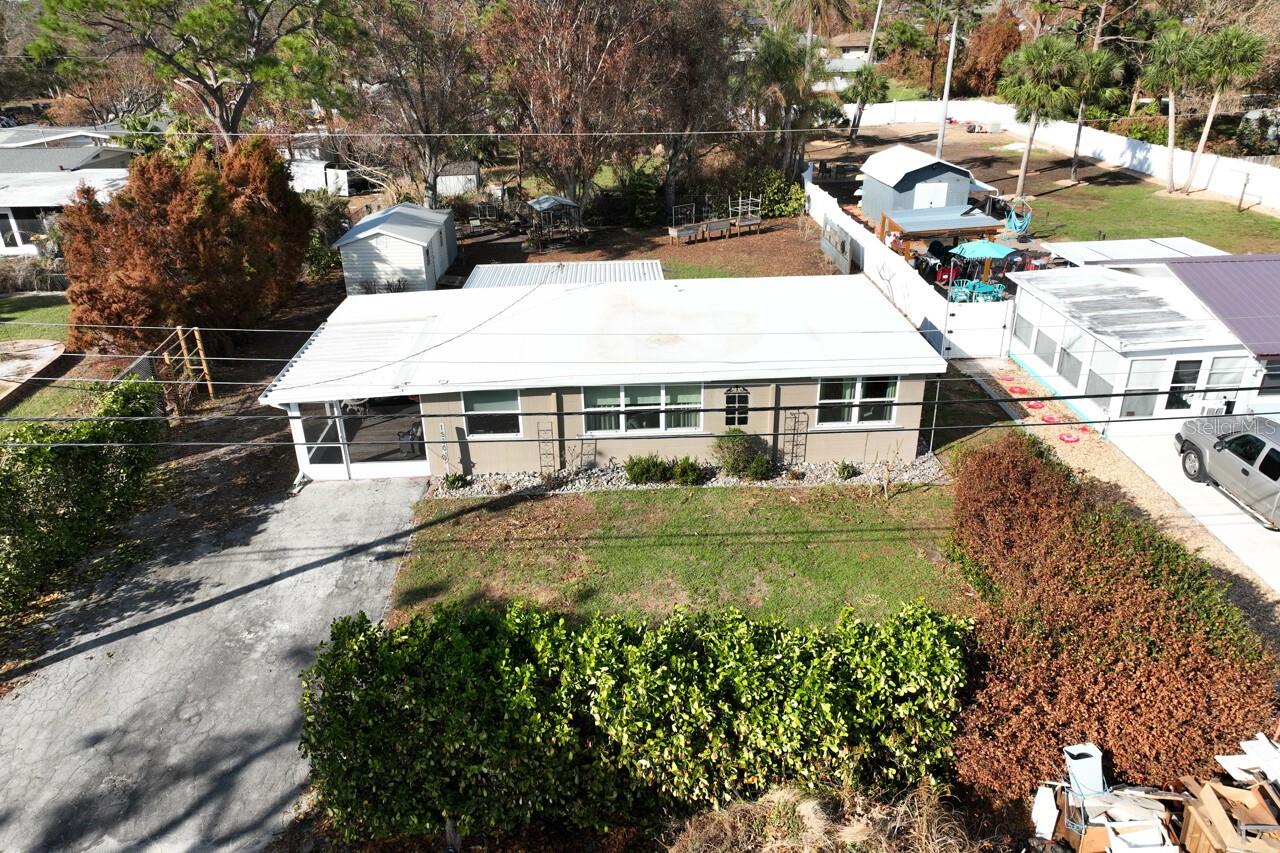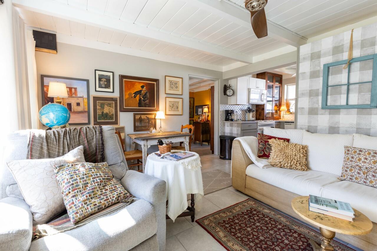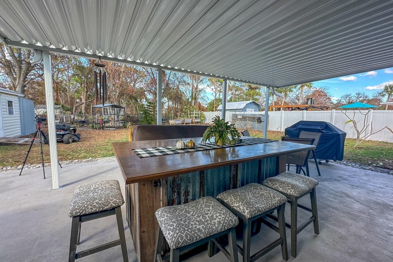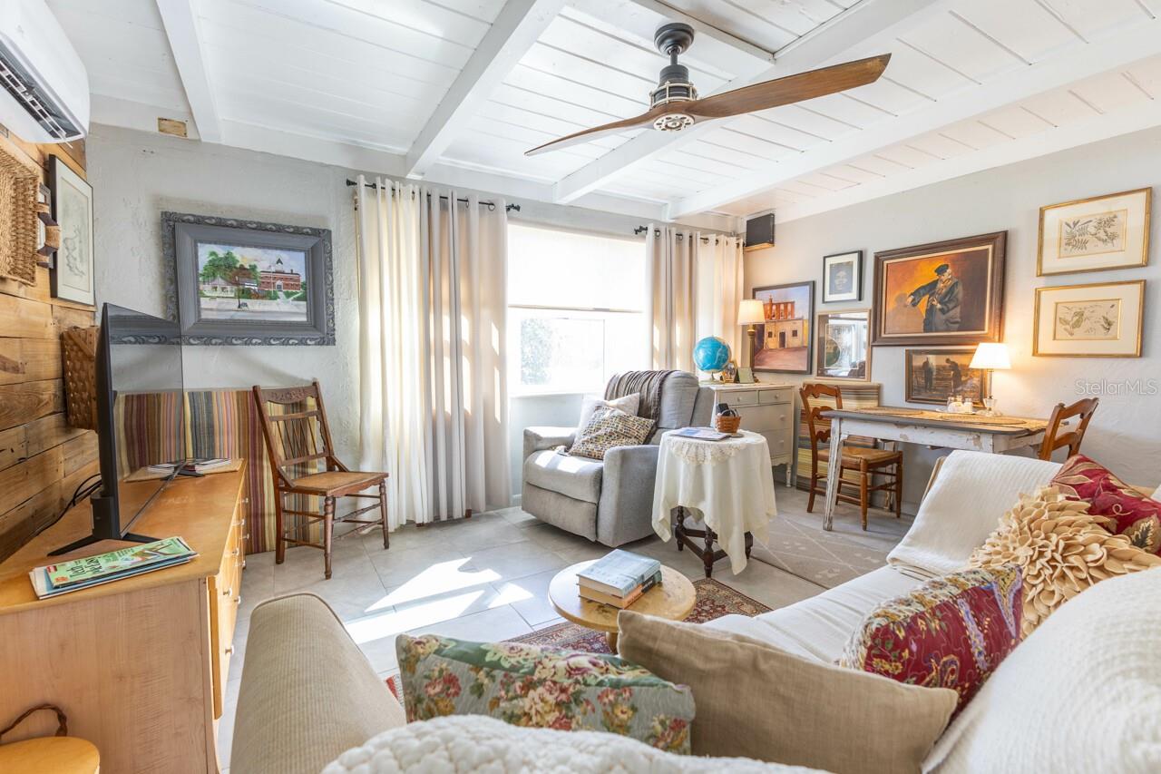This beach cottage, meticulously maintained and boasting numerous custom upgrades, is conveniently located near Englewood Beach. The enhancements include a multi-zoned A/C mini-split system for individual room temperature control, a new roof installed in 2022 with a 25-year transferable warranty, custom wood cabinetry, and hurricane shutters for the entire home. Additionally, it features a new on-demand hot water system, an upgraded kitchen and bathroom with tile flooring throughout. The washer, dryer, and dishwasher have all been updated as of 2024. The home exudes character with its exposed wood ceiling beams, solid wood interior doors, and a private outdoor hot and cold shower, encapsulating that old Florida charm. It offers an oversized, covered outdoor living space at both the front and rear, suitable for all seasons. The expansive lot provides ample space for entertainment, storage, or potential expansion. A metal shed, included with the home, serves as additional storage or a studio space.