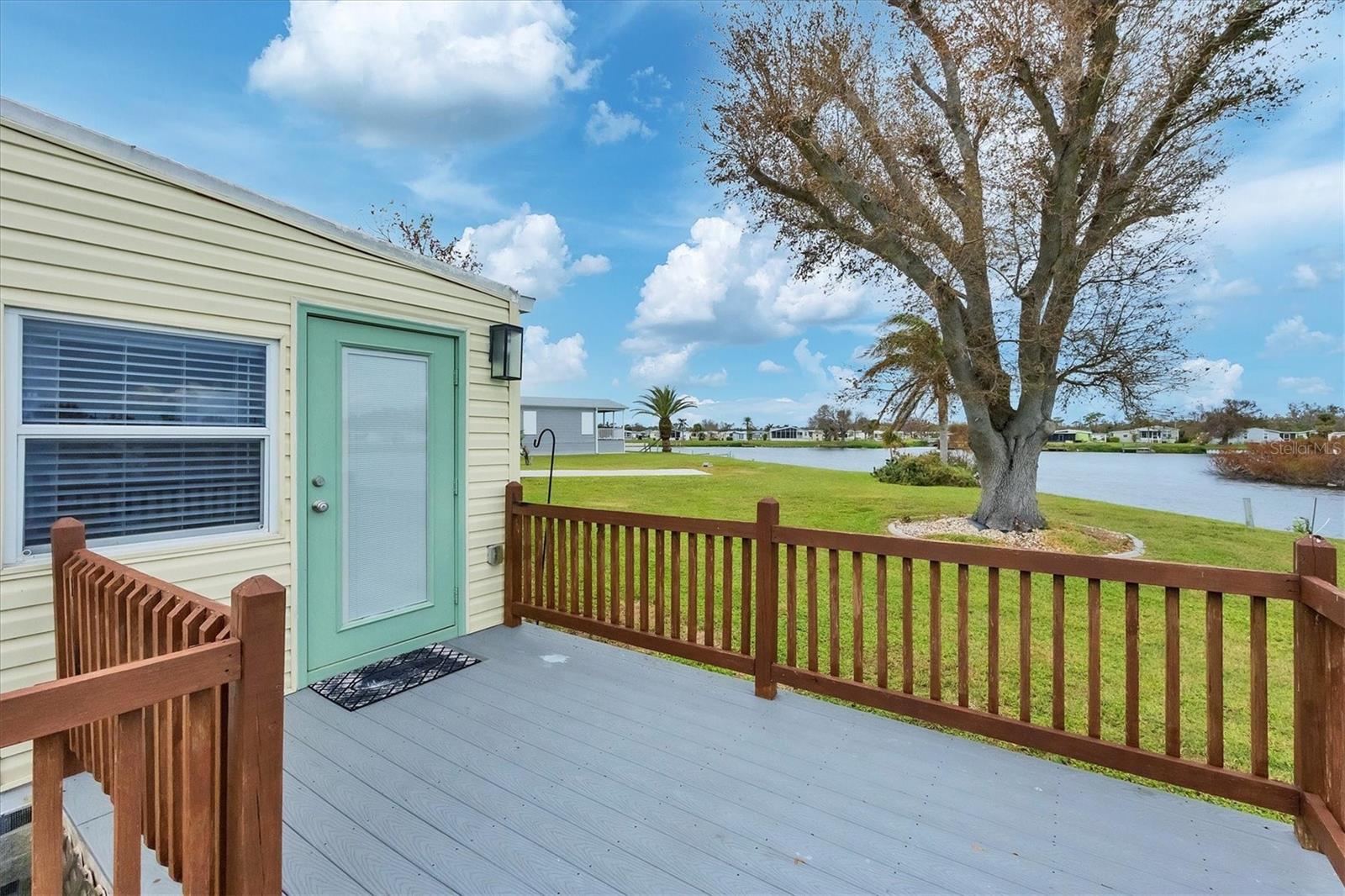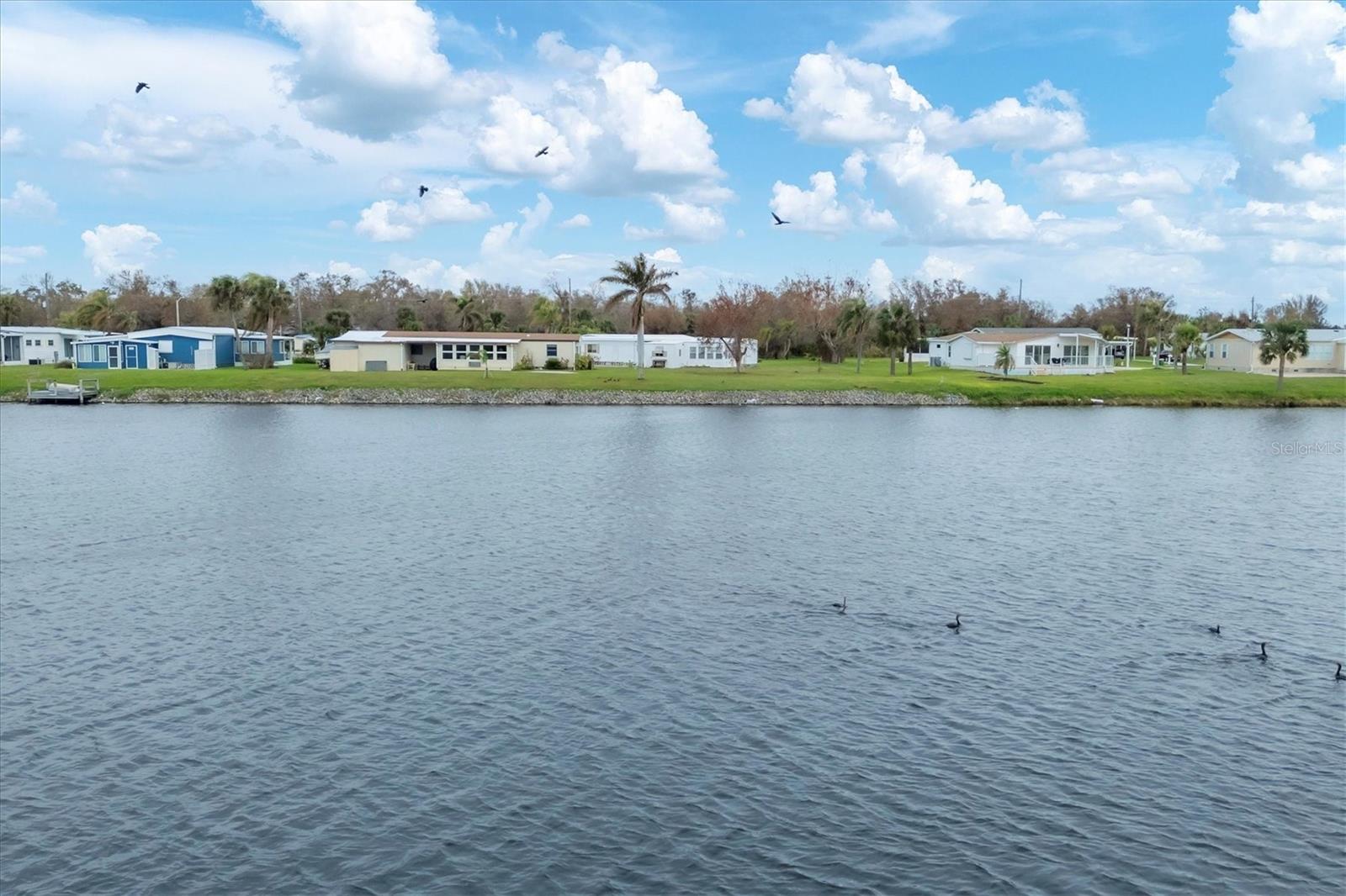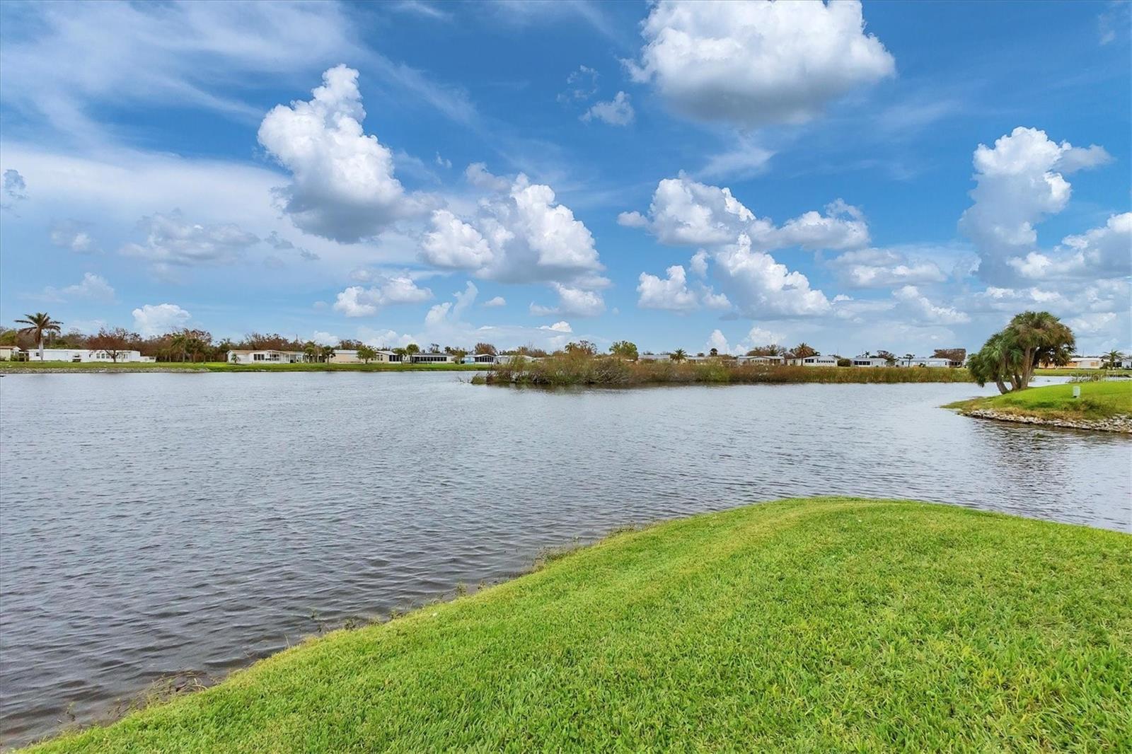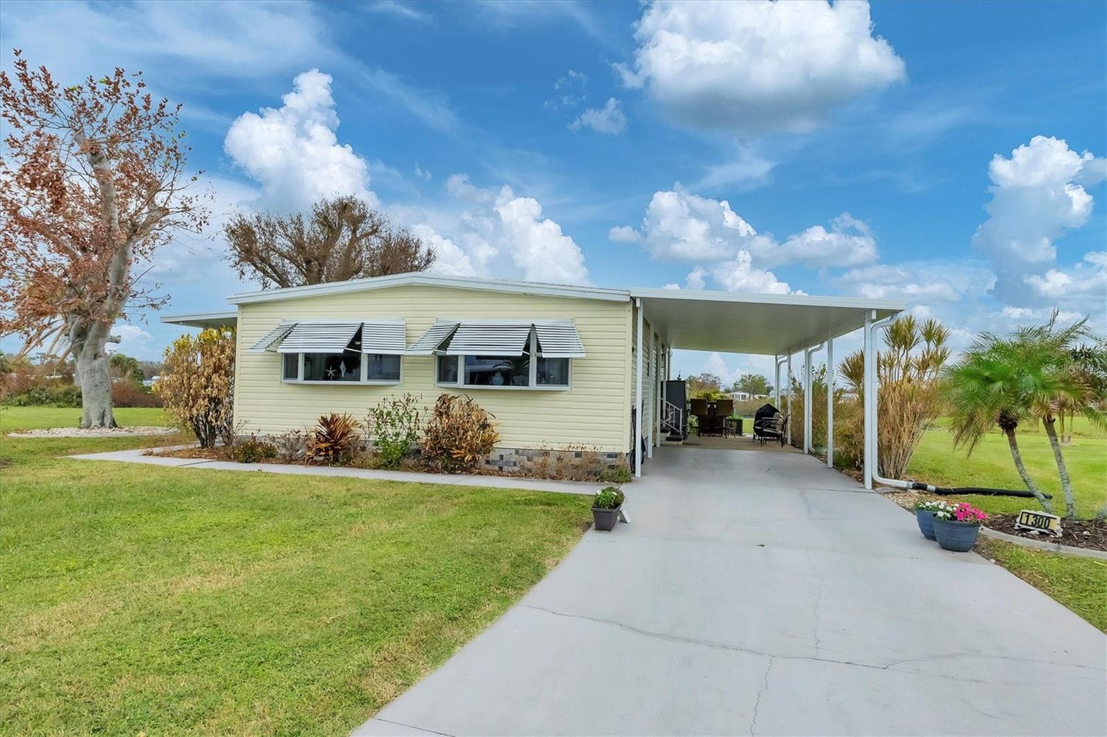 Come see this beautiful waterfront home roughly 3.5 miles from Englewood Beach! The home suffered zero damage from hurricanes Helene and Milton. This home was also high and dry with no flooding during either storm. This home is a two-bedroom, two-bath home with a large living room, formal dining, and a peaceful New Florida Room completed this year to current hurricane codes. Enjoy morning coffee or evening cocktails while enjoying the expansive water views overlooking bird island. The kitchen is designed with a flat cook top, plenty of cabinets, decorative backsplash with stainless steel appliances. The dining room is located off the kitchen with access to the living room making it perfect for family gatherings. The living area is 18 x 14 giving you plenty of room to stretch out with windows all around to let in the natural light. The Primary Bedroom has beautiful views of the lake, built in desk / make-up counter with a large closet. The primary bathroom has dual sinks and a enclosed shower with grab bars. Bedroom Two is 12 x 11 with fan light combo. This home has many features, including a finished Florida Room with a few furnishings staying, new vapor barrier installed under the entire home, irrigation from the lake, New Covered Carport built in 2024 to current hurricane standards. The oversized waterfront lot has roughly 169 feet on the lake, which gives you incredible water views. Nature Lovers Paradise with water birds and song birds of all kinds on Bird Island. The home has water and sewer with an irrigation pump to water from the lake. Home comes partially furnished as well making it an easy transition for the new owners. In the Holiday Mobile Estates 3rd addition 55 plus Community, you own your land by fee-simple. Golf carts and Pets are welcome. The HOA fee is only $35 a year. For $300 per year, The Edgewater Clubhouse gets you access to the heated swimming pool, tennis courts, shuffleboard, pickle ball, bocce ball, and additional outdoor activities. Secure Your Piece of Paradise Today.
