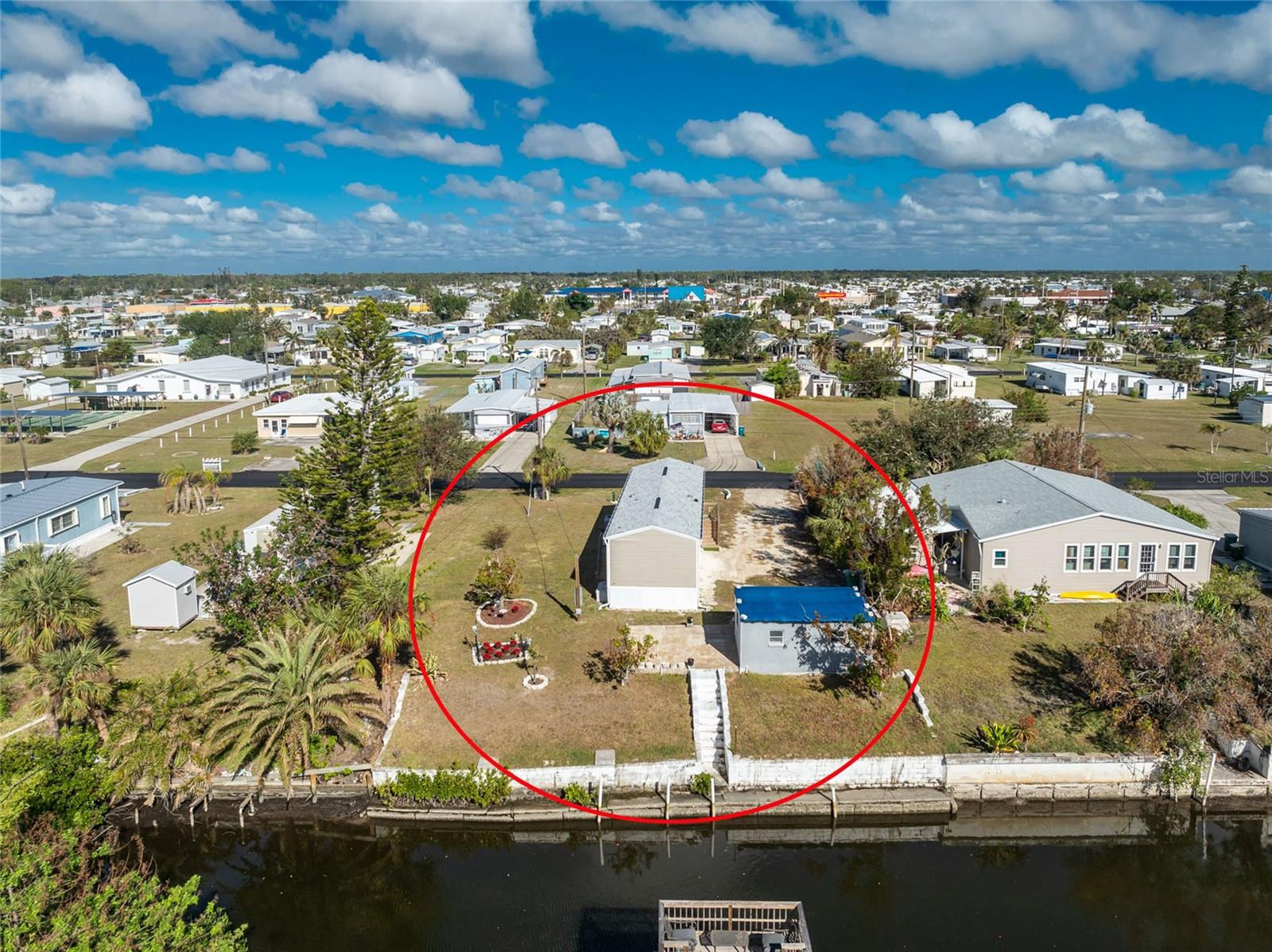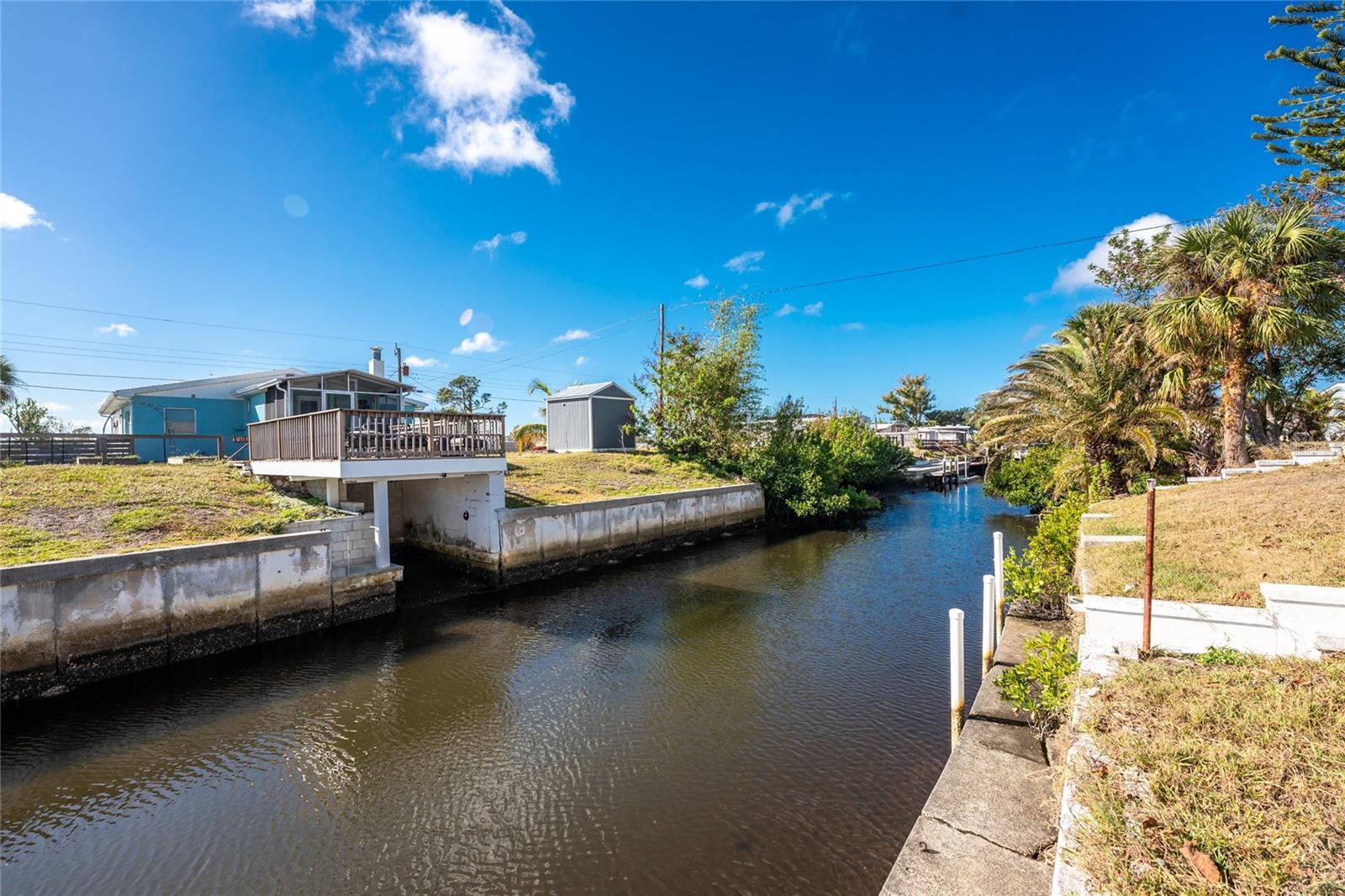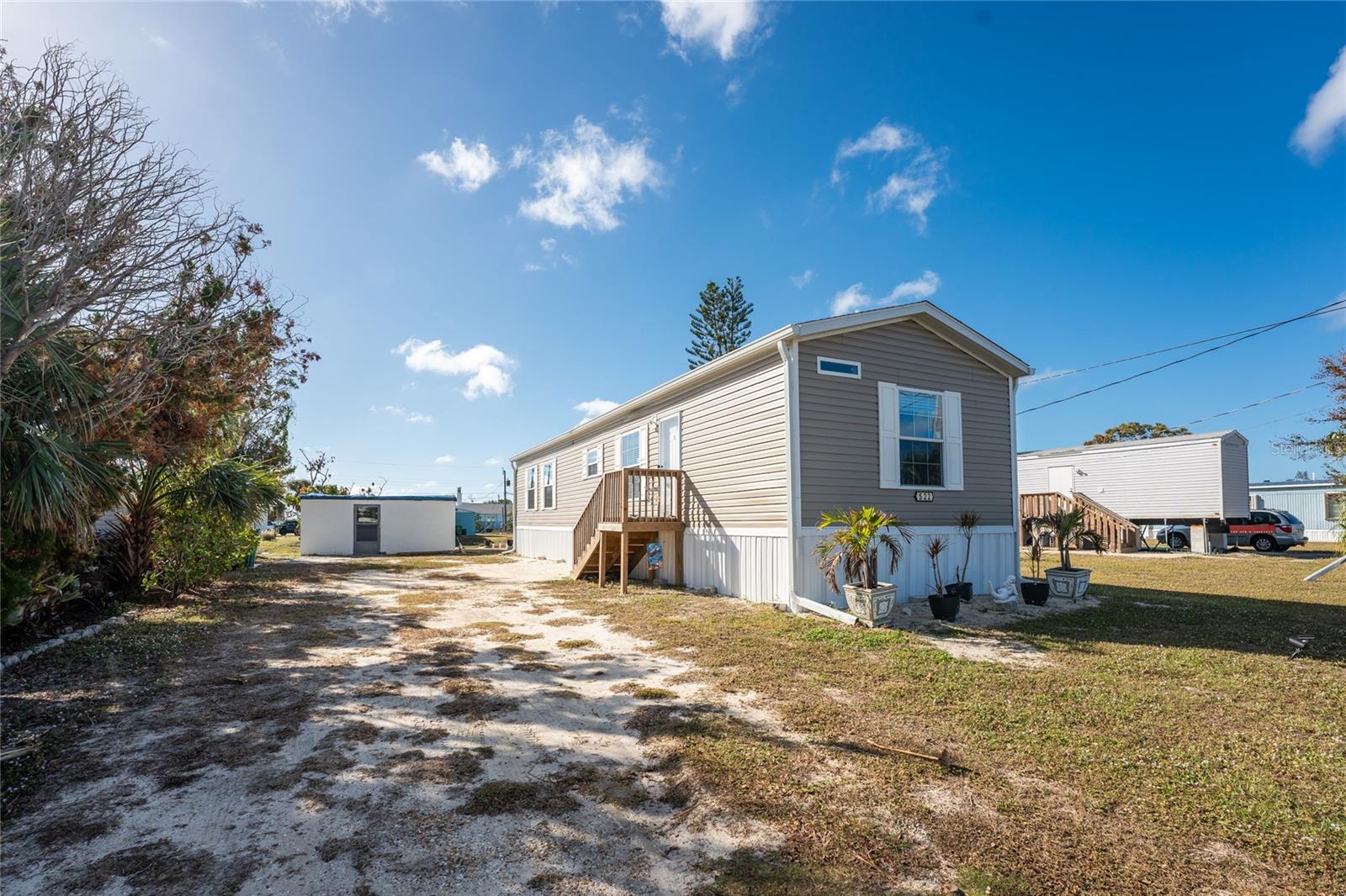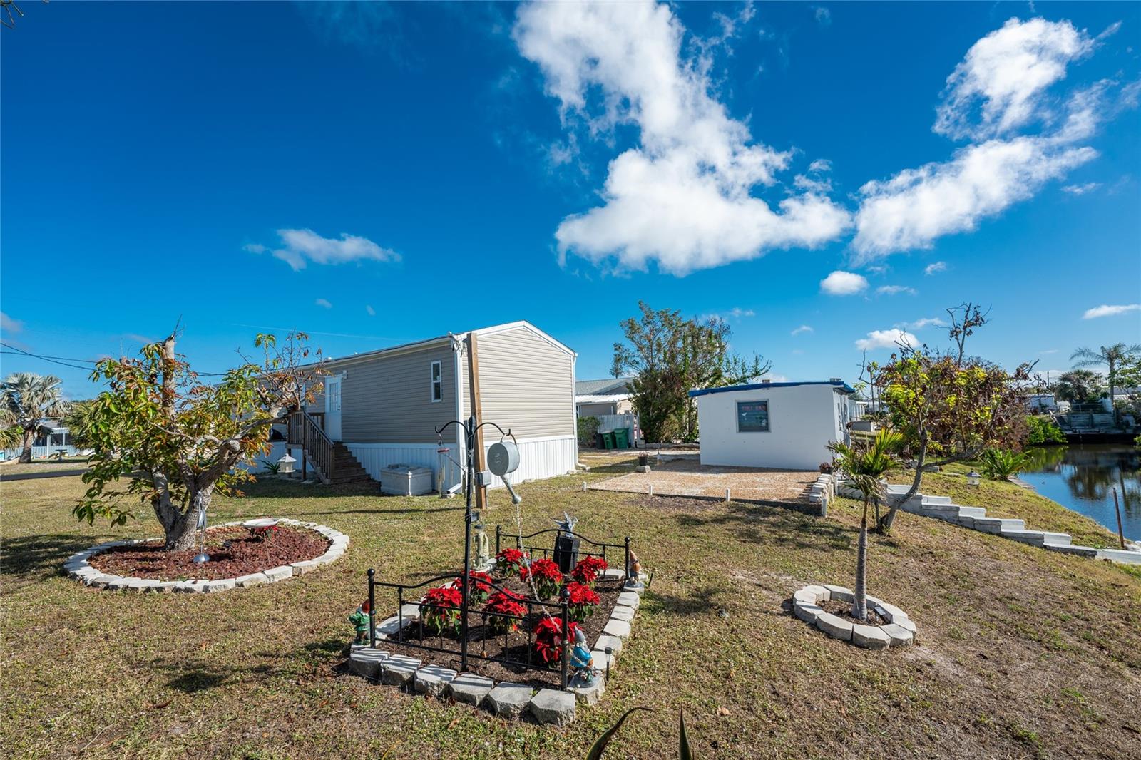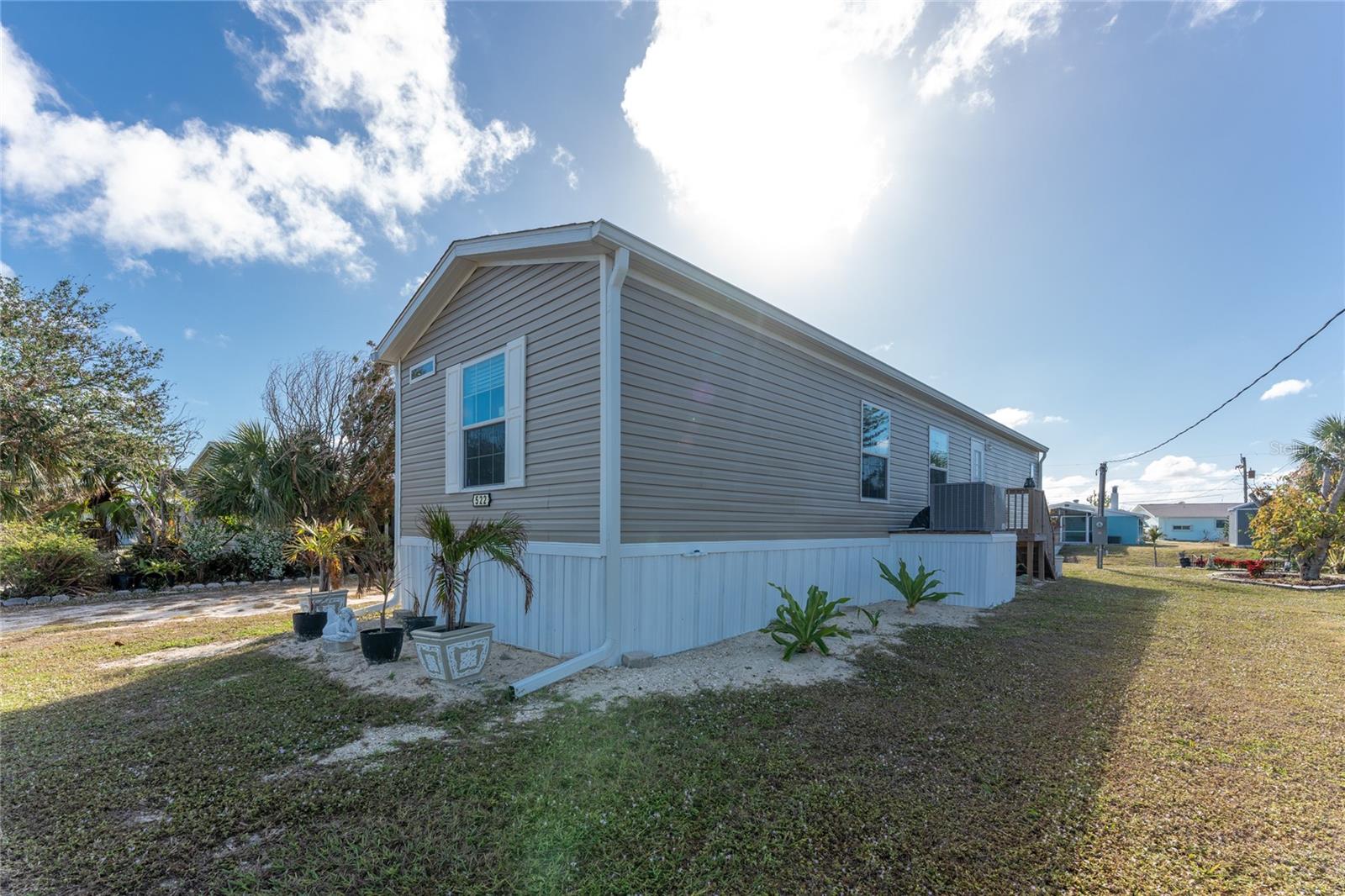 Direct Water Access to Lemon Bay and the Gulf of Mexico – A Boater’s Paradise! This 2023, 2-bedroom, 2-bathroom manufactured home offers saltwater canal frontage and is ideally situated close to the community center, where you can easily walk, bike, or use a golf cart to participate in the many social activities or games with friends and neighbors. Located in the desirable Mobile Gardens community, you’ll own your land, adding value to this waterfront retreat. Boating enthusiasts will love the quick Gulf access, making this property perfect for those seeking the ultimate Florida lifestyle. Inside, the home features wood laminate flooring in the main living areas and bathrooms, an open great room that connects to the kitchen and dining area, and large windows that allow for an abundance of natural light. The kitchen has white shaker-style cabinets, a breakfast bar, ample countertop space, and a stainless steel farmhouse sink, ideal for meal preparation and entertaining. An interior laundry room with shelving adds extra storage.The primary suite includes dual closets and a private bathroom with a step-in shower. Guests will enjoy a welcoming second bedroom with easy access to a full bathroom, featuring a shower/tub combination. Outside, you’ll find a detached storage shed, a patio overlooking the canal, and concrete steps leading to the dock area, the perfect spot to relax or enjoy evening cocktails by the water. Mobile Gardens offers an optional low-fee HOA membership providing access to amenities such as a recreation center, shuffleboard, social events, and two community boat ramps. Boat slips are available separately on a first-come, first-served basis for an additional fee. Located near beautiful Gulf beaches, shopping, dining, and live entertainment, this home is ideal as a seasonal retreat or investment opportunity. Don’t miss your chance to live the Florida boating lifestyle!
